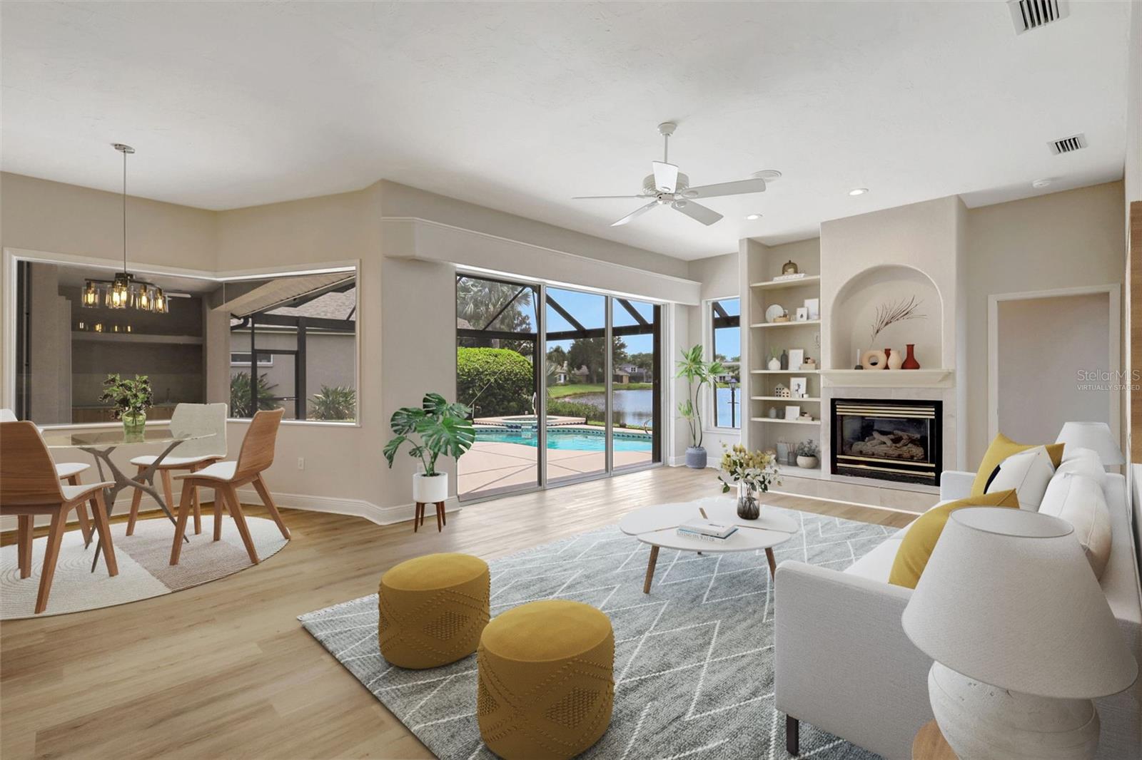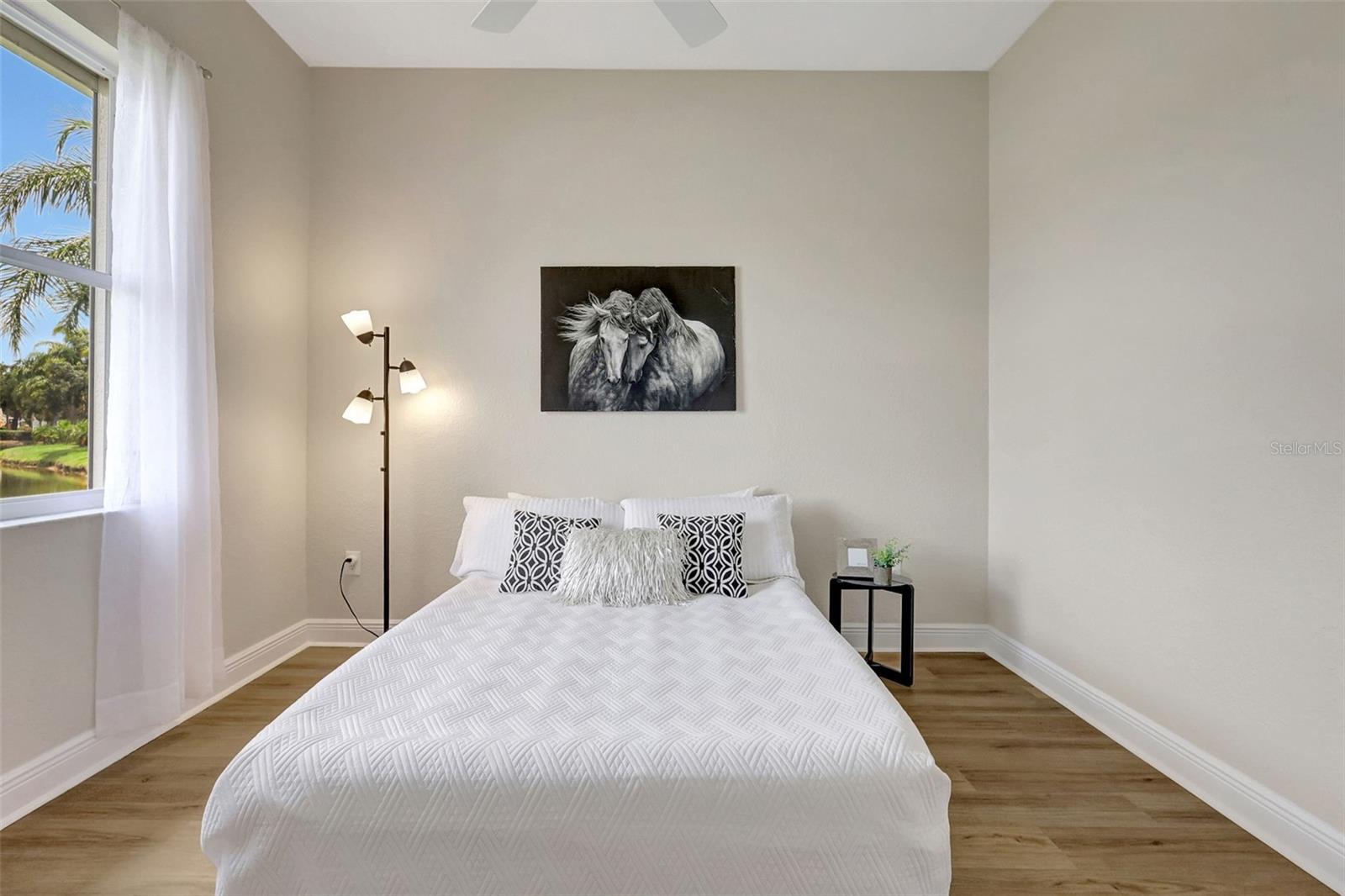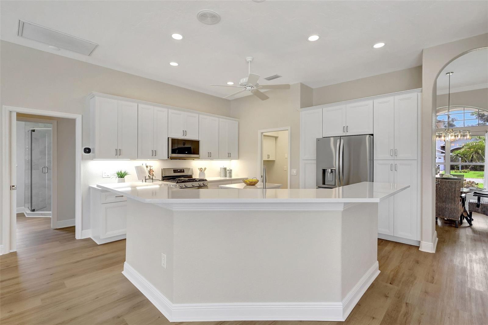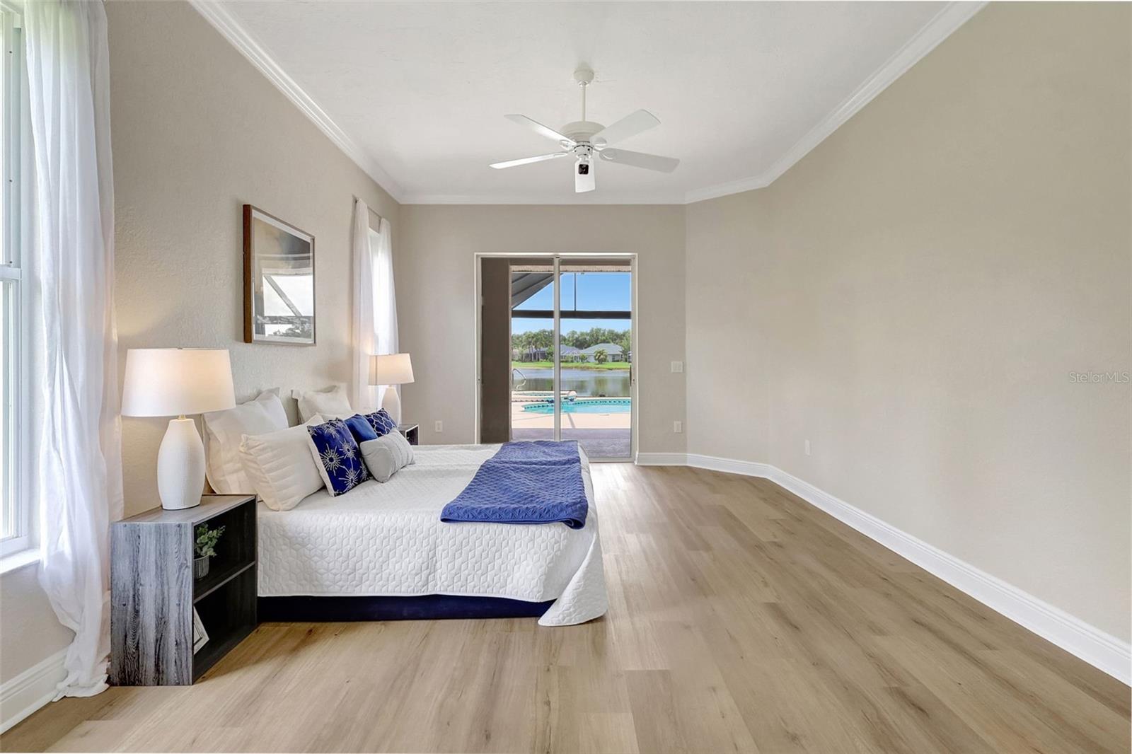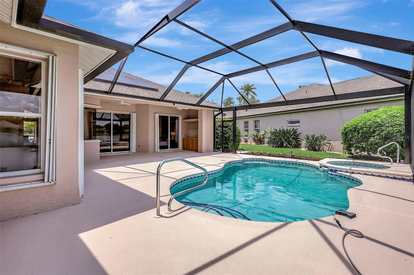 One or more photo(s) has been virtually staged. Welcome to this stunningly updated four-bedroom, three-bathroom, plus a den, home in the highly sought-after and heart of Lakewood Ranch, Summerfield Village. This home blends comfort and elegance in an ideal setting with pool/spa and breathtaking views thru full cage screen of the tranquil lake. From the moment you step inside, you'll be captivated by the elegant new luxury vinyl floors thru out the entire house and abundant natural light. Sliding glass doors connect the spacious living area into the screened-in lanai and pool, providing the perfect space to grill out, relax and enjoy the serene surroundings. Recently replaced pool pump, spa pump, pool filter housing, and gas pool heater. The lanai features a clear-view screen enclosure, offering unobstructed views of the lovely large pond and lush landscape. The beautifully renovated kitchen is designed for both style and functionality, featuring solid wood cabinetry, quartz countertops, a stylish tile backsplash, and stainless-steel appliances. The eat-in area provides a cozy and inviting space for casual dining. Designed with a thoughtful split floor plan, this home ensures privacy with three distinct living areas. The primary suite is a true retreat, offering lanai access, two walk-in closets, and an elegant en-suite bathroom with dual vanities, a garden tub, and a separate tile shower. On the opposite side of the home, the second and third bedrooms are conveniently located next to a full bathroom, the fourth bedroom and bathroom with direct lanai access and use as the pool bath. This home offers a formal dining area, a generous living room, and a dedicated office/den. The laundry room is conveniently located off the garage entrance for easy access. Blink video doorbell and seven outdoor security cameras. Freshly painted 2.5-car garage. Solar panels make it ideal for low electricity consumption. Additionally, Rachio smart irrigation controller (water-conserving.) Including an Ambient Weather WS-2000 roof-mounted weather station with indoor display. Convenient Ecobee smart programmable energy-saving thermostat. The home is situated on the far side of the neighborhood circle with no through traffic, this home offers a peaceful retreat for the owner. Summerfield Village features miles of walking trails, a park with tennis and basketball courts, a playground, soccer fields, beach volleyball, and a spacious pavilion. Just minutes from I-75, equally between St. Pete and Sarasota with Anna Maria Island your direct beach. Bradenton and one hour north, Tampa, local medical facilities, top-rated schools, Main Street, UTC Mall, fine dining, and the other world-famous beaches, this home embodies the best of Florida living.
