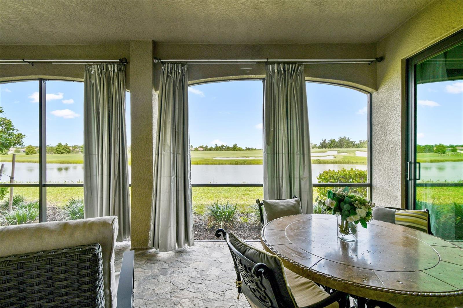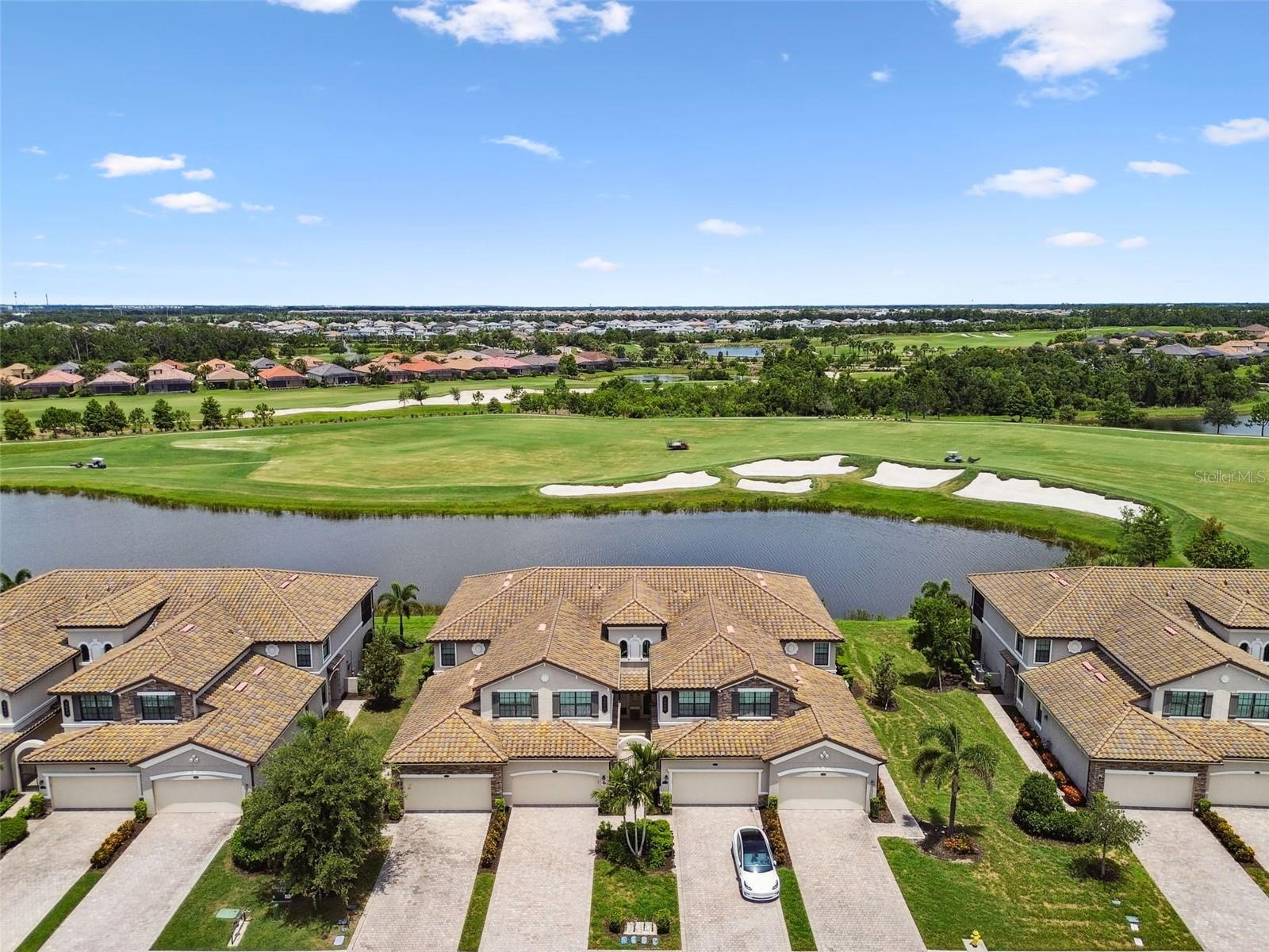 This beautiful end-unit Coach home offers breathtaking views of the 18th fairway at LakeWood National Golf and Country Club. Imagine a life of leisure and convenience within this stunning golf and country club community. This maintenance-free home features crown molding, 3 bedrooms, 2 bathrooms, 2 car garage, impact windows/slider, and provides a spacious open floor plan with elegant tile flooring in the main living areas. The upgraded kitchen, complete with a large center island, is perfect for entertaining. You'll also appreciate the upgraded neutral-toned laminate flooring in the bedrooms, designed with modern living in mind. The oversized primary suite is a true retreat, offering picturesque lake and golf views and direct access to the lanai complete with new flooring - the perfect spot to unwind. Residents of Lakewood National enjoy the added security of a 24-hour manned gate, and a vibrant social scene with numerous events and activities. The resort-style amenities are exceptional, including multiple swimming pools, a tiki bar, tennis and pickleball courts, a fitness center, bocce ball, and conference and event spaces. This is a truly remarkable opportunity to embrace a luxurious lifestyle in the lush natural beauty of Lakewood National Golf and Country Club. Dishwasher and Washer 2024, new paint interior.