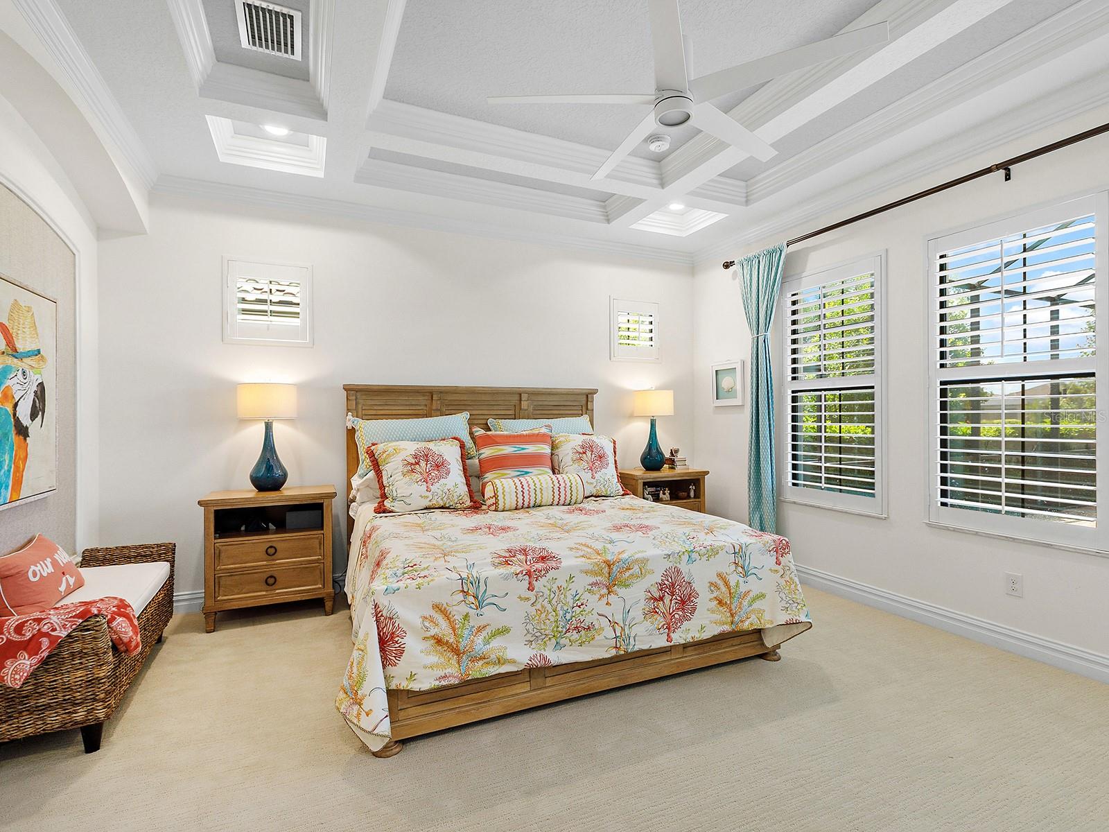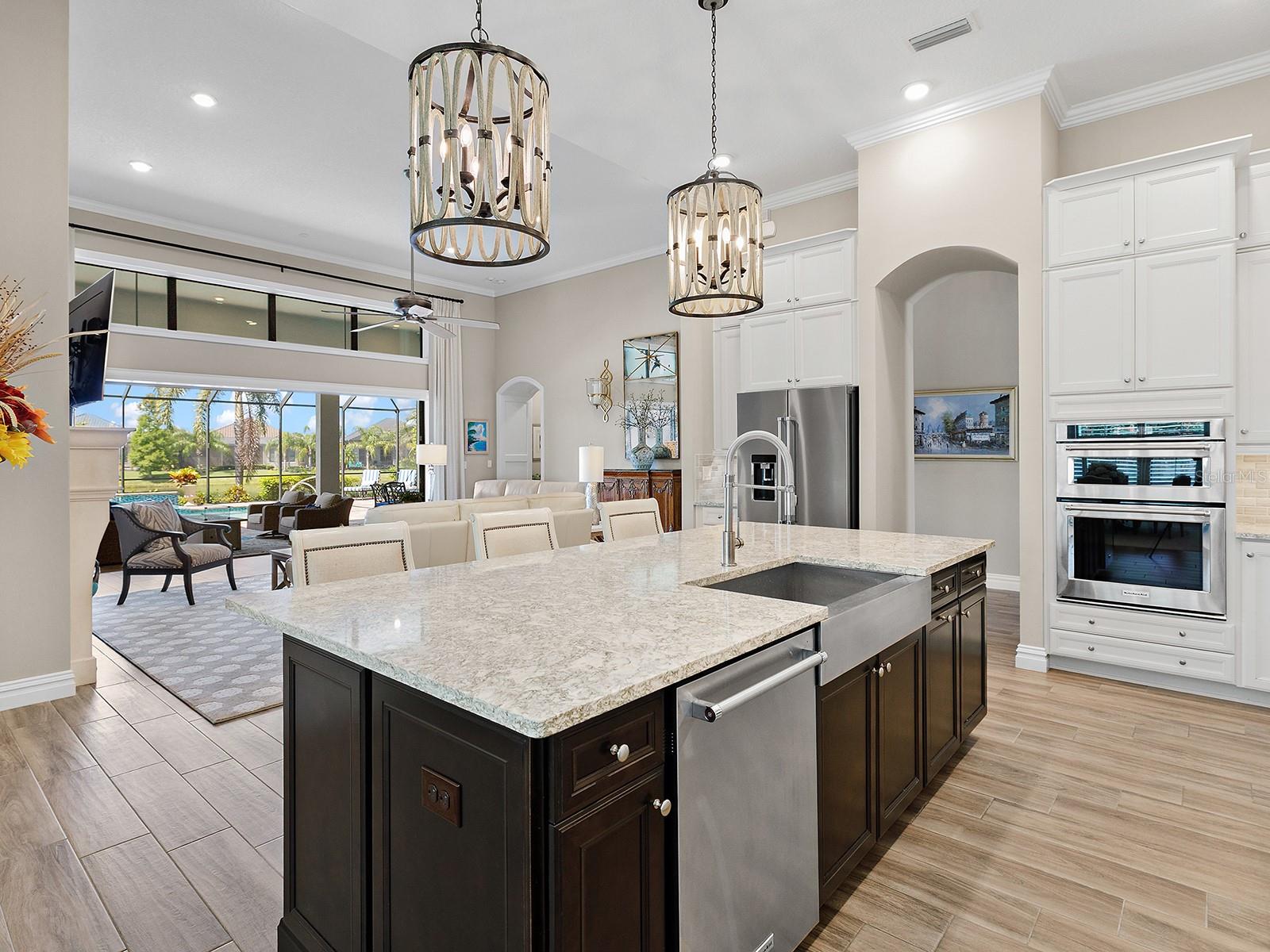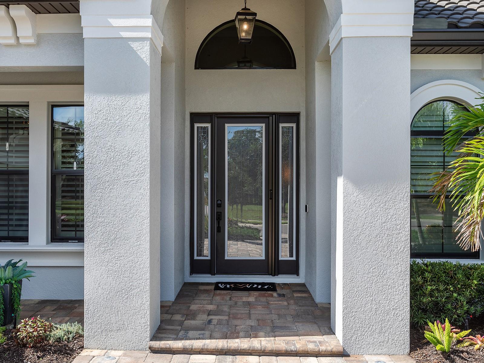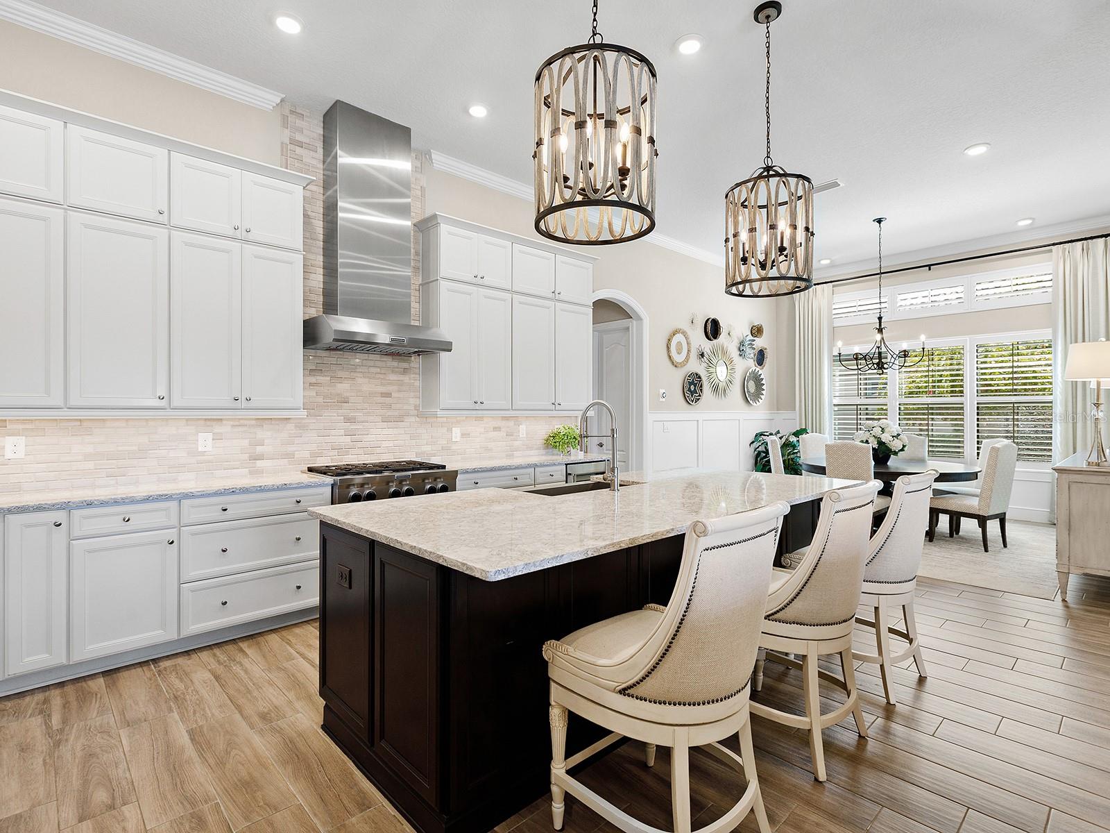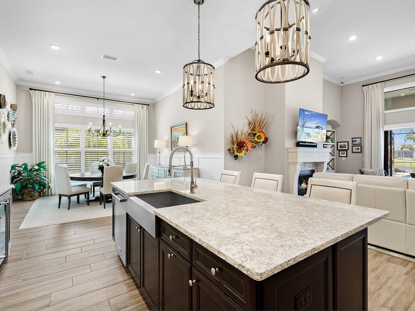 On a tranquil lakefront home site in Country Club East, built by Cardel Homes, this Dolcetto 4 floor plan offers over 3,300 square feet of refined living, where a natural color palette and wood-look tile floors set a tranquil tone. Thoughtful upgrades--custom ceilings, crown molding, designer lighting and detailed trim--blend craftsmanship with comfort throughout. A paver driveway and lush landscaping introduce the home, with no neighbors across the street--just a tranquil walking path and gazebo. A stunning glass front door, framed by side windows and a transom arch, opens to a foyer with a wallpaper-accented niche, tray ceiling, crown molding and coffered details--all set above elegant wood-look tile floors that continue throughout the main living areas. The great room offers a gas fireplace with a carved stone mantle, custom coffered ceilings, crown molding and transom windows above pocketing sliders with electric shades, all framing peaceful lake views. The adjacent kitchen showcases custom cabinetry, quartz countertops, a stainless-steel farm sink, under-cabinet lighting and top-tier KitchenAid appliances--including a six-burner gas cooktop with a vent hood. A spacious walk-in pantry with wood shelving and convenient pullout drawers offers abundant storage. Centered by a large island with pendant lighting, the space flows seamlessly into the open dining area, surrounded by designer windows and detailed wainscoting. Designed for entertaining, the outdoor living area includes a covered summer kitchen with polycarbonate cabinetry, granite countertops, a built-in grill with custom-trimmed vent, remote-controlled screens, and architectural columns that divide lounge and dining zones. A lap pool and spa with blue and teal tile and a water spillover feature complete the lakefront retreat. A custom archway leads to the private guest wing, featuring two spacious bedrooms with walk-in closets, large windows, plush carpet, and a shared Jack and Jill bath with dual vanities, a walk-in shower and subway tile. A separate pool bath, accessible from the bonus room, offers a glass-enclosed shower, designer wallpaper and a solid surface vanity. The primary suite is privately situated and designed for serenity. The bedroom features plush carpet, custom-trimmed coffered ceilings and numerous windows for natural light. The luxurious bath includes a barrel-style ceiling with a chandelier, crown molding, dual quartz-topped vanities, LED-lit mirrors, a free-standing soaking tub, large glass-enclosed walk-in shower with a bench, tile floors and walls, a linen closet and two custom walk-in closets. The office/den features glass French doors, a coffered ceiling with a designer chandelier, a custom accent wall, and a built-in illuminated bookshelf. A nearby bonus room, accessed through a trimmed archway, offers flexible use with crown molding, wood-look tile and plantation-shuttered windows. Additional highlights include a valet drop zone with built-in workspace and storage, an oversized side-entry garage with custom shelving, ceiling racks, plantation-shuttered windows, a Kohler whole-house generator, dual HVAC systems, a tankless water heater and a central vacuum. The laundry room offers cabinetry, folding space, a hanging area, crown molding and a plantation-shuttered window. Country Club East residents enjoy a private clubhouse with fitness center, resort-style pools and proximity to Waterside Place, LWR Main Street and The Mall at UTC.