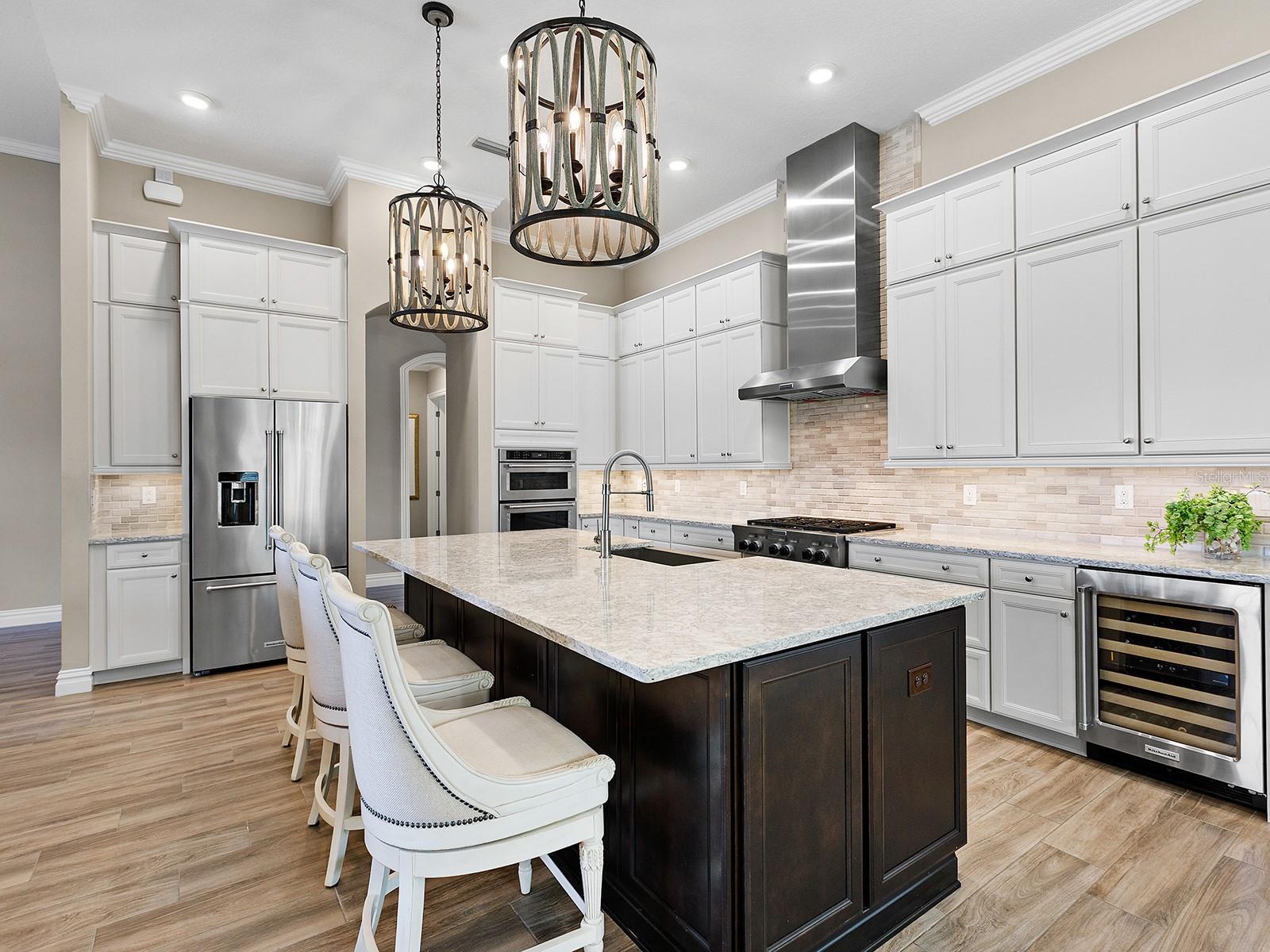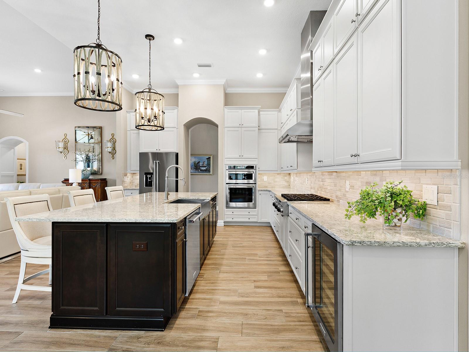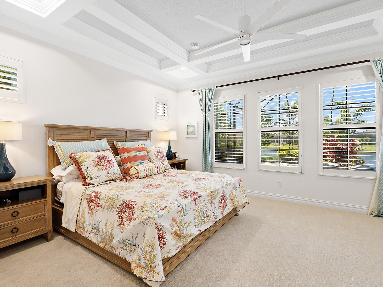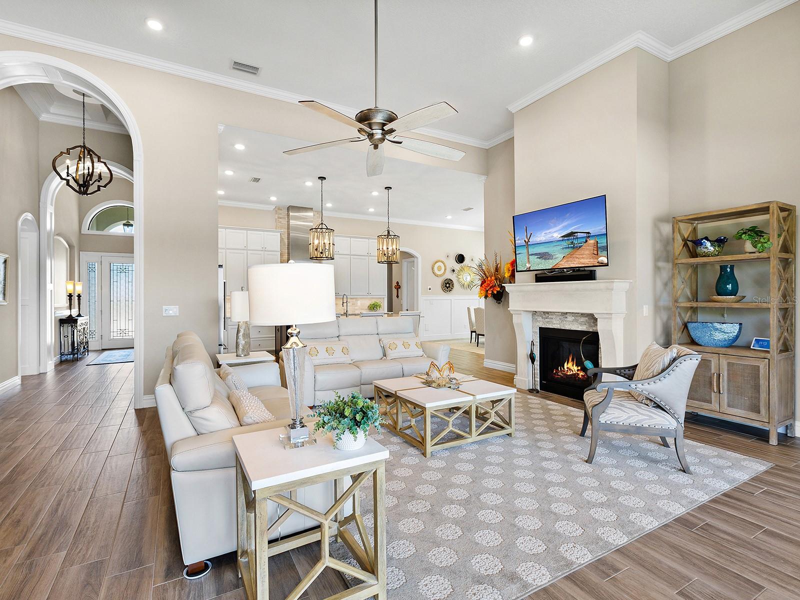 On a tranquil lakefront home site in Country Club East, built by Cardel Homes, this Dolcetto 4 floor plan offers over 3,300 square feet of refined living, where a natural color palette and wood-look tile floors set a tranquil tone. Thoughtful upgrades--custom ceilings, crown molding, designer lighting and detailed trim--blend craftsmanship with comfort throughout. A paver driveway and lush landscaping introduce the home, with no neighbors across the street--just a tranquil walking path and gazebo. A stunning glass front door, framed by side windows and a transom arch, opens to a foyer with a wallpaper-accented niche, tray ceiling, crown molding and coffered details--all set above elegant wood-look tile floors that continue throughout the main living areas. The great room offers a gas fireplace with a carved stone mantle, custom coffered ceilings, crown molding and transom windows above pocketing sliders with electric shades, all framing peaceful lake views. The adjacent kitchen showcases custom cabinetry, quartz countertops, a stainless-steel farm sink, under-cabinet lighting and top-tier KitchenAid appliances--including a six-burner gas cooktop with a vent hood. A spacious walk-in pantry with wood shelving and convenient pullout drawers offers abundant storage. Centered by a large island with pendant lighting, the space flows seamlessly into the open dining area, surrounded by designer windows and detailed wainscoting. Designed for entertaining, the outdoor living area includes a covered summer kitchen with polycarbonate cabinetry, granite countertops, a built-in grill with custom-trimmed vent, remote-controlled screens, and architectural columns that divide lounge and dining zones. A lap pool and spa with blue and teal tile and a water spillover feature complete the lakefront retreat. A custom archway leads to the private guest wing, featuring two spacious bedrooms with walk-in closets, large windows, plush carpet, and a shared Jack and Jill bath with dual vanities, a walk-in shower and subway tile. A separate pool bath, accessible from the bonus room, offers a glass-enclosed shower, designer wallpaper and a solid surface vanity. The primary suite is privately situated and designed for serenity. The bedroom features plush carpet, custom-trimmed coffered ceilings and numerous windows for natural light. The luxurious bath includes a barrel-style ceiling with a chandelier, crown molding, dual quartz-topped vanities, LED-lit mirrors, a free-standing soaking tub, large glass-enclosed walk-in shower with a bench, tile floors and walls, a linen closet and two custom walk-in closets. The office/den features glass French doors, a coffered ceiling with a designer chandelier, a custom accent wall, and a built-in illuminated bookshelf. A nearby bonus room, accessed through a trimmed archway, offers flexible use with crown molding, wood-look tile and plantation-shuttered windows. Additional highlights include a valet drop zone with built-in workspace and storage, an oversized side-entry garage with custom shelving, ceiling racks, plantation-shuttered windows, a Kohler whole-house generator, dual HVAC systems, a tankless water heater and a central vacuum. The laundry room offers cabinetry, folding space, a hanging area, crown molding and a plantation-shuttered window. Country Club East residents enjoy a private clubhouse with fitness center, resort-style pools and proximity to Waterside Place, LWR Main Street and The Mall at UTC.