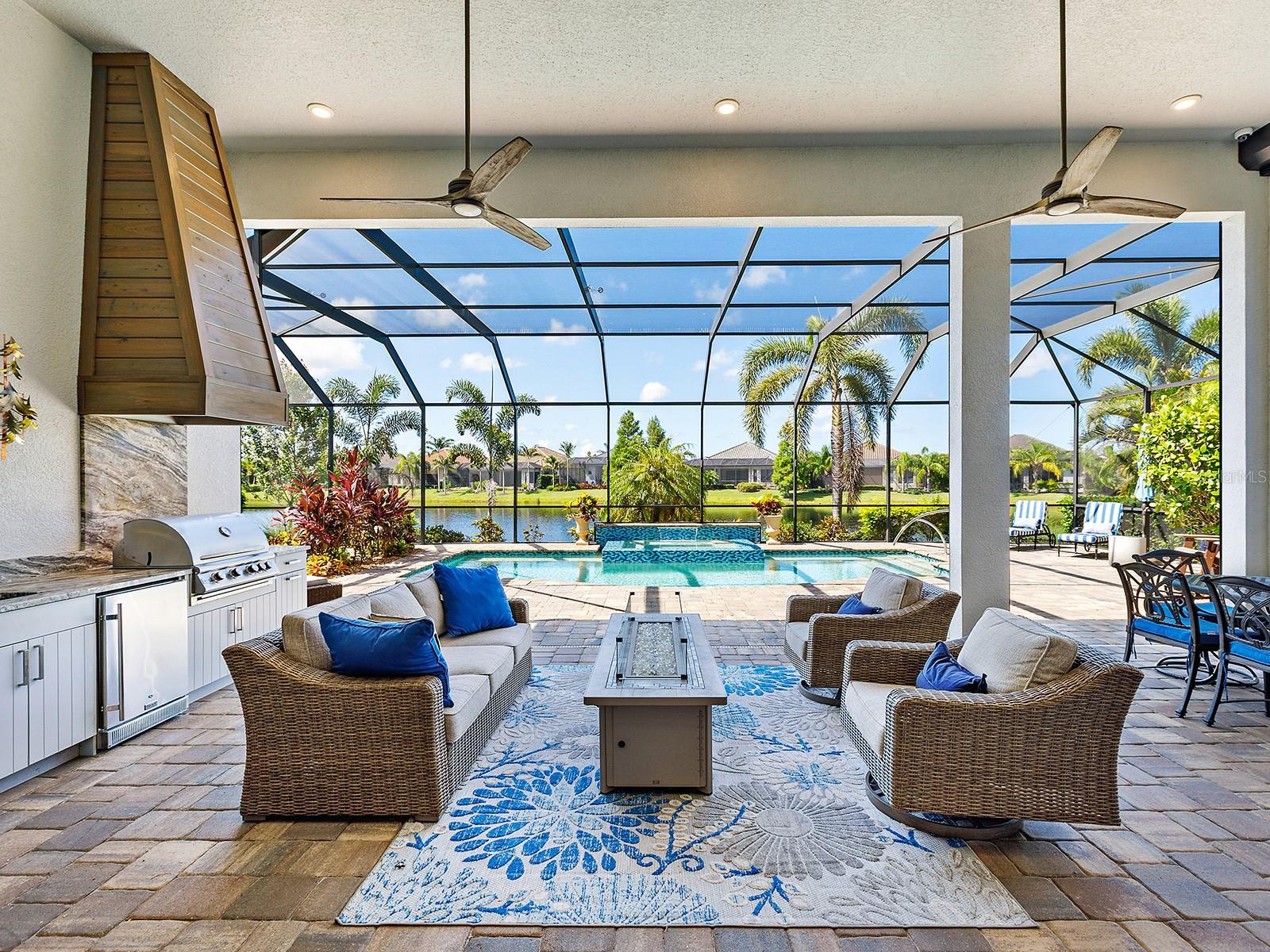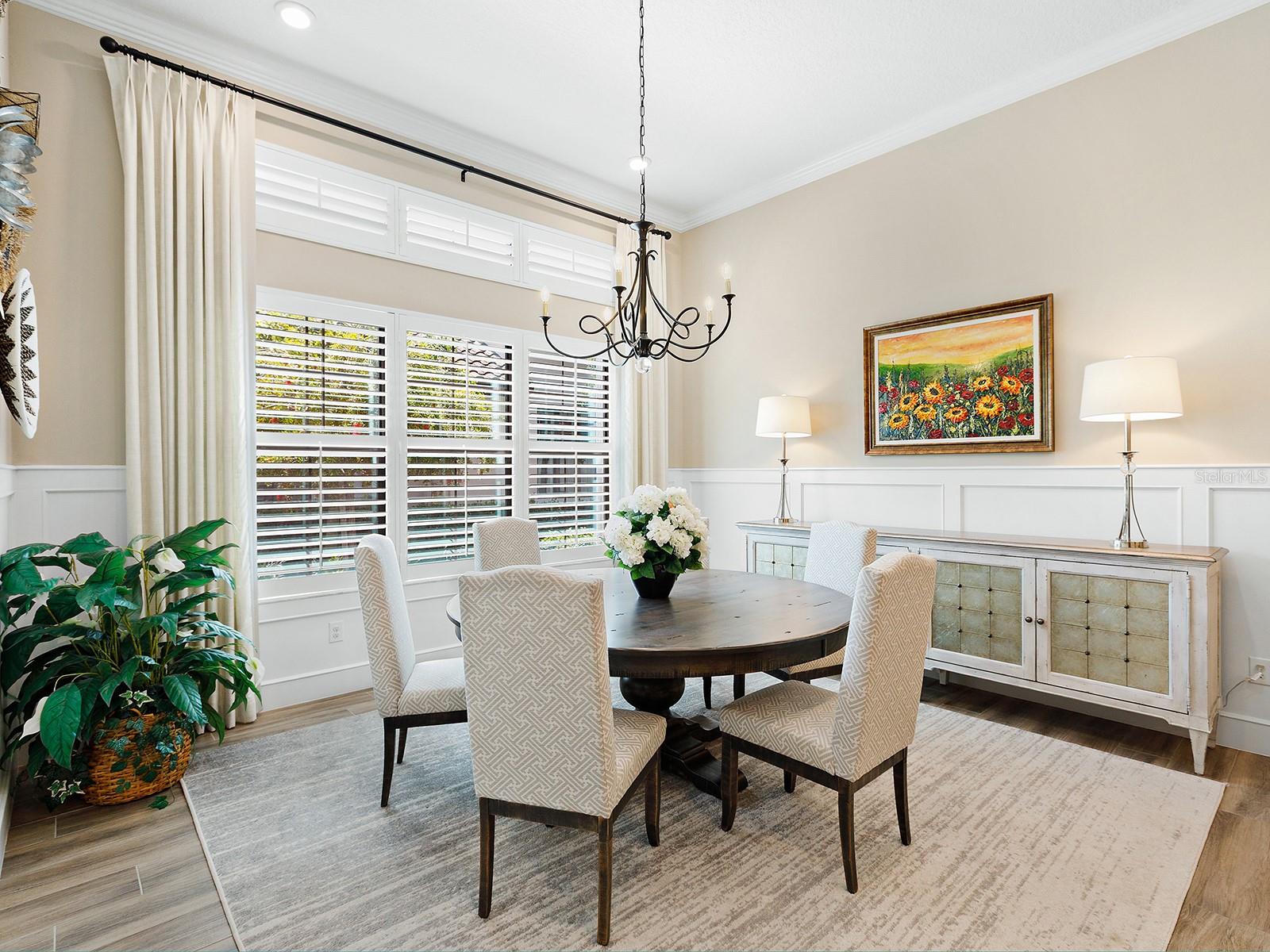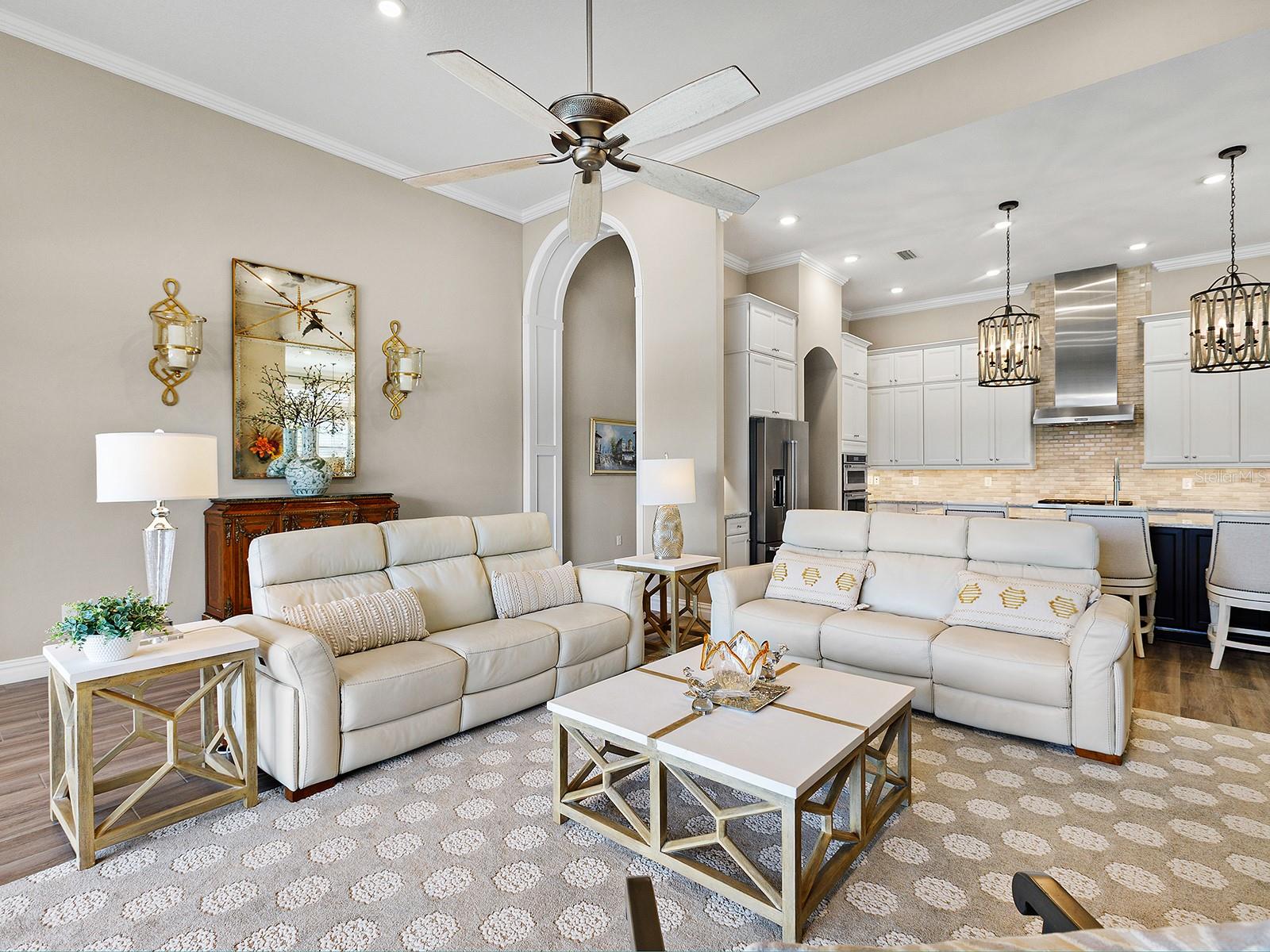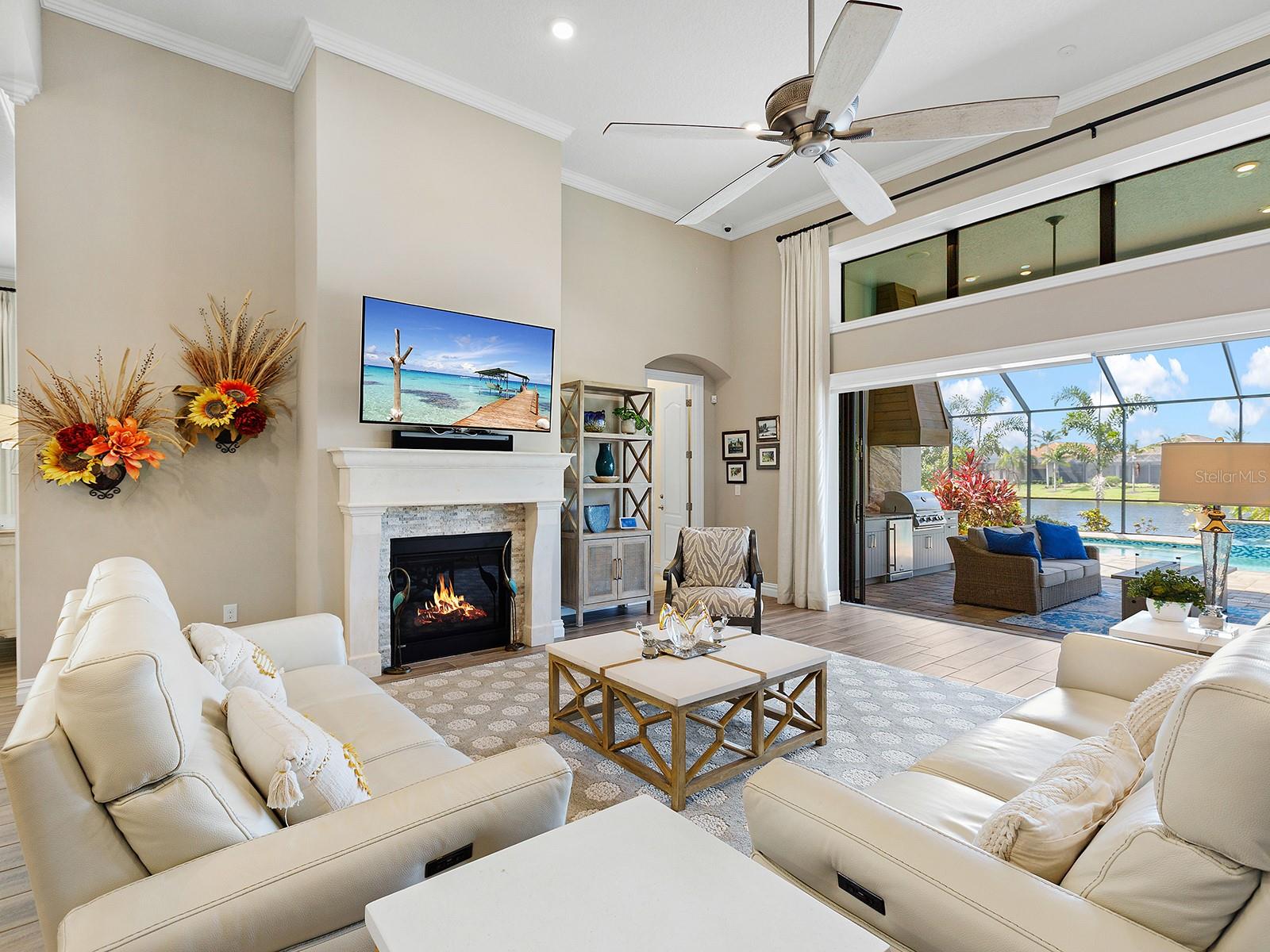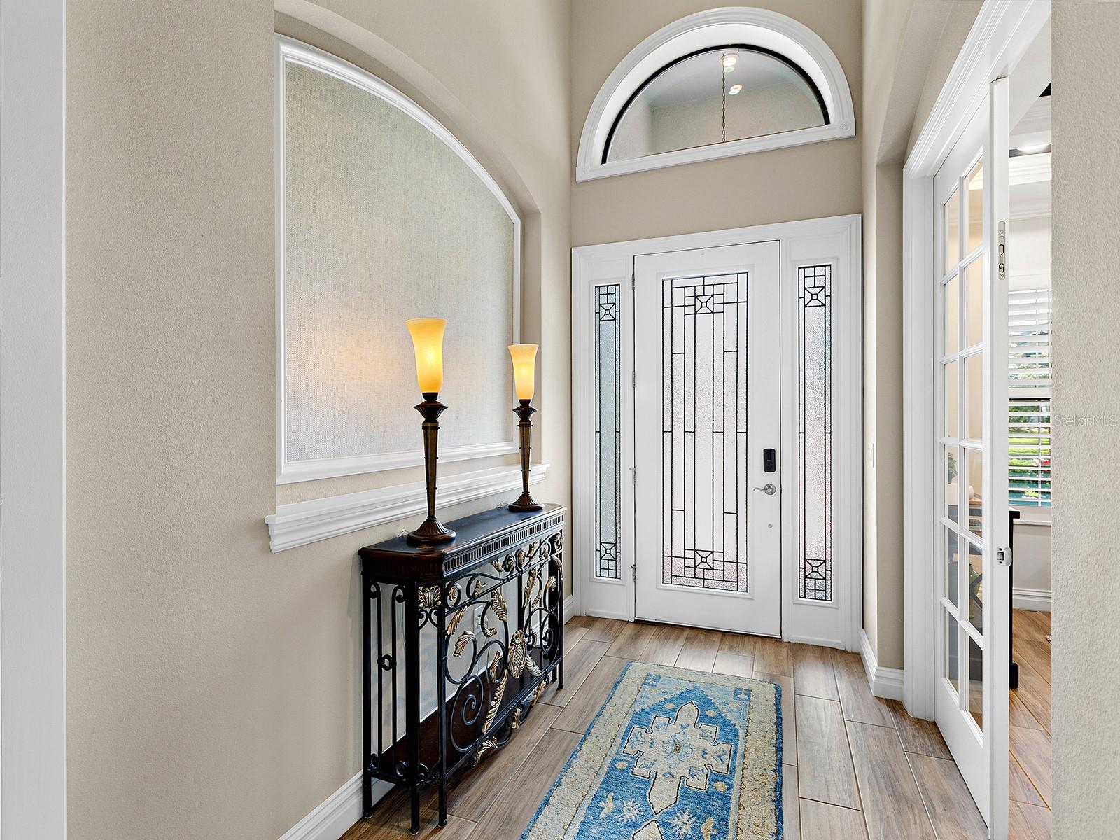 On a tranquil lakefront home site in Country Club East, built by Cardel Homes, this Dolcetto 4 floor plan offers over 3,300 square feet of refined living, where a natural color palette and wood-look tile floors set a tranquil tone. Thoughtful upgrades--custom ceilings, crown molding, designer lighting and detailed trim--blend craftsmanship with comfort throughout. A paver driveway and lush landscaping introduce the home, with no neighbors across the street--just a tranquil walking path and gazebo. A stunning glass front door, framed by side windows and a transom arch, opens to a foyer with a wallpaper-accented niche, tray ceiling, crown molding and coffered details--all set above elegant wood-look tile floors that continue throughout the main living areas. The great room offers a gas fireplace with a carved stone mantle, custom coffered ceilings, crown molding and transom windows above pocketing sliders with electric shades, all framing peaceful lake views. The adjacent kitchen showcases custom cabinetry, quartz countertops, a stainless-steel farm sink, under-cabinet lighting and top-tier KitchenAid appliances--including a six-burner gas cooktop with a vent hood. A spacious walk-in pantry with wood shelving and convenient pullout drawers offers abundant storage. Centered by a large island with pendant lighting, the space flows seamlessly into the open dining area, surrounded by designer windows and detailed wainscoting. Designed for entertaining, the outdoor living area includes a covered summer kitchen with polycarbonate cabinetry, granite countertops, a built-in grill with custom-trimmed vent, remote-controlled screens, and architectural columns that divide lounge and dining zones. A lap pool and spa with blue and teal tile and a water spillover feature complete the lakefront retreat. A custom archway leads to the private guest wing, featuring two spacious bedrooms with walk-in closets, large windows, plush carpet, and a shared Jack and Jill bath with dual vanities, a walk-in shower and subway tile. A separate pool bath, accessible from the bonus room, offers a glass-enclosed shower, designer wallpaper and a solid surface vanity. The primary suite is privately situated and designed for serenity. The bedroom features plush carpet, custom-trimmed coffered ceilings and numerous windows for natural light. The luxurious bath includes a barrel-style ceiling with a chandelier, crown molding, dual quartz-topped vanities, LED-lit mirrors, a free-standing soaking tub, large glass-enclosed walk-in shower with a bench, tile floors and walls, a linen closet and two custom walk-in closets. The office/den features glass French doors, a coffered ceiling with a designer chandelier, a custom accent wall, and a built-in illuminated bookshelf. A nearby bonus room, accessed through a trimmed archway, offers flexible use with crown molding, wood-look tile and plantation-shuttered windows. Additional highlights include a valet drop zone with built-in workspace and storage, an oversized side-entry garage with custom shelving, ceiling racks, plantation-shuttered windows, a Kohler whole-house generator, dual HVAC systems, a tankless water heater and a central vacuum. The laundry room offers cabinetry, folding space, a hanging area, crown molding and a plantation-shuttered window. Country Club East residents enjoy a private clubhouse with fitness center, resort-style pools and proximity to Waterside Place, LWR Main Street and The Mall at UTC.