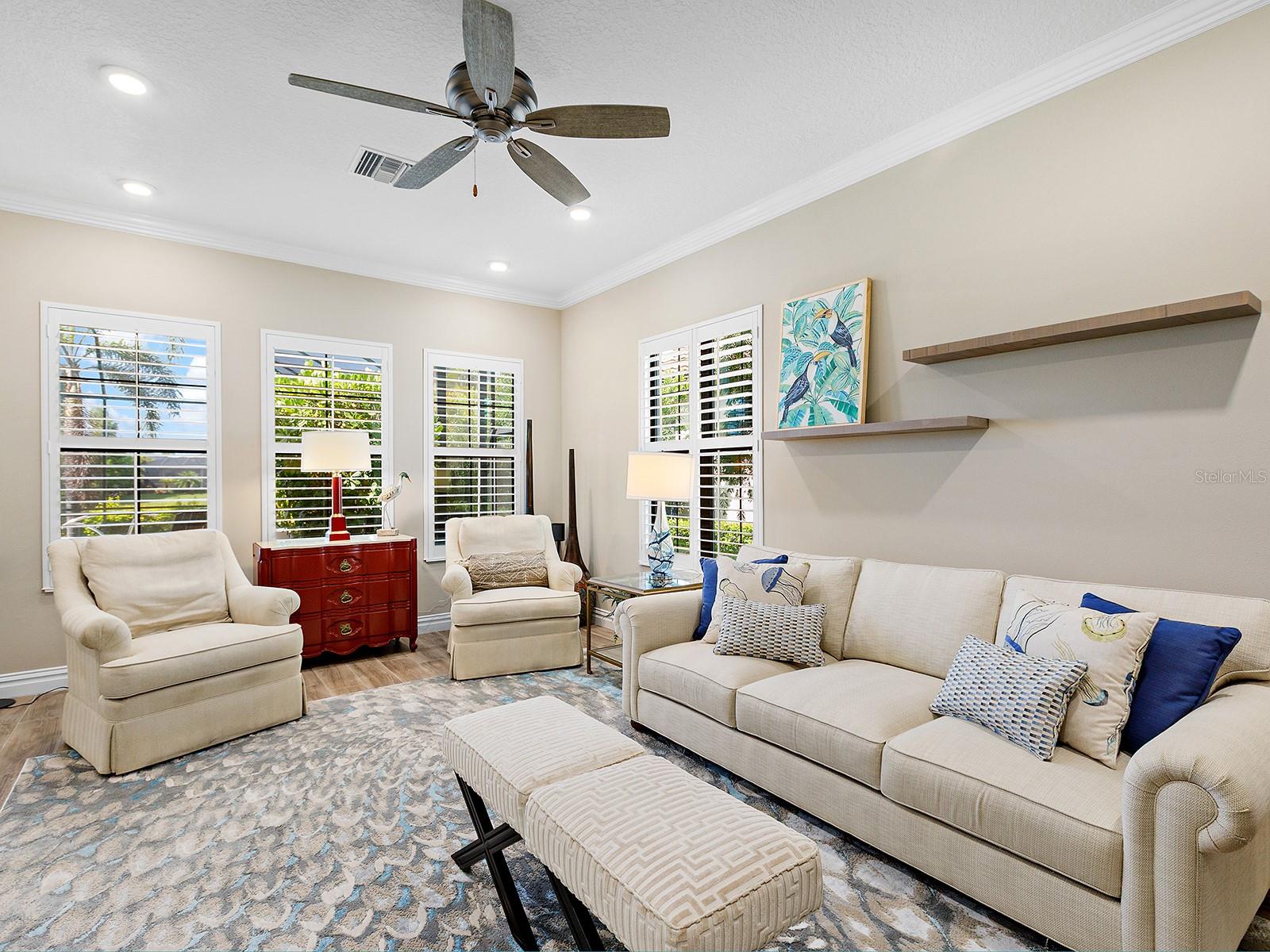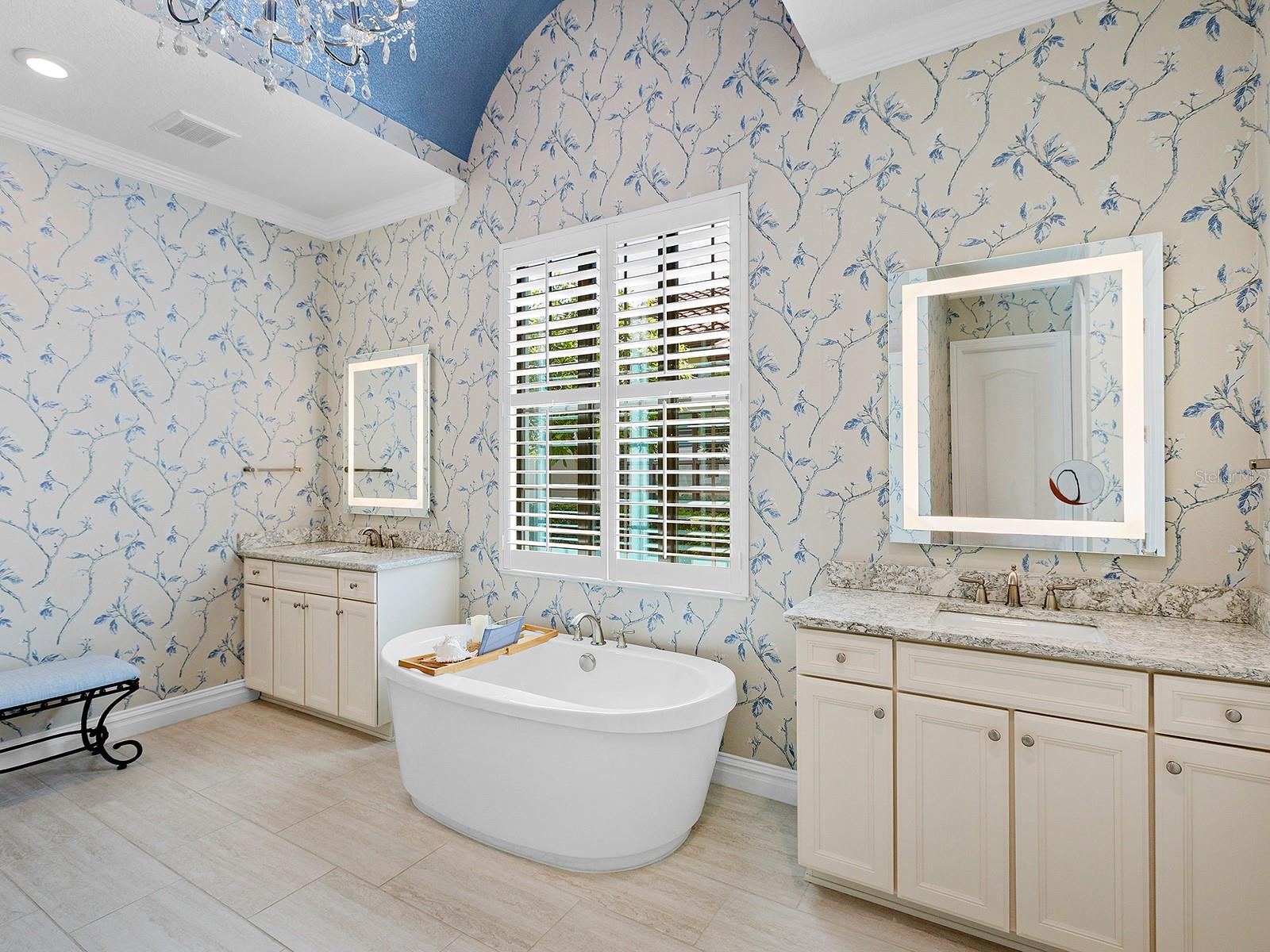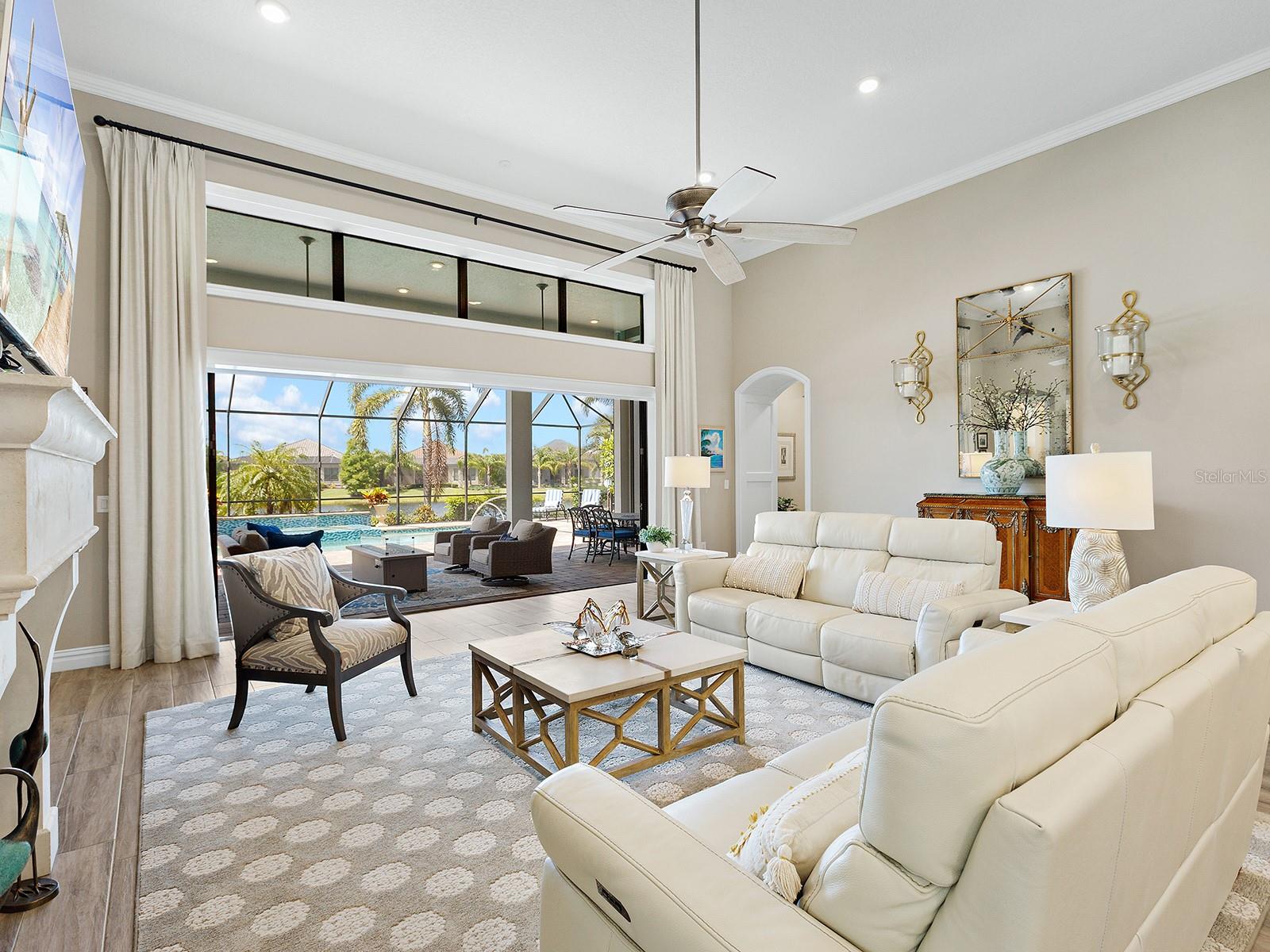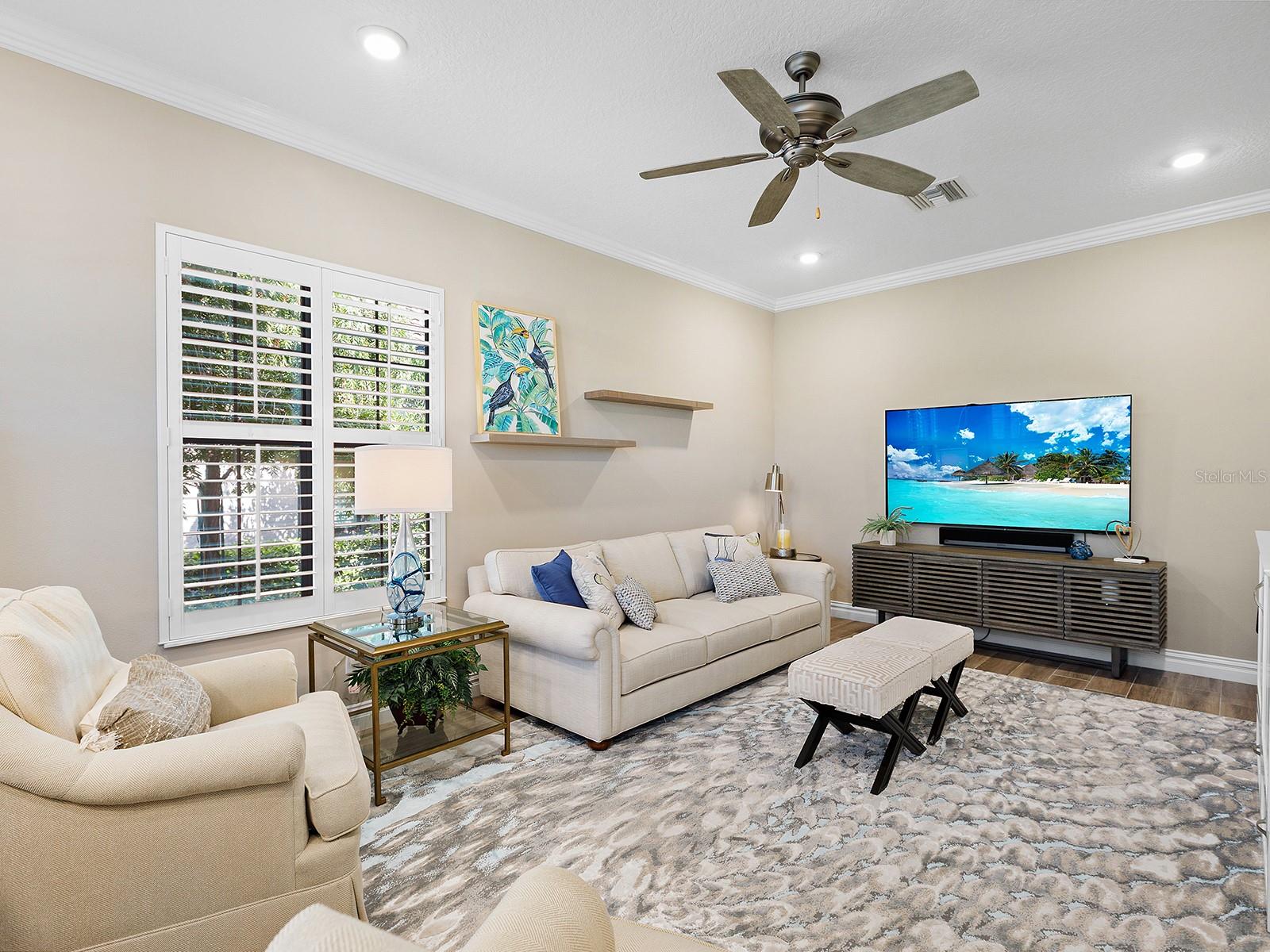 On a tranquil lakefront home site in Country Club East, built by Cardel Homes, this Dolcetto 4 floor plan offers over 3,300 square feet of refined living, where a natural color palette and wood-look tile floors set a tranquil tone. Thoughtful upgrades--custom ceilings, crown molding, designer lighting and detailed trim--blend craftsmanship with comfort throughout. A paver driveway and lush landscaping introduce the home, with no neighbors across the street--just a tranquil walking path and gazebo. A stunning glass front door, framed by side windows and a transom arch, opens to a foyer with a wallpaper-accented niche, tray ceiling, crown molding and coffered details--all set above elegant wood-look tile floors that continue throughout the main living areas. The great room offers a gas fireplace with a carved stone mantle, custom coffered ceilings, crown molding and transom windows above pocketing sliders with electric shades, all framing peaceful lake views. The adjacent kitchen showcases custom cabinetry, quartz countertops, a stainless-steel farm sink, under-cabinet lighting and top-tier KitchenAid appliances--including a six-burner gas cooktop with a vent hood. A spacious walk-in pantry with wood shelving and convenient pullout drawers offers abundant storage. Centered by a large island with pendant lighting, the space flows seamlessly into the open dining area, surrounded by designer windows and detailed wainscoting. Designed for entertaining, the outdoor living area includes a covered summer kitchen with polycarbonate cabinetry, granite countertops, a built-in grill with custom-trimmed vent, remote-controlled screens, and architectural columns that divide lounge and dining zones. A lap pool and spa with blue and teal tile and a water spillover feature complete the lakefront retreat. A custom archway leads to the private guest wing, featuring two spacious bedrooms with walk-in closets, large windows, plush carpet, and a shared Jack and Jill bath with dual vanities, a walk-in shower and subway tile. A separate pool bath, accessible from the bonus room, offers a glass-enclosed shower, designer wallpaper and a solid surface vanity. The primary suite is privately situated and designed for serenity. The bedroom features plush carpet, custom-trimmed coffered ceilings and numerous windows for natural light. The luxurious bath includes a barrel-style ceiling with a chandelier, crown molding, dual quartz-topped vanities, LED-lit mirrors, a free-standing soaking tub, large glass-enclosed walk-in shower with a bench, tile floors and walls, a linen closet and two custom walk-in closets. The office/den features glass French doors, a coffered ceiling with a designer chandelier, a custom accent wall, and a built-in illuminated bookshelf. A nearby bonus room, accessed through a trimmed archway, offers flexible use with crown molding, wood-look tile and plantation-shuttered windows. Additional highlights include a valet drop zone with built-in workspace and storage, an oversized side-entry garage with custom shelving, ceiling racks, plantation-shuttered windows, a Kohler whole-house generator, dual HVAC systems, a tankless water heater and a central vacuum. The laundry room offers cabinetry, folding space, a hanging area, crown molding and a plantation-shuttered window. Country Club East residents enjoy a private clubhouse with fitness center, resort-style pools and proximity to Waterside Place, LWR Main Street and The Mall at UTC.