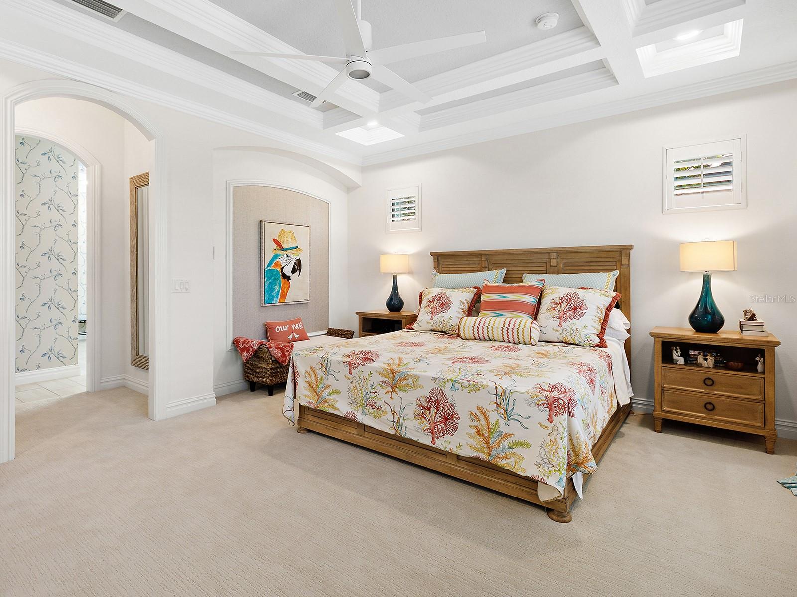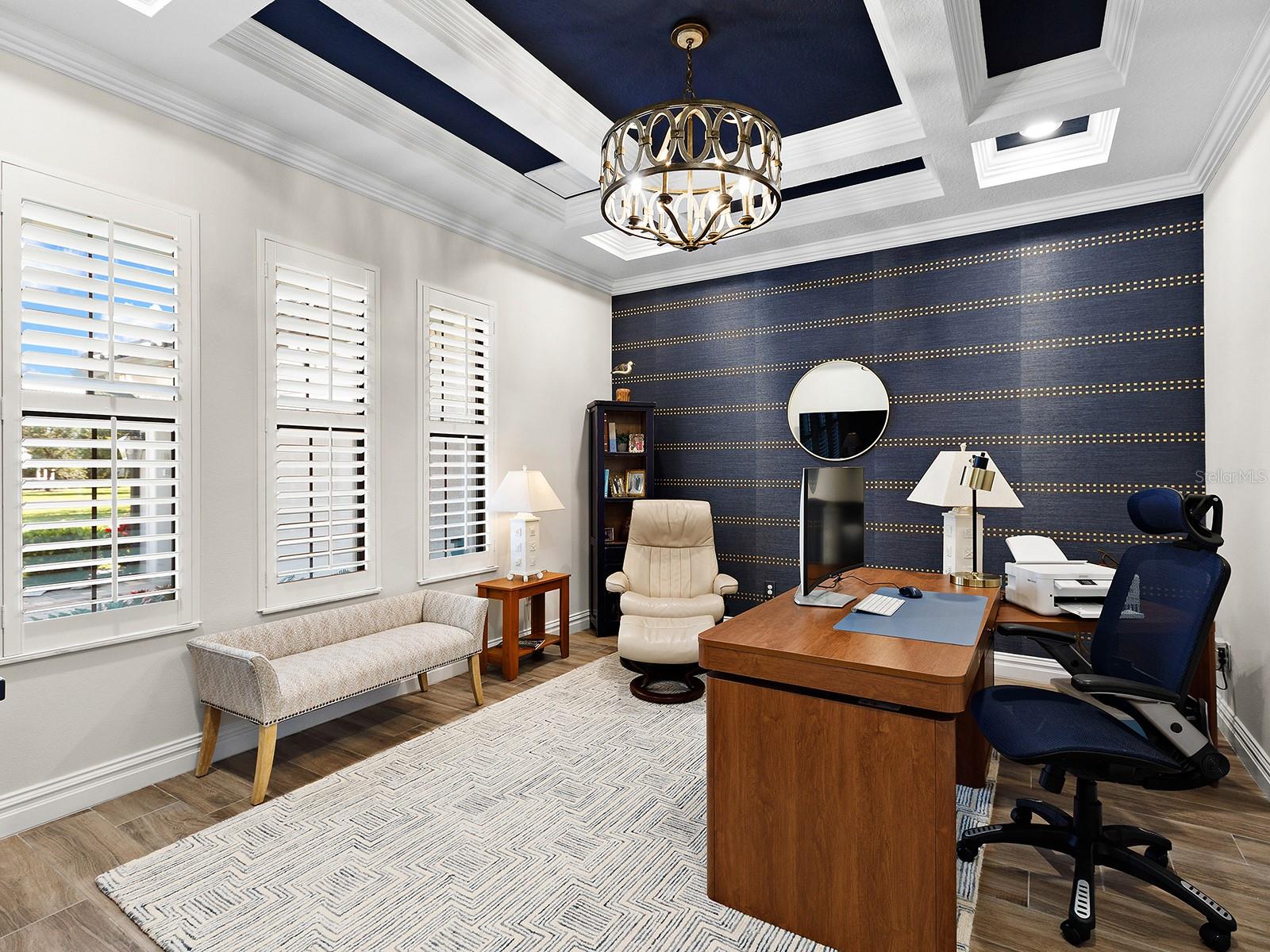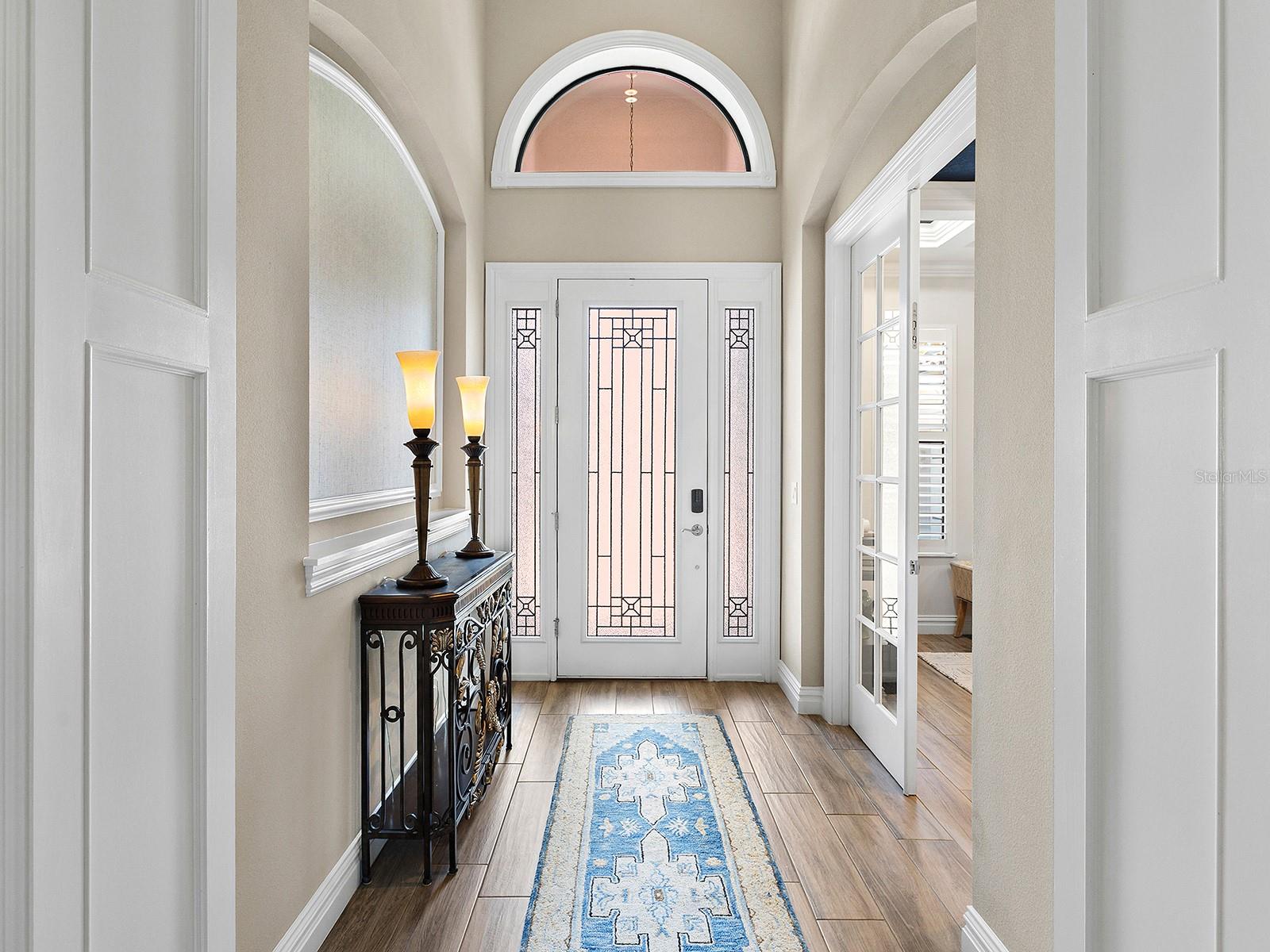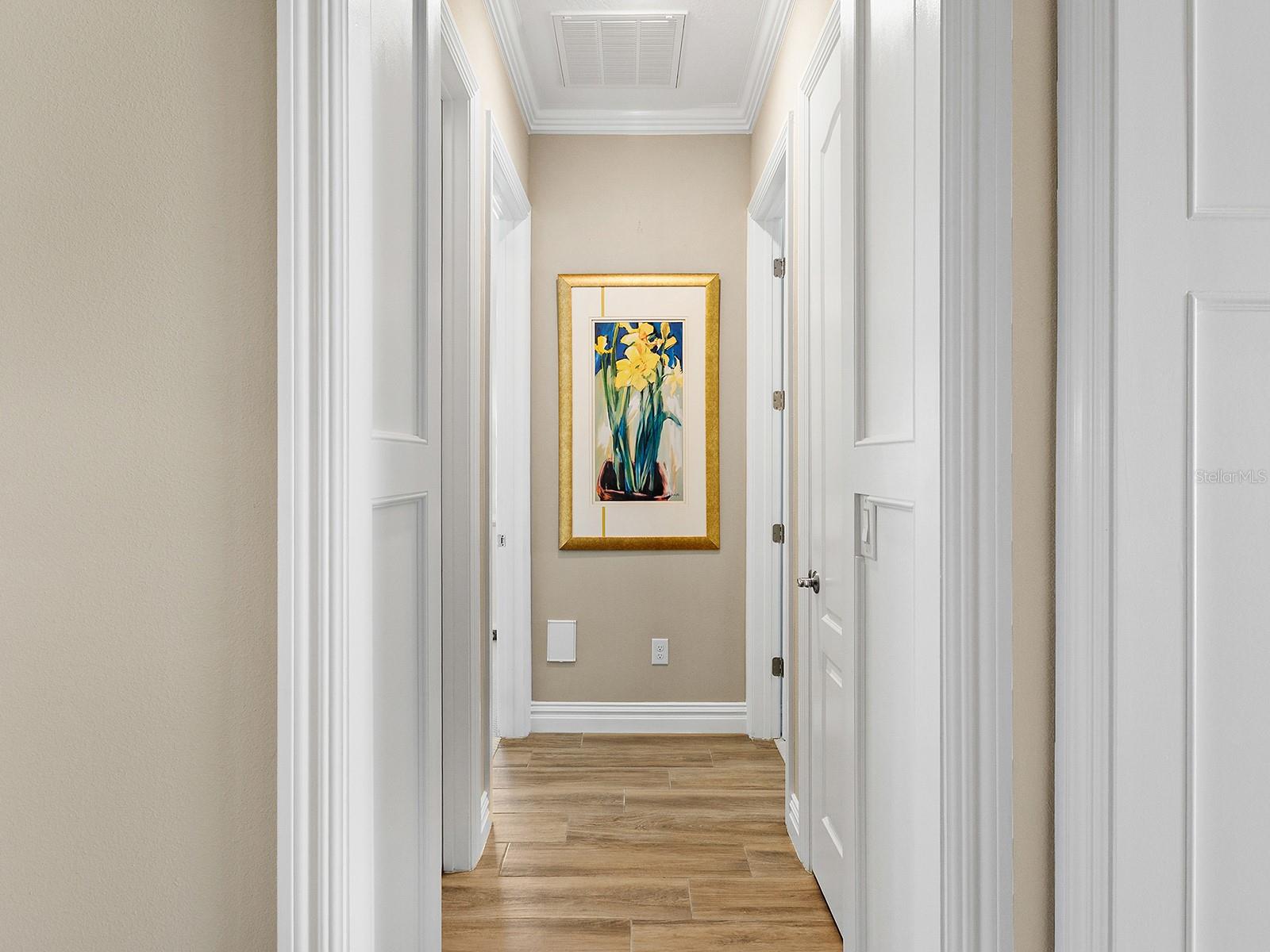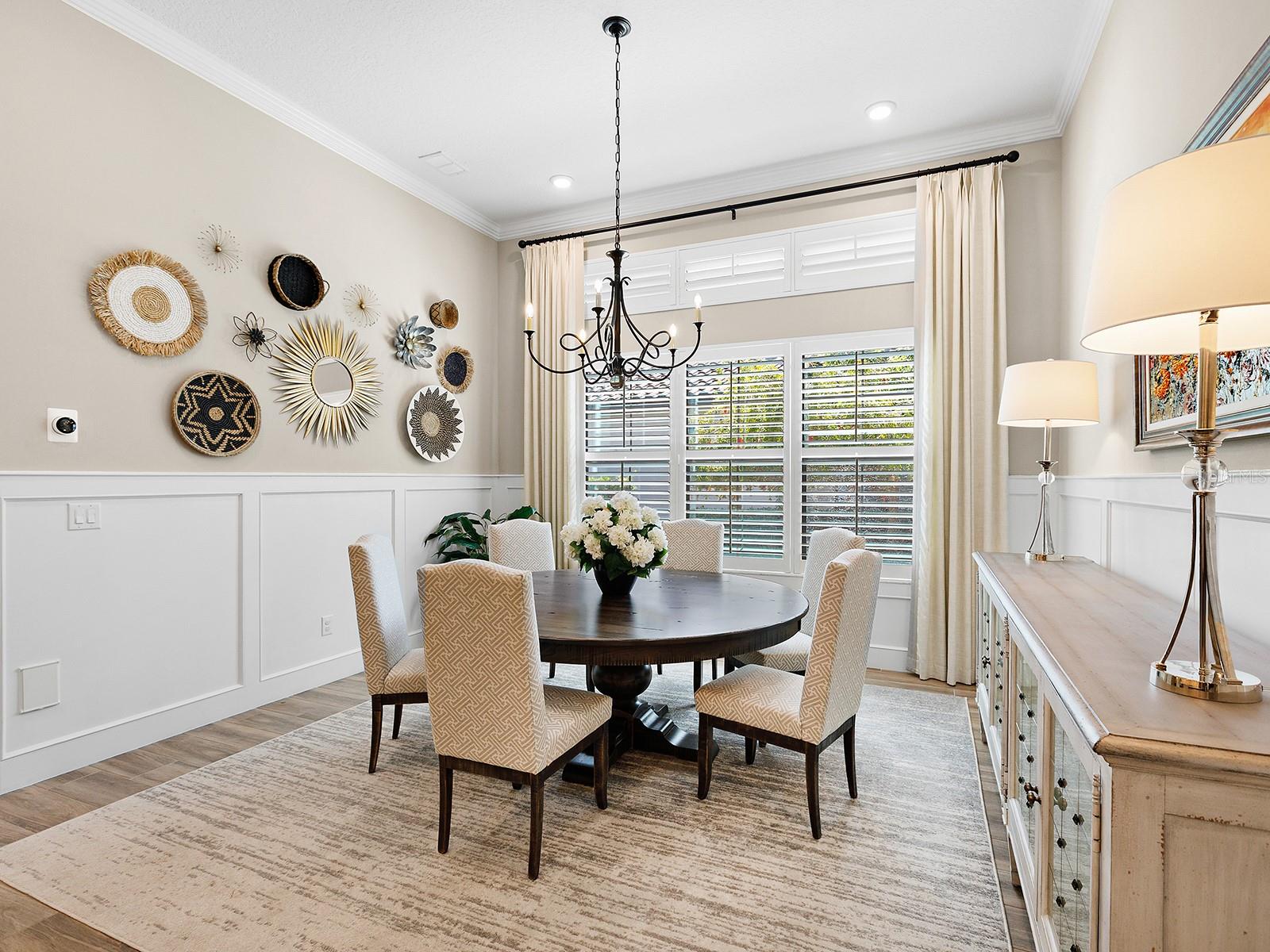 On a tranquil lakefront home site in Country Club East, built by Cardel Homes, this Dolcetto 4 floor plan offers over 3,300 square feet of refined living, where a natural color palette and wood-look tile floors set a tranquil tone. Thoughtful upgrades--custom ceilings, crown molding, designer lighting and detailed trim--blend craftsmanship with comfort throughout. A paver driveway and lush landscaping introduce the home, with no neighbors across the street--just a tranquil walking path and gazebo. A stunning glass front door, framed by side windows and a transom arch, opens to a foyer with a wallpaper-accented niche, tray ceiling, crown molding and coffered details--all set above elegant wood-look tile floors that continue throughout the main living areas. The great room offers a gas fireplace with a carved stone mantle, custom coffered ceilings, crown molding and transom windows above pocketing sliders with electric shades, all framing peaceful lake views. The adjacent kitchen showcases custom cabinetry, quartz countertops, a stainless-steel farm sink, under-cabinet lighting and top-tier KitchenAid appliances--including a six-burner gas cooktop with a vent hood. A spacious walk-in pantry with wood shelving and convenient pullout drawers offers abundant storage. Centered by a large island with pendant lighting, the space flows seamlessly into the open dining area, surrounded by designer windows and detailed wainscoting. Designed for entertaining, the outdoor living area includes a covered summer kitchen with polycarbonate cabinetry, granite countertops, a built-in grill with custom-trimmed vent, remote-controlled screens, and architectural columns that divide lounge and dining zones. A lap pool and spa with blue and teal tile and a water spillover feature complete the lakefront retreat. A custom archway leads to the private guest wing, featuring two spacious bedrooms with walk-in closets, large windows, plush carpet, and a shared Jack and Jill bath with dual vanities, a walk-in shower and subway tile. A separate pool bath, accessible from the bonus room, offers a glass-enclosed shower, designer wallpaper and a solid surface vanity. The primary suite is privately situated and designed for serenity. The bedroom features plush carpet, custom-trimmed coffered ceilings and numerous windows for natural light. The luxurious bath includes a barrel-style ceiling with a chandelier, crown molding, dual quartz-topped vanities, LED-lit mirrors, a free-standing soaking tub, large glass-enclosed walk-in shower with a bench, tile floors and walls, a linen closet and two custom walk-in closets. The office/den features glass French doors, a coffered ceiling with a designer chandelier, a custom accent wall, and a built-in illuminated bookshelf. A nearby bonus room, accessed through a trimmed archway, offers flexible use with crown molding, wood-look tile and plantation-shuttered windows. Additional highlights include a valet drop zone with built-in workspace and storage, an oversized side-entry garage with custom shelving, ceiling racks, plantation-shuttered windows, a Kohler whole-house generator, dual HVAC systems, a tankless water heater and a central vacuum. The laundry room offers cabinetry, folding space, a hanging area, crown molding and a plantation-shuttered window. Country Club East residents enjoy a private clubhouse with fitness center, resort-style pools and proximity to Waterside Place, LWR Main Street and The Mall at UTC.