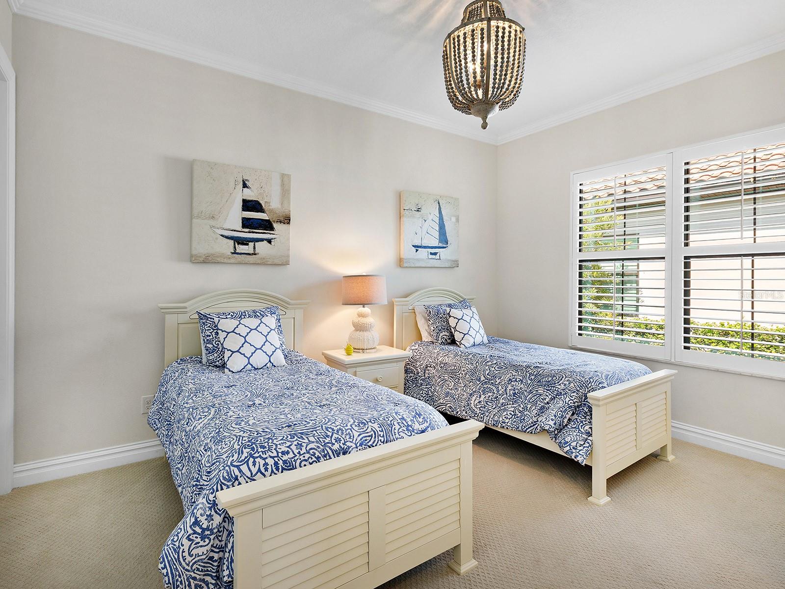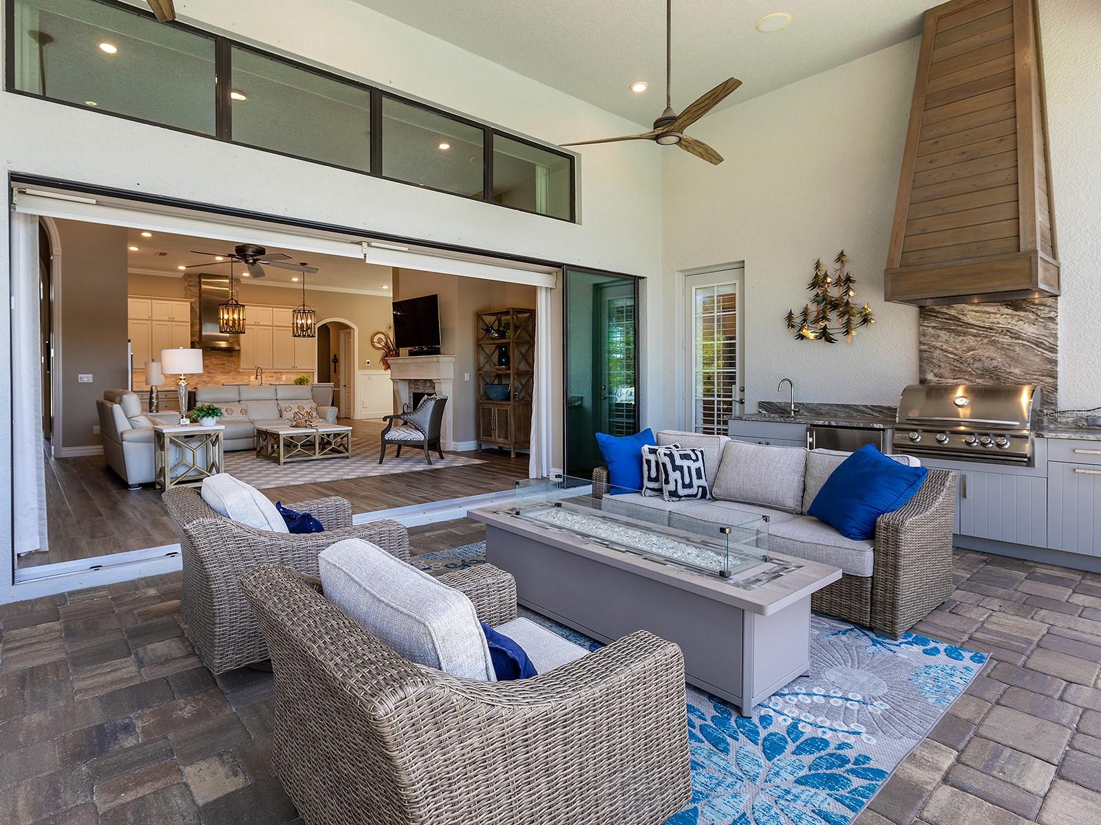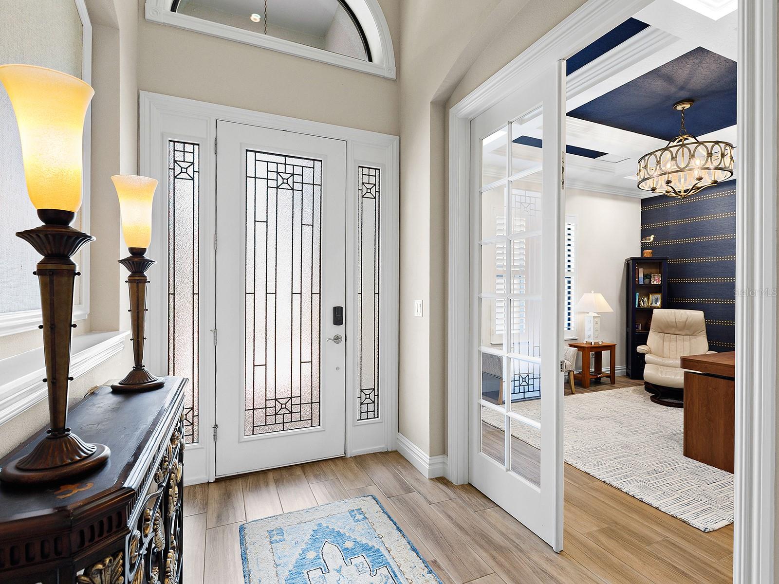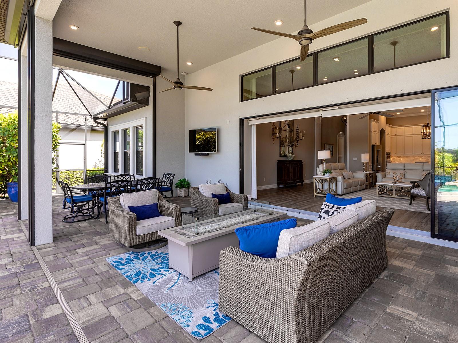 On a tranquil lakefront home site in Country Club East, built by Cardel Homes, this Dolcetto 4 floor plan offers over 3,300 square feet of refined living, where a natural color palette and wood-look tile floors set a tranquil tone. Thoughtful upgrades--custom ceilings, crown molding, designer lighting and detailed trim--blend craftsmanship with comfort throughout. A paver driveway and lush landscaping introduce the home, with no neighbors across the street--just a tranquil walking path and gazebo. A stunning glass front door, framed by side windows and a transom arch, opens to a foyer with a wallpaper-accented niche, tray ceiling, crown molding and coffered details--all set above elegant wood-look tile floors that continue throughout the main living areas. The great room offers a gas fireplace with a carved stone mantle, custom coffered ceilings, crown molding and transom windows above pocketing sliders with electric shades, all framing peaceful lake views. The adjacent kitchen showcases custom cabinetry, quartz countertops, a stainless-steel farm sink, under-cabinet lighting and top-tier KitchenAid appliances--including a six-burner gas cooktop with a vent hood. A spacious walk-in pantry with wood shelving and convenient pullout drawers offers abundant storage. Centered by a large island with pendant lighting, the space flows seamlessly into the open dining area, surrounded by designer windows and detailed wainscoting. Designed for entertaining, the outdoor living area includes a covered summer kitchen with polycarbonate cabinetry, granite countertops, a built-in grill with custom-trimmed vent, remote-controlled screens, and architectural columns that divide lounge and dining zones. A lap pool and spa with blue and teal tile and a water spillover feature complete the lakefront retreat. A custom archway leads to the private guest wing, featuring two spacious bedrooms with walk-in closets, large windows, plush carpet, and a shared Jack and Jill bath with dual vanities, a walk-in shower and subway tile. A separate pool bath, accessible from the bonus room, offers a glass-enclosed shower, designer wallpaper and a solid surface vanity. The primary suite is privately situated and designed for serenity. The bedroom features plush carpet, custom-trimmed coffered ceilings and numerous windows for natural light. The luxurious bath includes a barrel-style ceiling with a chandelier, crown molding, dual quartz-topped vanities, LED-lit mirrors, a free-standing soaking tub, large glass-enclosed walk-in shower with a bench, tile floors and walls, a linen closet and two custom walk-in closets. The office/den features glass French doors, a coffered ceiling with a designer chandelier, a custom accent wall, and a built-in illuminated bookshelf. A nearby bonus room, accessed through a trimmed archway, offers flexible use with crown molding, wood-look tile and plantation-shuttered windows. Additional highlights include a valet drop zone with built-in workspace and storage, an oversized side-entry garage with custom shelving, ceiling racks, plantation-shuttered windows, a Kohler whole-house generator, dual HVAC systems, a tankless water heater and a central vacuum. The laundry room offers cabinetry, folding space, a hanging area, crown molding and a plantation-shuttered window. Country Club East residents enjoy a private clubhouse with fitness center, resort-style pools and proximity to Waterside Place, LWR Main Street and The Mall at UTC.