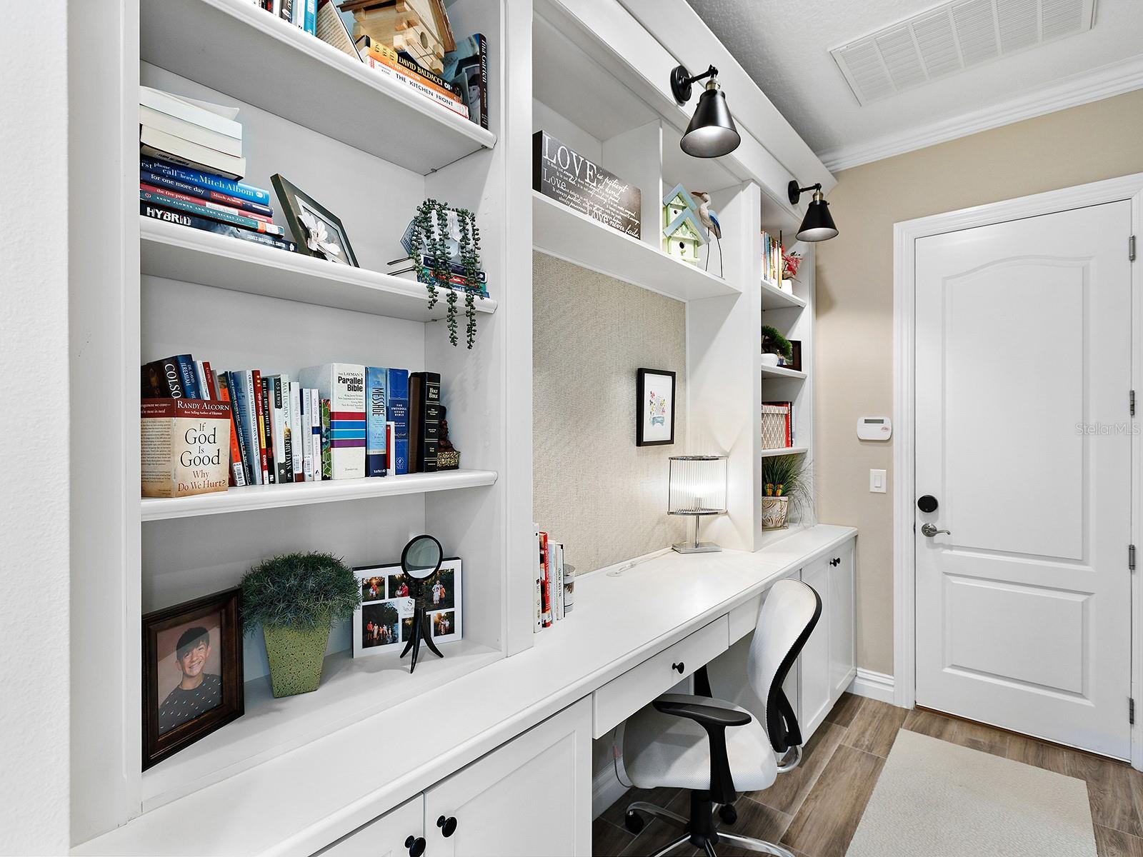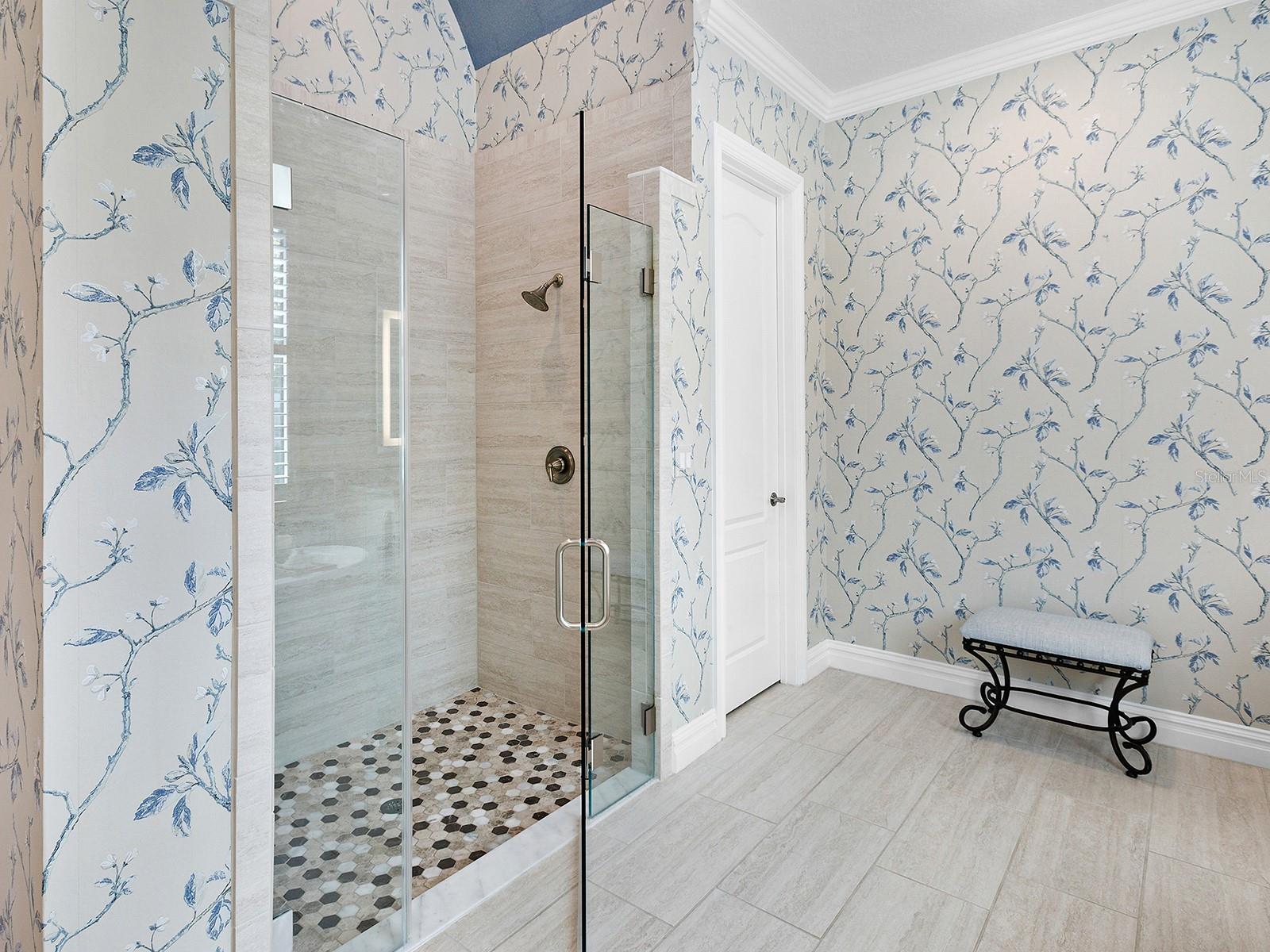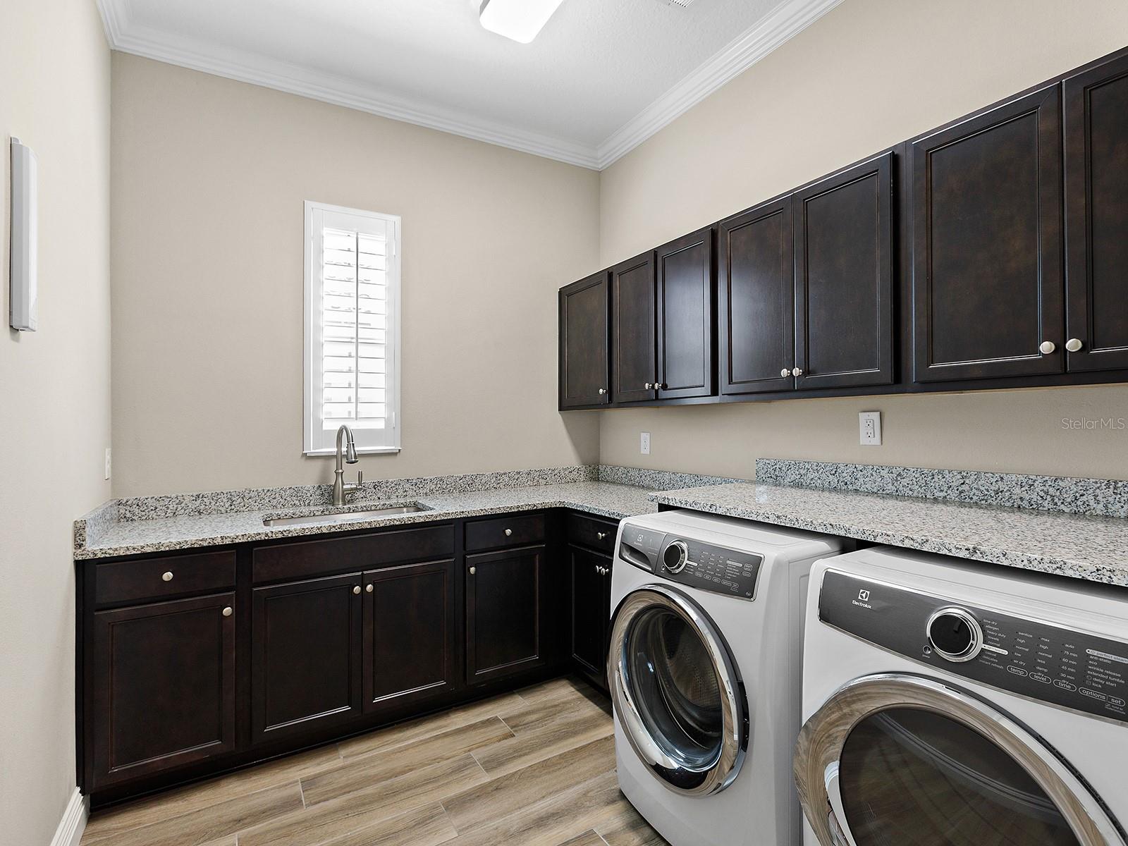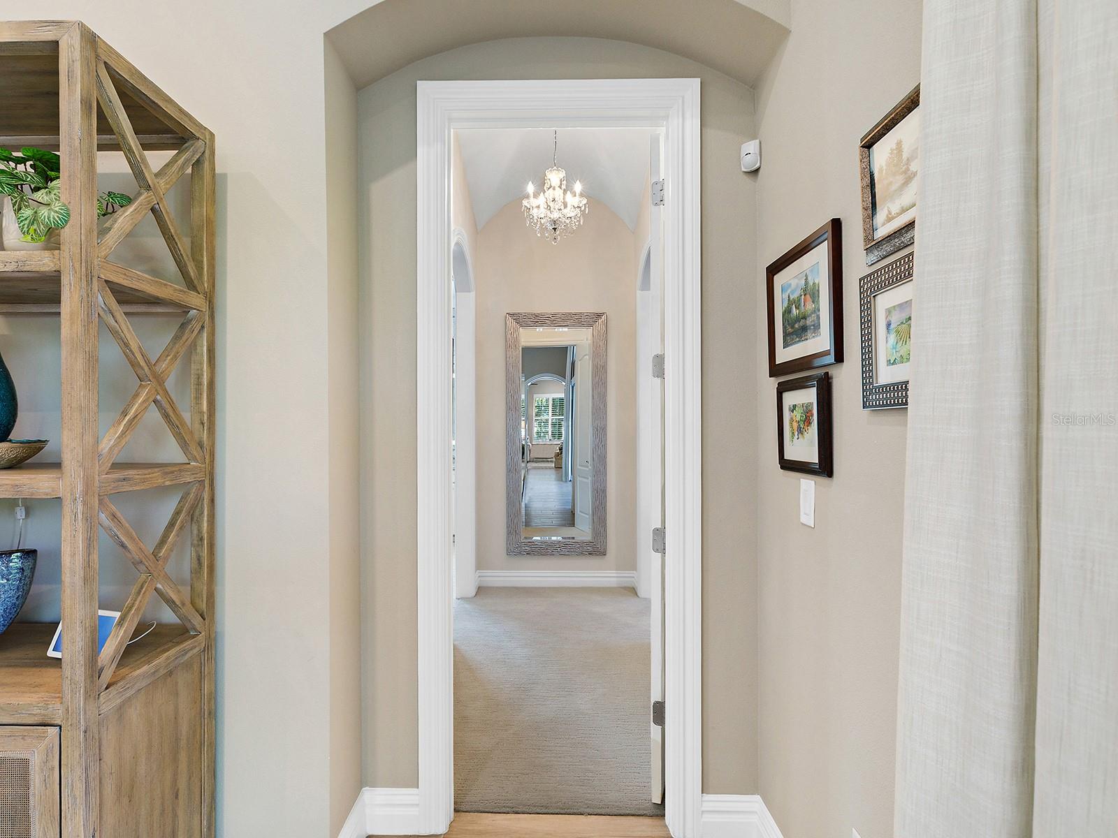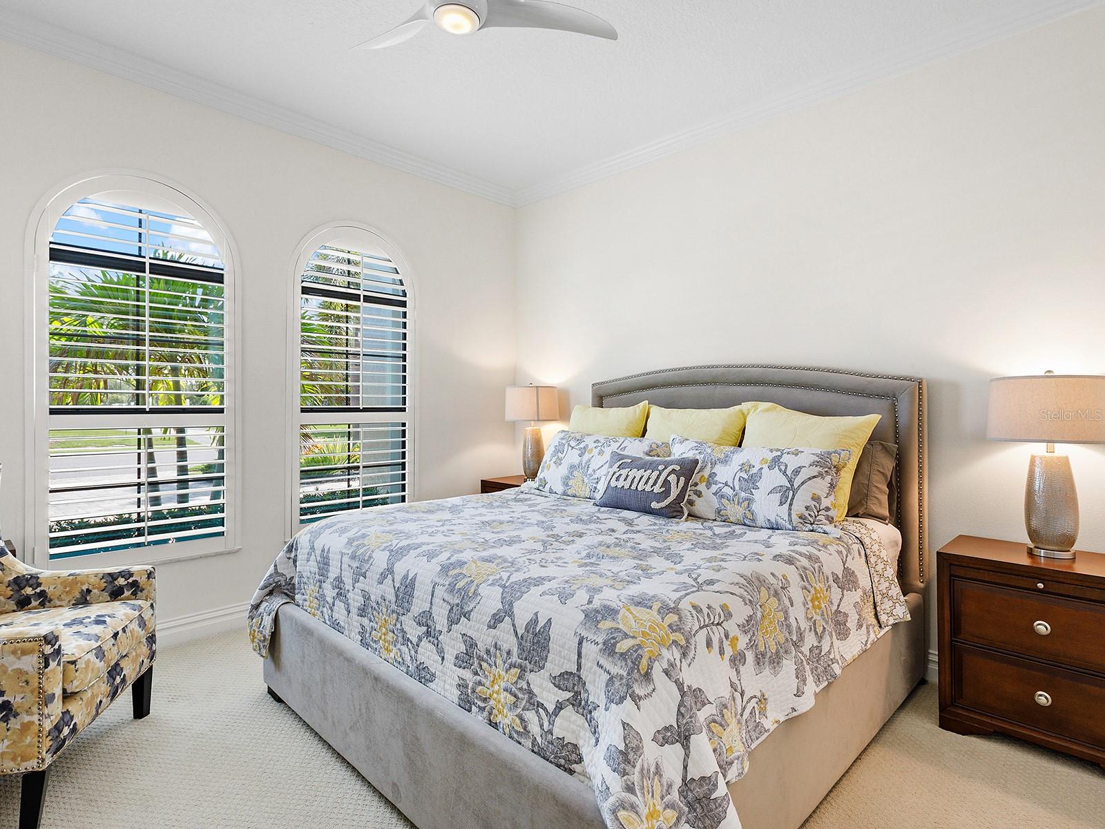 On a tranquil lakefront home site in Country Club East, built by Cardel Homes, this Dolcetto 4 floor plan offers over 3,300 square feet of refined living, where a natural color palette and wood-look tile floors set a tranquil tone. Thoughtful upgrades--custom ceilings, crown molding, designer lighting and detailed trim--blend craftsmanship with comfort throughout. A paver driveway and lush landscaping introduce the home, with no neighbors across the street--just a tranquil walking path and gazebo. A stunning glass front door, framed by side windows and a transom arch, opens to a foyer with a wallpaper-accented niche, tray ceiling, crown molding and coffered details--all set above elegant wood-look tile floors that continue throughout the main living areas. The great room offers a gas fireplace with a carved stone mantle, custom coffered ceilings, crown molding and transom windows above pocketing sliders with electric shades, all framing peaceful lake views. The adjacent kitchen showcases custom cabinetry, quartz countertops, a stainless-steel farm sink, under-cabinet lighting and top-tier KitchenAid appliances--including a six-burner gas cooktop with a vent hood. A spacious walk-in pantry with wood shelving and convenient pullout drawers offers abundant storage. Centered by a large island with pendant lighting, the space flows seamlessly into the open dining area, surrounded by designer windows and detailed wainscoting. Designed for entertaining, the outdoor living area includes a covered summer kitchen with polycarbonate cabinetry, granite countertops, a built-in grill with custom-trimmed vent, remote-controlled screens, and architectural columns that divide lounge and dining zones. A lap pool and spa with blue and teal tile and a water spillover feature complete the lakefront retreat. A custom archway leads to the private guest wing, featuring two spacious bedrooms with walk-in closets, large windows, plush carpet, and a shared Jack and Jill bath with dual vanities, a walk-in shower and subway tile. A separate pool bath, accessible from the bonus room, offers a glass-enclosed shower, designer wallpaper and a solid surface vanity. The primary suite is privately situated and designed for serenity. The bedroom features plush carpet, custom-trimmed coffered ceilings and numerous windows for natural light. The luxurious bath includes a barrel-style ceiling with a chandelier, crown molding, dual quartz-topped vanities, LED-lit mirrors, a free-standing soaking tub, large glass-enclosed walk-in shower with a bench, tile floors and walls, a linen closet and two custom walk-in closets. The office/den features glass French doors, a coffered ceiling with a designer chandelier, a custom accent wall, and a built-in illuminated bookshelf. A nearby bonus room, accessed through a trimmed archway, offers flexible use with crown molding, wood-look tile and plantation-shuttered windows. Additional highlights include a valet drop zone with built-in workspace and storage, an oversized side-entry garage with custom shelving, ceiling racks, plantation-shuttered windows, a Kohler whole-house generator, dual HVAC systems, a tankless water heater and a central vacuum. The laundry room offers cabinetry, folding space, a hanging area, crown molding and a plantation-shuttered window. Country Club East residents enjoy a private clubhouse with fitness center, resort-style pools and proximity to Waterside Place, LWR Main Street and The Mall at UTC.