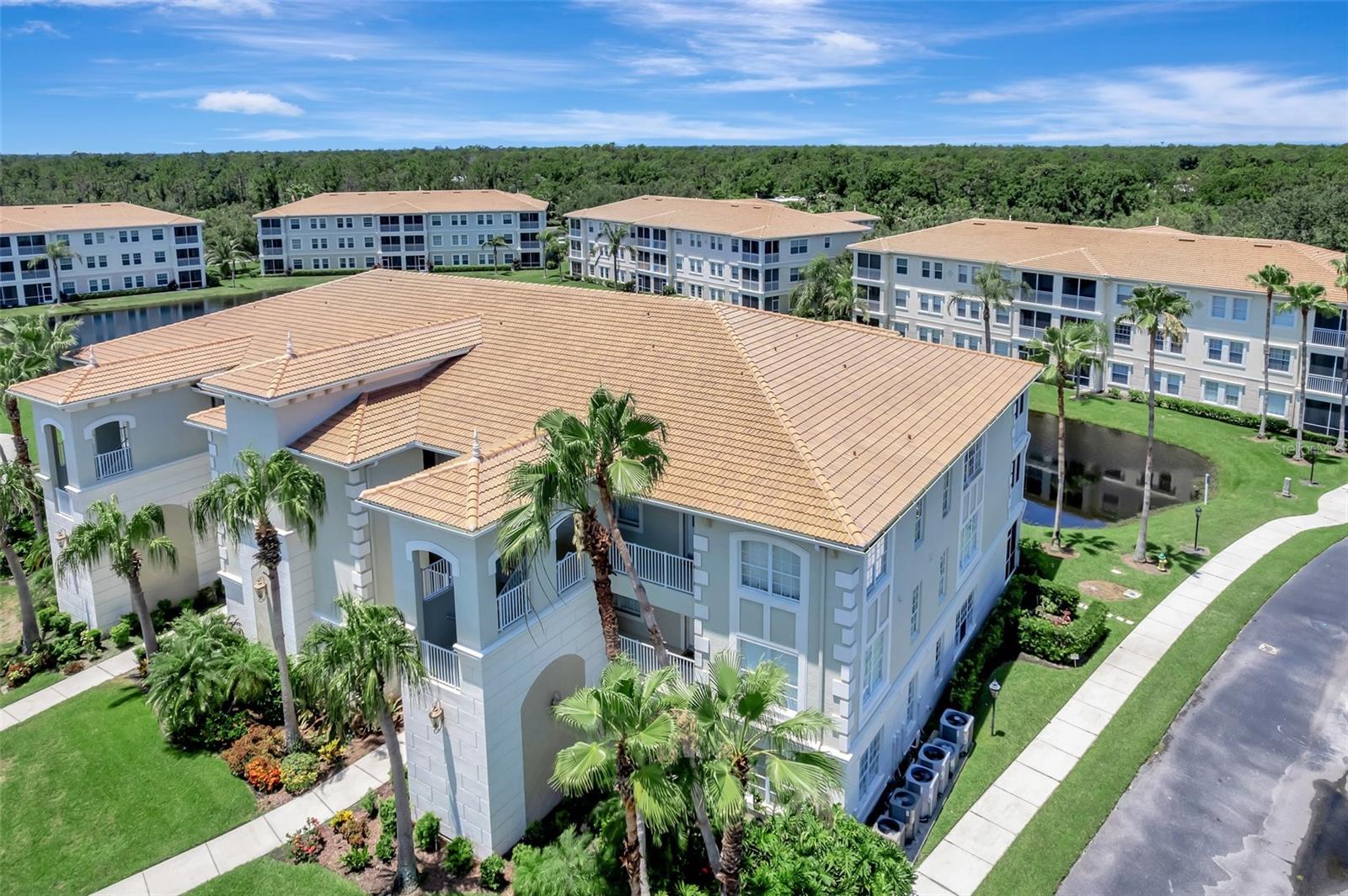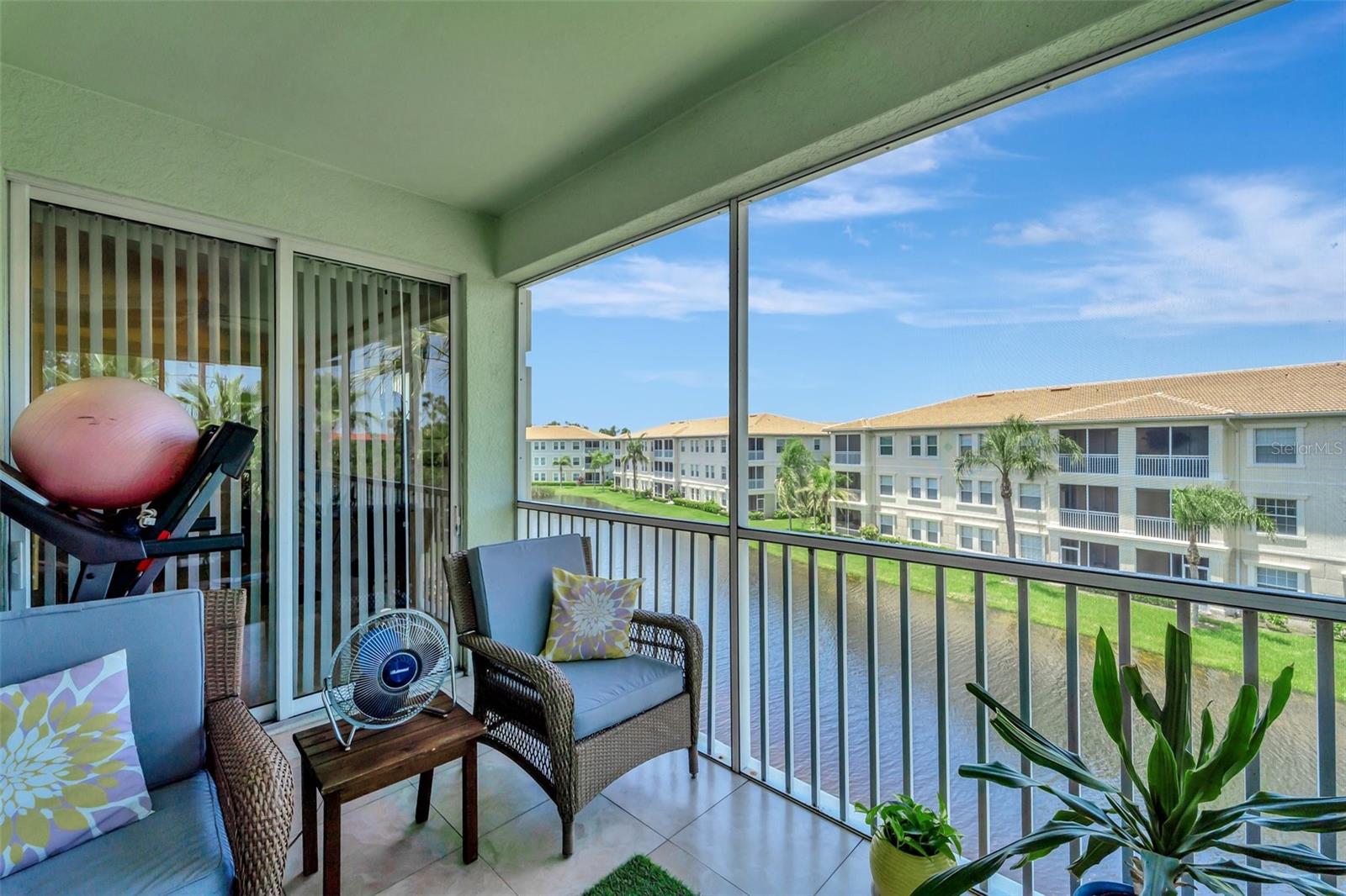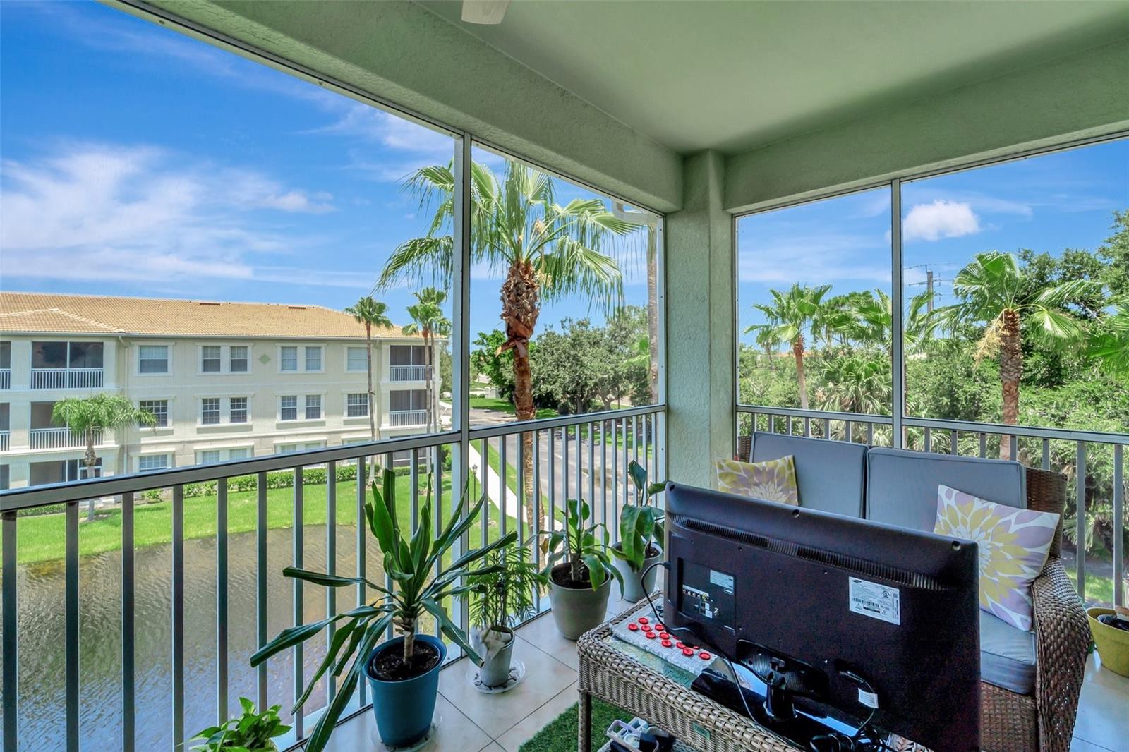 One or more photo(s) has been virtually staged. NEW PRICE - Enjoy Christmas morning opening presents in your new Venice home! This one-owner, top-floor 'Penthouse' unit has over 270 degrees of panoramic viewing. Freshly painted from front to back and top to bottom. Updated conveniences like ceiling fans with efficient LED lighting, newly serviced living room and bedroom patio doors that glide with a single touch. Nothing left to do but unpack and enjoy! These generously sized units are few in number and rarely available. Enjoy beautiful lake views and a resort-like lifestyle while staying close to everything you need. This former builder's model has only been occupied since 2011 and includes the extras they offered at the time. Low-maintenance, ceramic tile floors are used throughout the home, complementing the generous use of crown and ceiling mouldings. These spacious residences feature two bedrooms and two bathrooms, a Den/Office 'Flex' room, En-Suite laundry, a bonus storage room, and a covered and screened-in Lanai. A conveniently-located one-car garage right out front adds to the many perks of San Lino living. Ready now for your immediate inspection and approval!