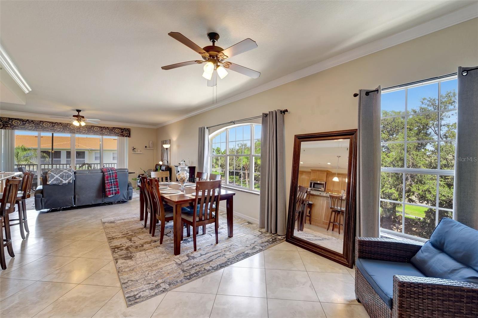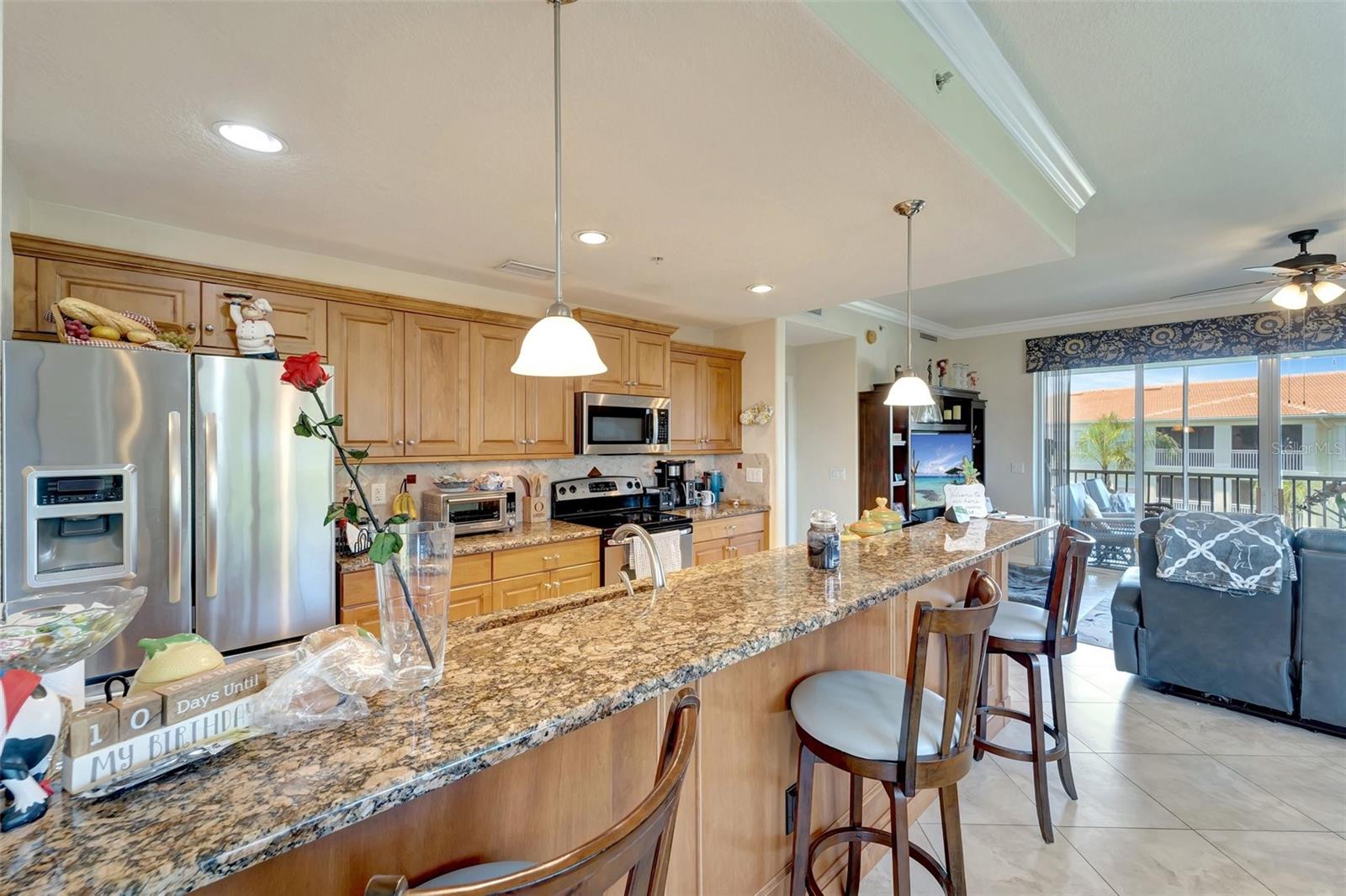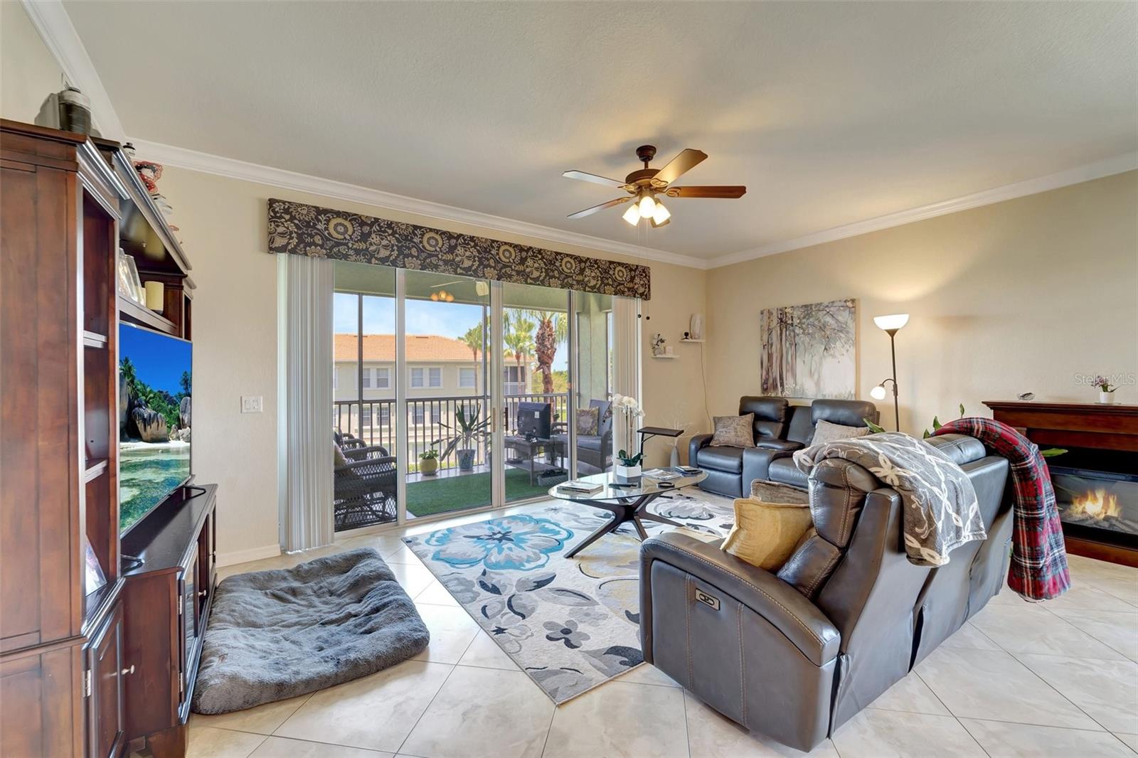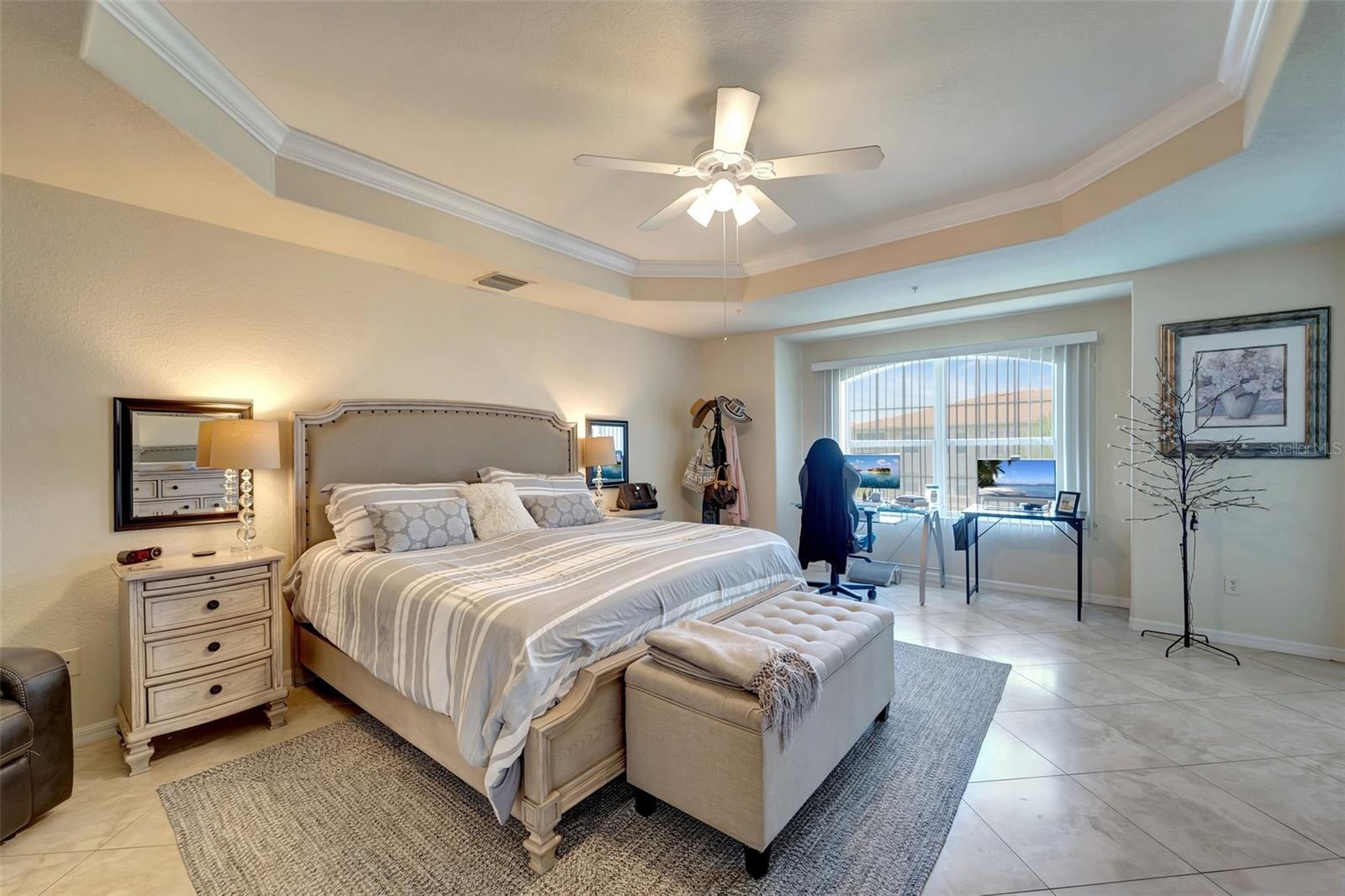 One or more photo(s) has been virtually staged. NEW PRICE - Enjoy Christmas morning opening presents in your new Venice home! This one-owner, top-floor 'Penthouse' unit has over 270 degrees of panoramic viewing. Freshly painted from front to back and top to bottom. Updated conveniences like ceiling fans with efficient LED lighting, newly serviced living room and bedroom patio doors that glide with a single touch. Nothing left to do but unpack and enjoy! These generously sized units are few in number and rarely available. Enjoy beautiful lake views and a resort-like lifestyle while staying close to everything you need. This former builder's model has only been occupied since 2011 and includes the extras they offered at the time. Low-maintenance, ceramic tile floors are used throughout the home, complementing the generous use of crown and ceiling mouldings. These spacious residences feature two bedrooms and two bathrooms, a Den/Office 'Flex' room, En-Suite laundry, a bonus storage room, and a covered and screened-in Lanai. A conveniently-located one-car garage right out front adds to the many perks of San Lino living. Ready now for your immediate inspection and approval!
