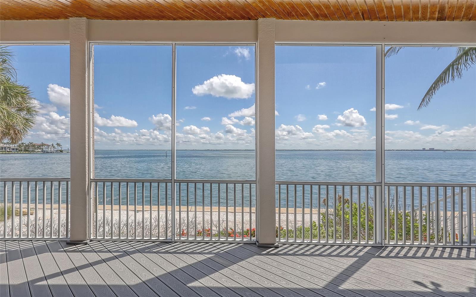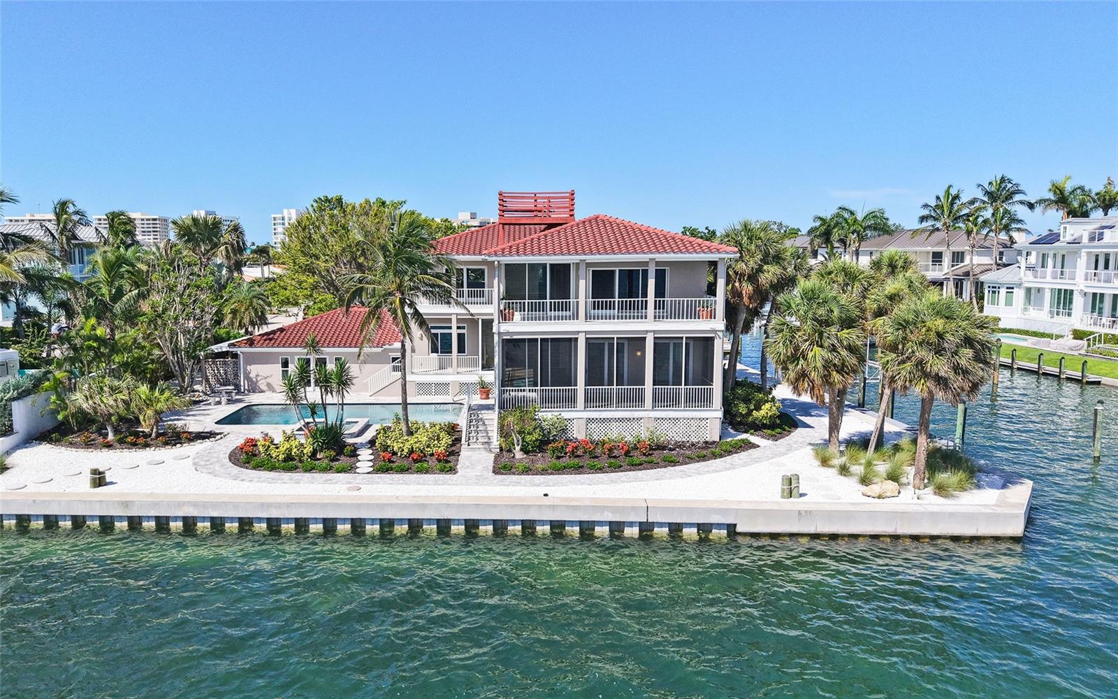 Welcome to 585 Gunwale Lane, a rare, full-bayfront offering in the desirable community of Country Club Shores on southern end of Longboat Key. On a .36-acre bayfront parcel with 117 feet on Sarasota Bay and 123 feet on a deepwater canal, this residence is a boater's paradise. A newer seawall and 58-foot dock (2022) with a 24,000-pound boat lift assure easy access to Sarasota Bay and the Gulf of Mexico. On the bay side, Ghost Island sandbar emerges at low tide, creating a natural haven that attracts abundant wildlife and offers fantastic shelling. It also serves as a natural barrier, providing protection during storms. On the Gulf side, deeded access to an exclusive community beach is just a half-mile away. Whether you're heading out for a day on the water or popping over to St. Armands Circle for dinner and shopping, this home puts you in the center of it all. The residence spans 4,733 square feet and includes three bedrooms and three-and-a-half baths. A soaring 20-foot ceiling defines the living room, where wall-to-wall built-ins create a refined focal point. The dining room opens to a remodeled kitchen outfitted with Graber wood cabinetry and professional-grade Frigidaire appliances. The primary bedroom is on the second floor, featuring a private bayfront balcony, dual walk-in closets, and an adjoining 270-square-foot bonus room ideal for a home office or wellness retreat. Outdoor amenities include a bayfront pool and spa for enjoying Florida sunsets. Additional highlights include impact-resistant windows and doors, and a two-car garage. For those who want to design and build their dream home, this property offers a spectacular location. Imagine a custom rooftop deck with breathtaking 360-degree views of the bay, Gulf, and downtown Sarasota. This is an opportunity to create something extraordinary. This exceptional property presents a rare opportunity to park your boat in the backyard and join the privileged few who call this well-established neighborhood home. By land or by sea, welcome to your fabulous Florida lifestyle!