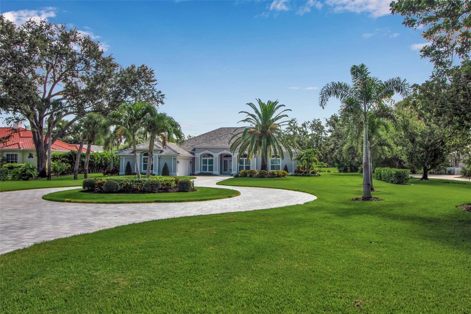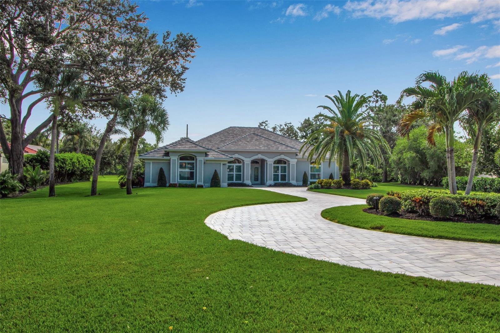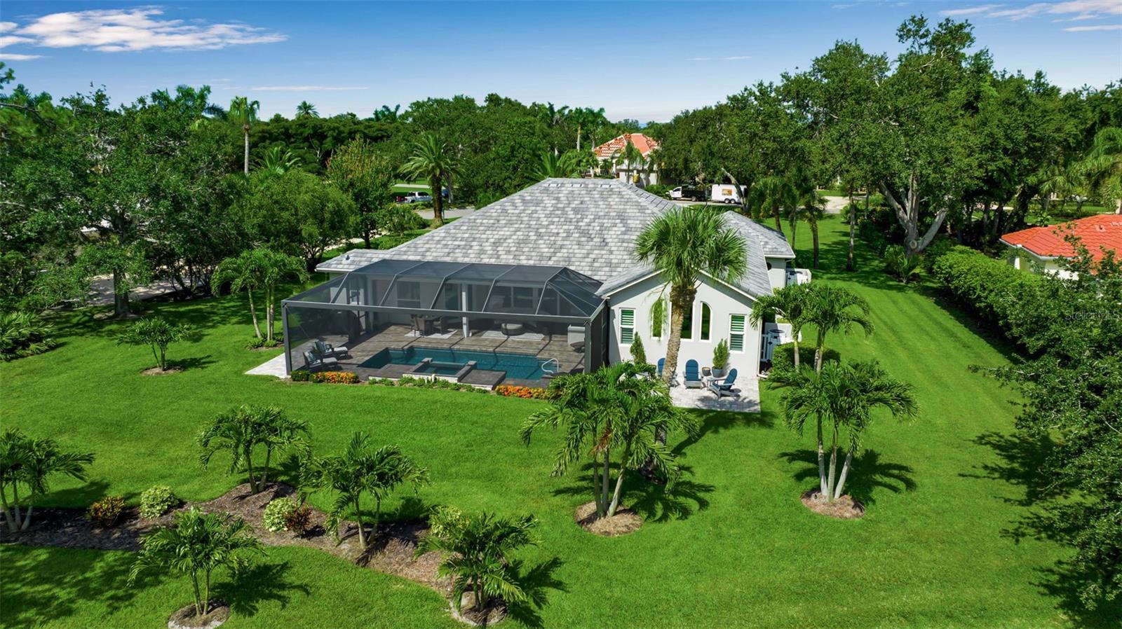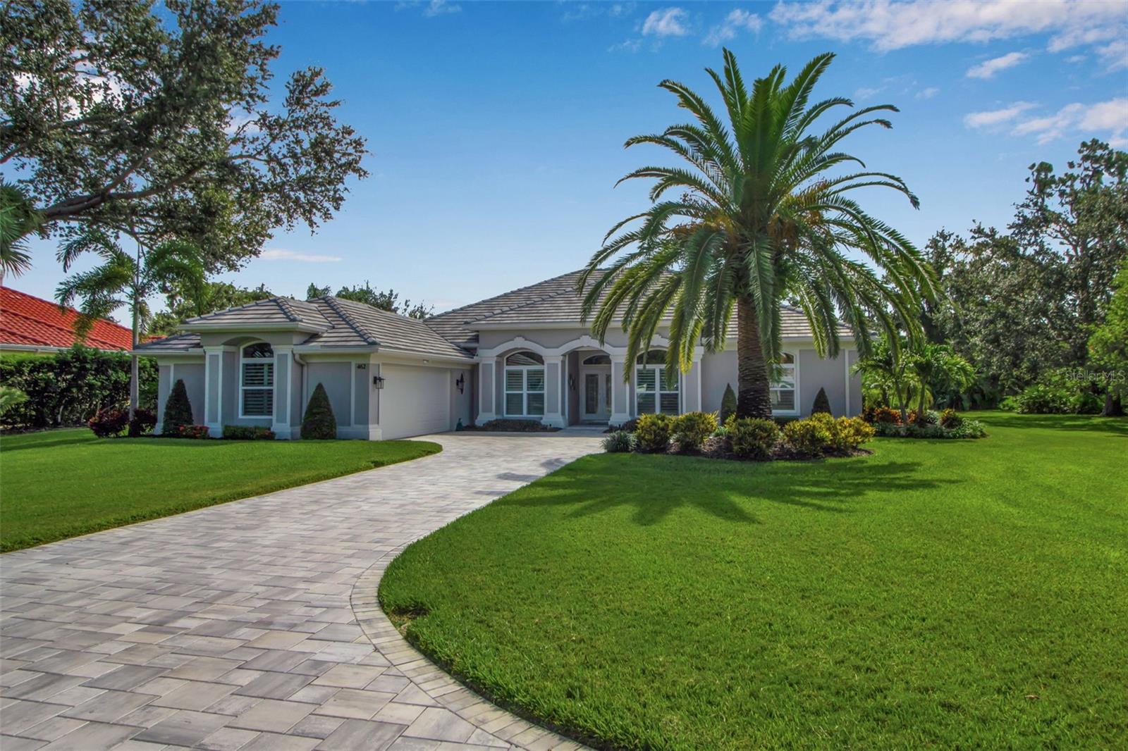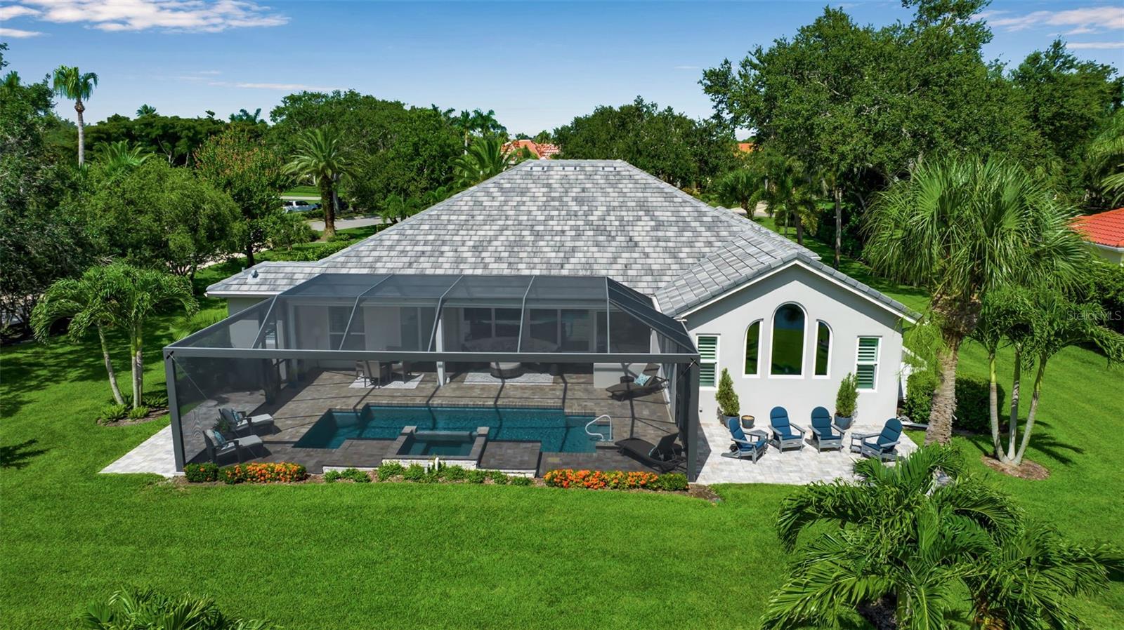 This completely remodeled home in The Oaks Clubside, set on nearly an acre of mature, meticulously landscaped grounds, is pure perfection. Nestled behind the gates of The Oaks Clubside, this residence is a masterful blend of classic elegance and contemporary sophistication. Arriving at the property, you are greeted by a striking full-circle driveway--a graceful approach that not only enhances the home's curb appeal but also provides abundant guest parking for social gatherings and celebrations with loved ones. Step through the double front doors, with leaded glass, and you will immediately be taken by the clean lines and modern elegance of this home. The floors throughout the main living area are wood-look tile, making for beauty as well as ease of maintenance. The numerous high ceilings, windows and doors make the entire interior open, light and airy. With three generously sized bedrooms, an office or den, and two and a half baths, the layout adapts effortlessly to a variety of needs. The open floor plan ensures that each room enjoys picturesque views of the private lot, blurring the boundaries between indoor comfort and the natural beauty outside. The open kitchen will delight any home chef with its high-end stainless steel appliances, wide expanse of quartz countertops, an abundance of cabinetry for storage and a breakfast bar. There is a cozy breakfast nook, with a gorgeous outdoor view, for causal meals, and a formal dining room. The master suite is a study in luxury. This bright, spacious retreat features an incredible bathroom with a sunken tub and huge separate shower. The entire outdoor space has been thoughtfully updated, with ample areas for lounging, dining, and entertaining. The inviting pool and spa beckon you to cool off on a sunny afternoon or unwind beneath the stars. The new sleek pool cage ensures you can enjoy the outdoors in comfort, with incredible views. This home boasts a host of recent upgrades designed to provide ultimate comfort and efficiency. Impact windows and doors offer storm protection and energy savings while letting in abundant light. A new roof adds to the peace of mind, ensuring years of worry-free living. Add to all this, a large laundry room, a big, clean garage, custom lighting, plantation shutters, a gorgeous fireplace and so much more, and you have discovered the perfect home for living ultimate country club lifestyle on the Gulf Coast. The Oaks, Sarasota's premier golf and country club, has two championship golf courses, an outstanding tennis program, pickle ball and croquet courts, a junior Olympic community pool, state-of-the-art fitness center and offers a wide variety of dining, recreational and social options. Membership is required with homeownership.