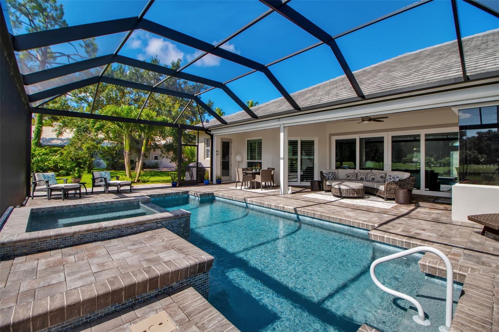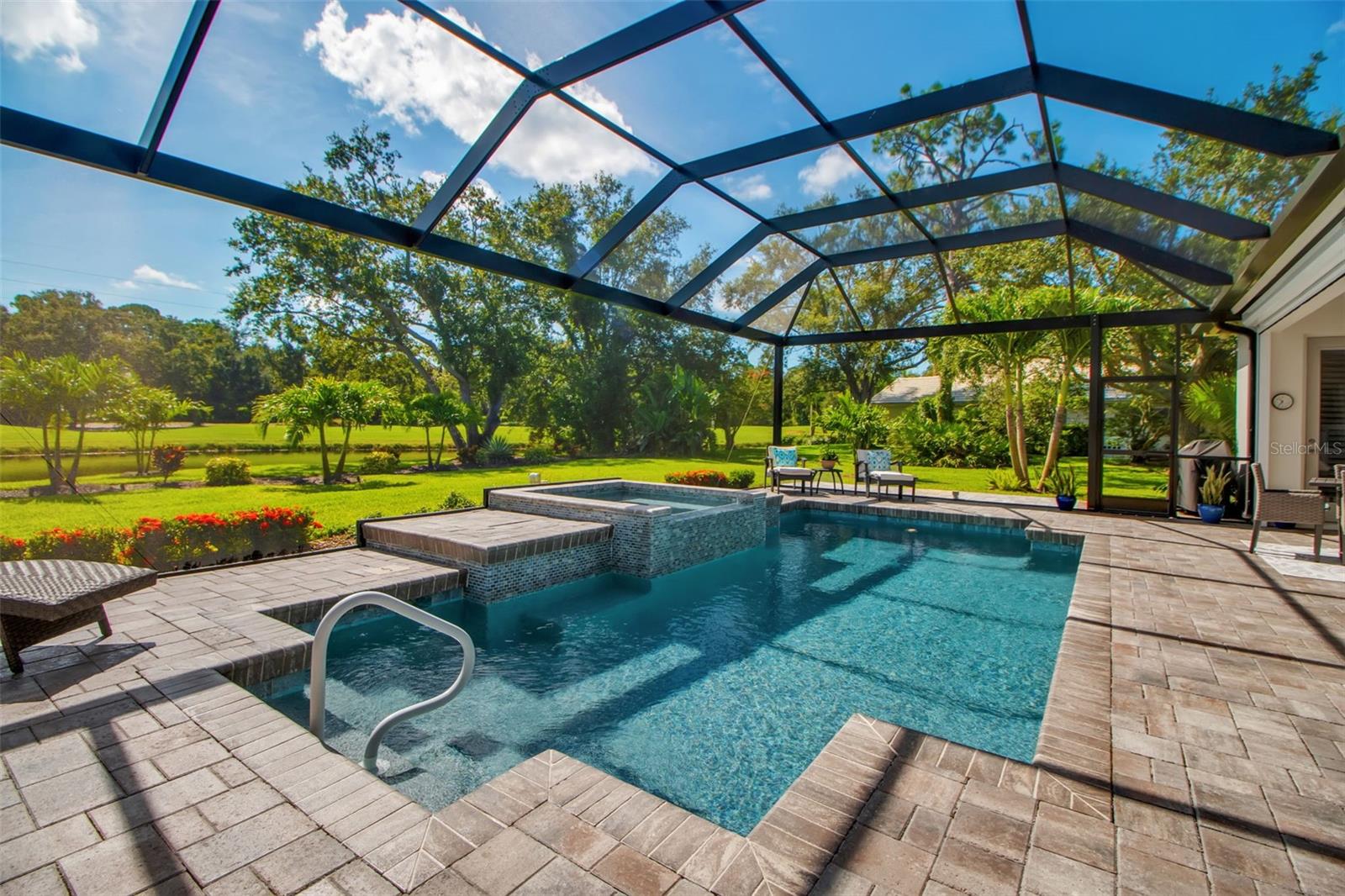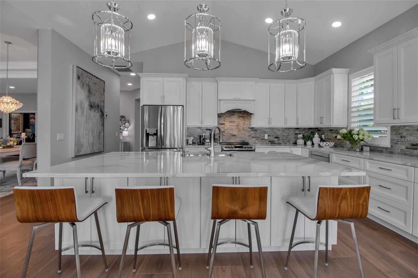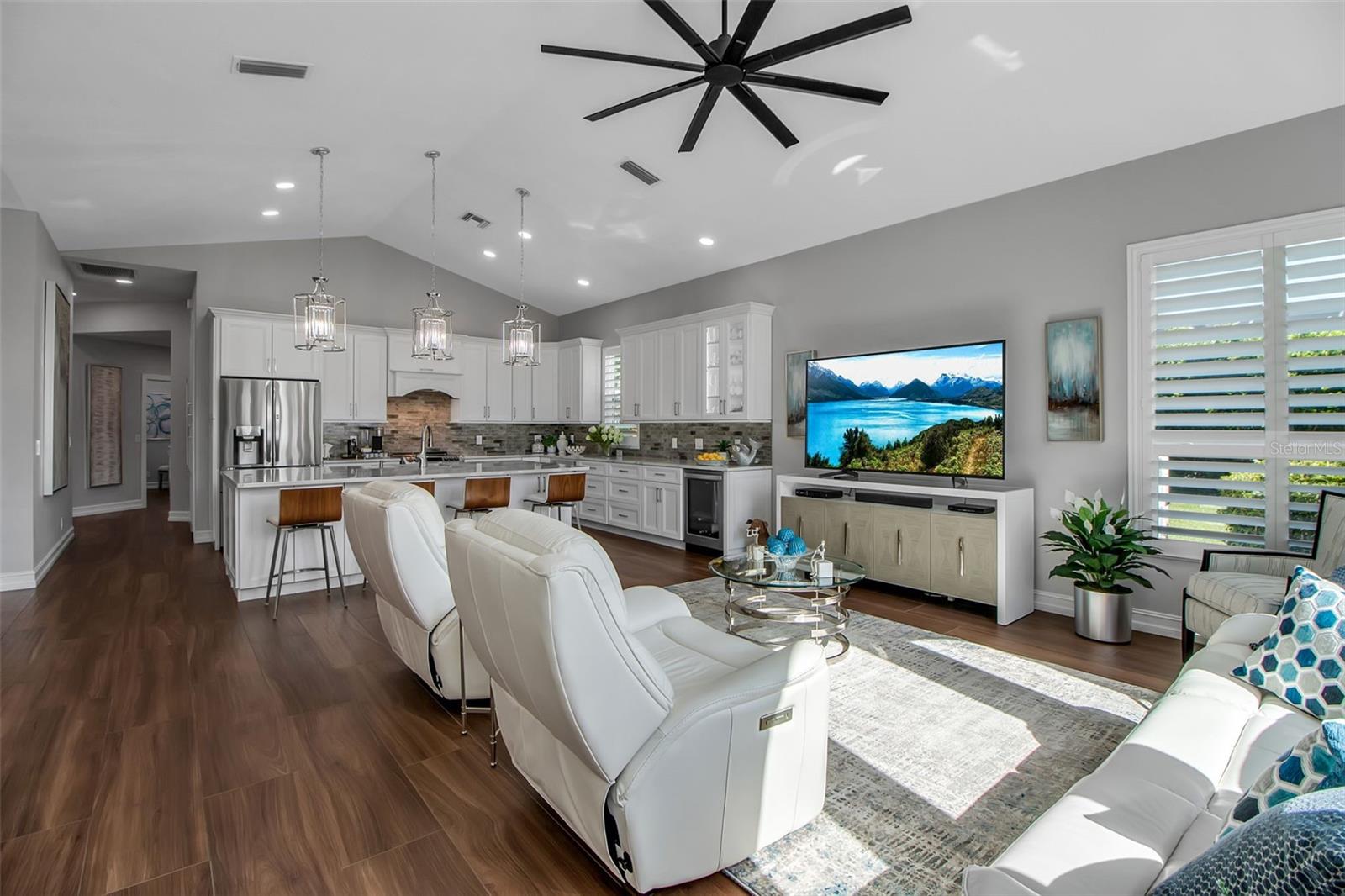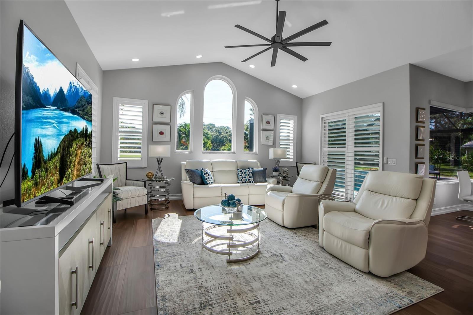 This completely remodeled home in The Oaks Clubside, set on nearly an acre of mature, meticulously landscaped grounds, is pure perfection. Nestled behind the gates of The Oaks Clubside, this residence is a masterful blend of classic elegance and contemporary sophistication. Arriving at the property, you are greeted by a striking full-circle driveway--a graceful approach that not only enhances the home's curb appeal but also provides abundant guest parking for social gatherings and celebrations with loved ones. Step through the double front doors, with leaded glass, and you will immediately be taken by the clean lines and modern elegance of this home. The floors throughout the main living area are wood-look tile, making for beauty as well as ease of maintenance. The numerous high ceilings, windows and doors make the entire interior open, light and airy. With three generously sized bedrooms, an office or den, and two and a half baths, the layout adapts effortlessly to a variety of needs. The open floor plan ensures that each room enjoys picturesque views of the private lot, blurring the boundaries between indoor comfort and the natural beauty outside. The open kitchen will delight any home chef with its high-end stainless steel appliances, wide expanse of quartz countertops, an abundance of cabinetry for storage and a breakfast bar. There is a cozy breakfast nook, with a gorgeous outdoor view, for causal meals, and a formal dining room. The master suite is a study in luxury. This bright, spacious retreat features an incredible bathroom with a sunken tub and huge separate shower. The entire outdoor space has been thoughtfully updated, with ample areas for lounging, dining, and entertaining. The inviting pool and spa beckon you to cool off on a sunny afternoon or unwind beneath the stars. The new sleek pool cage ensures you can enjoy the outdoors in comfort, with incredible views. This home boasts a host of recent upgrades designed to provide ultimate comfort and efficiency. Impact windows and doors offer storm protection and energy savings while letting in abundant light. A new roof adds to the peace of mind, ensuring years of worry-free living. Add to all this, a large laundry room, a big, clean garage, custom lighting, plantation shutters, a gorgeous fireplace and so much more, and you have discovered the perfect home for living ultimate country club lifestyle on the Gulf Coast. The Oaks, Sarasota's premier golf and country club, has two championship golf courses, an outstanding tennis program, pickle ball and croquet courts, a junior Olympic community pool, state-of-the-art fitness center and offers a wide variety of dining, recreational and social options. Membership is required with homeownership.