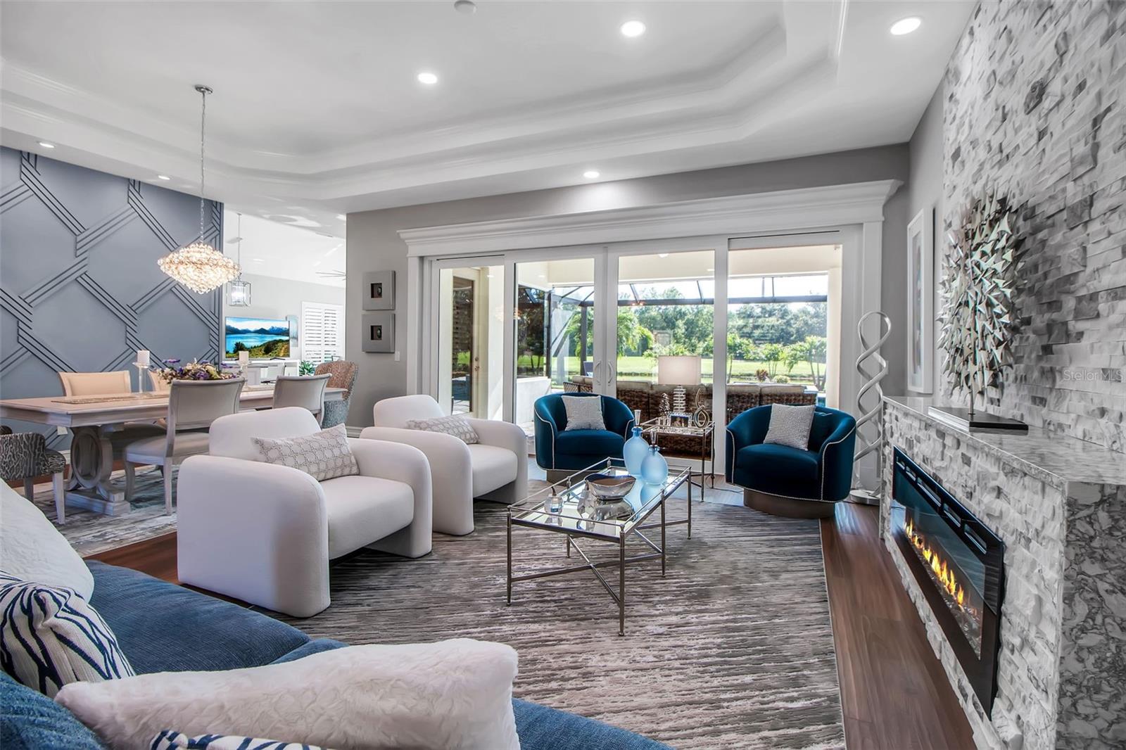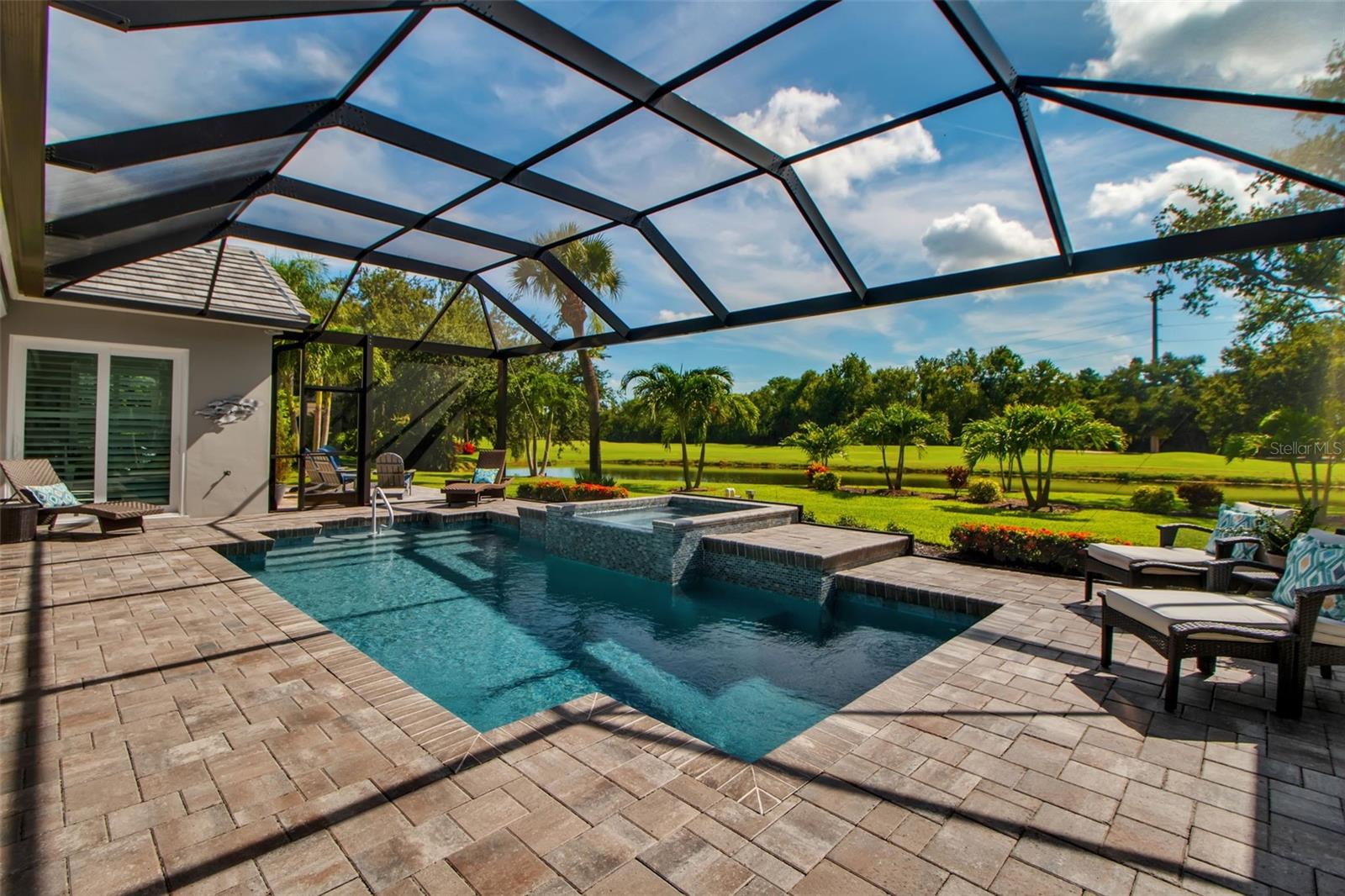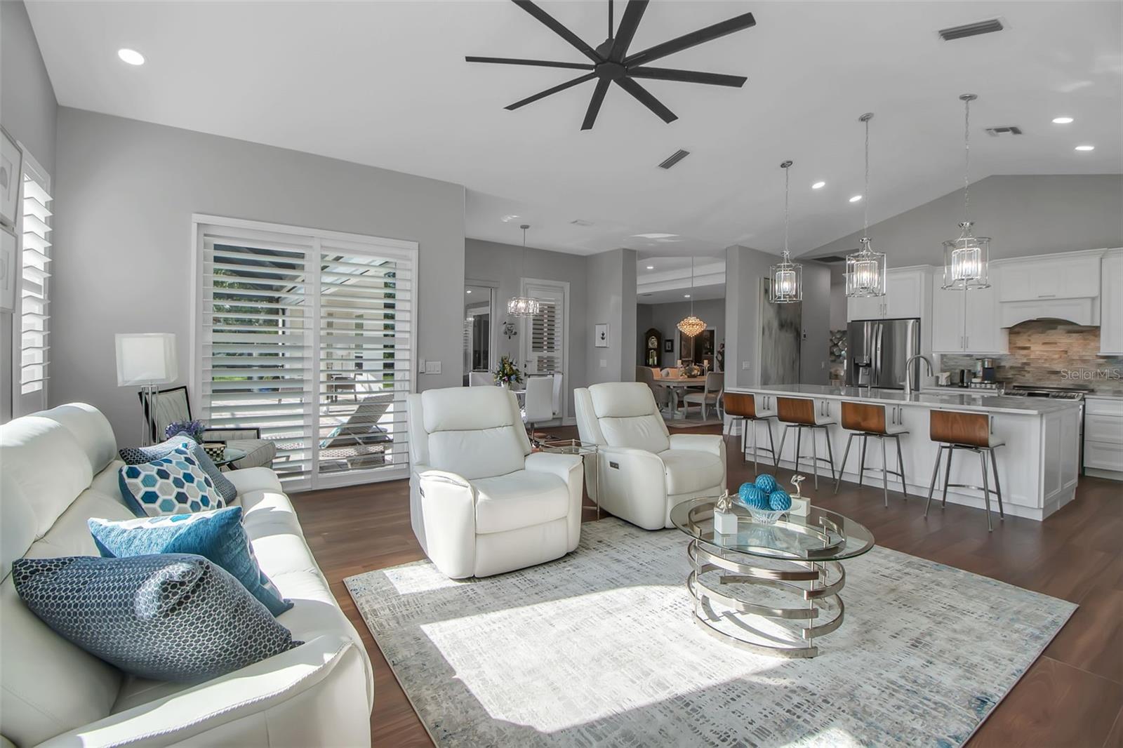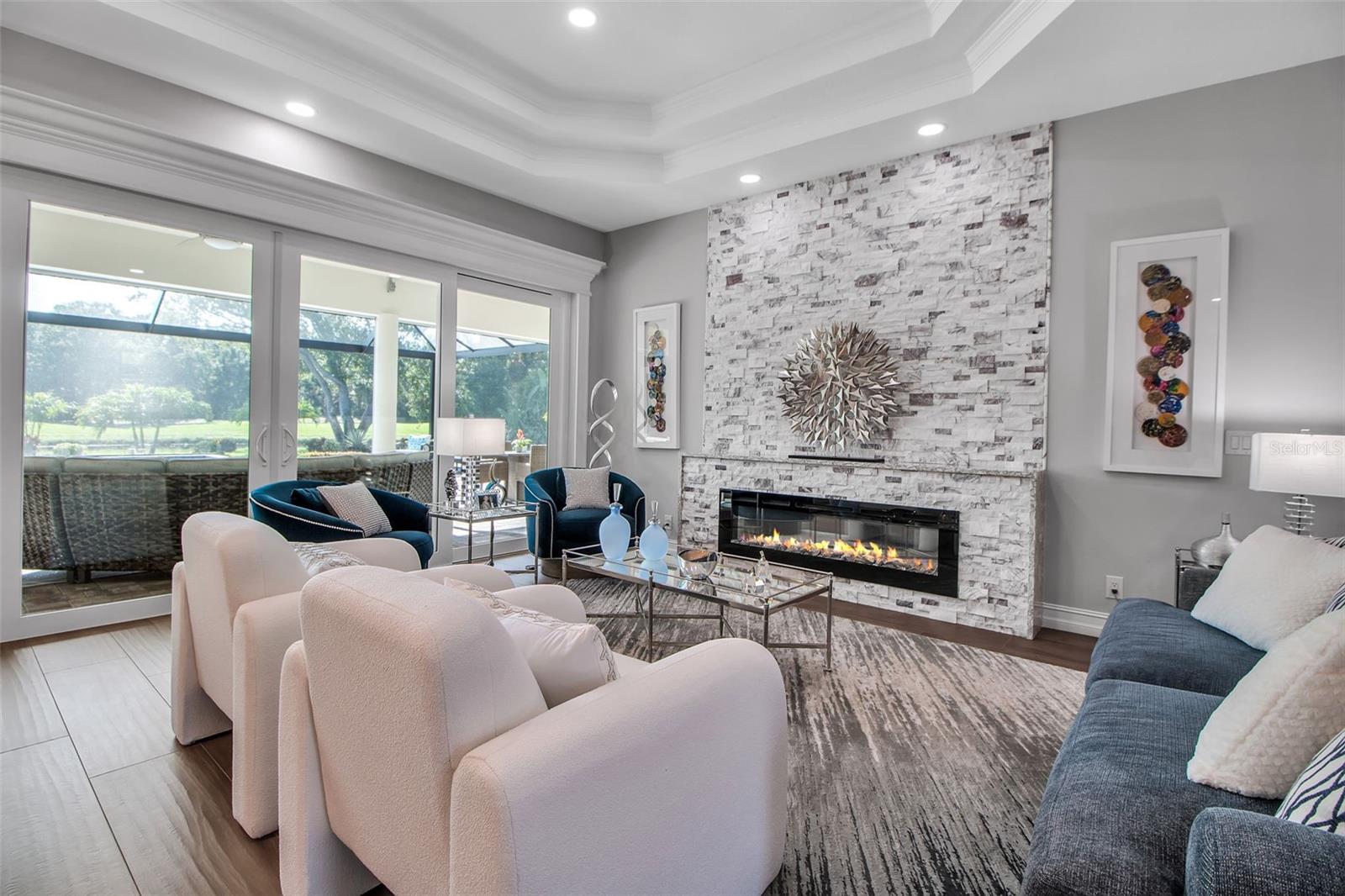 This completely remodeled home in The Oaks Clubside, set on nearly an acre of mature, meticulously landscaped grounds, is pure perfection. Nestled behind the gates of The Oaks Clubside, this residence is a masterful blend of classic elegance and contemporary sophistication. Arriving at the property, you are greeted by a striking full-circle driveway--a graceful approach that not only enhances the home's curb appeal but also provides abundant guest parking for social gatherings and celebrations with loved ones. Step through the double front doors, with leaded glass, and you will immediately be taken by the clean lines and modern elegance of this home. The floors throughout the main living area are wood-look tile, making for beauty as well as ease of maintenance. The numerous high ceilings, windows and doors make the entire interior open, light and airy. With three generously sized bedrooms, an office or den, and two and a half baths, the layout adapts effortlessly to a variety of needs. The open floor plan ensures that each room enjoys picturesque views of the private lot, blurring the boundaries between indoor comfort and the natural beauty outside. The open kitchen will delight any home chef with its high-end stainless steel appliances, wide expanse of quartz countertops, an abundance of cabinetry for storage and a breakfast bar. There is a cozy breakfast nook, with a gorgeous outdoor view, for causal meals, and a formal dining room. The master suite is a study in luxury. This bright, spacious retreat features an incredible bathroom with a sunken tub and huge separate shower. The entire outdoor space has been thoughtfully updated, with ample areas for lounging, dining, and entertaining. The inviting pool and spa beckon you to cool off on a sunny afternoon or unwind beneath the stars. The new sleek pool cage ensures you can enjoy the outdoors in comfort, with incredible views. This home boasts a host of recent upgrades designed to provide ultimate comfort and efficiency. Impact windows and doors offer storm protection and energy savings while letting in abundant light. A new roof adds to the peace of mind, ensuring years of worry-free living. Add to all this, a large laundry room, a big, clean garage, custom lighting, plantation shutters, a gorgeous fireplace and so much more, and you have discovered the perfect home for living ultimate country club lifestyle on the Gulf Coast. The Oaks, Sarasota's premier golf and country club, has two championship golf courses, an outstanding tennis program, pickle ball and croquet courts, a junior Olympic community pool, state-of-the-art fitness center and offers a wide variety of dining, recreational and social options. Membership is required with homeownership.