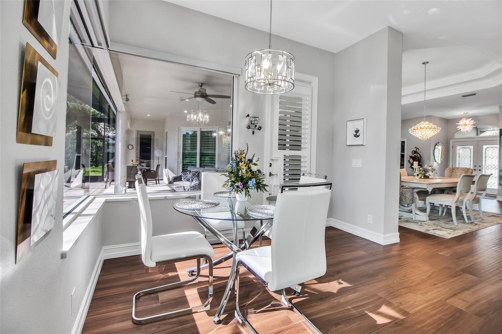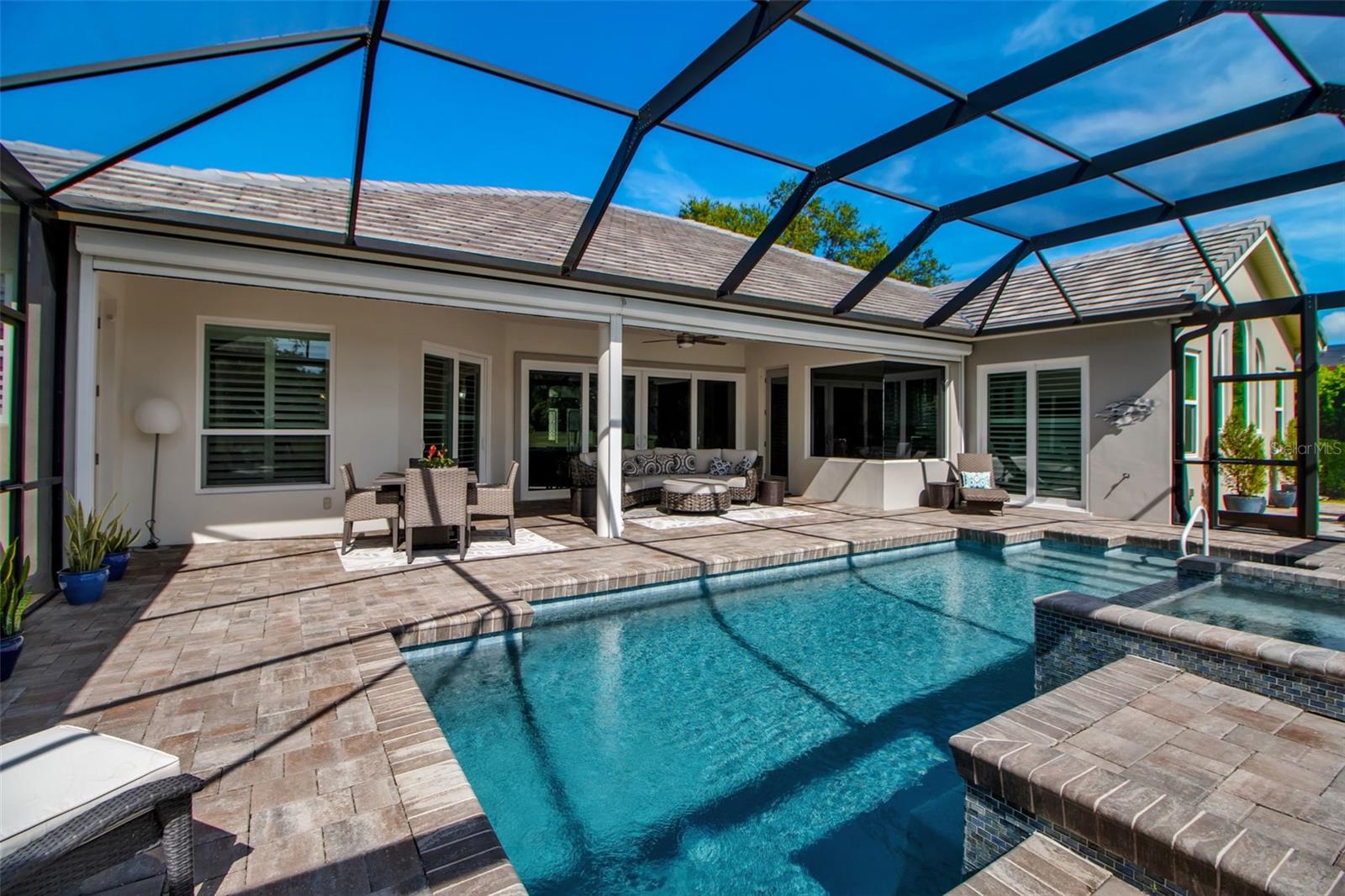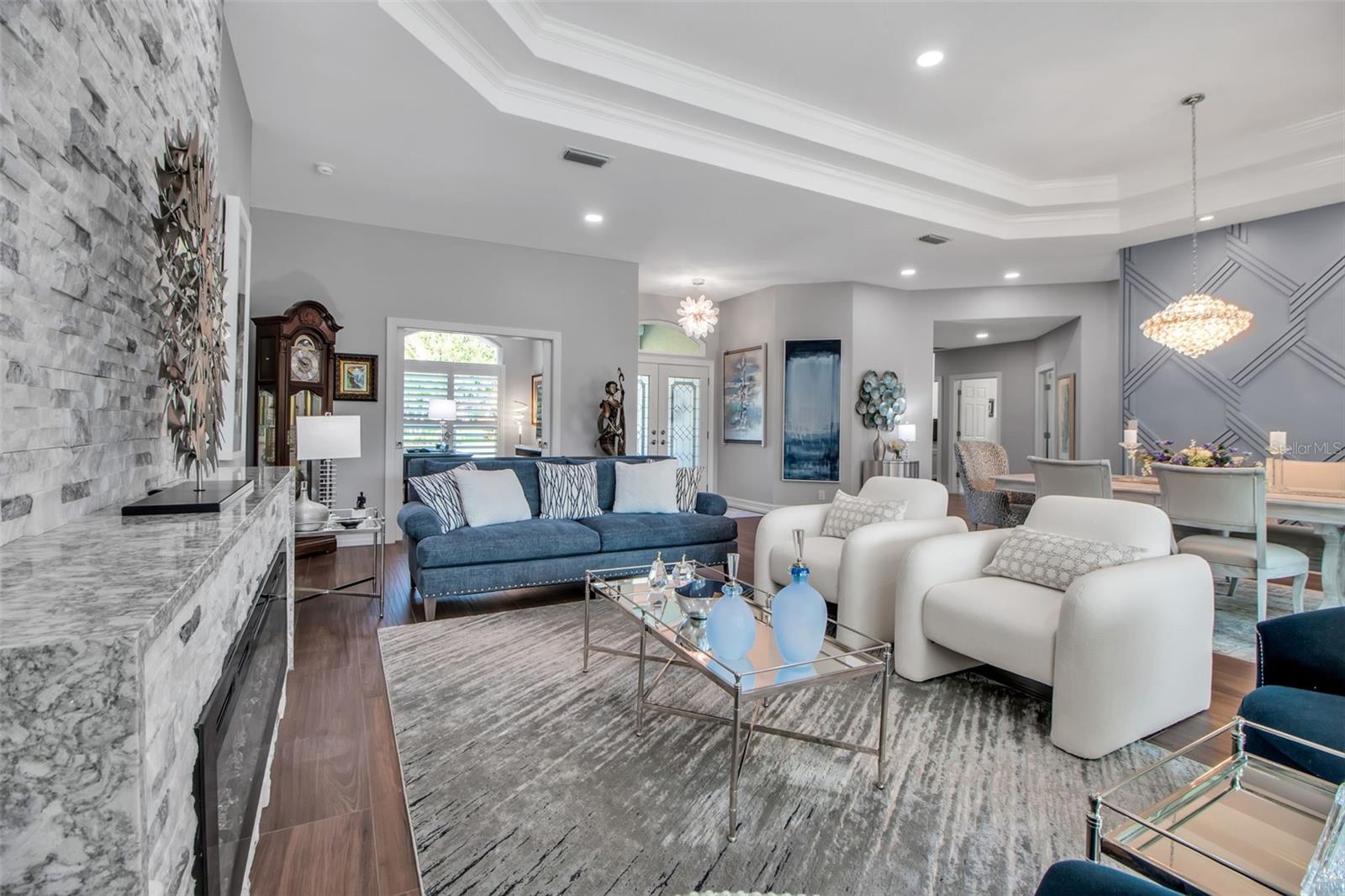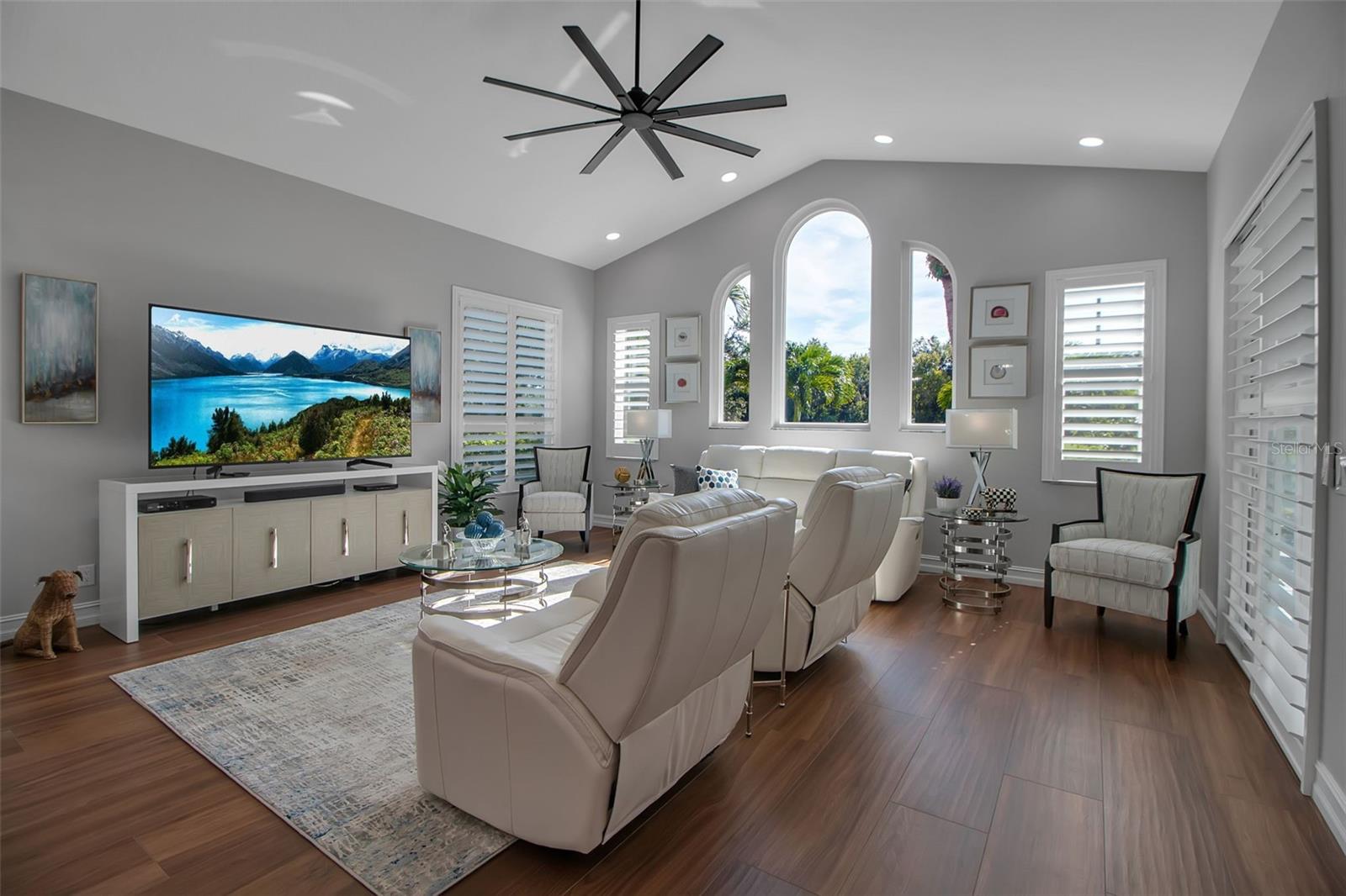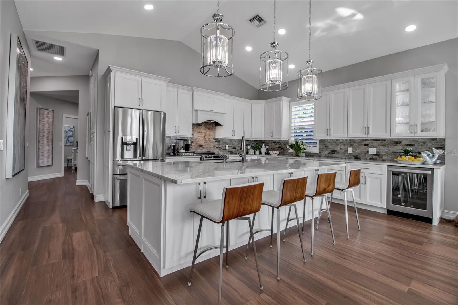 This completely remodeled home in The Oaks Clubside, set on nearly an acre of mature, meticulously landscaped grounds, is pure perfection. Nestled behind the gates of The Oaks Clubside, this residence is a masterful blend of classic elegance and contemporary sophistication. Arriving at the property, you are greeted by a striking full-circle driveway--a graceful approach that not only enhances the home's curb appeal but also provides abundant guest parking for social gatherings and celebrations with loved ones. Step through the double front doors, with leaded glass, and you will immediately be taken by the clean lines and modern elegance of this home. The floors throughout the main living area are wood-look tile, making for beauty as well as ease of maintenance. The numerous high ceilings, windows and doors make the entire interior open, light and airy. With three generously sized bedrooms, an office or den, and two and a half baths, the layout adapts effortlessly to a variety of needs. The open floor plan ensures that each room enjoys picturesque views of the private lot, blurring the boundaries between indoor comfort and the natural beauty outside. The open kitchen will delight any home chef with its high-end stainless steel appliances, wide expanse of quartz countertops, an abundance of cabinetry for storage and a breakfast bar. There is a cozy breakfast nook, with a gorgeous outdoor view, for causal meals, and a formal dining room. The master suite is a study in luxury. This bright, spacious retreat features an incredible bathroom with a sunken tub and huge separate shower. The entire outdoor space has been thoughtfully updated, with ample areas for lounging, dining, and entertaining. The inviting pool and spa beckon you to cool off on a sunny afternoon or unwind beneath the stars. The new sleek pool cage ensures you can enjoy the outdoors in comfort, with incredible views. This home boasts a host of recent upgrades designed to provide ultimate comfort and efficiency. Impact windows and doors offer storm protection and energy savings while letting in abundant light. A new roof adds to the peace of mind, ensuring years of worry-free living. Add to all this, a large laundry room, a big, clean garage, custom lighting, plantation shutters, a gorgeous fireplace and so much more, and you have discovered the perfect home for living ultimate country club lifestyle on the Gulf Coast. The Oaks, Sarasota's premier golf and country club, has two championship golf courses, an outstanding tennis program, pickle ball and croquet courts, a junior Olympic community pool, state-of-the-art fitness center and offers a wide variety of dining, recreational and social options. Membership is required with homeownership.