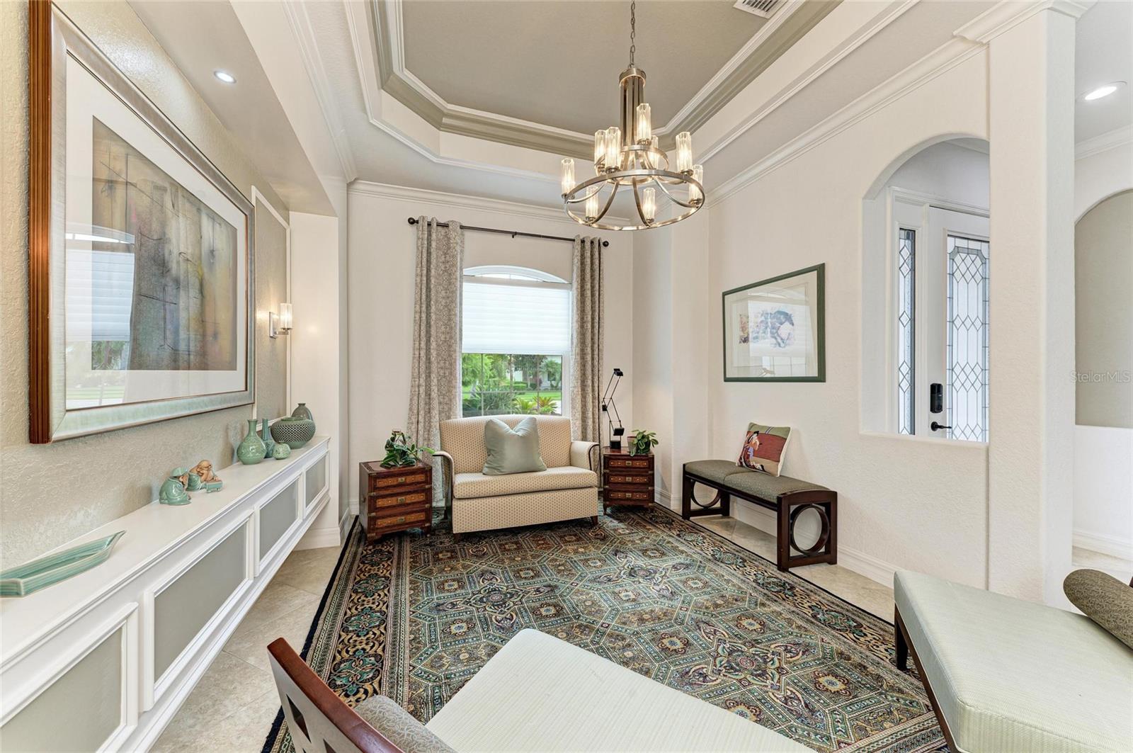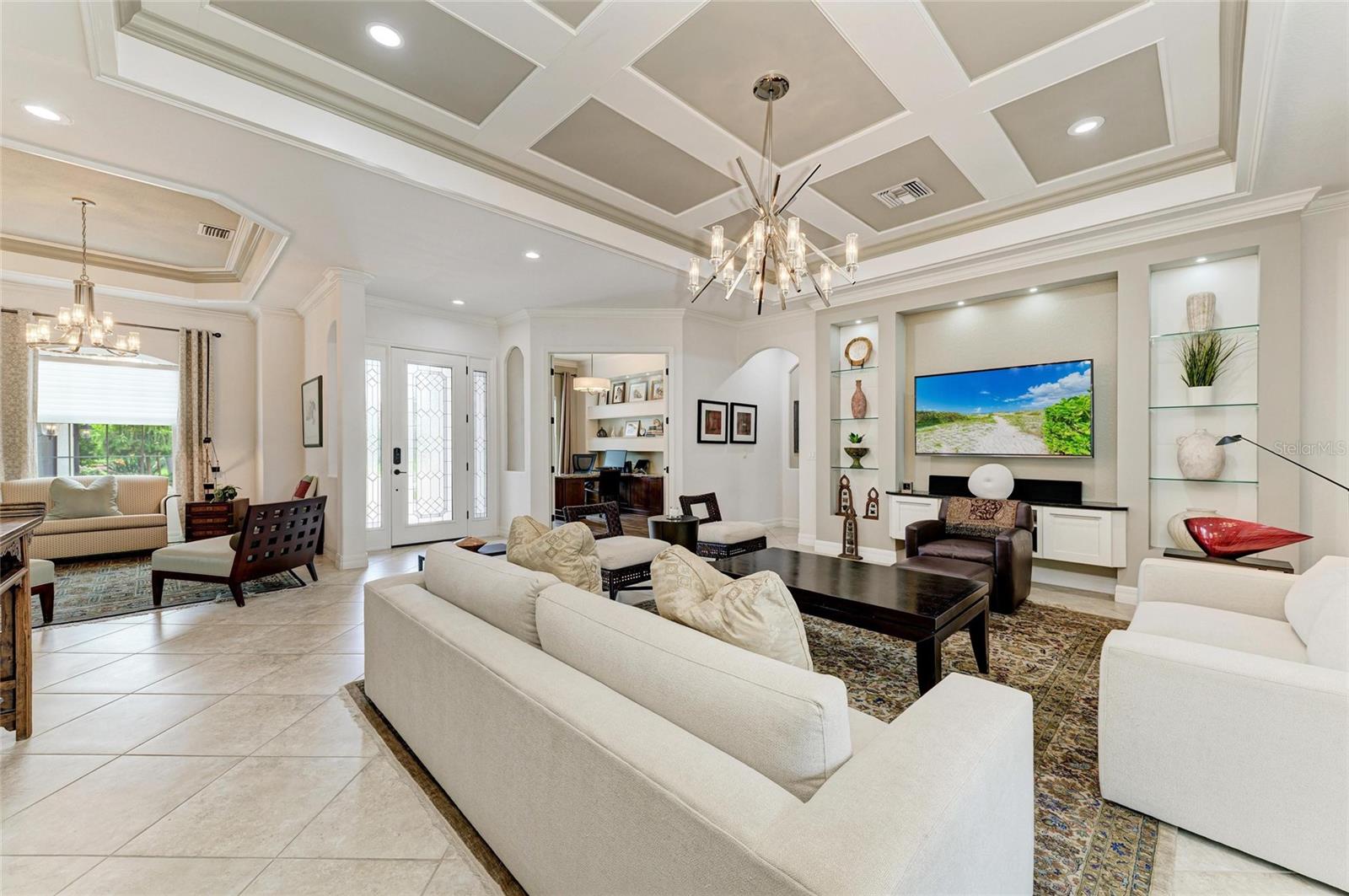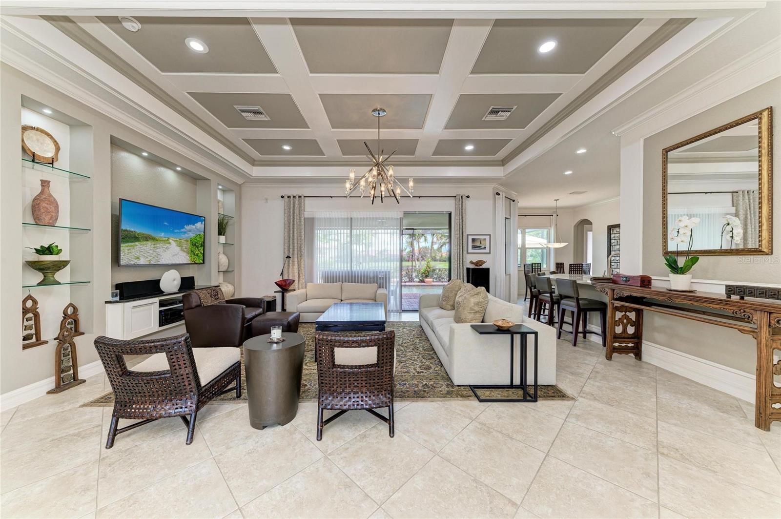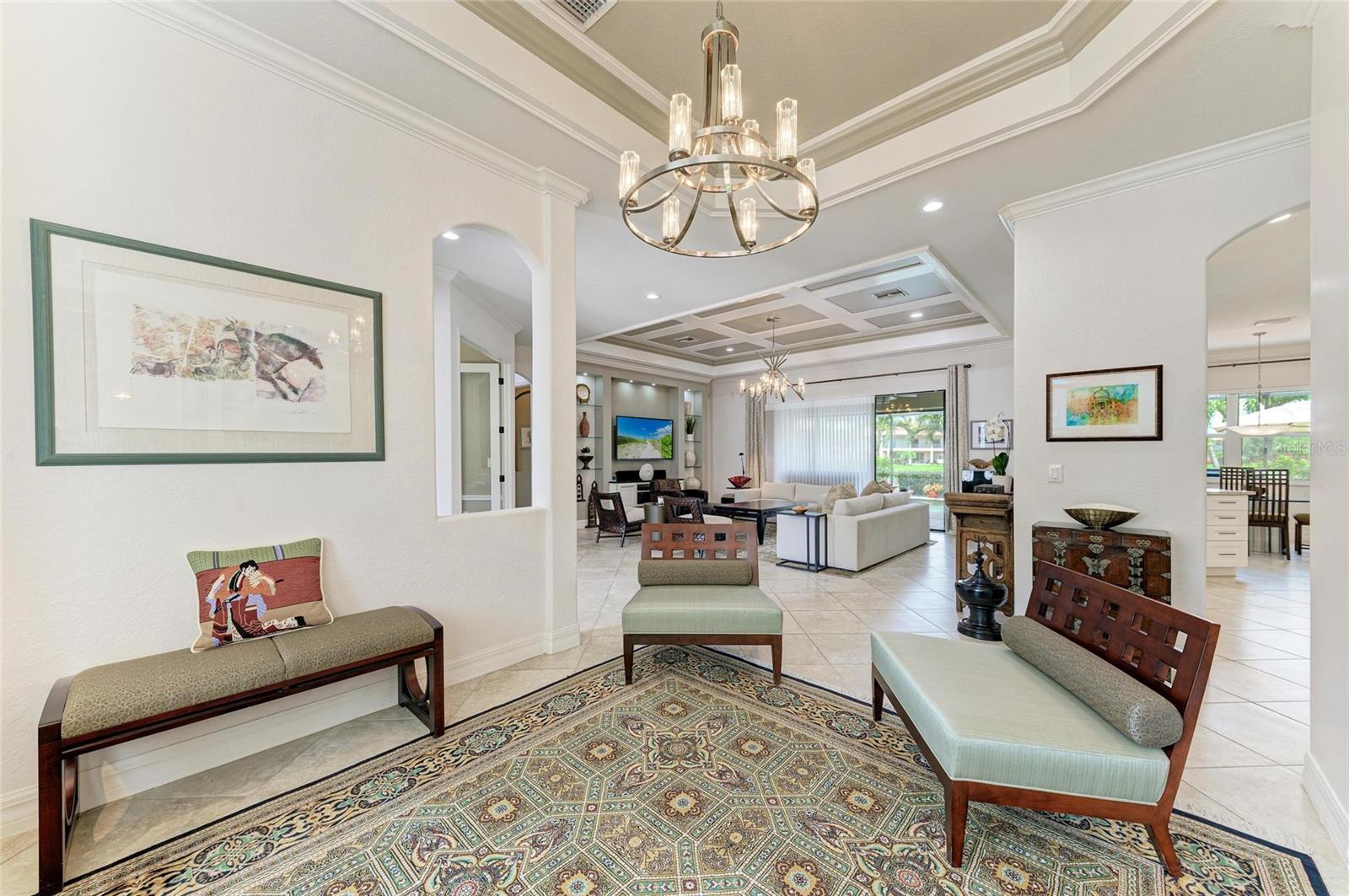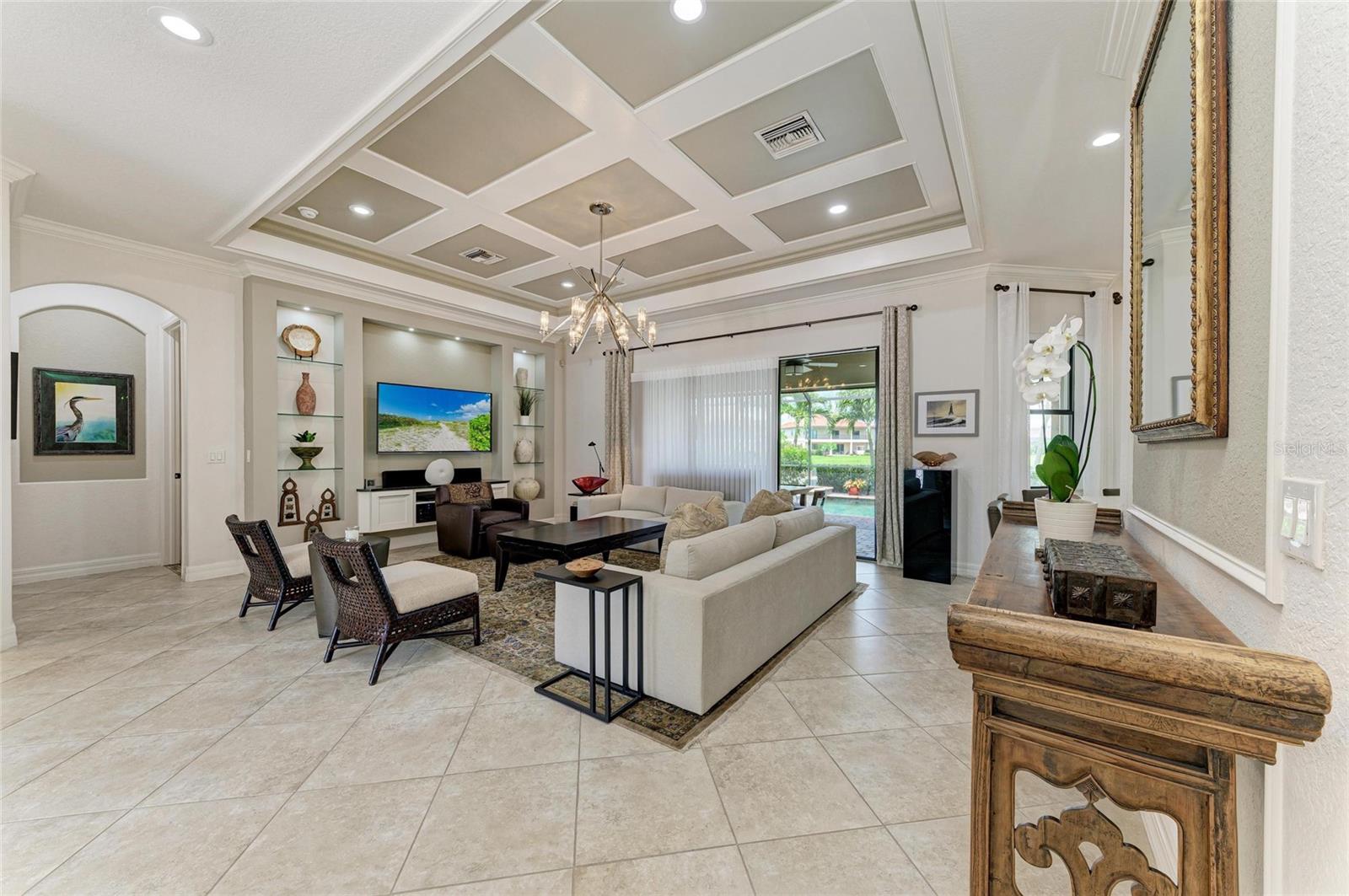 Welcome Home to your new beautifully customized lakefront pool home located in the prestigious, gated community of Bridgewater at Lakewood Ranch. This popular, Cambridge Estate Series model features 3 spacious bedrooms, 2.5 bathrooms, a 3-car garage, and a private study/office, offering the perfect combination of luxury, comfort, & design. With over $100,000 in designer upgrades, no detail has been overlooked in creating this refined & meticulously maintained residence. From the moment you arrive, you'll be captivated by the home's remarkable curb appeal, enhanced by lush landscaping & a freshly painted exterior (2023). Inside, the open-concept layout is both elegant & inviting, featuring volume ceilings, 8-foot doors, crown molding, & custom feature walls in the great room, dining room, study/office & owner's suite as well as wainscoting & bead board in the secondary bedrooms . The great room is a true showstopper, showcasing a coffered ceiling with wood trim, recessed lighting, a built-in entertainment console, glass shelving, accent lighting & equipped with a Motorized slider door shade--making it ideal for entertaining. The completely remodeled gourmet kitchen (2022) is a chef's dream, outfitted with solid wood, soft-close cabinetry, Taj Mahal Quartzite countertops, an undermount 30" KRAUS stainless steel sink, MOEN motion-sensor faucet, custom lighting w/transom uplighting/under-cabinet LED downlighting, pop-up electrical outlets w/ built-in charging station & new GE stainless steel appliances. The formal dining room & private office, enhanced by French doors, add versatility & sophistication to the layout. All bathrooms were completely renovated in 2022, featuring Taj Mahal Quartzite counters, modern faucets fixtures, fresh paint, & a glass shower enclosure in the second bathroom. Additional interior highlights include custom Hunter Douglas window treatments throughout, with a motorized shade for the sliding glass door in the great room, a HALO whole-house water purification system, custom-designed closets in the primary suite, ceramic wood-look tile in the den & owner's suite, & new LG front-load washer & dryer (2022). All smoke detectors were replaced in 2025. Outdoor living is equally impressive. The screened lanai offers updated lighting & ample space to enjoy the stunning lake views, sunrises, & tranquil Florida wildlife. The resort-style pool & spa create a peaceful oasis perfect for entertaining or unwinding at the end of the day. The home is equipped with HIGH-IMPACT HURRICANE RATED WINDOWS & a HIGH-IMPACT HURRICANE SCREENED ENCLOSURE. Bridgewater at Lakewood Ranch is a highly desirable, maintenance-free, gated community offering beautifully landscaped grounds, pavered driveways, a community park w/social events, & walking paths. With low HOA fees covering lawn care, reserves, & common area maintenance, residents enjoy peace of mind & convenience. Just minutes from top-rated schools including Lakewood Ranch Preparatory Academy, world-class golf courses, dining, shopping, University Town Center, & a short drive to the white-sand beaches, downtown Sarasota, & I-75 for quick access to Tampa, St. Petersburg, & beyond. This move-in ready, feature-rich home offers a rare opportunity to enjoy luxury living in the nation's #1 top master-planned community. Whether you're seeking refined design, modern upgrades, or the perfect Florida lifestyle, 5655 Cloverleaf Run delivers it all--and more.