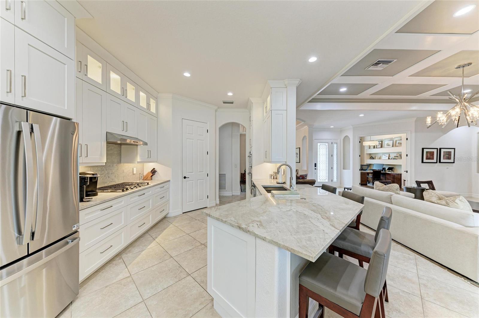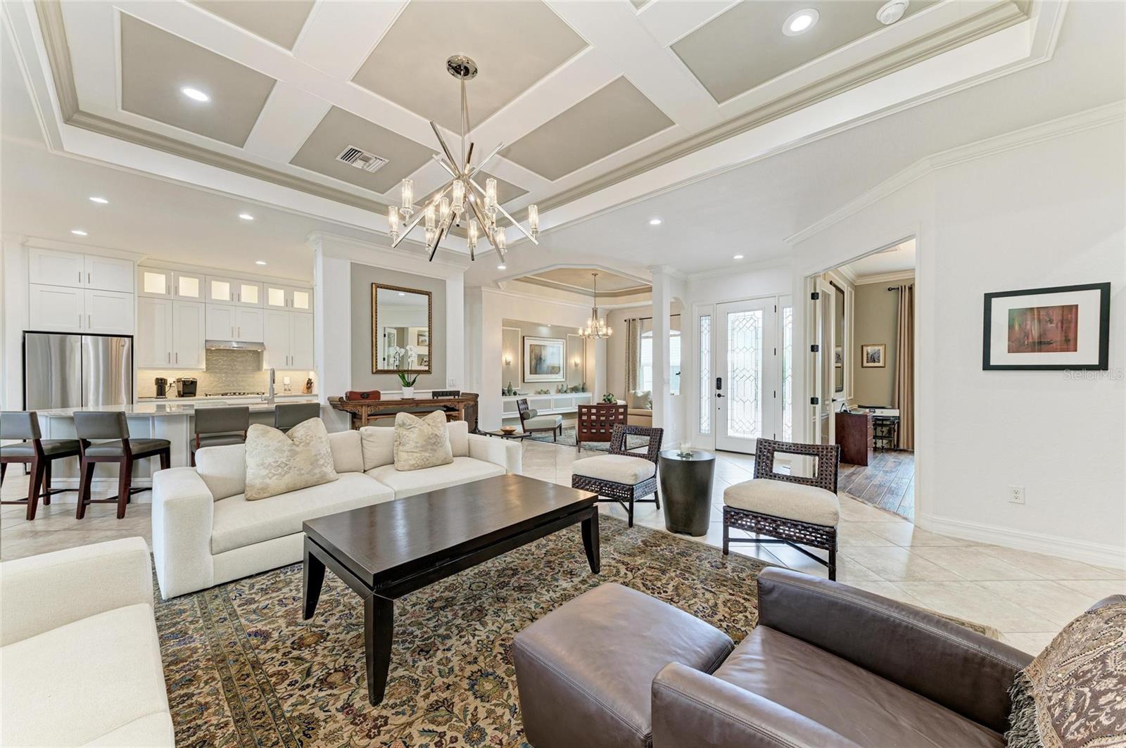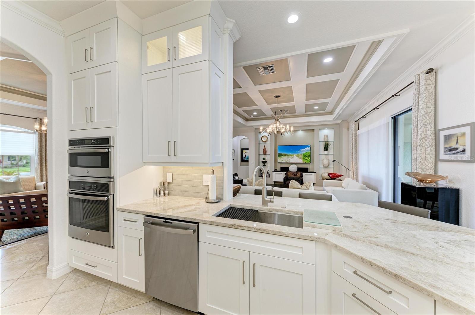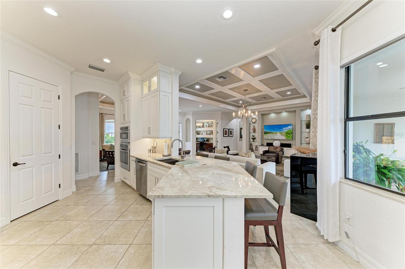 Welcome Home to your new beautifully customized lakefront pool home located in the prestigious, gated community of Bridgewater at Lakewood Ranch. This popular, Cambridge Estate Series model features 3 spacious bedrooms, 2.5 bathrooms, a 3-car garage, and a private study/office, offering the perfect combination of luxury, comfort, & design. With over $100,000 in designer upgrades, no detail has been overlooked in creating this refined & meticulously maintained residence. From the moment you arrive, you'll be captivated by the home's remarkable curb appeal, enhanced by lush landscaping & a freshly painted exterior (2023). Inside, the open-concept layout is both elegant & inviting, featuring volume ceilings, 8-foot doors, crown molding, & custom feature walls in the great room, dining room, study/office & owner's suite as well as wainscoting & bead board in the secondary bedrooms . The great room is a true showstopper, showcasing a coffered ceiling with wood trim, recessed lighting, a built-in entertainment console, glass shelving, accent lighting & equipped with a Motorized slider door shade--making it ideal for entertaining. The completely remodeled gourmet kitchen (2022) is a chef's dream, outfitted with solid wood, soft-close cabinetry, Taj Mahal Quartzite countertops, an undermount 30" KRAUS stainless steel sink, MOEN motion-sensor faucet, custom lighting w/transom uplighting/under-cabinet LED downlighting, pop-up electrical outlets w/ built-in charging station & new GE stainless steel appliances. The formal dining room & private office, enhanced by French doors, add versatility & sophistication to the layout. All bathrooms were completely renovated in 2022, featuring Taj Mahal Quartzite counters, modern faucets fixtures, fresh paint, & a glass shower enclosure in the second bathroom. Additional interior highlights include custom Hunter Douglas window treatments throughout, with a motorized shade for the sliding glass door in the great room, a HALO whole-house water purification system, custom-designed closets in the primary suite, ceramic wood-look tile in the den & owner's suite, & new LG front-load washer & dryer (2022). All smoke detectors were replaced in 2025. Outdoor living is equally impressive. The screened lanai offers updated lighting & ample space to enjoy the stunning lake views, sunrises, & tranquil Florida wildlife. The resort-style pool & spa create a peaceful oasis perfect for entertaining or unwinding at the end of the day. The home is equipped with HIGH-IMPACT HURRICANE RATED WINDOWS & a HIGH-IMPACT HURRICANE SCREENED ENCLOSURE. Bridgewater at Lakewood Ranch is a highly desirable, maintenance-free, gated community offering beautifully landscaped grounds, pavered driveways, a community park w/social events, & walking paths. With low HOA fees covering lawn care, reserves, & common area maintenance, residents enjoy peace of mind & convenience. Just minutes from top-rated schools including Lakewood Ranch Preparatory Academy, world-class golf courses, dining, shopping, University Town Center, & a short drive to the white-sand beaches, downtown Sarasota, & I-75 for quick access to Tampa, St. Petersburg, & beyond. This move-in ready, feature-rich home offers a rare opportunity to enjoy luxury living in the nation's #1 top master-planned community. Whether you're seeking refined design, modern upgrades, or the perfect Florida lifestyle, 5655 Cloverleaf Run delivers it all--and more.