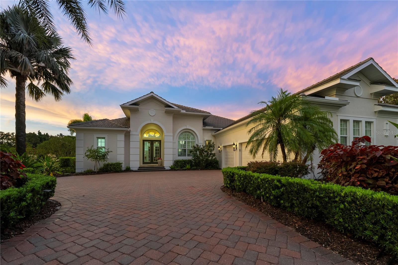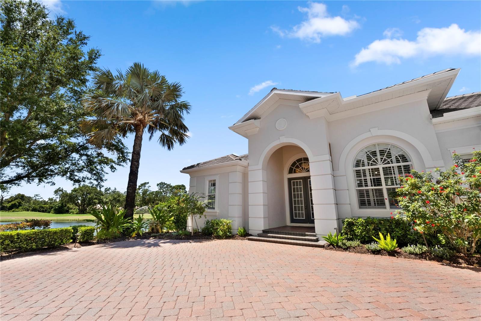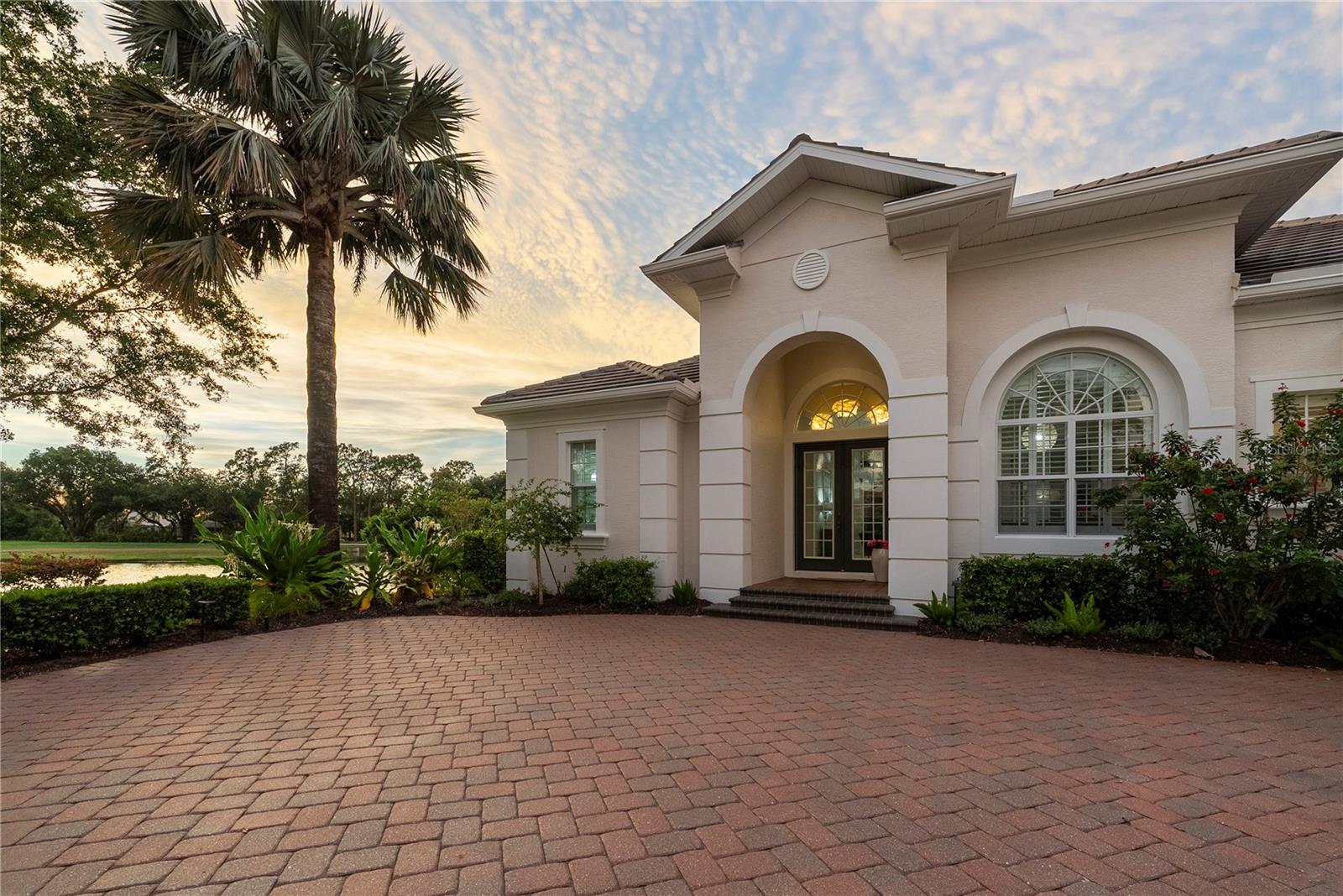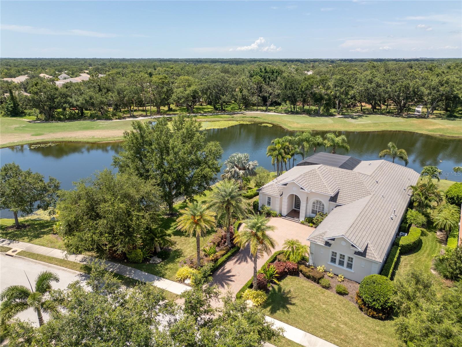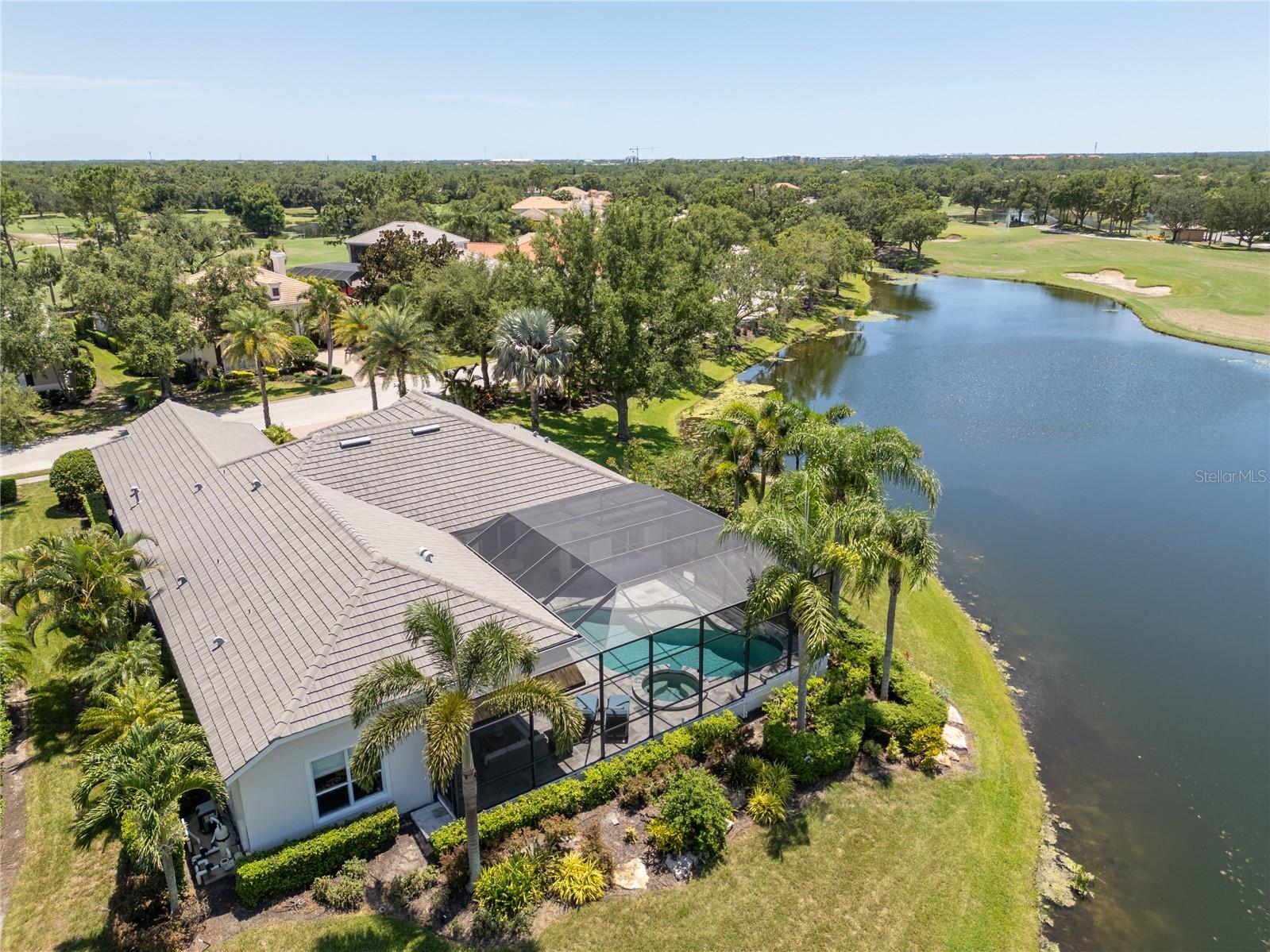 Welcome to one of the most captivating homes in the gated enclave of Lakewood Ranch Country Club, perfectly positioned with water on two sides and stunning views of the picturesque 5th hole on the King's Dune golf course. The home is perfectly positioned to enjoy brilliant sunsets from the lanai. This timeless residence blends privacy, sophistication, and comfort in one of the most sought-after golf course communities on Florida's Gulf Coast. With a freshly painted exterior, this home features impact rated glass throughout. From the moment you step through the grand double doors, you're greeted by soaring ceilings, detailed crown molding, and expansive windows that flood the home with natural light. The open-concept living spaces are thoughtfully designed for everyday elegance and effortless entertaining. At the heart of the home, the chef's kitchen impresses with rich solid wood cabinetry, sleek quartz countertops, high-end appliances, a wine room, and a breakfast nook that overlooks tranquil lake and fairway vistas.The owner's suite is a true sanctuary featuring a tray ceiling, beautiful natural light, and an oversized spa bath with a walk-in shower, soaking tub, and dual vanities. Two comfortable guest bedrooms, a den with custom built-ins, and a formal dining room offer flexibility and function. Additional features include a spacious laundry room and air-conditioned storage off the garage. Upgrades to the home included a new water heater, both new HVACs, new wood look porcelain tile floors, new stone feature TV wall with fireplace surrounded by stunning walls of shiplap and wood trim. Every bathroom has a new toilet. New Serena and Lily ceiling lighting has been added. Step outside to your private retreat - an oversized lanai with multiple seating areas including a brand new outdoor kitchen with new grill and mini frig. The lanai screens have all been replaced, along with a new pool heater for the saltwater pool and spa, all framed by lush tropical landscaping and stunning sunset views over the water. Set within the heart of Lakewood Ranch, the Country Club neighborhood offers miles of scenic trails, parks, and optional membership to four championship golf courses, world-class tennis, pickleball, fitness, and vibrant social activities. Just minutes from Lakewood Ranch Main Street, Waterside Place, shopping, dining, and award-winning Gulf beaches. The HOA fees for the Greystone section of Country Club include grounds maintenance, tree and bush trimming, mulching and a basic cable plus internet package (that can be upgraded).This is more than a home--it's a lifestyle. Schedule your private showing today.