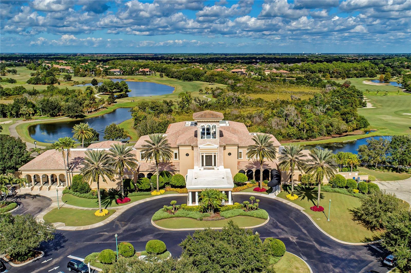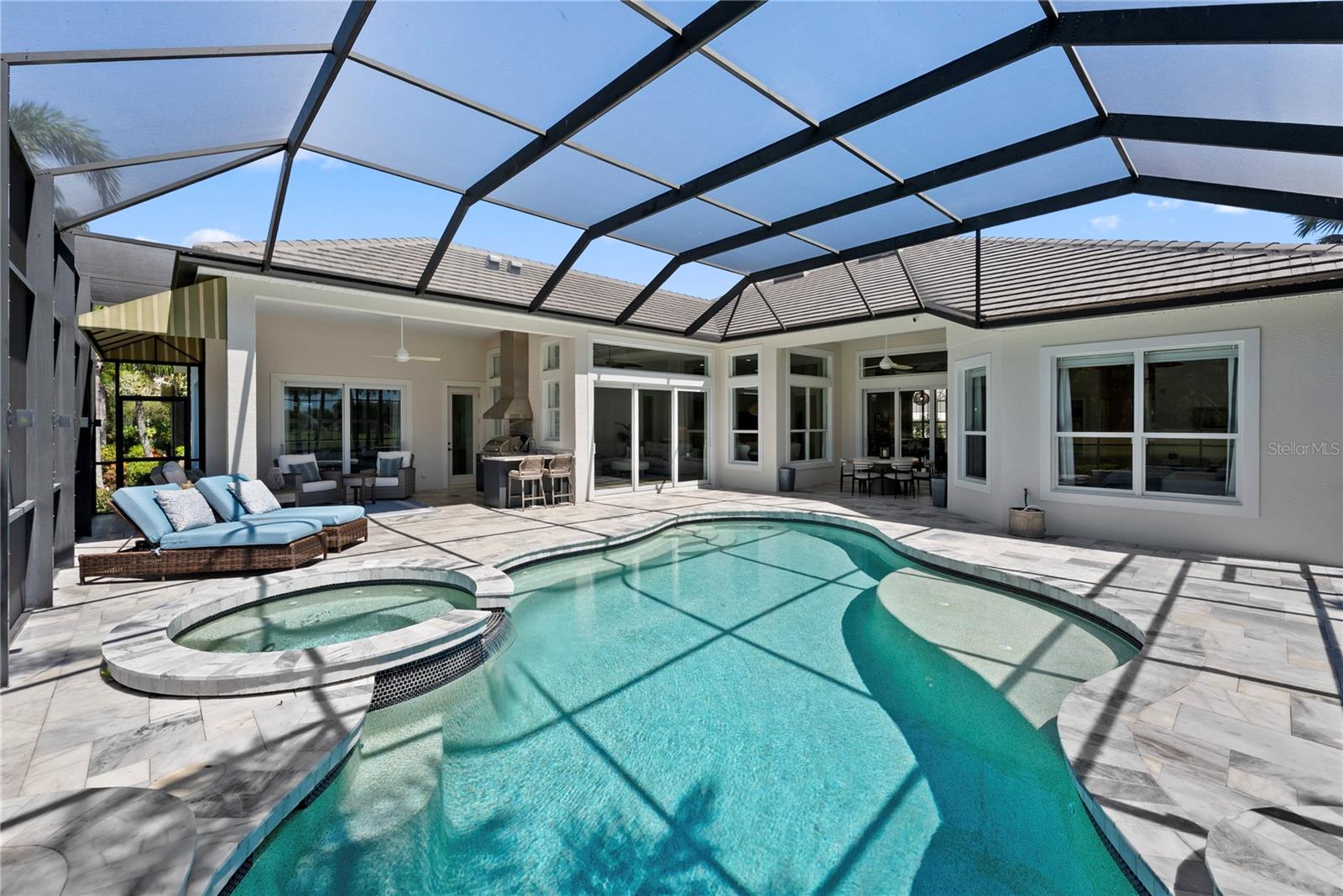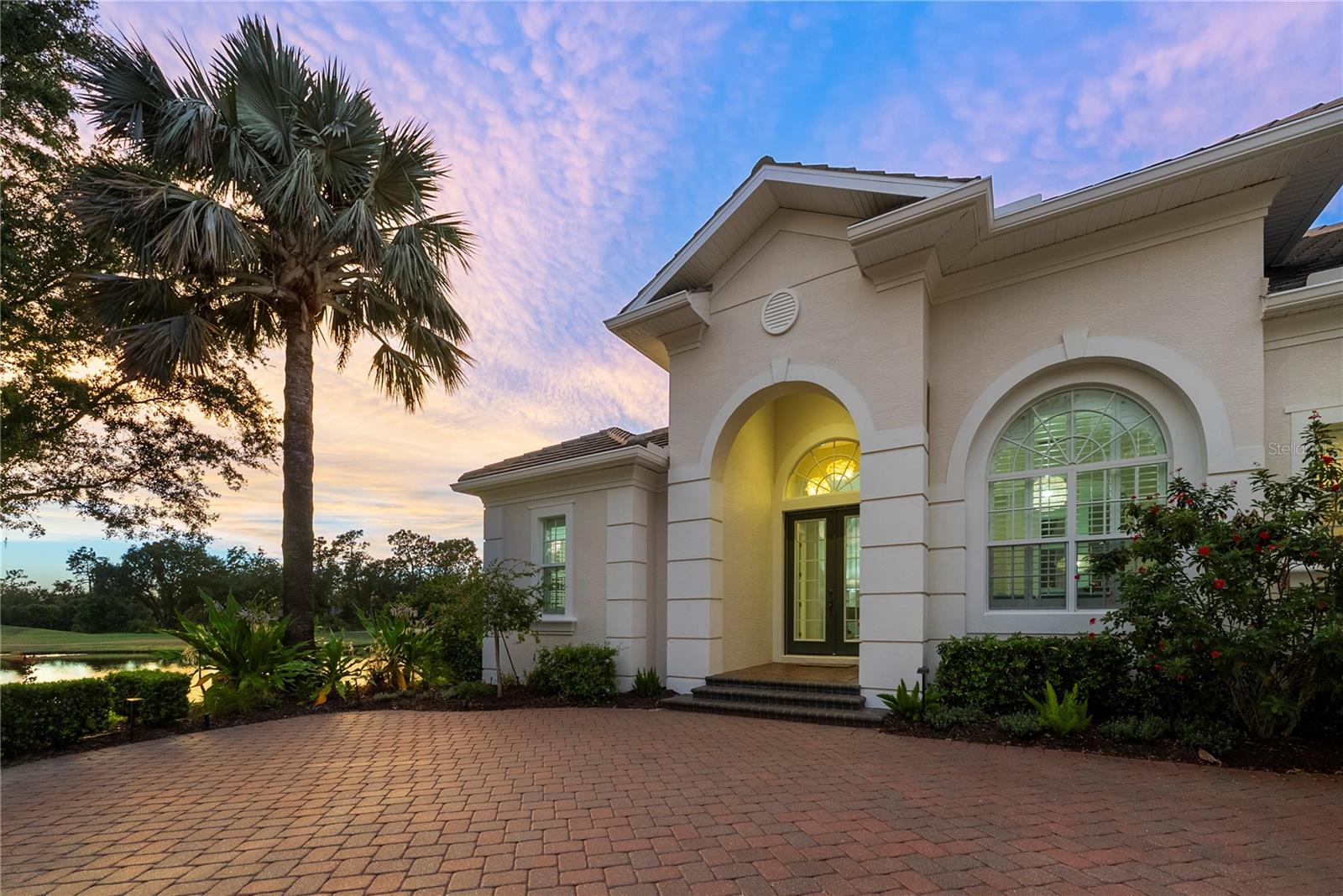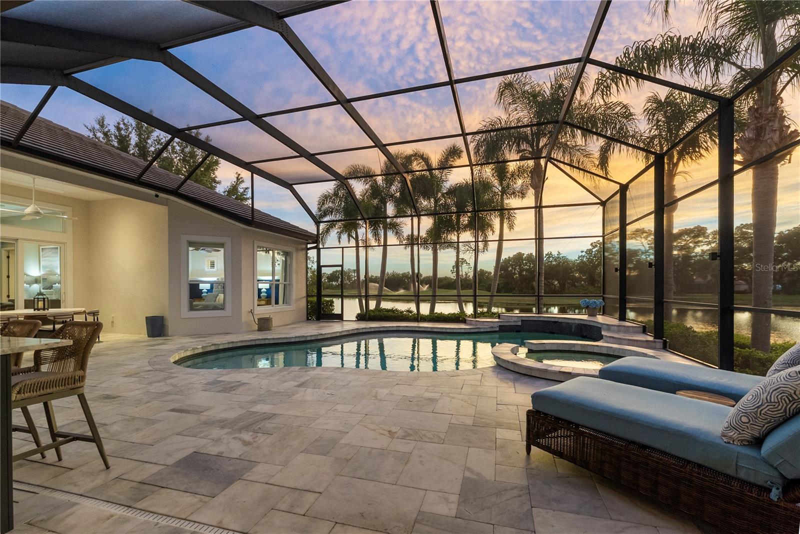 Welcome to one of the most captivating homes in the gated enclave of Lakewood Ranch Country Club, perfectly positioned with water on two sides and stunning views of the picturesque 5th hole on the King's Dune golf course. The home is perfectly positioned to enjoy brilliant sunsets from the lanai. This timeless residence blends privacy, sophistication, and comfort in one of the most sought-after golf course communities on Florida's Gulf Coast. With a freshly painted exterior, this home features impact rated glass throughout. From the moment you step through the grand double doors, you're greeted by soaring ceilings, detailed crown molding, and expansive windows that flood the home with natural light. The open-concept living spaces are thoughtfully designed for everyday elegance and effortless entertaining. At the heart of the home, the chef's kitchen impresses with rich solid wood cabinetry, sleek quartz countertops, high-end appliances, a wine room, and a breakfast nook that overlooks tranquil lake and fairway vistas.The owner's suite is a true sanctuary featuring a tray ceiling, beautiful natural light, and an oversized spa bath with a walk-in shower, soaking tub, and dual vanities. Two comfortable guest bedrooms, a den with custom built-ins, and a formal dining room offer flexibility and function. Additional features include a spacious laundry room and air-conditioned storage off the garage. Upgrades to the home included a new water heater, both new HVACs, new wood look porcelain tile floors, new stone feature TV wall with fireplace surrounded by stunning walls of shiplap and wood trim. Every bathroom has a new toilet. New Serena and Lily ceiling lighting has been added. Step outside to your private retreat - an oversized lanai with multiple seating areas including a brand new outdoor kitchen with new grill and mini frig. The lanai screens have all been replaced, along with a new pool heater for the saltwater pool and spa, all framed by lush tropical landscaping and stunning sunset views over the water. Set within the heart of Lakewood Ranch, the Country Club neighborhood offers miles of scenic trails, parks, and optional membership to four championship golf courses, world-class tennis, pickleball, fitness, and vibrant social activities. Just minutes from Lakewood Ranch Main Street, Waterside Place, shopping, dining, and award-winning Gulf beaches. The HOA fees for the Greystone section of Country Club include grounds maintenance, tree and bush trimming, mulching and a basic cable plus internet package (that can be upgraded).This is more than a home--it's a lifestyle. Schedule your private showing today.