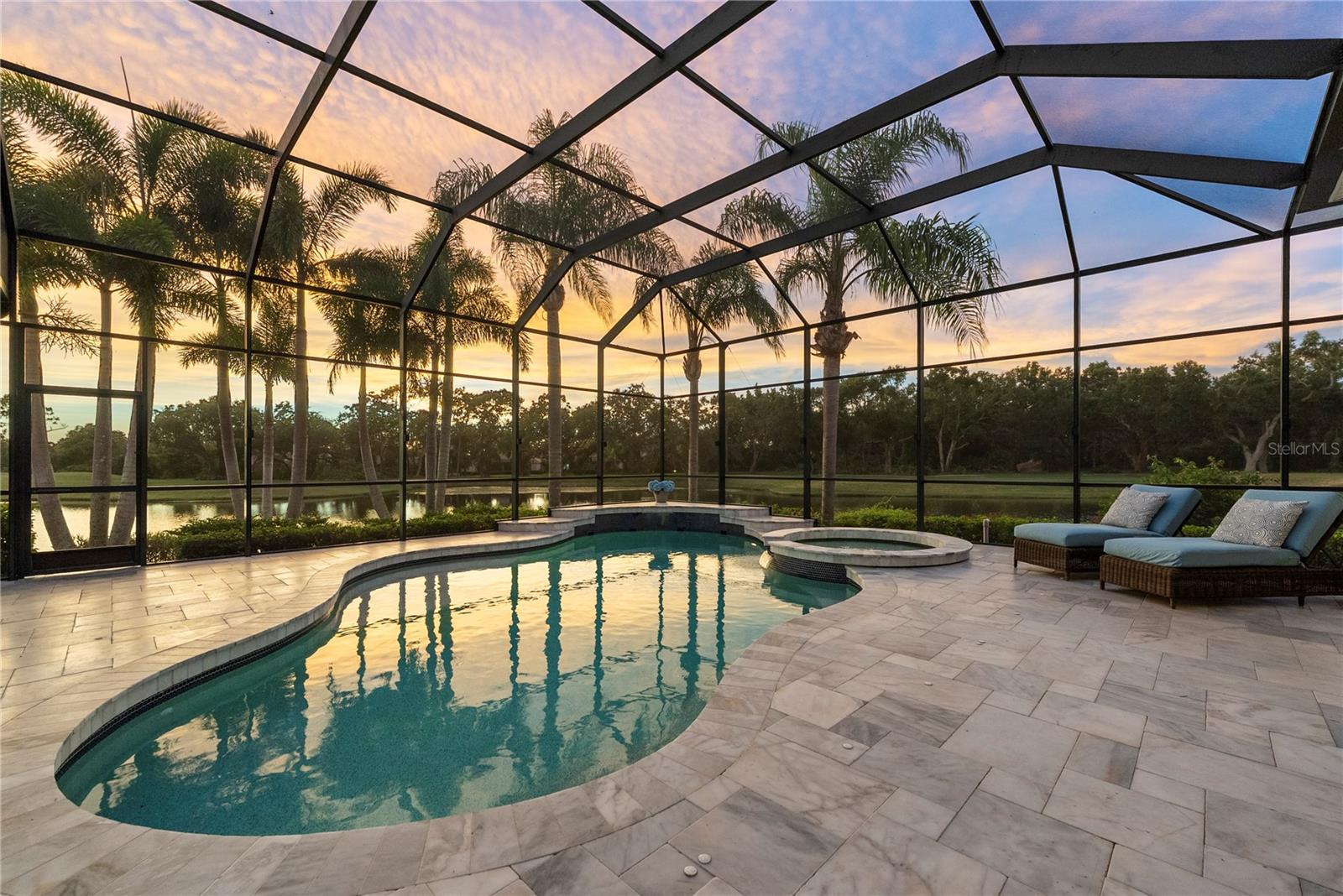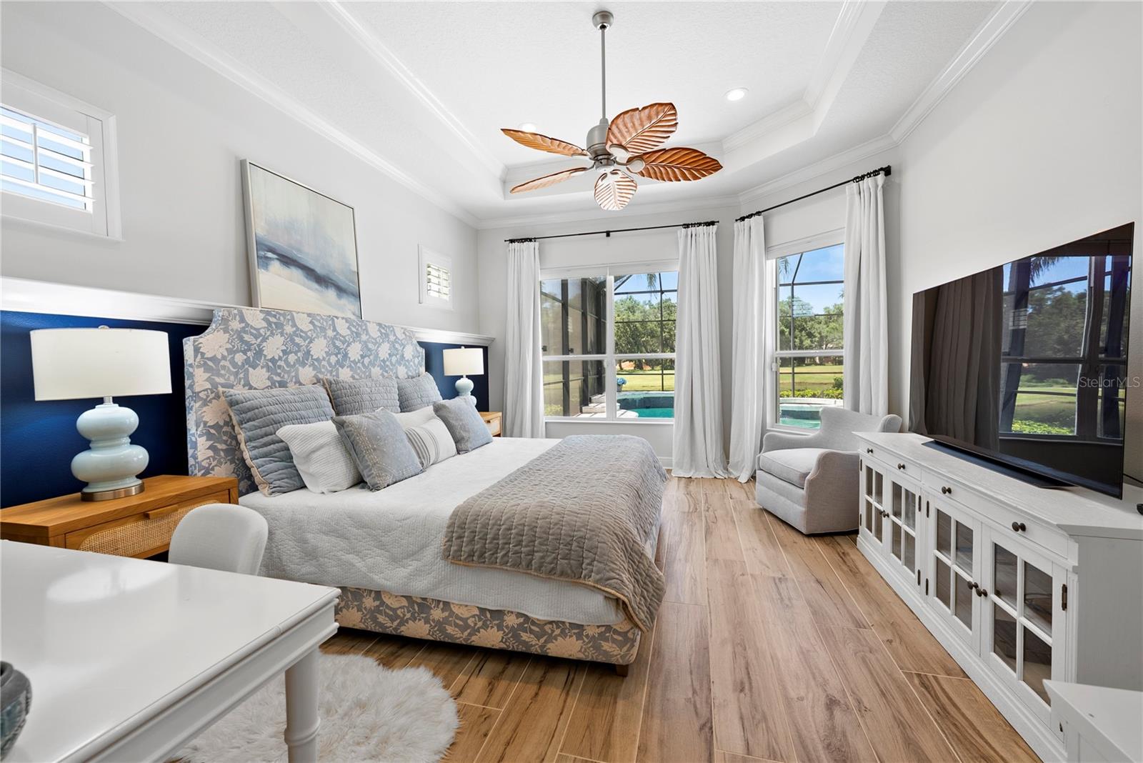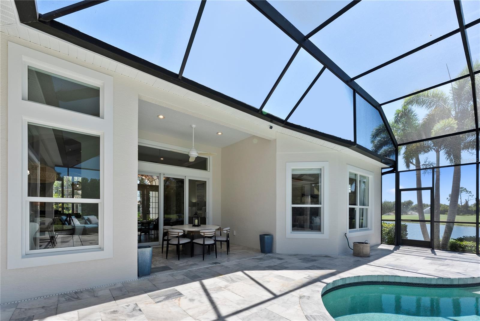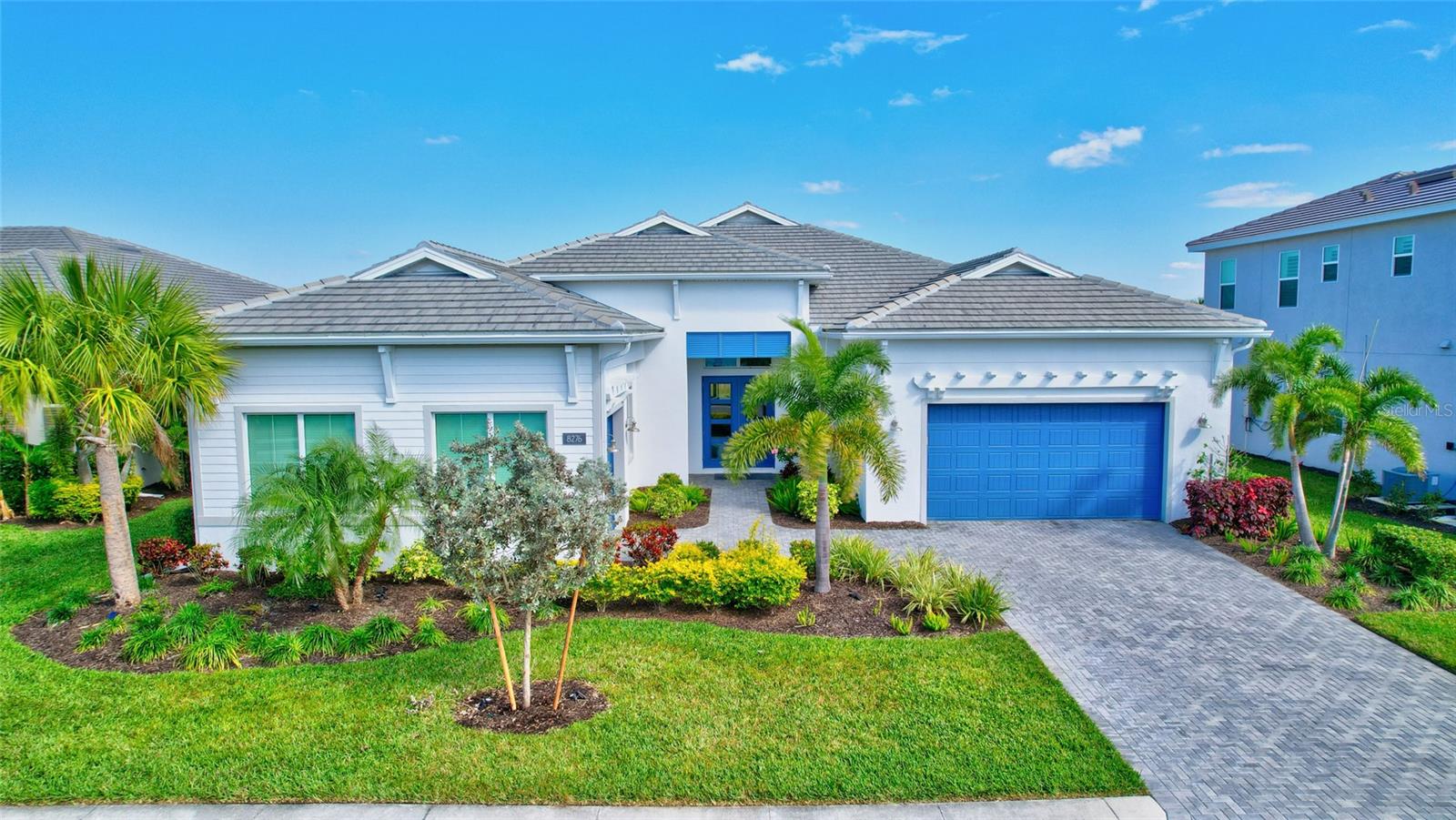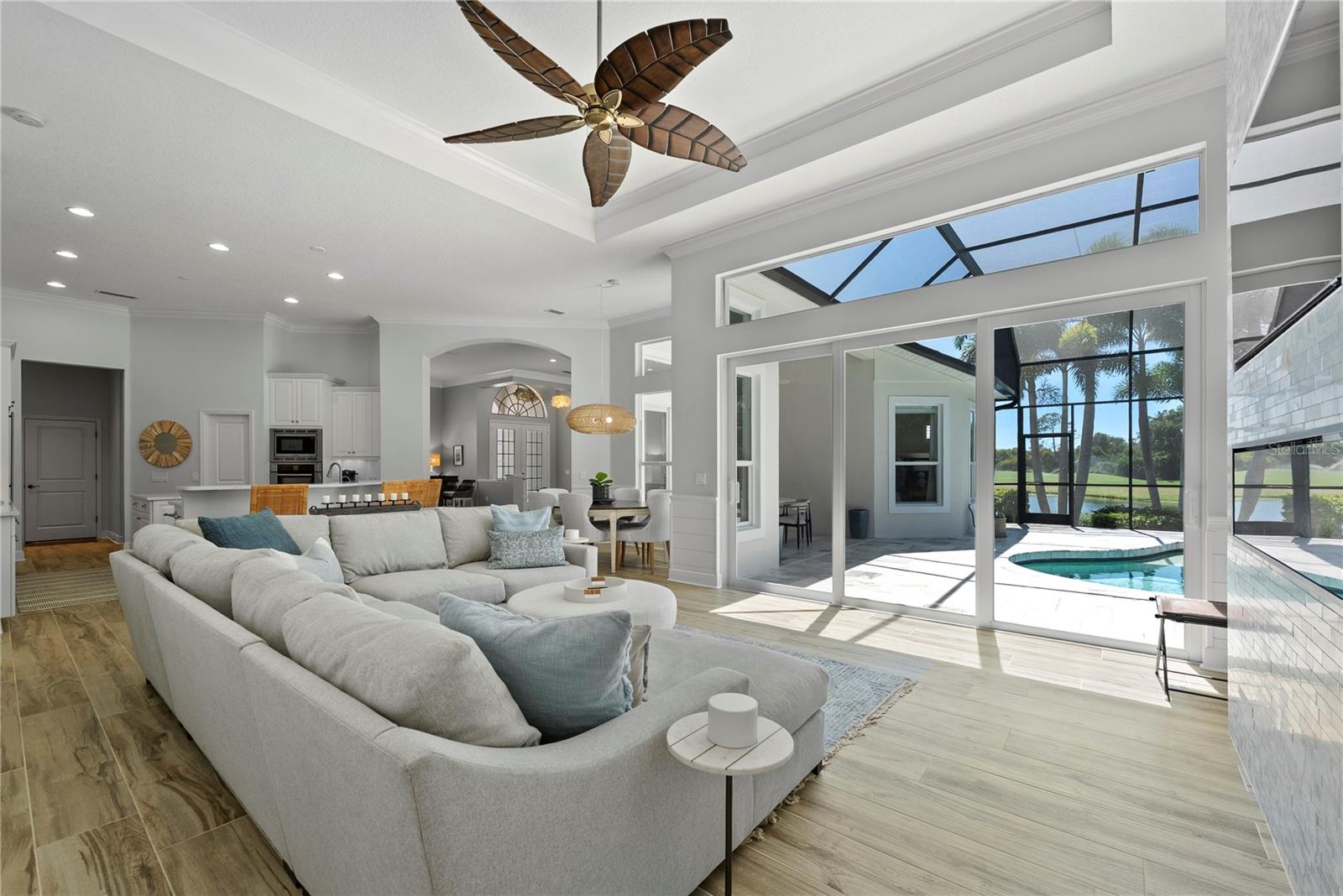 Welcome to one of the most captivating homes in the gated enclave of Lakewood Ranch Country Club, perfectly positioned with water on two sides and stunning views of the picturesque 5th hole on the King's Dune golf course. The home is perfectly positioned to enjoy brilliant sunsets from the lanai. This timeless residence blends privacy, sophistication, and comfort in one of the most sought-after golf course communities on Florida's Gulf Coast. With a freshly painted exterior, this home features impact rated glass throughout. From the moment you step through the grand double doors, you're greeted by soaring ceilings, detailed crown molding, and expansive windows that flood the home with natural light. The open-concept living spaces are thoughtfully designed for everyday elegance and effortless entertaining. At the heart of the home, the chef's kitchen impresses with rich solid wood cabinetry, sleek quartz countertops, high-end appliances, a wine room, and a breakfast nook that overlooks tranquil lake and fairway vistas.The owner's suite is a true sanctuary featuring a tray ceiling, beautiful natural light, and an oversized spa bath with a walk-in shower, soaking tub, and dual vanities. Two comfortable guest bedrooms, a den with custom built-ins, and a formal dining room offer flexibility and function. Additional features include a spacious laundry room and air-conditioned storage off the garage. Upgrades to the home included a new water heater, both new HVACs, new wood look porcelain tile floors, new stone feature TV wall with fireplace surrounded by stunning walls of shiplap and wood trim. Every bathroom has a new toilet. New Serena and Lily ceiling lighting has been added. Step outside to your private retreat - an oversized lanai with multiple seating areas including a brand new outdoor kitchen with new grill and mini frig. The lanai screens have all been replaced, along with a new pool heater for the saltwater pool and spa, all framed by lush tropical landscaping and stunning sunset views over the water. Set within the heart of Lakewood Ranch, the Country Club neighborhood offers miles of scenic trails, parks, and optional membership to four championship golf courses, world-class tennis, pickleball, fitness, and vibrant social activities. Just minutes from Lakewood Ranch Main Street, Waterside Place, shopping, dining, and award-winning Gulf beaches. The HOA fees for the Greystone section of Country Club include grounds maintenance, tree and bush trimming, mulching and a basic cable plus internet package (that can be upgraded).This is more than a home--it's a lifestyle. Schedule your private showing today.