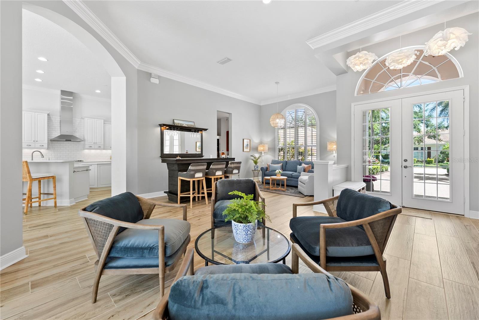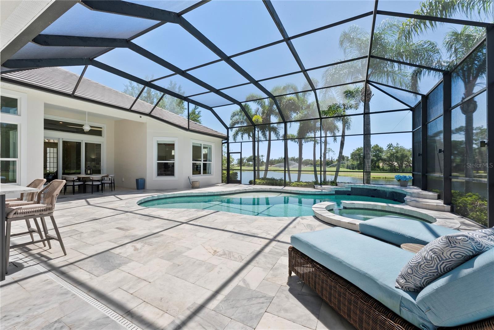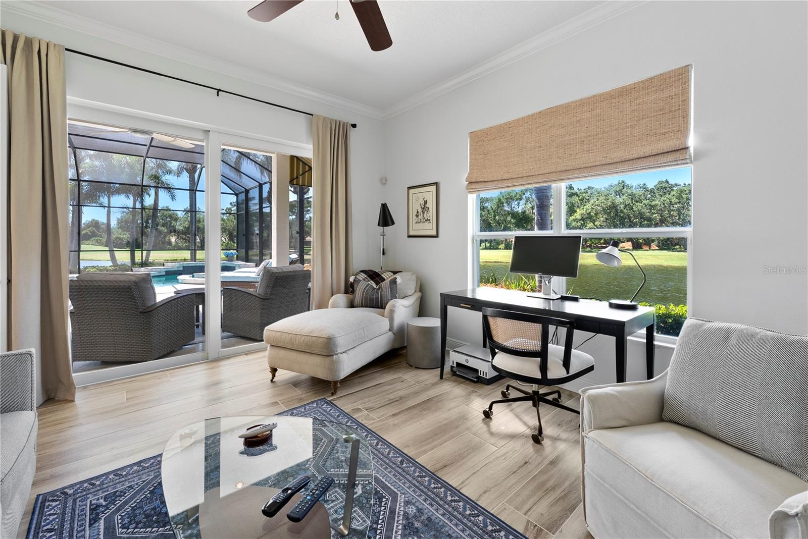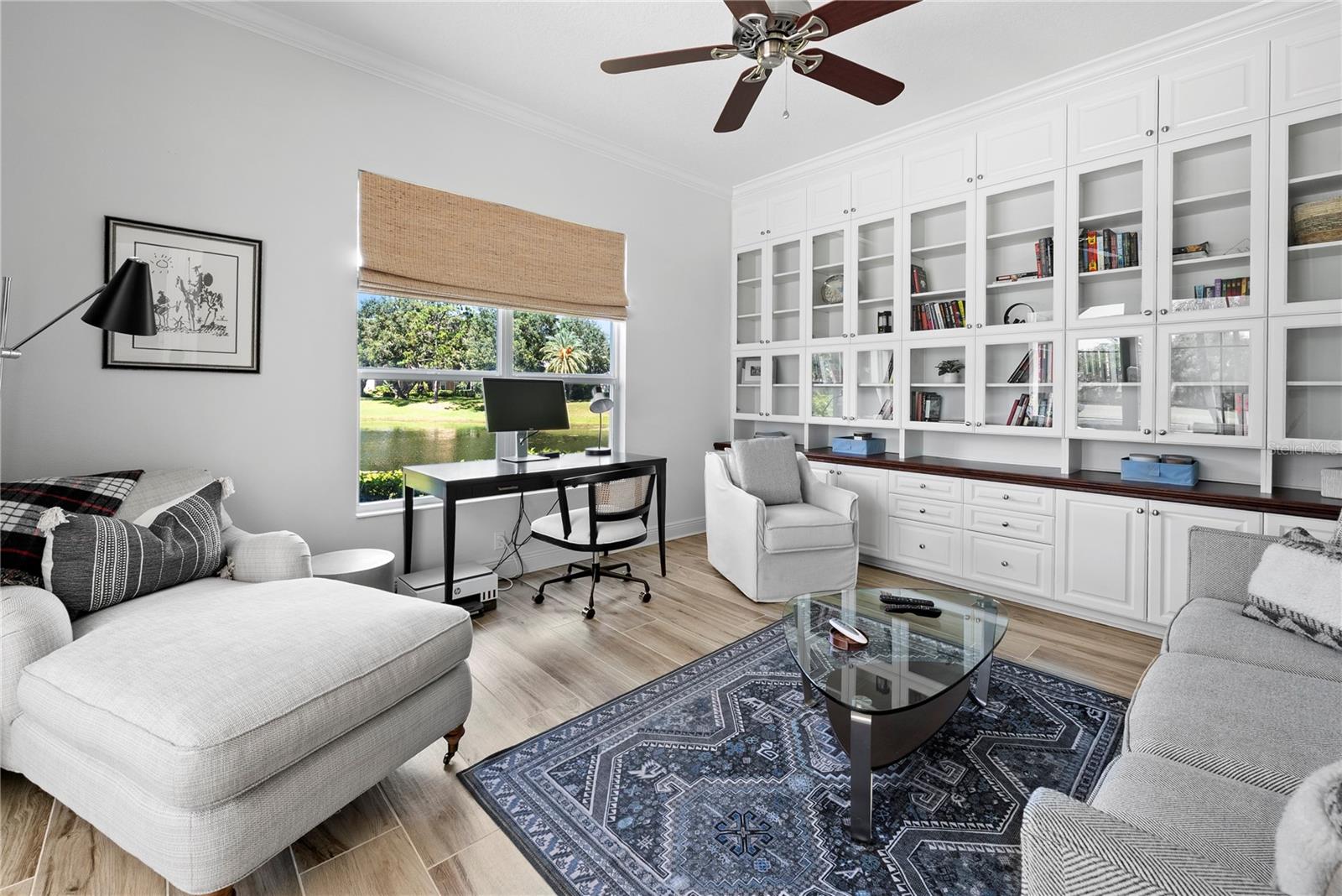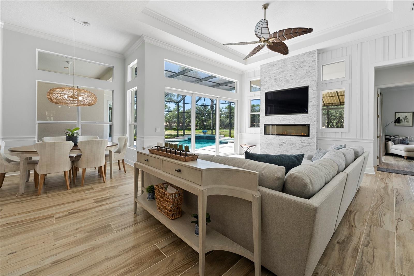 Welcome to one of the most captivating homes in the gated enclave of Lakewood Ranch Country Club, perfectly positioned with water on two sides and stunning views of the picturesque 5th hole on the King's Dune golf course. The home is perfectly positioned to enjoy brilliant sunsets from the lanai. This timeless residence blends privacy, sophistication, and comfort in one of the most sought-after golf course communities on Florida's Gulf Coast. With a freshly painted exterior, this home features impact rated glass throughout. From the moment you step through the grand double doors, you're greeted by soaring ceilings, detailed crown molding, and expansive windows that flood the home with natural light. The open-concept living spaces are thoughtfully designed for everyday elegance and effortless entertaining. At the heart of the home, the chef's kitchen impresses with rich solid wood cabinetry, sleek quartz countertops, high-end appliances, a wine room, and a breakfast nook that overlooks tranquil lake and fairway vistas.The owner's suite is a true sanctuary featuring a tray ceiling, beautiful natural light, and an oversized spa bath with a walk-in shower, soaking tub, and dual vanities. Two comfortable guest bedrooms, a den with custom built-ins, and a formal dining room offer flexibility and function. Additional features include a spacious laundry room and air-conditioned storage off the garage. Upgrades to the home included a new water heater, both new HVACs, new wood look porcelain tile floors, new stone feature TV wall with fireplace surrounded by stunning walls of shiplap and wood trim. Every bathroom has a new toilet. New Serena and Lily ceiling lighting has been added. Step outside to your private retreat - an oversized lanai with multiple seating areas including a brand new outdoor kitchen with new grill and mini frig. The lanai screens have all been replaced, along with a new pool heater for the saltwater pool and spa, all framed by lush tropical landscaping and stunning sunset views over the water. Set within the heart of Lakewood Ranch, the Country Club neighborhood offers miles of scenic trails, parks, and optional membership to four championship golf courses, world-class tennis, pickleball, fitness, and vibrant social activities. Just minutes from Lakewood Ranch Main Street, Waterside Place, shopping, dining, and award-winning Gulf beaches. The HOA fees for the Greystone section of Country Club include grounds maintenance, tree and bush trimming, mulching and a basic cable plus internet package (that can be upgraded).This is more than a home--it's a lifestyle. Schedule your private showing today.