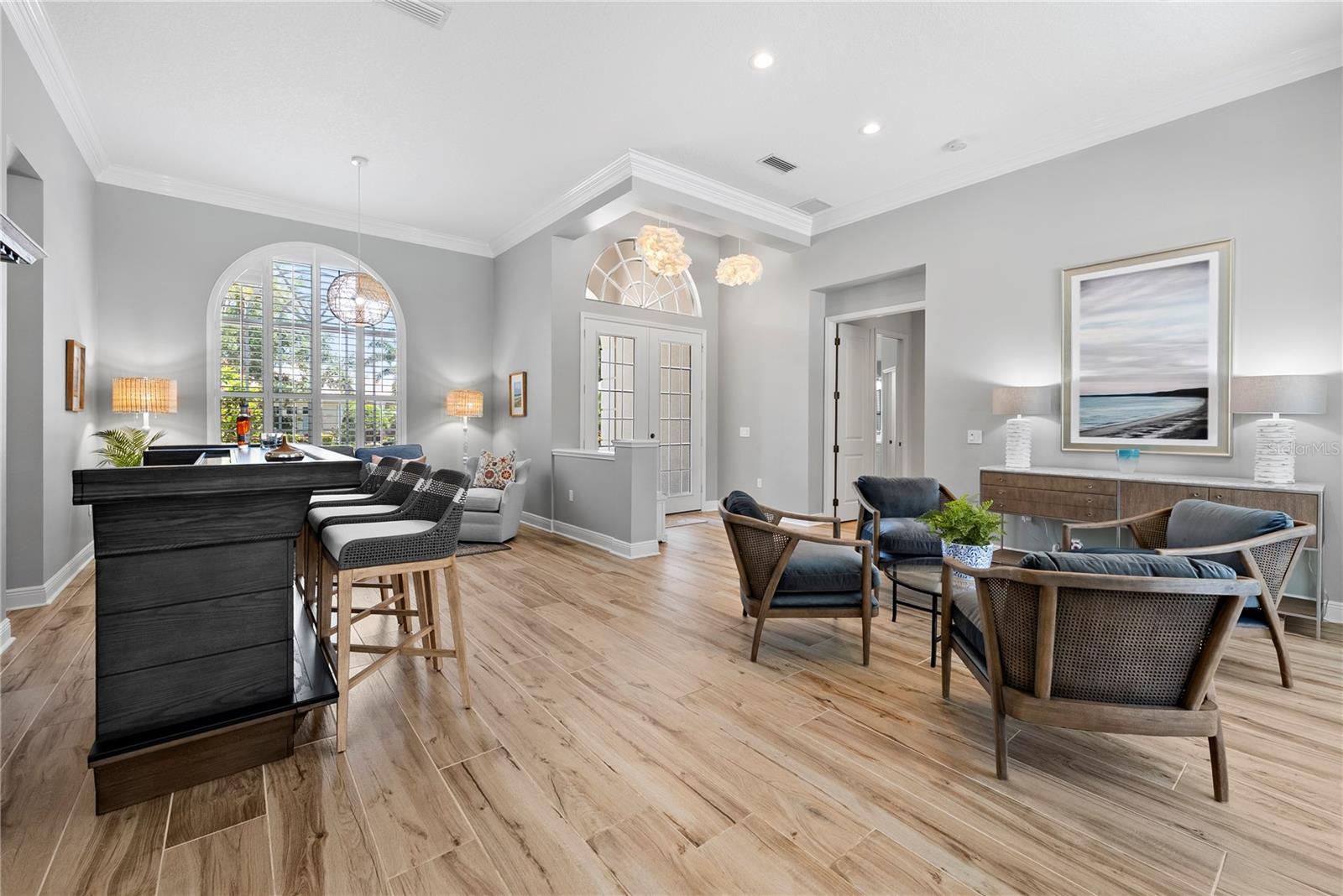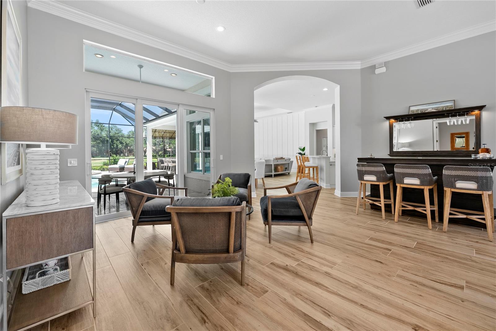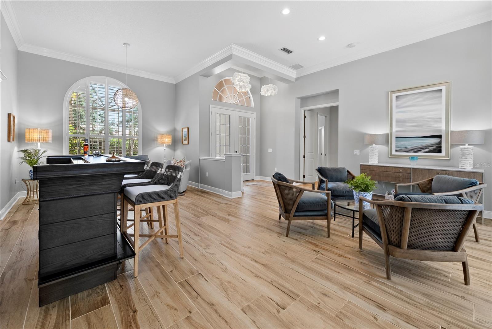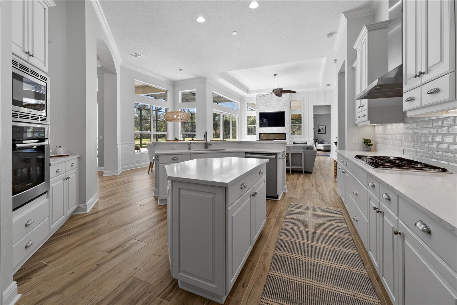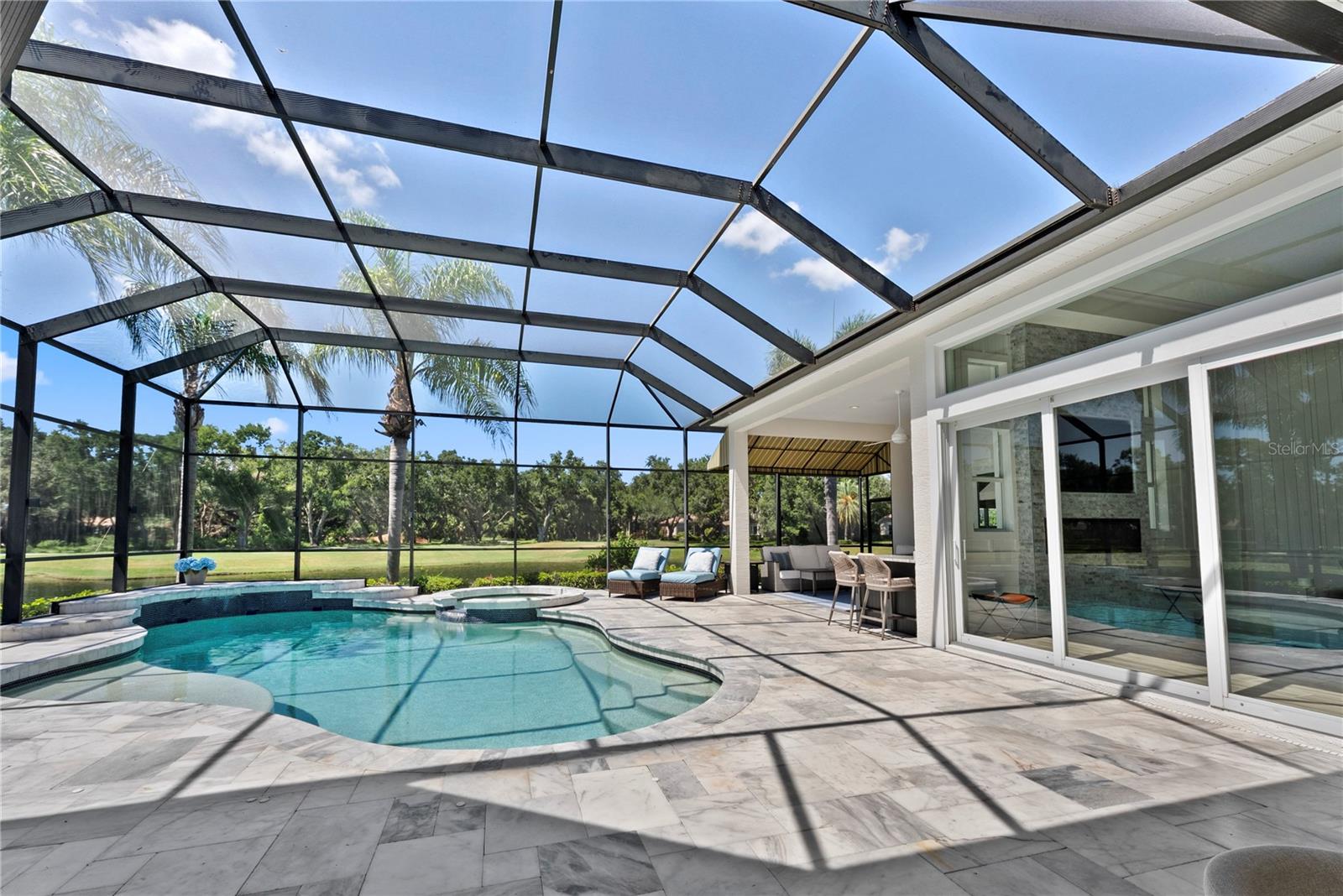 Welcome to one of the most captivating homes in the gated enclave of Lakewood Ranch Country Club, perfectly positioned with water on two sides and stunning views of the picturesque 5th hole on the King's Dune golf course. The home is perfectly positioned to enjoy brilliant sunsets from the lanai. This timeless residence blends privacy, sophistication, and comfort in one of the most sought-after golf course communities on Florida's Gulf Coast. With a freshly painted exterior, this home features impact rated glass throughout. From the moment you step through the grand double doors, you're greeted by soaring ceilings, detailed crown molding, and expansive windows that flood the home with natural light. The open-concept living spaces are thoughtfully designed for everyday elegance and effortless entertaining. At the heart of the home, the chef's kitchen impresses with rich solid wood cabinetry, sleek quartz countertops, high-end appliances, a wine room, and a breakfast nook that overlooks tranquil lake and fairway vistas.The owner's suite is a true sanctuary featuring a tray ceiling, beautiful natural light, and an oversized spa bath with a walk-in shower, soaking tub, and dual vanities. Two comfortable guest bedrooms, a den with custom built-ins, and a formal dining room offer flexibility and function. Additional features include a spacious laundry room and air-conditioned storage off the garage. Upgrades to the home included a new water heater, both new HVACs, new wood look porcelain tile floors, new stone feature TV wall with fireplace surrounded by stunning walls of shiplap and wood trim. Every bathroom has a new toilet. New Serena and Lily ceiling lighting has been added. Step outside to your private retreat - an oversized lanai with multiple seating areas including a brand new outdoor kitchen with new grill and mini frig. The lanai screens have all been replaced, along with a new pool heater for the saltwater pool and spa, all framed by lush tropical landscaping and stunning sunset views over the water. Set within the heart of Lakewood Ranch, the Country Club neighborhood offers miles of scenic trails, parks, and optional membership to four championship golf courses, world-class tennis, pickleball, fitness, and vibrant social activities. Just minutes from Lakewood Ranch Main Street, Waterside Place, shopping, dining, and award-winning Gulf beaches. The HOA fees for the Greystone section of Country Club include grounds maintenance, tree and bush trimming, mulching and a basic cable plus internet package (that can be upgraded).This is more than a home--it's a lifestyle. Schedule your private showing today.