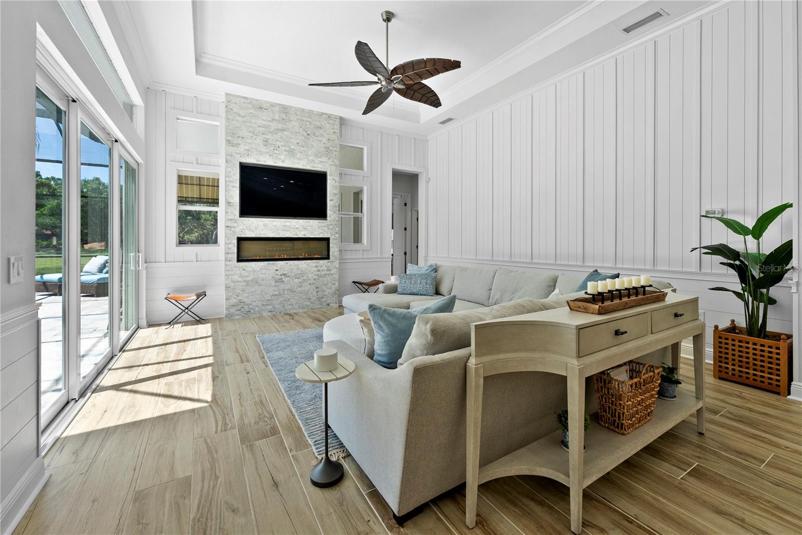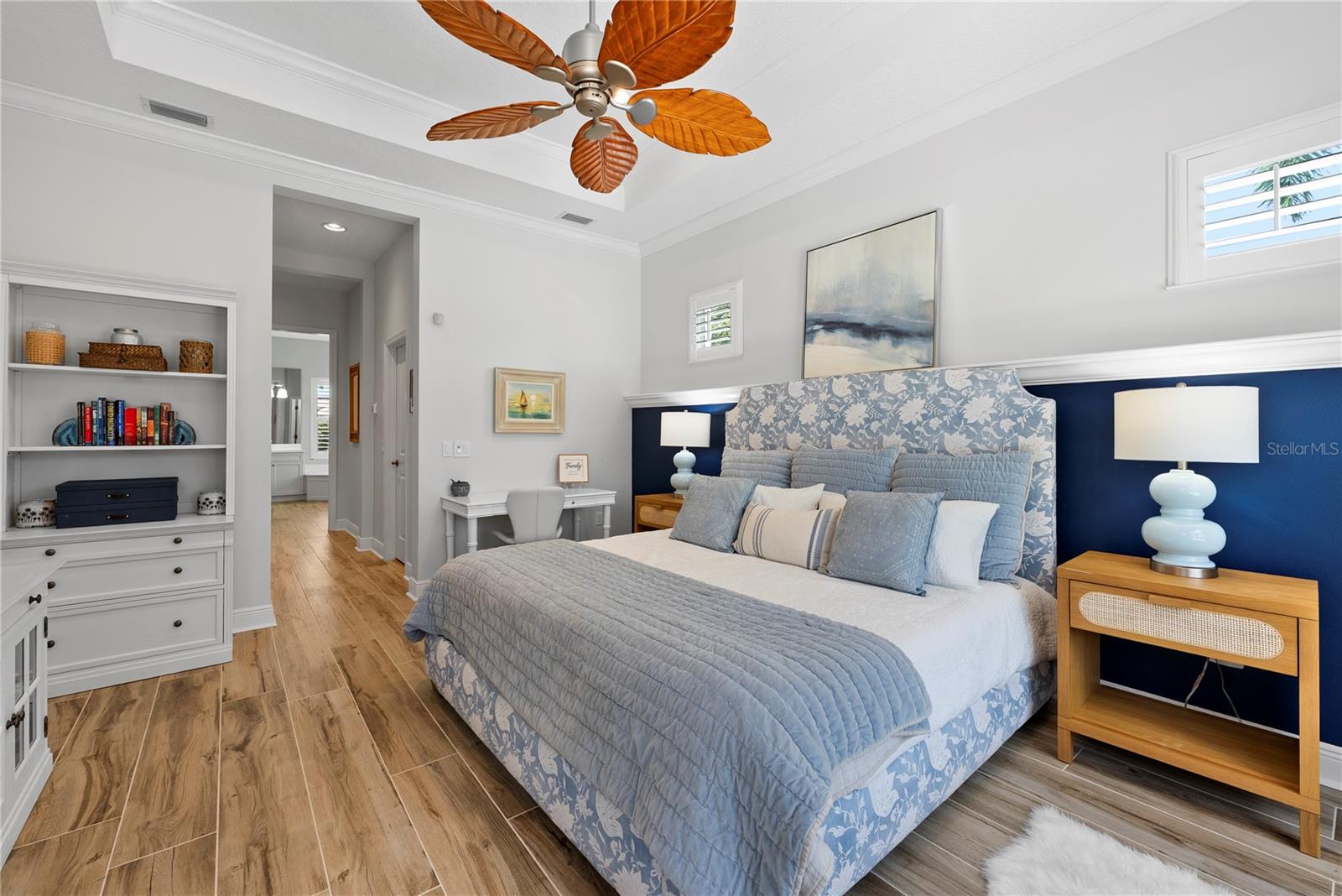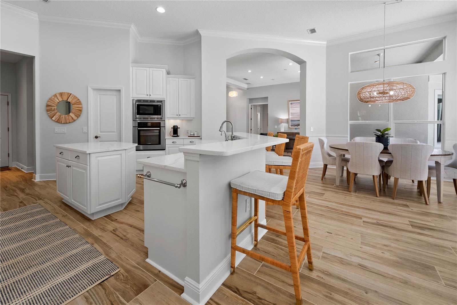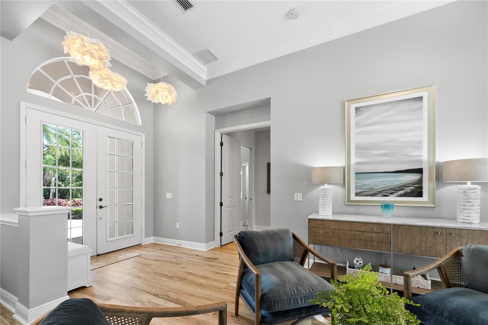 Welcome to one of the most captivating homes in the gated enclave of Lakewood Ranch Country Club, perfectly positioned with water on two sides and stunning views of the picturesque 5th hole on the King's Dune golf course. The home is perfectly positioned to enjoy brilliant sunsets from the lanai. This timeless residence blends privacy, sophistication, and comfort in one of the most sought-after golf course communities on Florida's Gulf Coast. With a freshly painted exterior, this home features impact rated glass throughout. From the moment you step through the grand double doors, you're greeted by soaring ceilings, detailed crown molding, and expansive windows that flood the home with natural light. The open-concept living spaces are thoughtfully designed for everyday elegance and effortless entertaining. At the heart of the home, the chef's kitchen impresses with rich solid wood cabinetry, sleek quartz countertops, high-end appliances, a wine room, and a breakfast nook that overlooks tranquil lake and fairway vistas.The owner's suite is a true sanctuary featuring a tray ceiling, beautiful natural light, and an oversized spa bath with a walk-in shower, soaking tub, and dual vanities. Two comfortable guest bedrooms, a den with custom built-ins, and a formal dining room offer flexibility and function. Additional features include a spacious laundry room and air-conditioned storage off the garage. Upgrades to the home included a new water heater, both new HVACs, new wood look porcelain tile floors, new stone feature TV wall with fireplace surrounded by stunning walls of shiplap and wood trim. Every bathroom has a new toilet. New Serena and Lily ceiling lighting has been added. Step outside to your private retreat - an oversized lanai with multiple seating areas including a brand new outdoor kitchen with new grill and mini frig. The lanai screens have all been replaced, along with a new pool heater for the saltwater pool and spa, all framed by lush tropical landscaping and stunning sunset views over the water. Set within the heart of Lakewood Ranch, the Country Club neighborhood offers miles of scenic trails, parks, and optional membership to four championship golf courses, world-class tennis, pickleball, fitness, and vibrant social activities. Just minutes from Lakewood Ranch Main Street, Waterside Place, shopping, dining, and award-winning Gulf beaches. The HOA fees for the Greystone section of Country Club include grounds maintenance, tree and bush trimming, mulching and a basic cable plus internet package (that can be upgraded).This is more than a home--it's a lifestyle. Schedule your private showing today.
