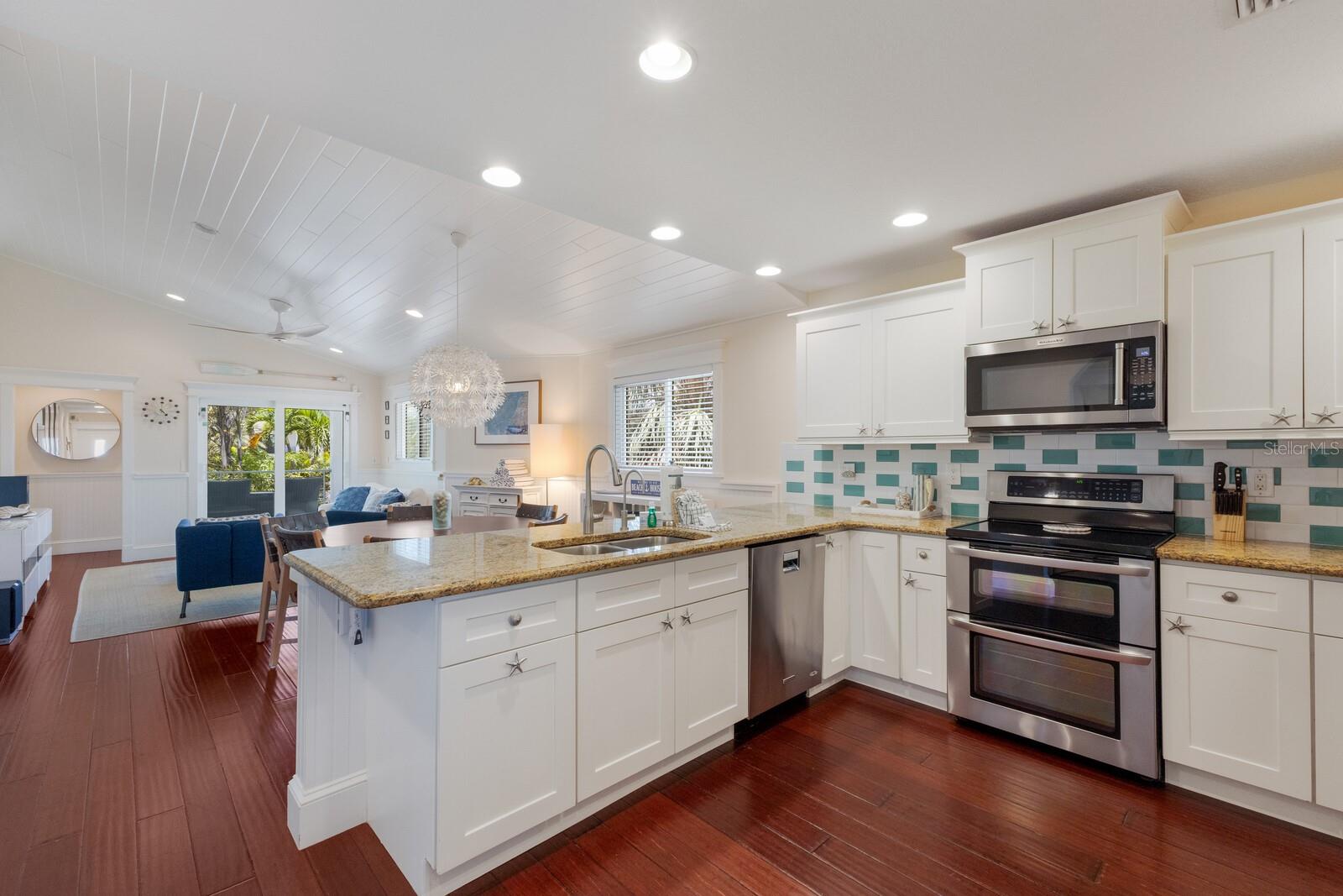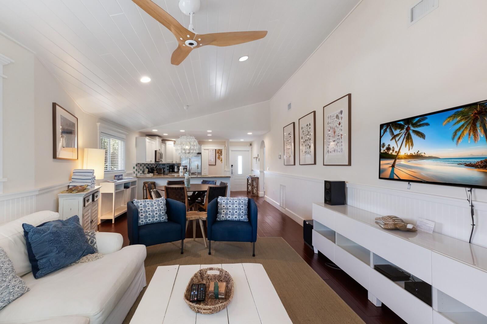 Welcome to Limelight -- a beautifully appointed and fully furnished 3-bedroom, 2-bath coastal retreat ideally located on the coveted north end of Anna Maria Island, just steps from direct beach access. Light-filled interiors and swaying palms greet you upon entry, setting the tone for relaxed island living. Vaulted white wood-plank ceilings, custom millwork, wainscoting, and rich wood flooring create a warm and refined ambiance throughout the open living and dining spaces.The kitchen, perfectly integrated with the main living area, features stainless steel appliances, granite countertops, a custom tile backsplash, breakfast bar, and a reverse osmosis drinking water system. The spacious primary suite includes a walk-in closet and en-suite bath with a walk-in shower. All bedrooms are finished with crown molding, custom wood trim, and wood floors, adding a touch of timeless character.Step outside to the covered patio -- the perfect spot to sip your morning coffee or toast the sunset. On the ground level, a stunning open-air living area offers relaxed lounging, alfresco dining, and even space to design your dream poolside bar -- all enhanced by electric roll-down screens and hurricane shutters. The heated freeform pool is surrounded by lush tropical landscaping, offering complete privacy, along with a hot/cold outdoor shower.Additional highlights include: a 2-car tandem garage with impact door, interior laundry with storage, impact-rated doors and windows, app-controlled tankless hot water heater and HVAC with AirKnight air purification, water softener and chlorine removal system, 2020 exterior stair and railing upgrades, 2024 new Tv in cabana area, 2024 new roof and an efficient drainage system.Whether you're looking for a full-time residence, second home, or investment opportunity, this island gem is move-in ready with nightly rentals permitted. Experience the best of Anna Maria living -- laid-back luxury just moments from the Gulf.