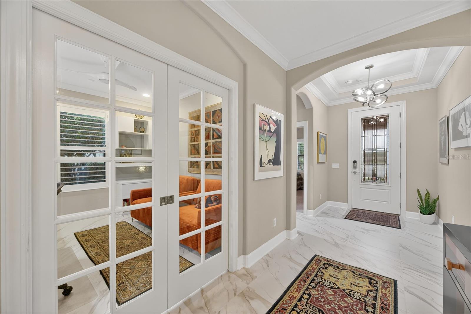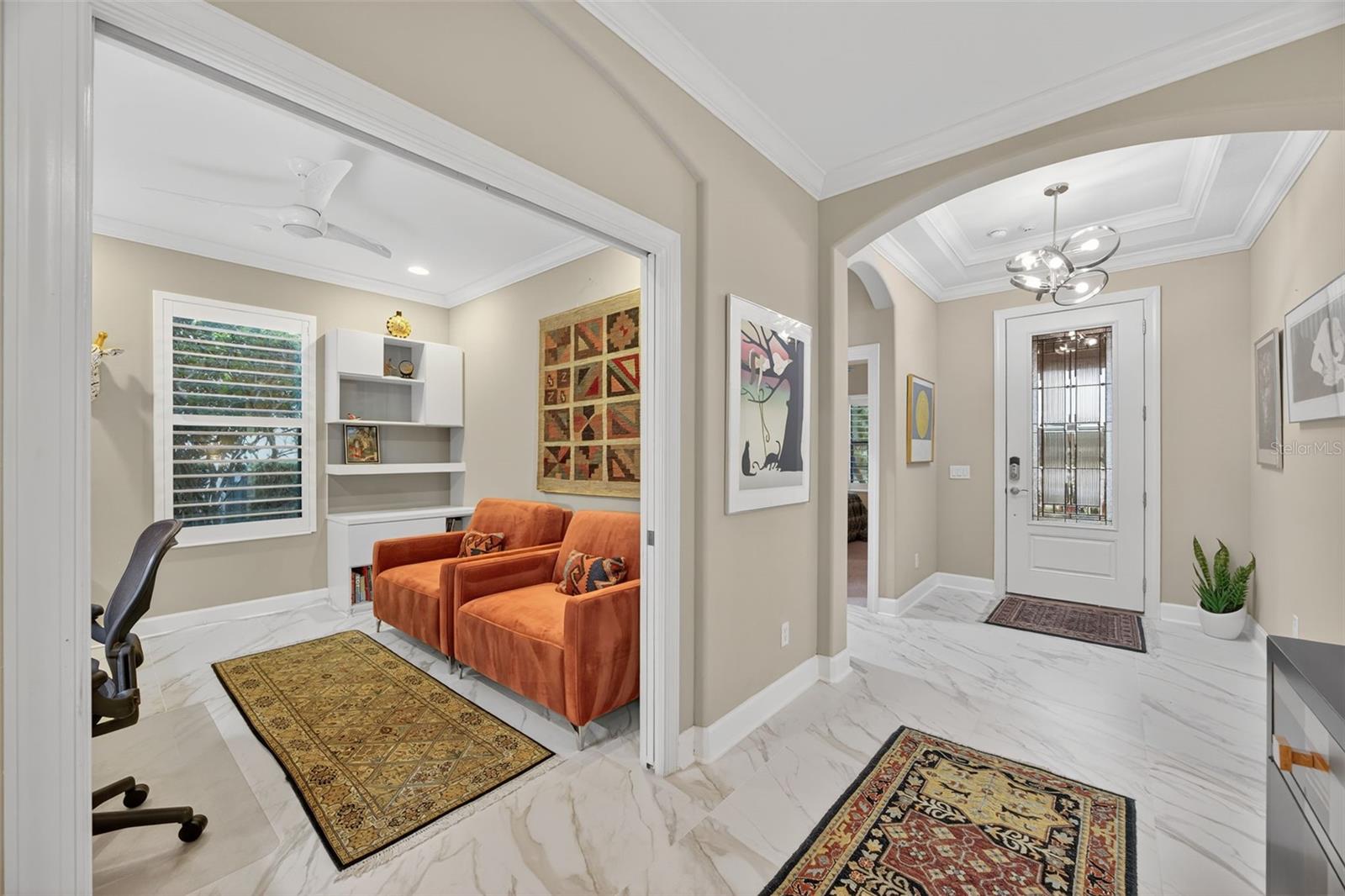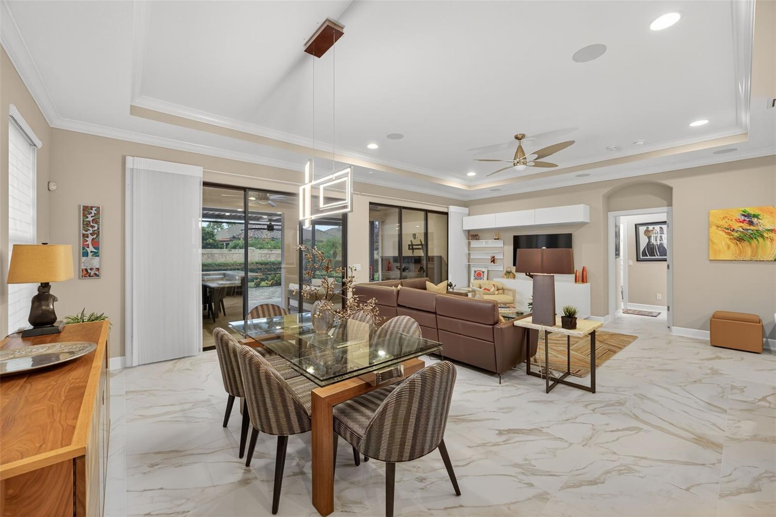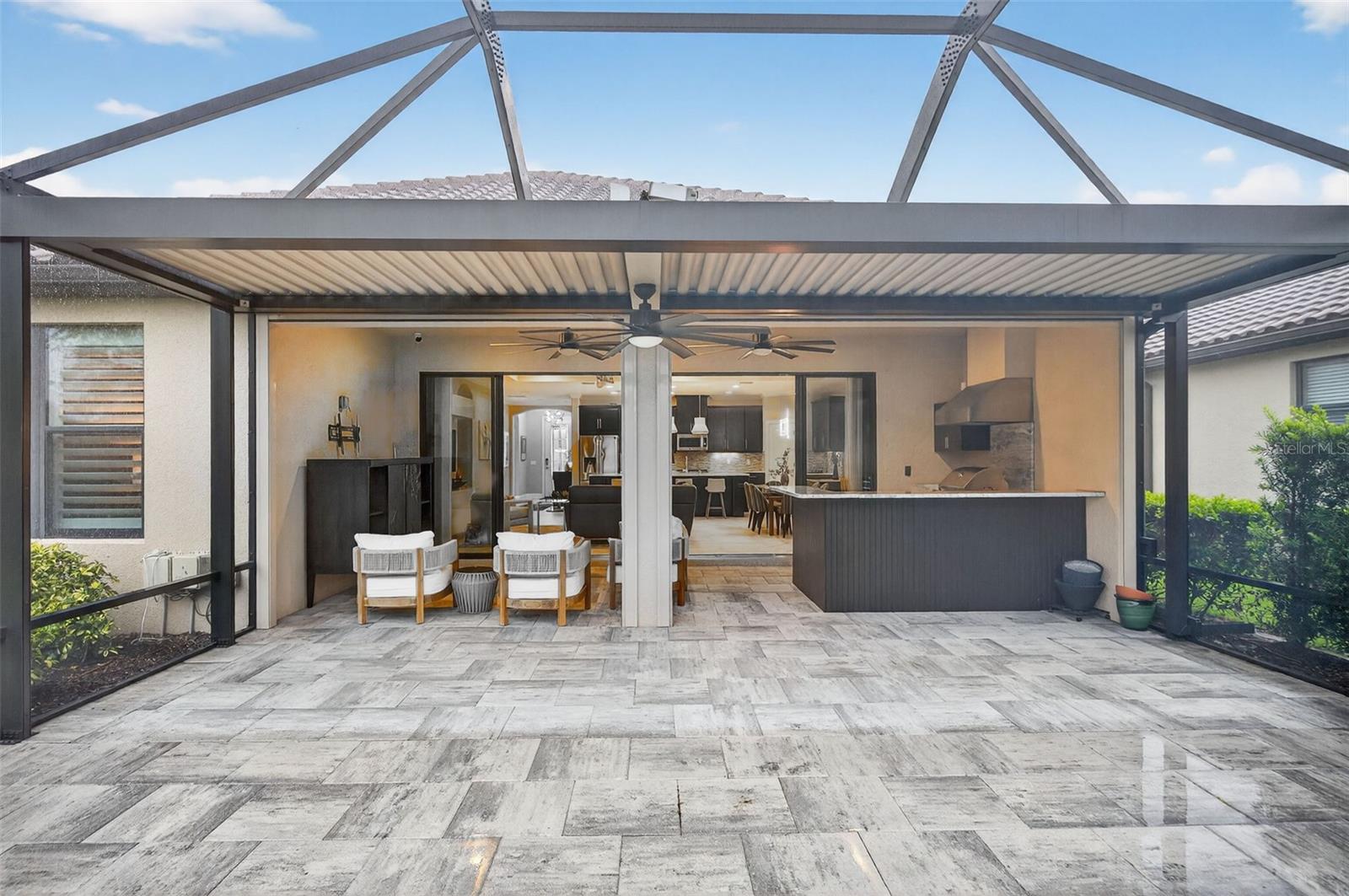 Impeccably Upgraded Piceno Model | 2BR + Den | Outdoor Oasis & Designer Touches! Welcome to this beautifully upgraded 2-bedroom, 2-bath Piceno model featuring thoughtful design, high-end finishes, and exceptional indoor-outdoor living. The gourmet kitchen is a true showstopper with an oversized Cambria quartz island offering extra storage, a custom pantry, stainless steel LG appliances, built-in desk, wine fridge, and under-cabinet lighting. Ideal for entertaining or everyday living, it seamlessly connects to the open-concept great room with tray ceilings, built-in surround sound (indoors & outdoors), and Hunter Douglas motorized shades on the sliders. Step outside to your extended lanai oasis featuring newer pavers, Storm Smart roll-down shades, and a fully equipped outdoor kitchen with granite countertops, built-in grill, side burner, sink, fridge, and ice chest--perfect for hosting guests or unwinding in peace. The spacious primary suite boasts dual custom walk-in closets, Cambria quartz dual vanities, and a luxurious walk-in shower. Ceramic tile flows through the main living areas, while both bedrooms feature plush carpet and plantation shutters. The private den offers double French doors, LED lighting, custom built-ins, and interior roll-down shades--ideal for a guest space or home office. The laundry room is both functional and stylish with built-in cabinetry and an LG front-load washer & dryer with pedestals. Major systems are move-in ready with a new A/C and water heater (2023), whole-house generator, Ring doorbell, motion-sensor lighting, and full alarm system. The garage impresses with epoxy flooring, custom cabinets, workbench, and overhead storage. Ceiling fans throughout complete the comfort-focused upgrades. THIS IS A NON-GOLF HOME. Esplanade offers a wide array of amenities and activities such as an 18-hole championship golf course, two resort pools, hot tubs, resistance pool, pickleball, tennis, bocce ball, two fitness centers, exercise classes, two dog parks, firepit, spa/salon, an on-site lifestyle director, social events, and various clubs plus a Tiki bar. The state-of-the-art Culinary Center offers residents several dining options such as the Barrel House as well as catering services, wine tastings, and special events. THE CHANDELIERS IN THE FOYER AND DINING ROOM, THE WHITE SHELVING IN THE FAMILY ROOM DO NOT CONVEY. This home is the perfect blend of style, function, and peace of mind--schedule your private tour today. There are camera at the front door and on the lanai.
