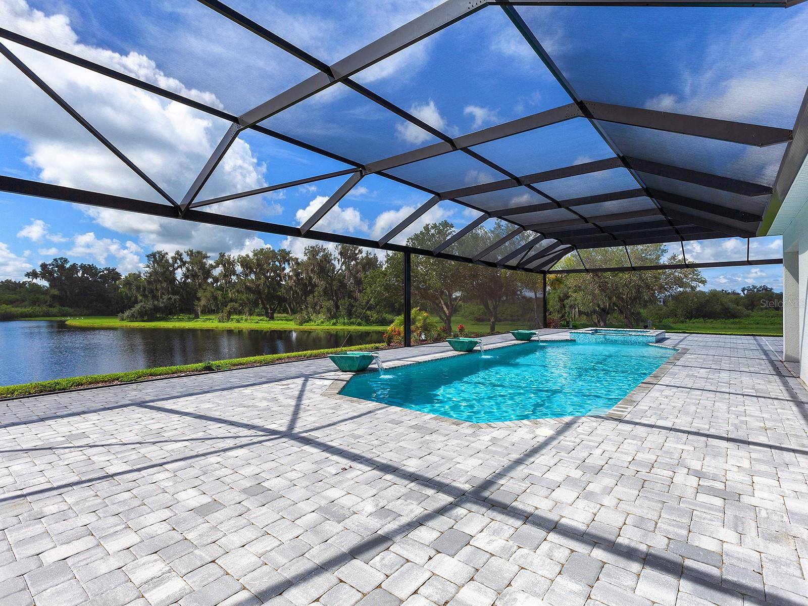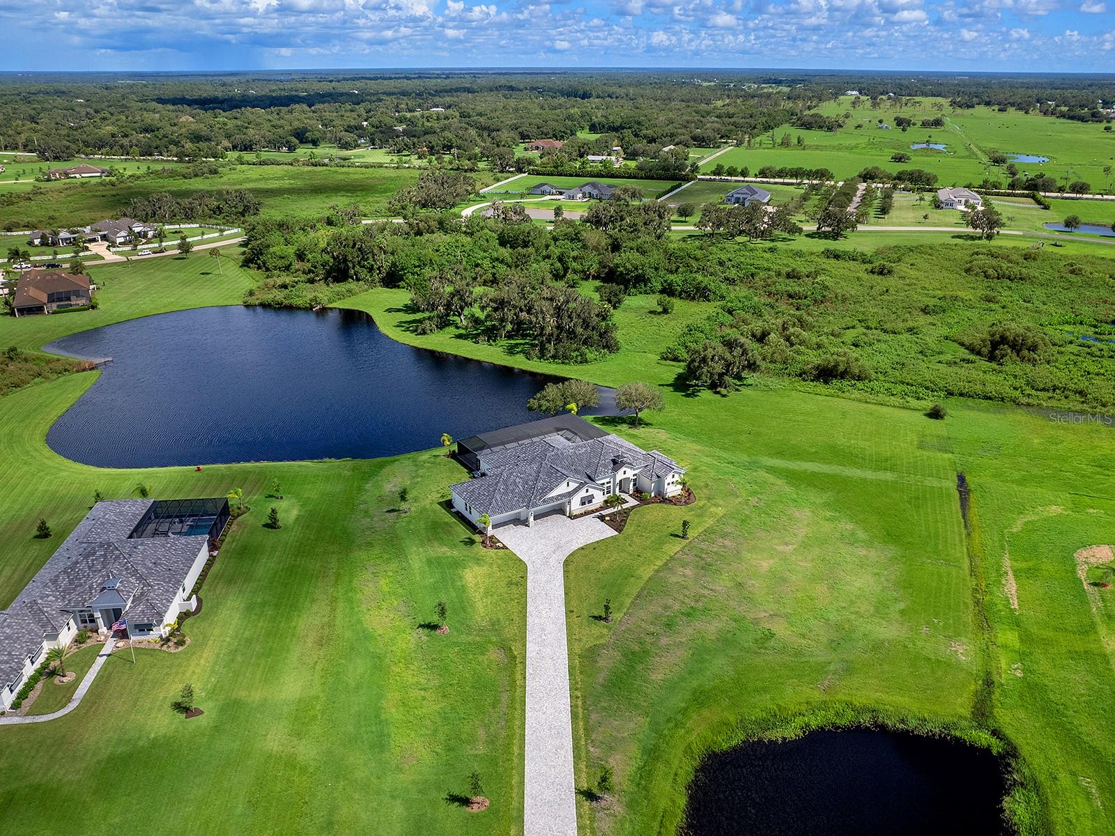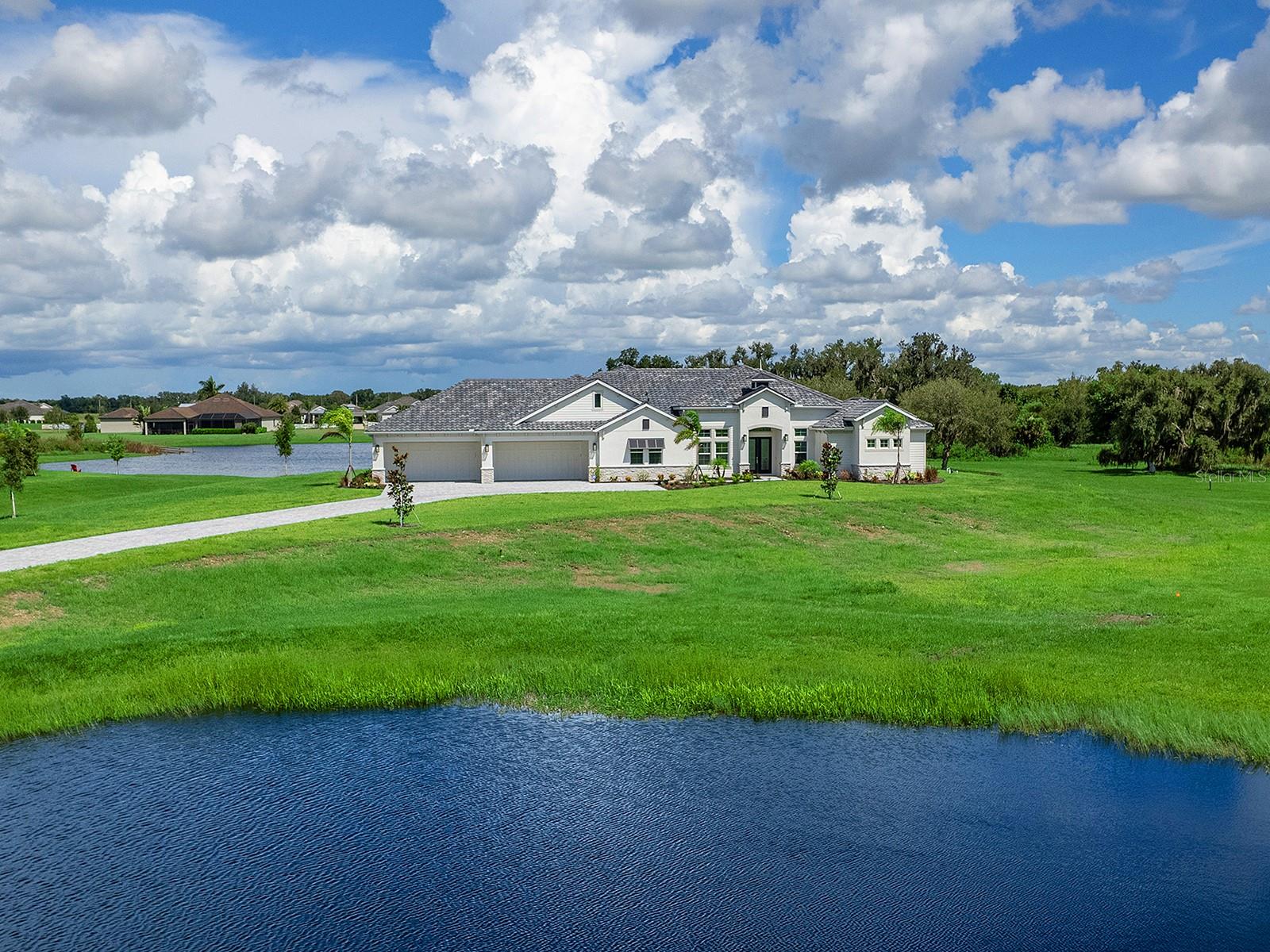PRICE IMPROVEMENT - Loaded with over $800,000 in upgrades and designer options, this newly constructed estate at 3582 Recurve Circle sets a new standard for luxury living in Hampton Lakes. Set on a private 12-acre lot within a secure gated community, this stunning residence combines modern sophistication, exceptional craftsmanship, and serene lake views--all without the need for flood insurance.A grand paver driveway leads to an oversized six-car garage, perfect for the car enthusiast or collector. As you enter through the light-filled foyer with soaring ceilings and tall windows, you're immediately greeted by breathtaking views and an atmosphere of elegance and calm.The expansive great room is the centerpiece of the home, featuring a stone-accented electric fireplace, custom wet bar, and walls of sliding glass doors that open to panoramic lake vistas. The outdoor living area is designed for entertaining, complete with a panoramic screen, self-cleaning saltwater heated pool and spa, and spacious covered lanai for dining or relaxing in total privacy. The gourmet kitchen is a true showpiece, boasting thick Cambria quartz countertops, induction cooktop, under-counter microwave, warming drawer, and adjoining butler's pantry/wet bar with seating and a beverage cooler--perfect for both everyday living and hosting. The primary suite is a luxurious retreat with a spa-inspired bath featuring a jetted tub, large walk-in shower, and dual vanities. The impressive 15' x 18' custom closet includes built-ins and cabinetry, while a morning bar with beverage cooler adds an extra touch of comfort and convenience.Each of the three guest en suites offers generous space, walk-in closets, and private baths for complete privacy. A den/office with French doors provides a quiet setting for work or reading. Modern elegance flows throughout the home, with large-format porcelain tile, impact-rated windows and doors, high-volume tray ceilings with accent lighting, and designer details at every turn.Located just five miles from Waterside Place and Lakewood Ranch, with easy access to downtown Sarasota, this exceptional estate offers the perfect blend of refined country living and contemporary luxury. Experience sophisticated living at its finest at 3582 Recurve Circle in Hampton Lakes. GREAT VALUE AND PRICED BELOW REPRODUCTION.