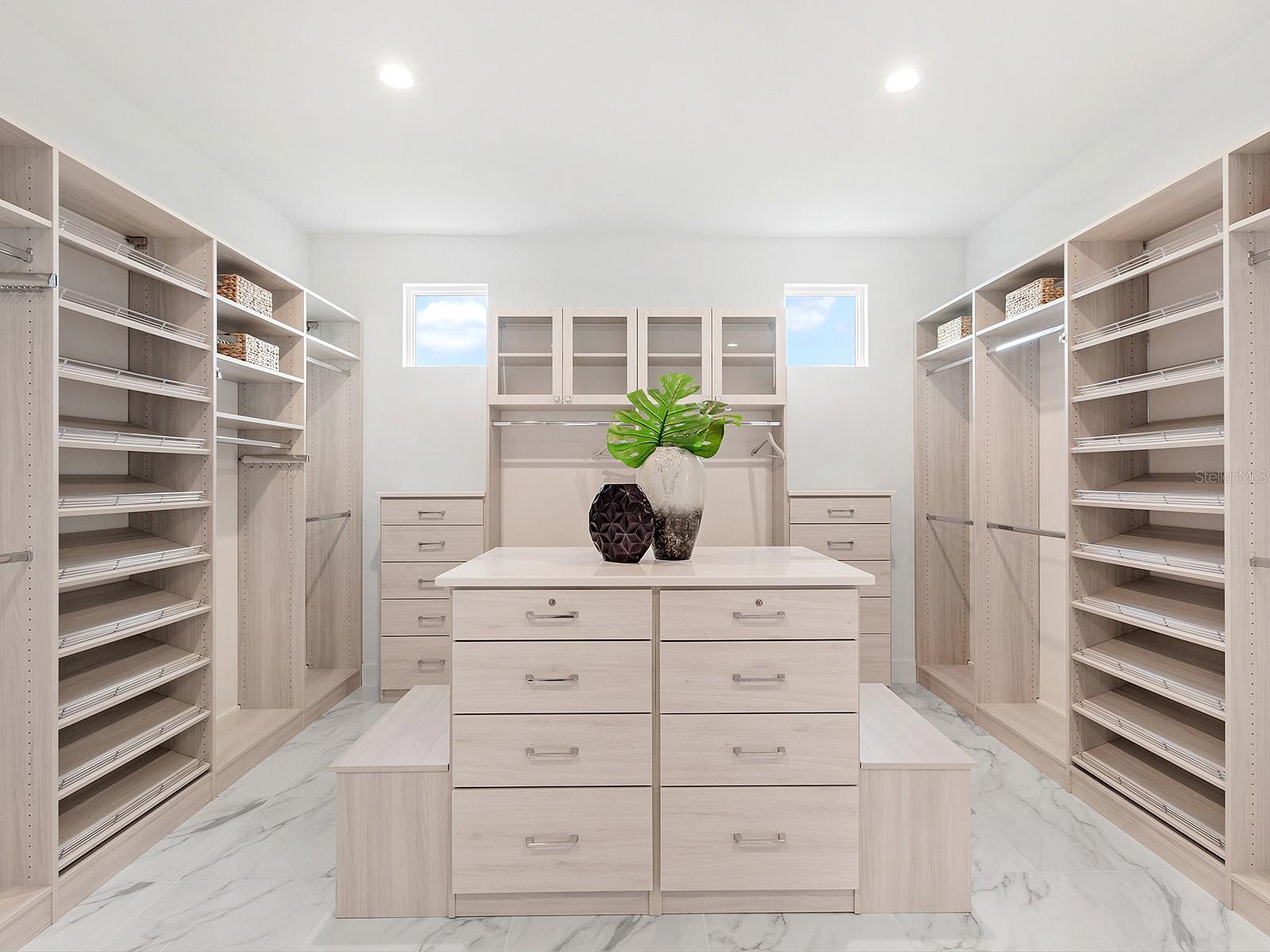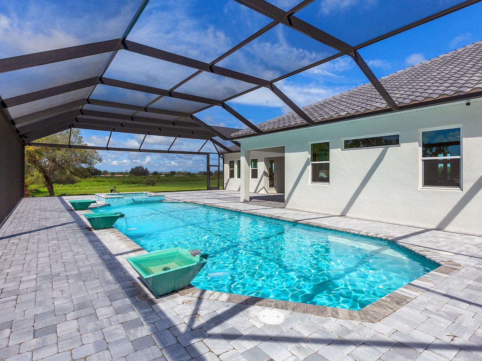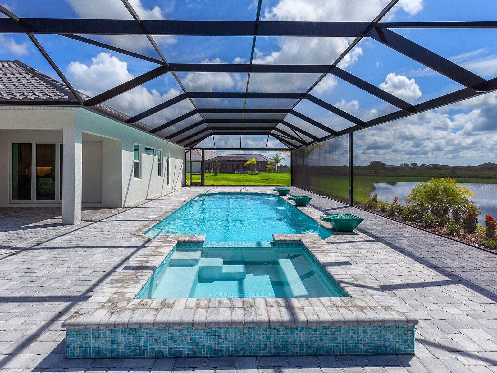 PRICE IMPROVEMENT - Loaded with over $800,000 in upgrades and designer options, this newly constructed estate at 3582 Recurve Circle sets a new standard for luxury living in Hampton Lakes. Set on a private 12-acre lot within a secure gated community, this stunning residence combines modern sophistication, exceptional craftsmanship, and serene lake views--all without the need for flood insurance.A grand paver driveway leads to an oversized six-car garage, perfect for the car enthusiast or collector. As you enter through the light-filled foyer with soaring ceilings and tall windows, you're immediately greeted by breathtaking views and an atmosphere of elegance and calm.The expansive great room is the centerpiece of the home, featuring a stone-accented electric fireplace, custom wet bar, and walls of sliding glass doors that open to panoramic lake vistas. The outdoor living area is designed for entertaining, complete with a panoramic screen, self-cleaning saltwater heated pool and spa, and spacious covered lanai for dining or relaxing in total privacy. The gourmet kitchen is a true showpiece, boasting thick Cambria quartz countertops, induction cooktop, under-counter microwave, warming drawer, and adjoining butler's pantry/wet bar with seating and a beverage cooler--perfect for both everyday living and hosting. The primary suite is a luxurious retreat with a spa-inspired bath featuring a jetted tub, large walk-in shower, and dual vanities. The impressive 15' x 18' custom closet includes built-ins and cabinetry, while a morning bar with beverage cooler adds an extra touch of comfort and convenience.Each of the three guest en suites offers generous space, walk-in closets, and private baths for complete privacy. A den/office with French doors provides a quiet setting for work or reading. Modern elegance flows throughout the home, with large-format porcelain tile, impact-rated windows and doors, high-volume tray ceilings with accent lighting, and designer details at every turn.Located just five miles from Waterside Place and Lakewood Ranch, with easy access to downtown Sarasota, this exceptional estate offers the perfect blend of refined country living and contemporary luxury. Experience sophisticated living at its finest at 3582 Recurve Circle in Hampton Lakes. GREAT VALUE AND PRICED BELOW REPRODUCTION.