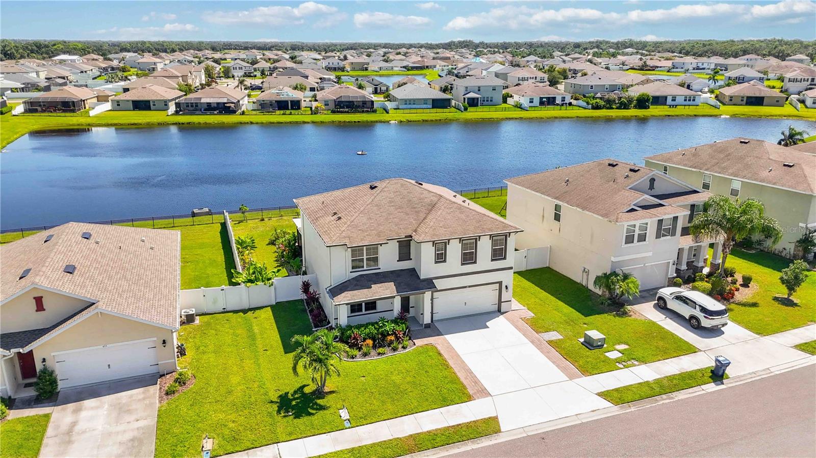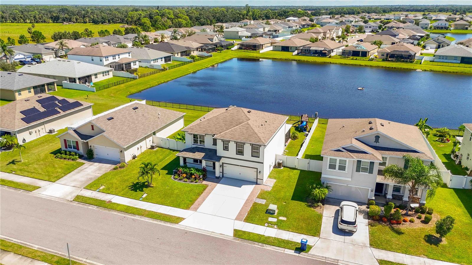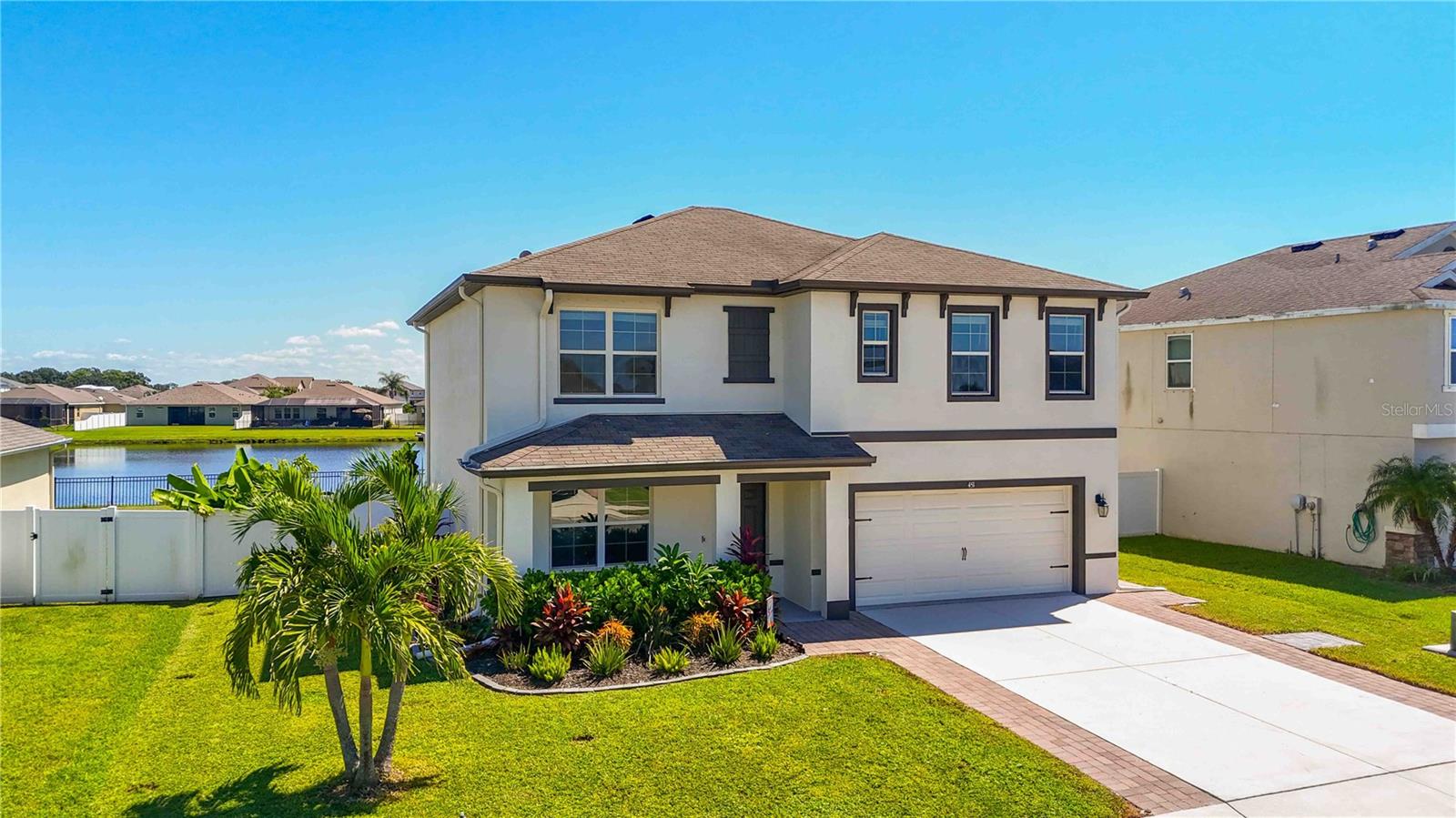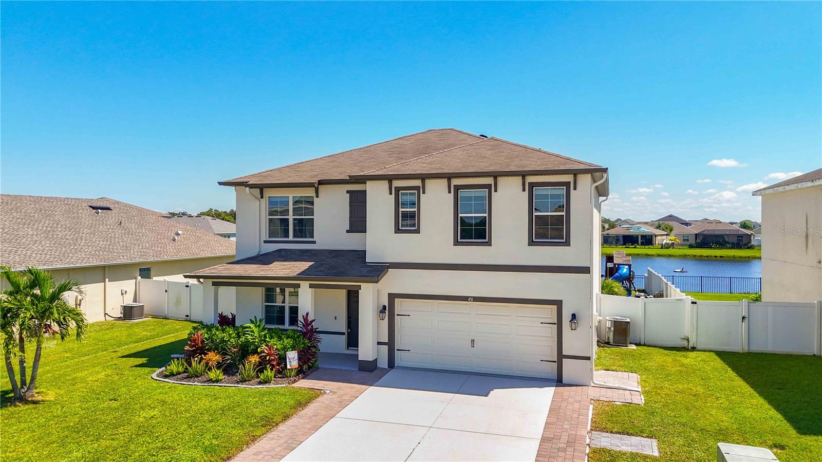 Welcome to your dream home in the peaceful, gated community of Del Tierra, offering NO CDD fees and LOW HOA! This stunning 5-bedroom, 3-bath home features a flex/game room, loft, and open-concept design, all set on a block-on-block construction with a beautiful fountain and large pond view. With over 2,590 sq. ft. of living space and a huge fully fenced backyard, this property is perfect for entertaining or simply relaxing. Enjoy your oversized covered lanai complete with three ceiling fans...while taking in breathtaking Florida sunrises. Recent Updates Include: Fresh interior and exterior paint. New kitchen cabinets and a newer dishwasher. New toilets and exhaust fans in all bathrooms. Hyper filter, and new coils for improved air quality. 30-amp breaker for generator hookup. Inside, you'll be welcomed with style! Crown molding on the first floor with luxury vinyl flooring throughout, NO CARPET, and a thoughtfully designed open kitchen featuring stainless steel appliances, granite countertops, a tile backsplash, and new cabinetry. A flex/game room sits just off the entry, while a guest bedroom and full bath provide convenience on the main level. Upstairs, the oversized master suite boasts dual vanities with granite countertops, a stand-up shower, and two separate walk-in closets. A great-sized laundry room is located on the second floor. Three additional bedrooms, a full bath, and a loft complete the second floor. Outside, you'll appreciate rain gutters, an extended paver driveway for extra parking, and a charming front covered porch, which is the perfect spot to unwind and enjoy spectacular sunsets. Reclaimed water Irrigation on the front and side of the home. Minutes to SR-64, I-75, and Ft. Hamer Bridge. Close to Gene Witt Elementary (bike ride away). Nearby shopping includes Costco and many more! Residents of Del Tierra enjoy access to a resort-style pool, fitness center, and gated entry, all while being surrounded by nature and tranquility. This home offers it all...stylish design, tasteful upgrades, and a prime location. Don't miss your chance to make it yours!