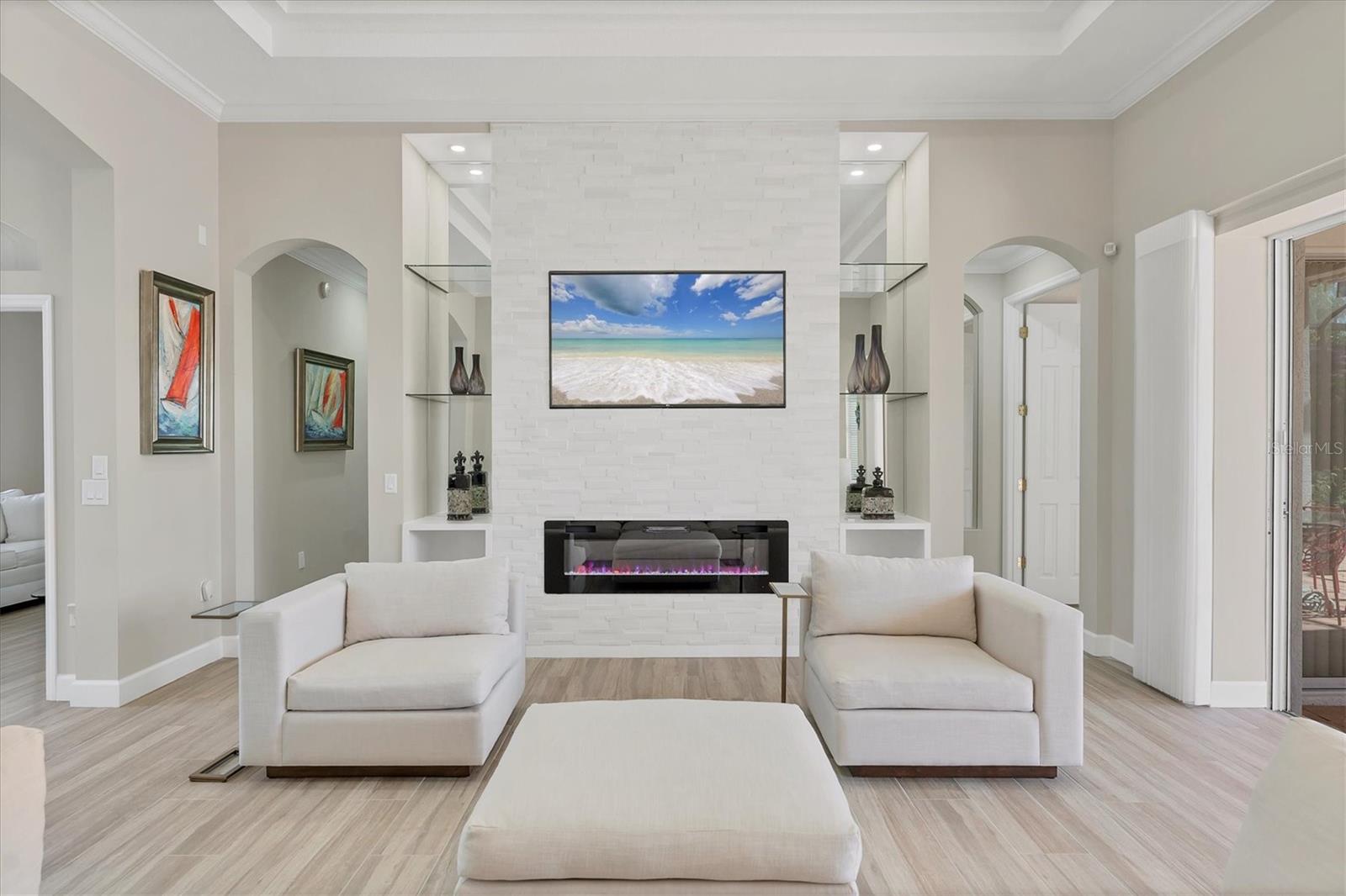 Homeowner invested over $200,000 in updates: ROOF, Entire Interior & Exterior, Pool and Equipment, Water Heater and more. Experience true luxury at an exceptional value. The current homeowner has invested extensively in the full renovation of this residence, creating a home that blends sophistication, comfort, and modern functionality.Step inside and imagine yourself relaxing by the magnificent marble fireplace that stretches from floor to ceiling, featuring an electric insert where you can customize your flame color to suit the mood. Love to cook gourmet meals with a glass of wine in hand? You'll be delighted by the brand-new chef's kitchen--equipped with Caf appliances, quartz countertops, a farmhouse sink, and a touchless faucet.The entire home showcases elegant new tile flooring and fresh interior paint, offering easy maintenance and a move-in-ready appeal.The primary suite is a delightful surprise--spacious and luxurious, featuring two custom walk-in closets designed by one of the most reputable firms in town. The primary bathroom is a masterpiece: dual custom vanities, an oversized walk-in shower with Moen fixtures, and a striking blue glass accent window that serves as art in itself.The guest bedroom includes a custom closet and a full bathroom adorned with a designer vanity, Moen fixtures, imported wallpaper from Switzerland, and a chic glass-enclosed shower. A third room, currently used as a den or home office, can easily be converted back into a bedroom with space for a full walk-in closet.The lanai is your private sanctuary--boasting a tongue-and-groove ceiling, stylish awning for shade, and a paved area spacious enough for multiple lounge chairs and a large 60-inch dining table with seating for six. Entertaining is effortless with a dedicated grilling area overlooking the sparkling pool and spa, the perfect retreat for relaxation.Lush, manicured landscaping frames this beautiful property, a true reflection of the owner's care and attention to detail. Every element was thoughtfully curated to transform this house into a warm, elegant home.