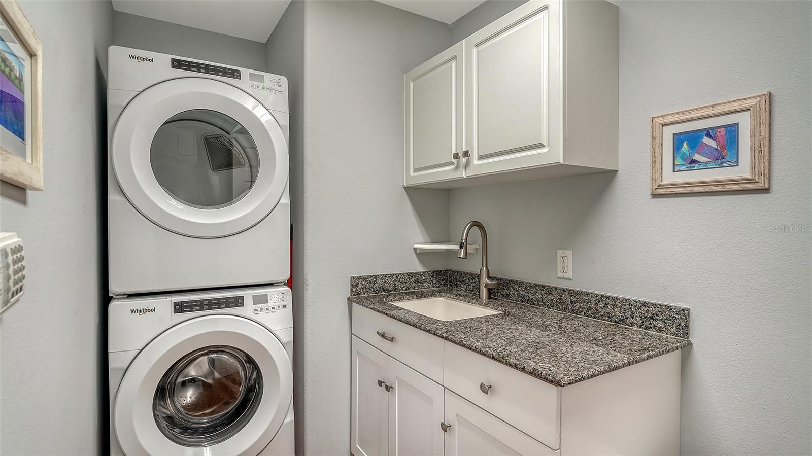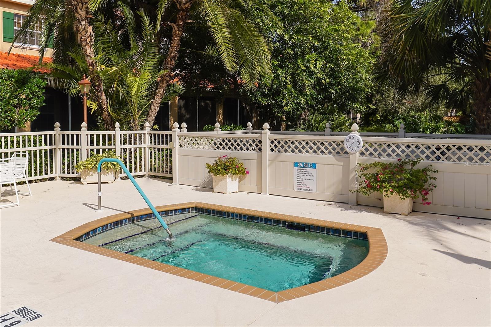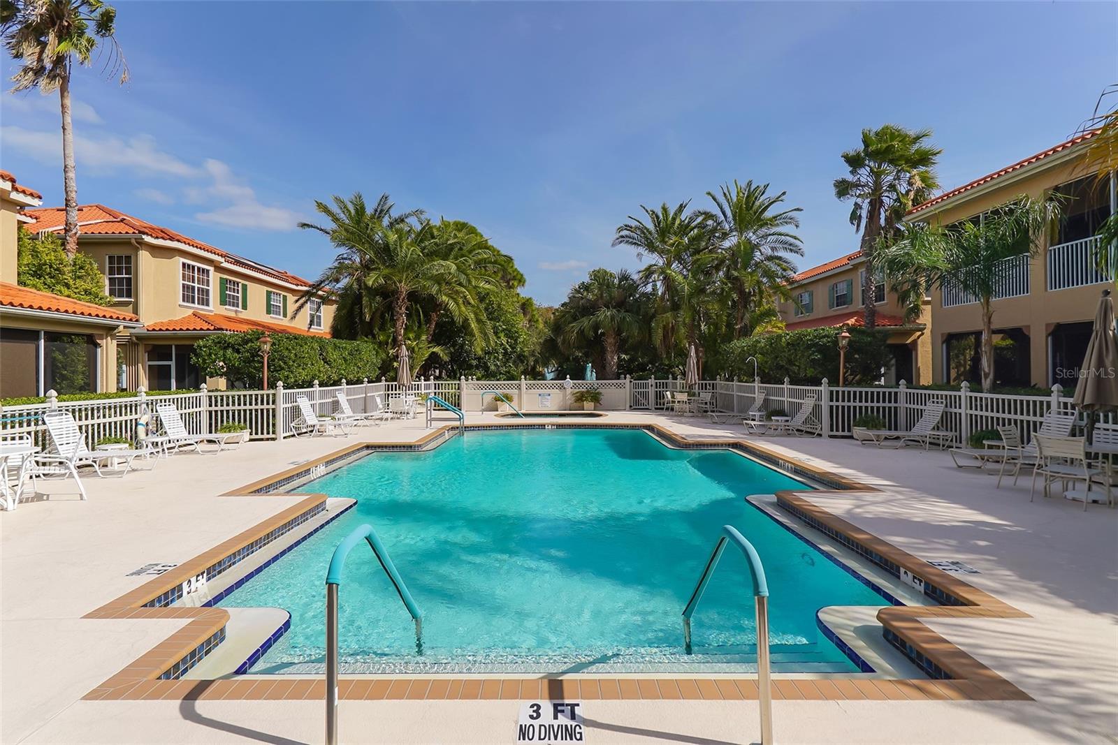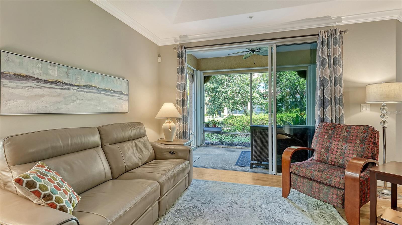 Tropical paradise awaits you. This fabulous, elegant 3BR/2BA 2 car garage first floor unit is fabulous. The beautiful kitchen offers quartz counters, wood cabinets with wood pull outs, snack bar, eat-in area, pantry closet top of the line appliances & canned lighting. Boasting crown moldings, tray ceilings, wood and tile flooring, central vac, huge primary bedroom closet, ship lap accent wall in 2nd Bathroom. Partially furnished, most furniture in Living room, artwork, dining room set, bedroom furniture plus 2 Murphy beds located in bedroom 2 & 3, which create space and storage. Hurricane shutters and impact windows. The spacious Living room and Dining room overlook the huge lanai, then a private oasis including pond with fountain and lush landscaping. The primary bedroom has a coffered ceiling. The primary bath offers a separate soaking tub & shower, plus dual sinks. The barrel tile roof was replaced in 2023 (which is a condominium responsibility). A/C is 4 years young, water heater replaced in 2019. This is not an age restricted community, very friendly 29 units, community pool, spa and pavilion. 2 pets are allowed dog or cats up to 30 lbs. You can't beat this terrific location right across from Costco, JC Penny, Legacy trail, near the YMCA and just minutes to Siesta Key Beach. See it Today.