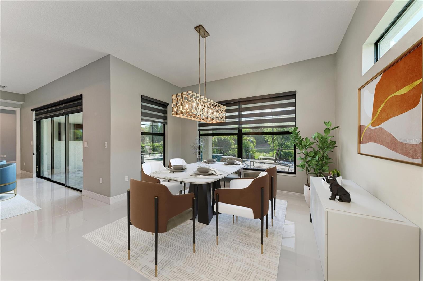 Imagine waking up each morning to the soft sounds of nature -- coffee in hand, sitting beneath the covered lanai as sunlight dances off the waterfall spilling into your private pool. The only thing more serene than the view is knowing that everything -- from the lawn to the high-speed internet -- is already taken care of. This is the effortless Florida lifestyle waiting for you in Cresswind, Lakewood Ranch's premier 55+ resort community.Step through custom glass entry doors into a light-filled home that strikes the perfect balance between elegant design and everyday comfort. The open-concept great room welcomes you with soaring tray ceilings, designer lighting, and a stunning custom-built entertainment wall featuring a 6-foot linear electric fireplace flanked by dual bookshelves. A wall-mounted TV (included) creates a ready-to-enjoy gathering space that seamlessly connects to the chef-inspired kitchen -- complete with quartz countertops, graphite cabinetry, a beverage cooler, upgraded pantry, and built-in appliances.The primary suite offers a tranquil retreat overlooking the pool, with a spa-like bath featuring a walk-in shower with bench, dual raised vanities, and a spacious custom closet. Two additional guest bedrooms and a private den provide flexibility for visiting family, hobbies, or a home office (with a wall-mounted TV included). Every inch of this home is curated with thoughtful detail -- from designer fans and window treatments to brass-trim floor outlets and upgraded plumbing fixtures.Outside, your personal oasis awaits. A 12'x24 lighted pool with waterfall anchors the expanded lanai, where motorized hurricane screens offer instant protection and privacy. The outdoor TV (included) and under-roof living space make it ideal for entertaining year-round. Beyond the lanai, lush 360 landscaping and paver driveway set the tone for timeless curb appeal -- all maintained by the HOA.Even the garage impresses with an epoxy floor, insulated door, backup opener, steel storage racks and cabinets -- perfect for your Florida lifestyle essentials.As a resident of Cresswind at Lakewood Ranch, you'll enjoy access to a vibrant active-adult community designed for connection and wellness: resort-style and resistance pools, tennis and pickleball courts, fitness center, walking trails, arts studio, dog parks, food truck nights, and a full-time lifestyle director. All just minutes from the shopping, dining, and beaches that make Lakewood Ranch the #1 multi-generational community in the U.S.Why wait to start living your best Florida life? This home is the perfect blend of sophistication, low-maintenance living, and resort-level amenities -- ready for you to move in and start making memories today. Home is virtually staged.