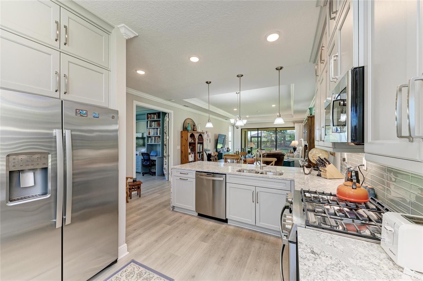 Presenting the "Lido" model located in the premier 55+ amenity packed community of Cresswind, a true Lakewood Ranch gem. This home is simply gorgeous and allows for beautiful natural light to stream in. This smart floor plan features 2 nice sized bedrooms AND a den/office.. the beautiful chef's kitchen comes with thick quartz countertops, Upgraded GE appliances, soft close drawers, a natural gas stove with double ovens, pendant lighting, contemporary glass tile backspash and soft grey cabinets that reach the ceiling. The quartz waterfall countertop upgrade, easy access pantry and the plantation shutters are an added bonus to this smartly designed space. Move in ready ! Quality finishes at every turn.. nice fans, window treatments and light fixtures are already in place along with an upgraded 220 V outlet in the extended garage to charge your vehicle. A tankless hot water heater, pre plumb for a water softener and an epoxied floor round out the functional garage. You will find a distinctive curb appeal here with an extensive use of brick pavers, a stunning leaded glass front door ,brushed nickel door hardware and lush tropical landscaping. Screened in lanai and a berm homesite allow for privacy and a large pet friendly yard. Cresswind Lakewood Ranch by Kolter Homes is a gated, active adult village located in sunny Lakewood Ranch Florida, the #1 multi-generational community in the nation. Cresswind features a community vibe and homes designed for today's active adults, an award-winning lifestyle program, resident-only amenities and wide walkways. This pet-friendly community features a lakeside clubhouse overseen by a full-time lifestyle director with multi-purpose event and social spaces, Cresswind SmartFIT Training Center powered by EGYM, yoga studio, art studio with ceramics, game rooms, and various optional social clubs. Outdoor amenities include 6 pickleball courts & 2 tennis courts, 2 bocce courts, a popular dog park, resistance & resort-style pools, a spa, sundeck, event plaza with numerous food trucks and more. The reasonable monthly fee includes yard maintenance, mowing and trimming, irrigation, cable and internet. This is a fantastic opportunity and we look forward to your showing.