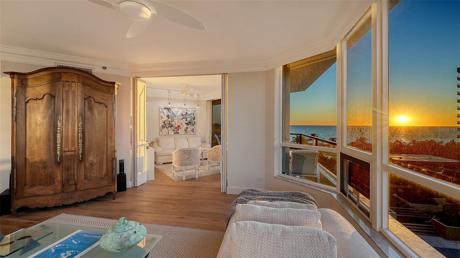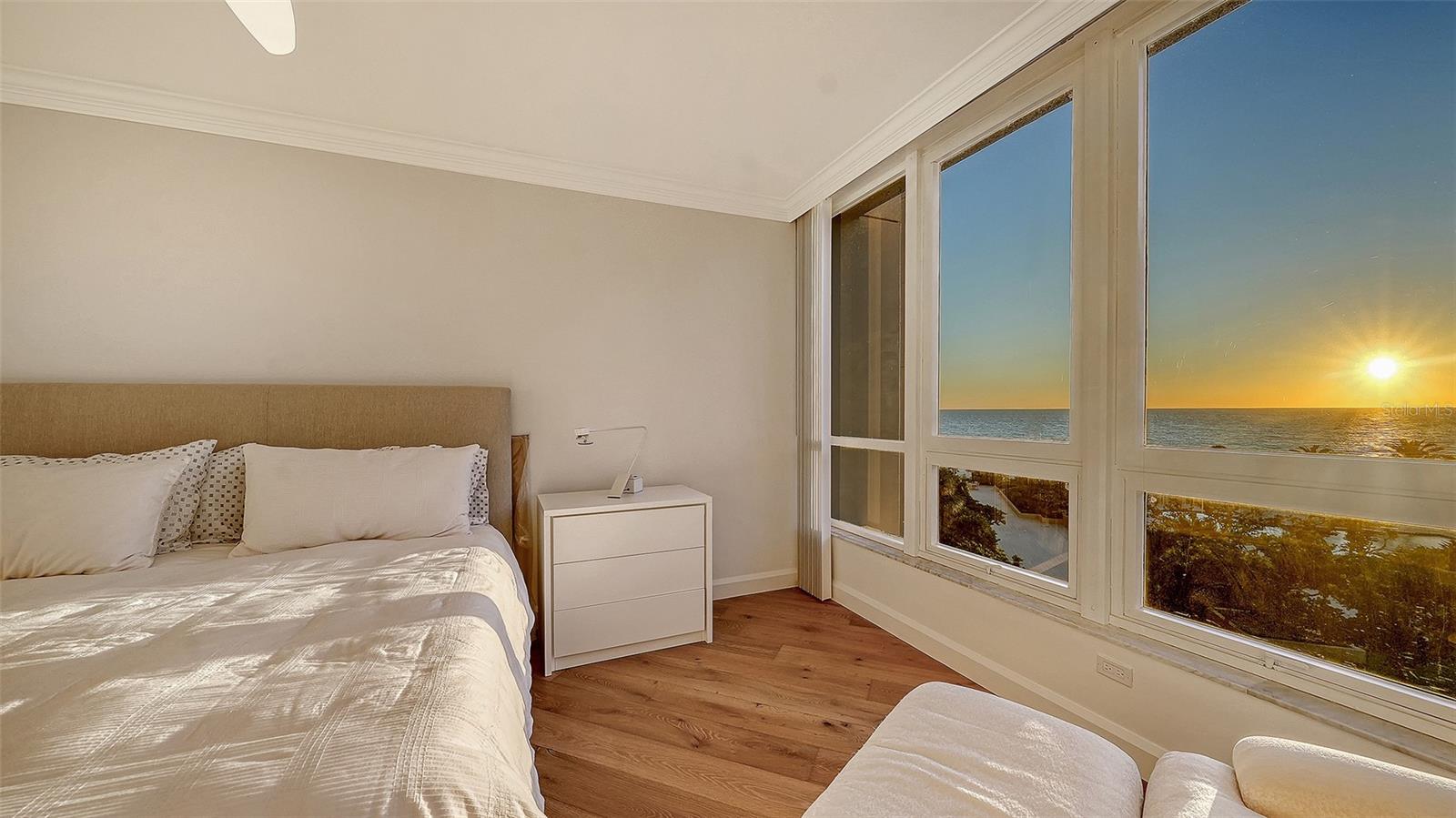 Rarely available north-side corner residence at The Promenade showcases panoramic views of the Gulf of Mexico, Sarasota Bay, white sandy beaches, and the sparkling city skyline. This beautifully designed 2,100 sq. ft. "E" floor plan features three bedrooms and three baths, with a spacious split layout that captures natural light and breathtaking vistas from every room. The expansive living and dining areas flow seamlessly to two private terraces--set your morning coffee down as you watch the sunrise over the bay, and end the day with a glass of wine while taking in the sunset over the Gulf. A stylish wet bar adds the perfect touch for entertaining. The kitchen is a showpiece, featuring 2022 installed Sub Zero refrigerator/freezer, GE Monogram stainless-steel induction cooktop and oven, ASCO dishwasher and GE Monogram microwave / convection oven combo, a white subway tile backsplash, quartz countertops, sleek contemporary white cabinetry, and an eat-in area overlooking the bay. Engineered white oak hardwood floors extend throughout, adding warmth and sophistication. The primary suite offers stunning Gulf views, built-in cabinetry, and two walk-in closets, while the guest suite enjoys downtown views and a private bath. The third bedroom/den opens to a terrace overlooking the Gulf. Includes one deeded parking space and access to resort-style amenities--concierge, 24-hour security, fitness center, an Olympic-size heated pool, four Har-Tru tennis courts, and more.