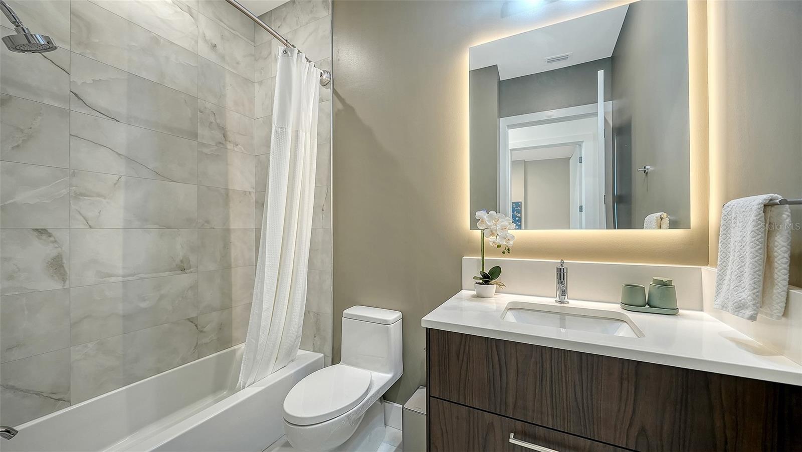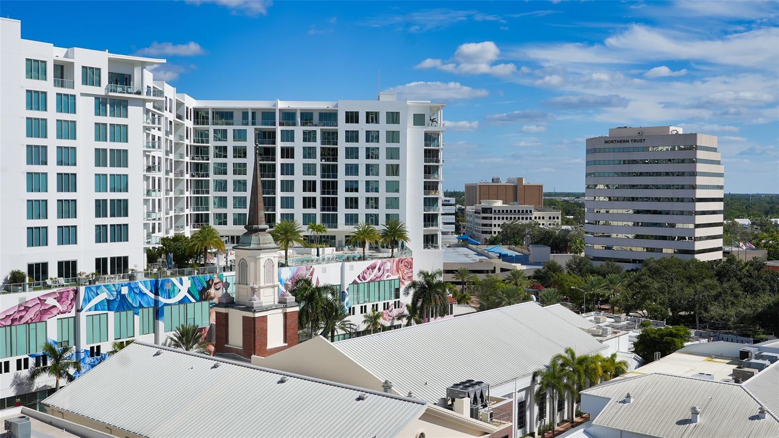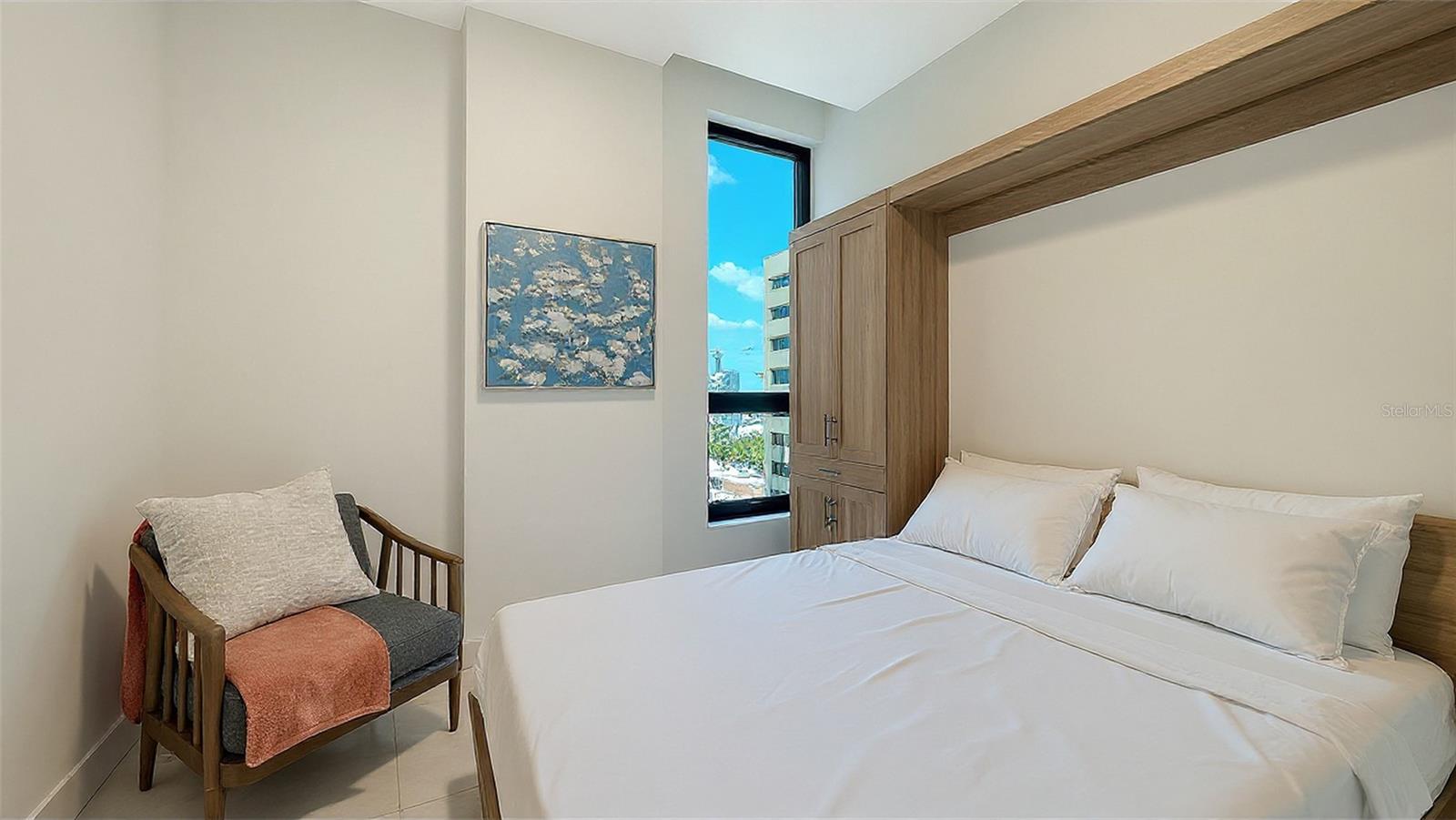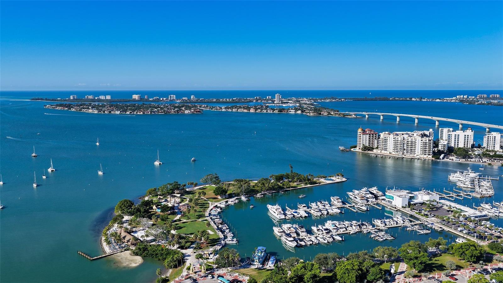 Impeccably maintained and exquisitely appointed, this corner residence embodies modern chic in Sarasota's most sought-after downtown location. Built in 2024 and defining contemporary urban living, this impeccably maintained 2-bedroom, 2-bath, 1,337 sq. ft. home reflects curated luxury. The open floorplan showcases Italian custom cabinetry, Miele appliances with a gas cooktop, and upgraded quartz countertops with a full backsplash and waterfall island. Sleek porcelain tile flooring flows throughout, while custom lighting, designer paint, and a striking fireplace with feature wall create an ambiance of understated glamour. Both bedrooms offer custom-built closets, with a Murphy bed in the second for versatile use. Automated electric blinds and custom drapery pockets enhance the clean, contemporary aesthetic. Home is complete with a temperature-controlled storage locker and a terrace that is wired for an electric barbecue. Residents of this exclusive boutique building enjoy 24-hour staffed service and access to a spectacular rooftop amenity level, featuring an elegant club room, fitness center, and saltwater pool -- all framed by sweeping views of the city skyline and Sarasota Bay. The result is a tranquil retreat above the vibrant downtown scene, offering the perfect balance of sophistication, comfort, and cosmopolitan energy.