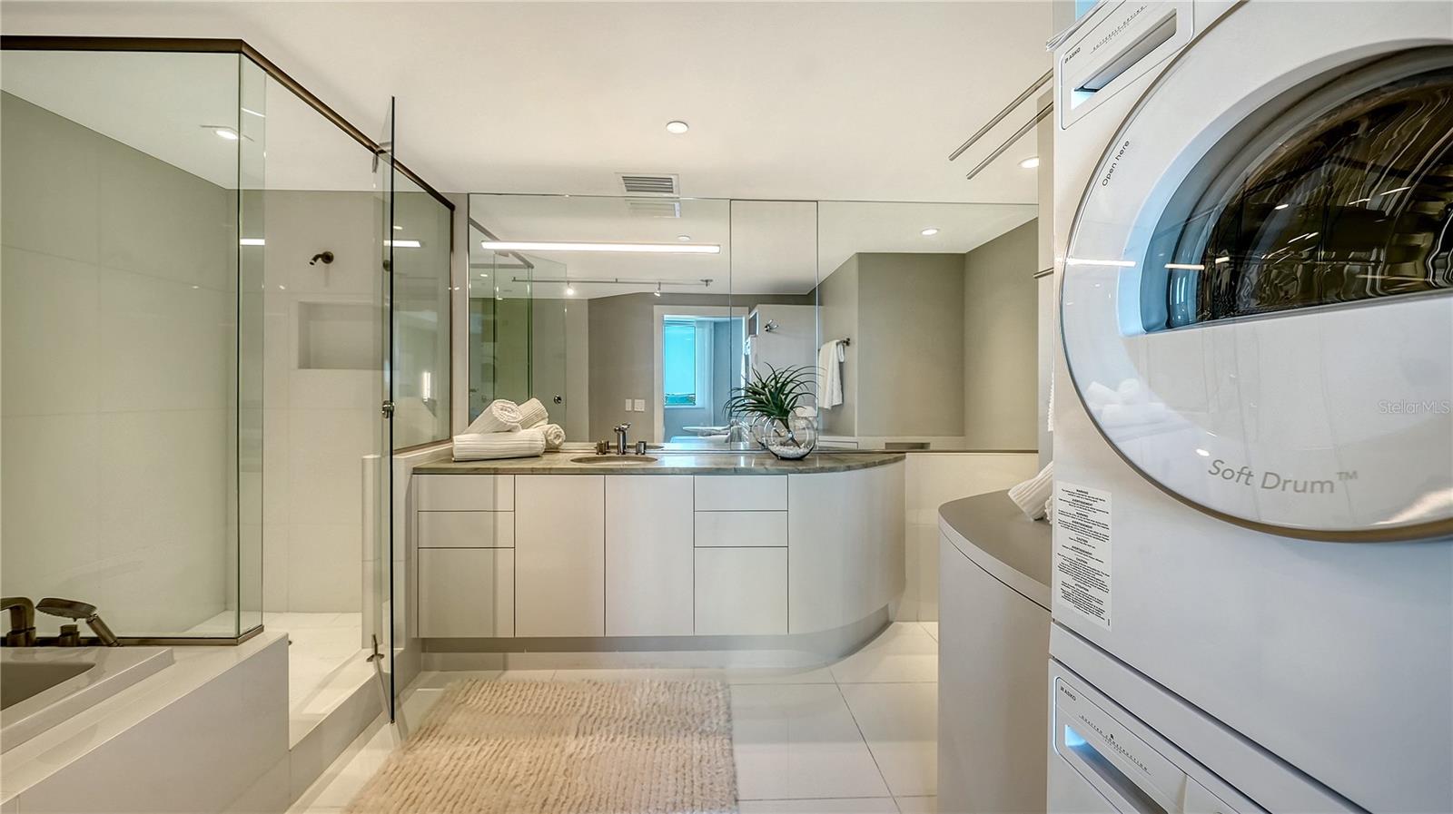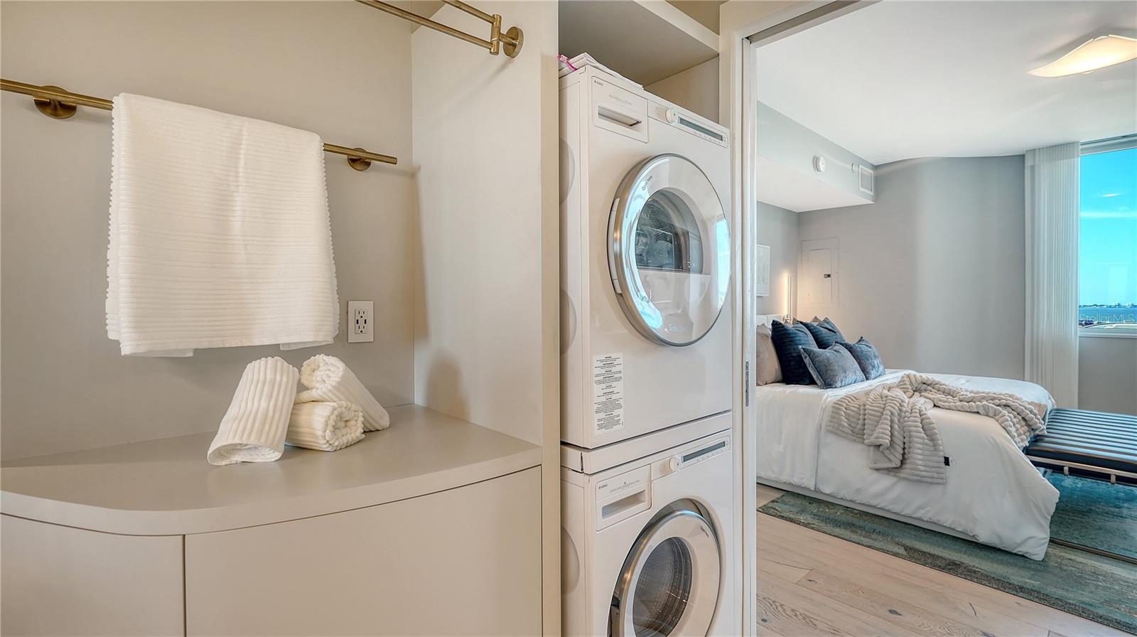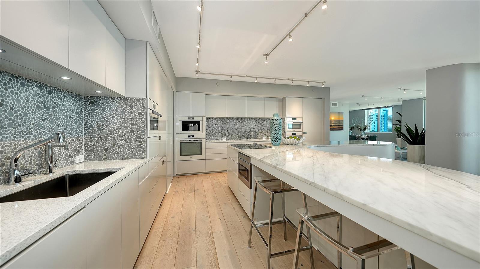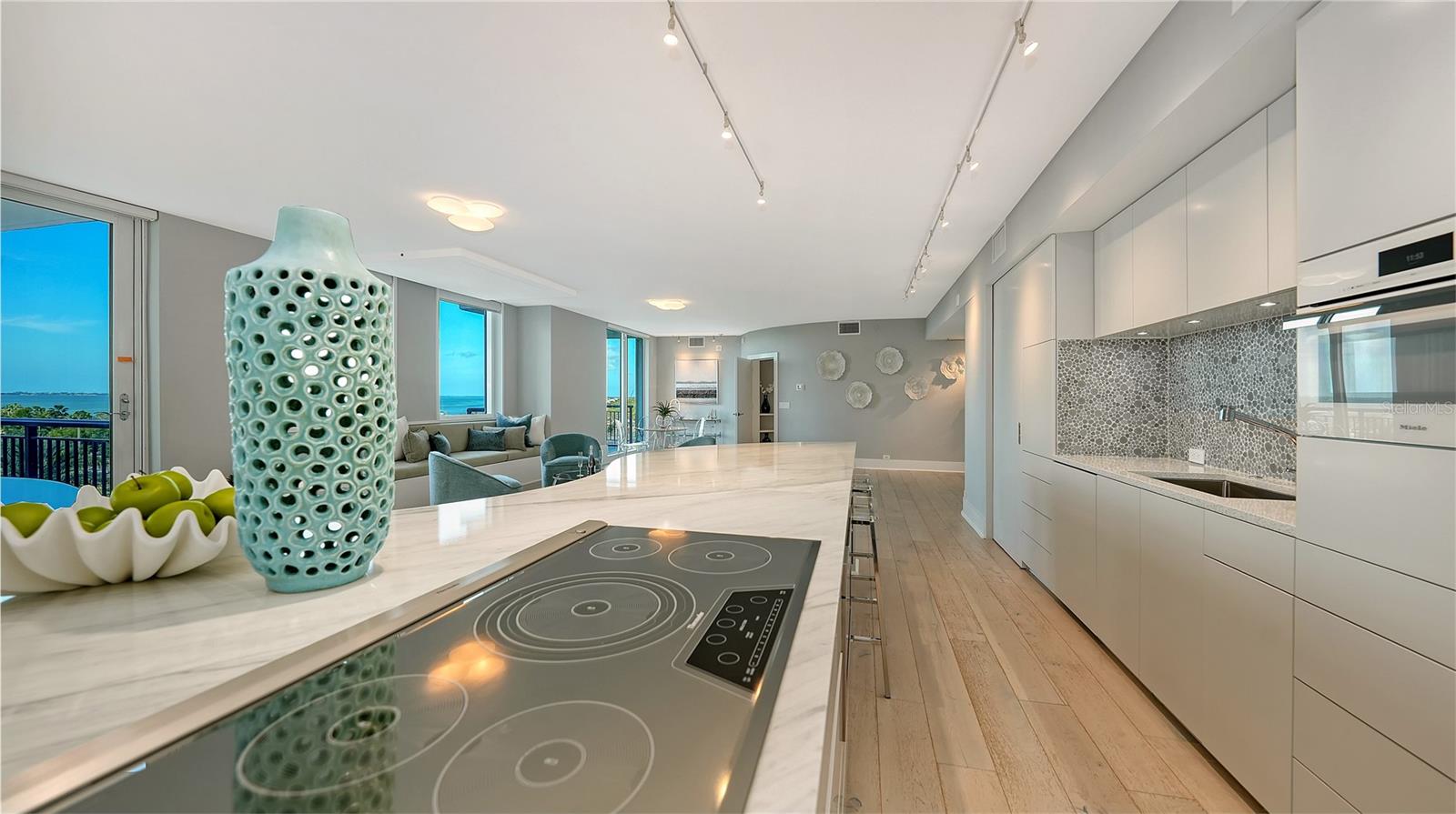 Experience panoramic Sarasota Bay and skyline views from this one-of-a-kind fifth-floor, double residence at Alinari, located in the heart of the vibrant Rosemary District. Thoughtfully combined and completely re-imagined during a major 2014 renovation, this expansive three-bedroom layout offers nearly 3,000 square feet of refined living space with multiple terraces capturing sunrise, sunset, and twinkling city lights.A private foyer opens to a light-filled interior featuring gorgeous hardwood flooring, modern architectural detailing, and oversized impact-rated windows and sliders that frame sweeping vistas from almost every room. The open living and dining areas flow effortlessly into a second family/dining room, creating an ideal environment for entertaining or quiet relaxation.At the center of the design is a modern chef's kitchen appointed with premium Miele appliances--including a built-in coffee system--Thermador cooktop, multiple built-in ovens and microwaves, sleek cabinetry, and a curved Carrara marble island with breakfast bar seating. The kitchen's placement ensures connectivity to both gathering areas and the expansive views beyond.The secluded primary suite offers sunny exposures, a large walk-in closet, and a spa-inspired bath with stone counters, custom built-ins, and its own dedicated laundry. Two additional guest suites are thoughtfully positioned for privacy, each featuring en-suite baths, separate laundry facilities, and an adjacent den that can serve as an office, fitness room, or media space.Additional highlights include multiple terrace spaces, three coveted under-building parking spaces, plus two climate-controlled storage units.Residents of Alinari enjoy a long list of amenities, including on-site management, a stylish club room, tearoom, business center, conference rooms, library, wine room with optional owner wine lockers, theater, and a comprehensive fitness center with sauna, aerobics room, and men's/women's locker rooms. Outdoor amenities include a grilling area, resort-style swimming pool with sundeck and cabanas, and a heated spa. Guest suites are available to owners on a first-come basis for visiting friends and family.Set within Sarasota's coveted Rosemary District, Alinari places you moments from the Van Wezel Performing Arts Hall, The Bay Park, downtown restaurants, boutique shopping, the Farmers Market, the emerging waterfront redevelopment, and the cultural energy that defines Sarasota. Lido Beach, St. Armands Circle, and Marina Jack are just a short drive away, offering world-class recreation and dining.This exceptional residence combines scale, location, and unobstructed views--an extraordinary downtown offering with the space and livability of a single-family home in one of Sarasota's most dynamic neighborhoods.