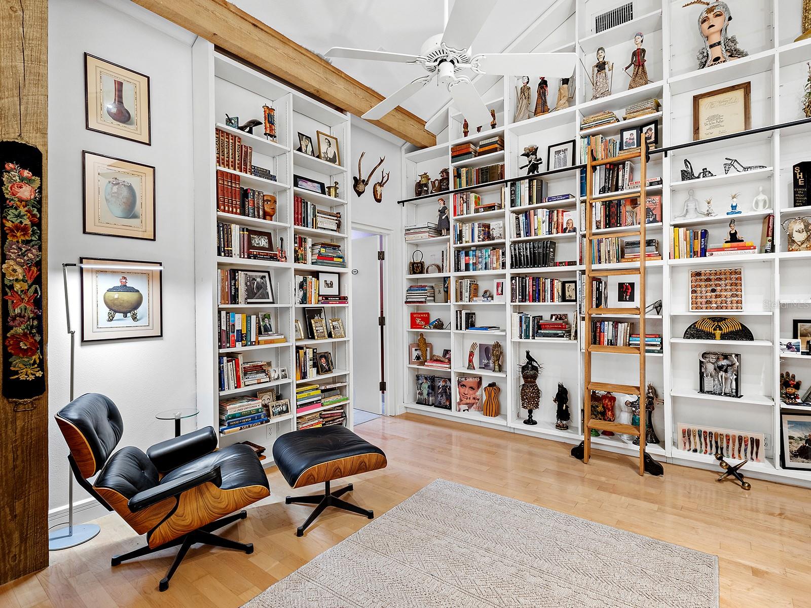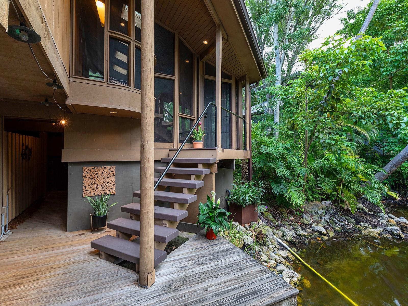 Welcome to Storybook -- a treetop sanctuary where architecture, nature, and artistry meet! Tucked away in Arlington park at the end of a private canopied road and surrounded by native Florida landscaping and protected wetlands, this extraordinary 3-bedroom, 4-bathroom residence with a custom library/den feels like a hidden world all its own.Designed by renowned Sarasota architect Richard G. Allen, known for his sustainable and expressive style, Storybook lives up to its name -- enchanting, serene, and timeless. Soaring ceilings, exposed wood beams, and maple floors create a warm, open-concept living space that flows effortlessly to the outdoors. Clerestory windows invite natural light, while the wraparound screened porch and treetop pool immerse you in the surrounding canopy.A spiral staircase ascends to a light filled loft offering both inspiration and a tranquil retreat above it all. This home's heart resides in a custom library/den, a quiet sanctuary where books, ideas, and conversation gather. Beyond the cozy den lies an en suite bedroom, a serene sanctuary inspired by Zen simplicity. Sliding glass doors open to the wraparound patio, a haven for morning coffee and quiet reflection. On the same floor, a second primary suite welcomes you through an intricately hand carved door. Inside, an expansive bedroom and private sitting area rests quietly among the treetops, wrapped in peaceful seclusion.The ground floor includes a private guest suite, spacious laundry, ample storage, and an oversized two-car garage ,and EV charging station.From the hand-carved Tibetan gates to the tranquil pond and water feature, every detail of Storybook reflects a reverence for Sarasota's natural beauty and a deep sense of peace and privacy. This is more than a home -- it's a place to breathe, reflect, and feel fully connected to the world around you.