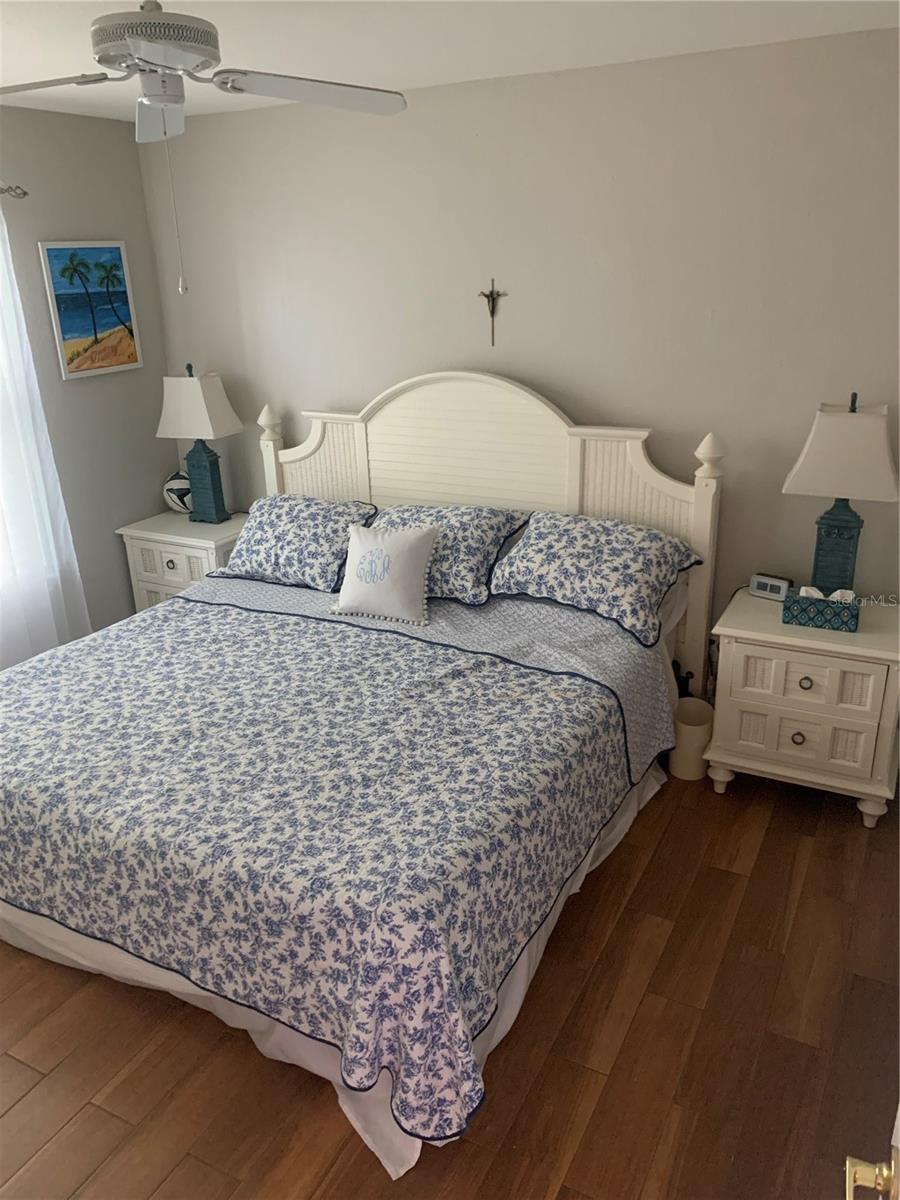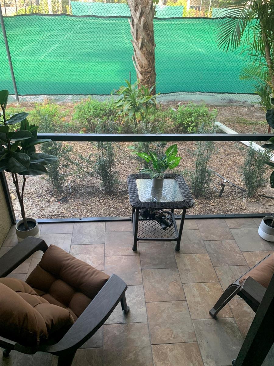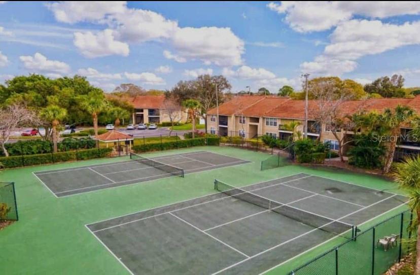 Two bedroom ground floor condo with screened lanai overlooking tennis courts. Updates include matching quartz countertops, walk-in shower in the primary bedroom. Storage room off lanai. Vintage Grand community offers two pools, spa , tennis courts, fitness center and clubhouse. View of bird sanctuary from kitchen window. Walking distance to Costco and Publix. The building has updated stucco, the roof was replaced and strengthened in 2024 for category 3 hurricane and new impact windows were replaced in 2022.