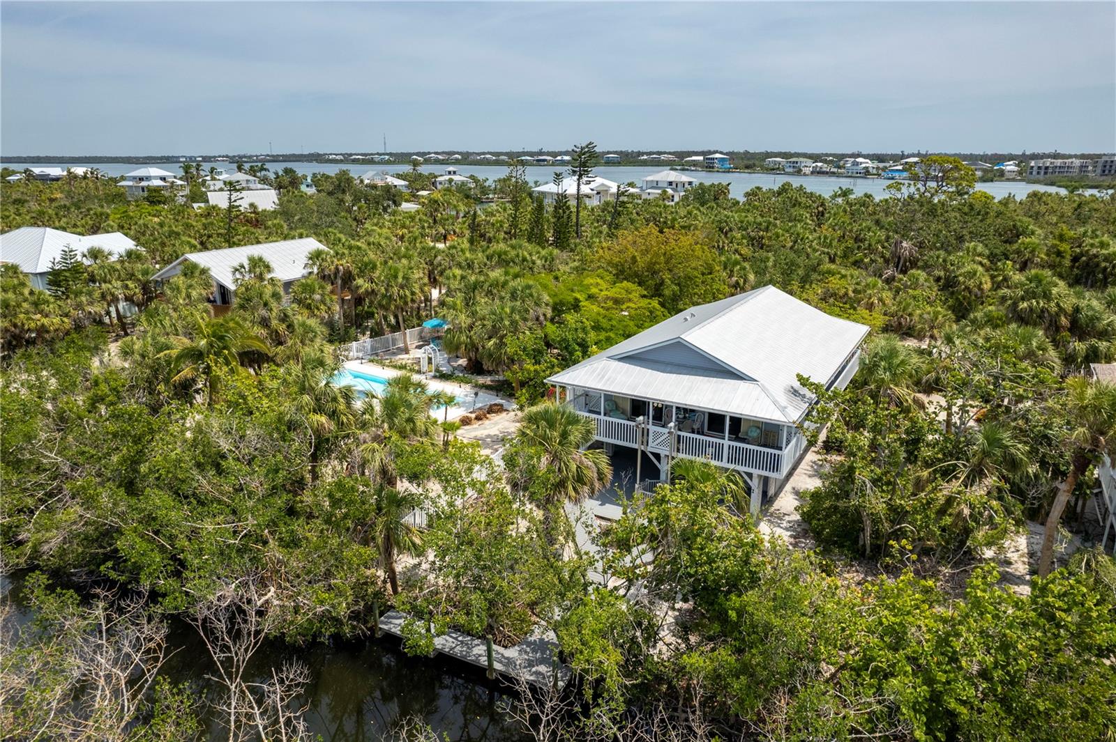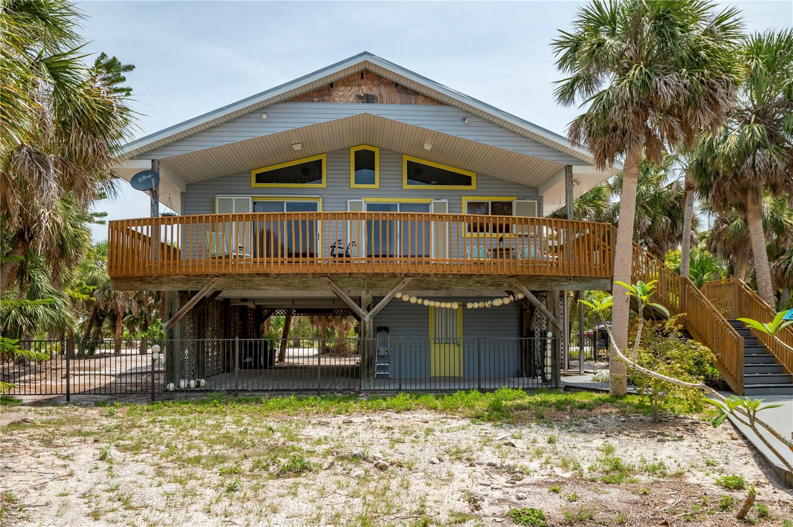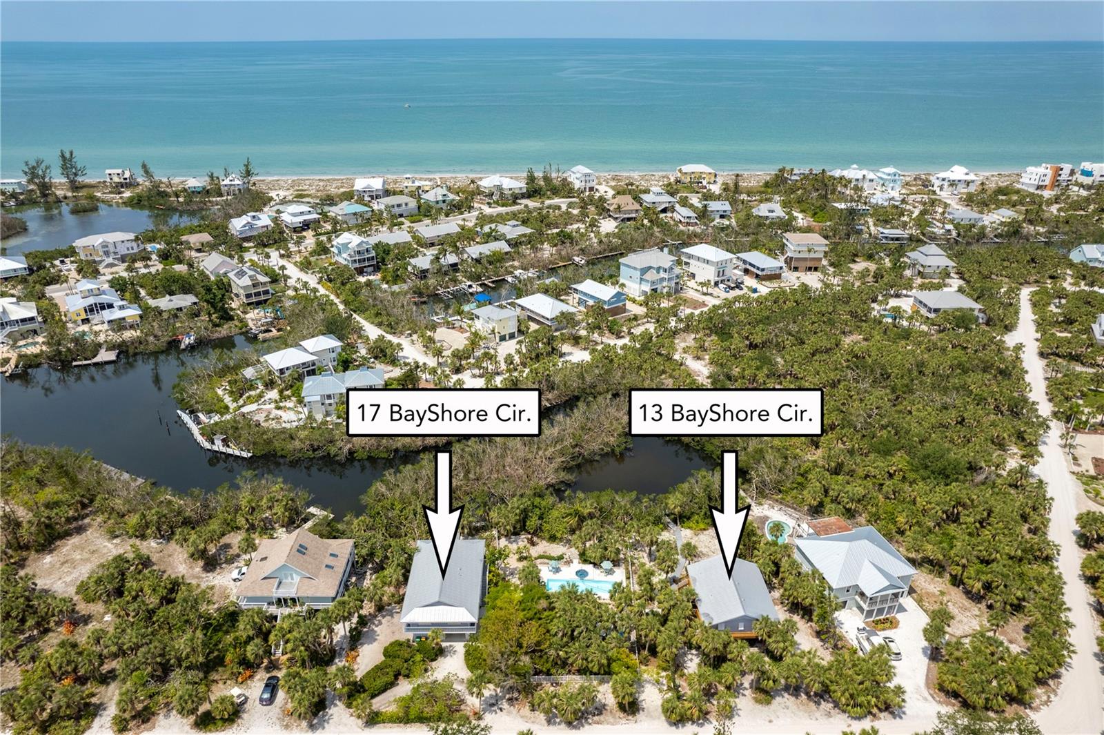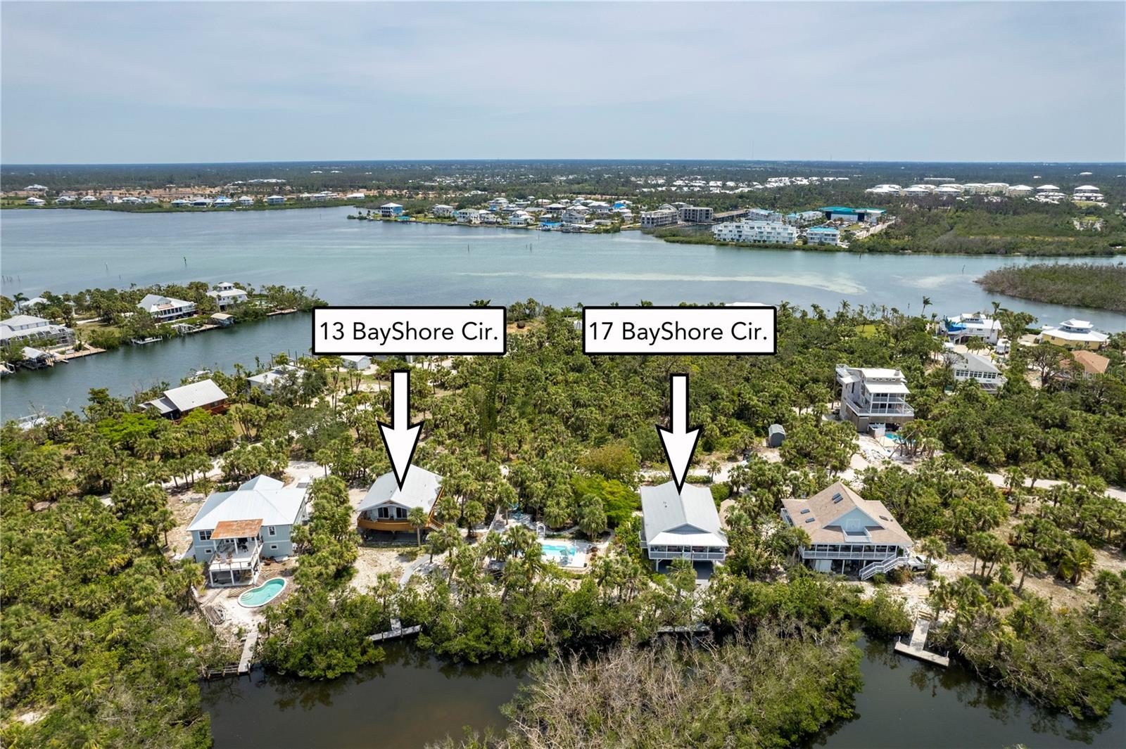 BEST OF BOTH WORLDS-BAYFRONT AND BEACH ACCESS! UNIQUE TROPICAL RETREAT ON 3 LOTS ON PALM ISLAND! 2 charming Key West style homes with shared pool on center lot located MERE minutes from the Intracoastal Waterway leading to the Gulf of Mexico! Together the properties offer 240 ft of waterfrontage with large dock (boat lift ready). 12' x 40' pool and spa are located on the center lot with paver deck and plenty of room to soak up the sun and enjoy amazing sunsets. Properties are surrounded by lush tropical landscaping giving you a private oasis and both have wrap-around decks to enjoy peaceful views in every direction. Listing details are the features and measurements for 17 Bayshore Circle. This beautiful home features 3 bedrooms, 2 baths, great room plan with high cedar ceilings and fireplace, casual dining area plus spacious kitchen with stainless appliances and breakfast bar. Bedrooms offer vaulted ceilings and plenty of closet space. Convenient outside lift to 2nd floor kitchen and 15' x 18' air-conditioned storage unit on ground floor. 13 Bayshore Circle is nestled among the palms and offers 2 bedrooms, 2 baths, 1,024 sf, great room plan with cathedral ceilings, coastal tones, vinyl tile flooring and loft. Both bedrooms feature slider to deck and fabulous views. New hot water heater, 10' x 12' storage unit on ground floor and covered parking. There is plenty of room for all your toys and pets to roam! See attachments for features of each property. Access to island is via quick car/passenger ferry ride or by boat. Great location just minutes from ferry on the barrier island of Palm/Knight/San Pedro Islands where you can enjoy peaceful living with secluded beaches, quiet walks, fishing, boating, kayaking and wildlife watching! This is a tremendous opportunity for vacation, snowbird, investment or permanent residence in one of the most beautiful islands on Florida's west coast.
