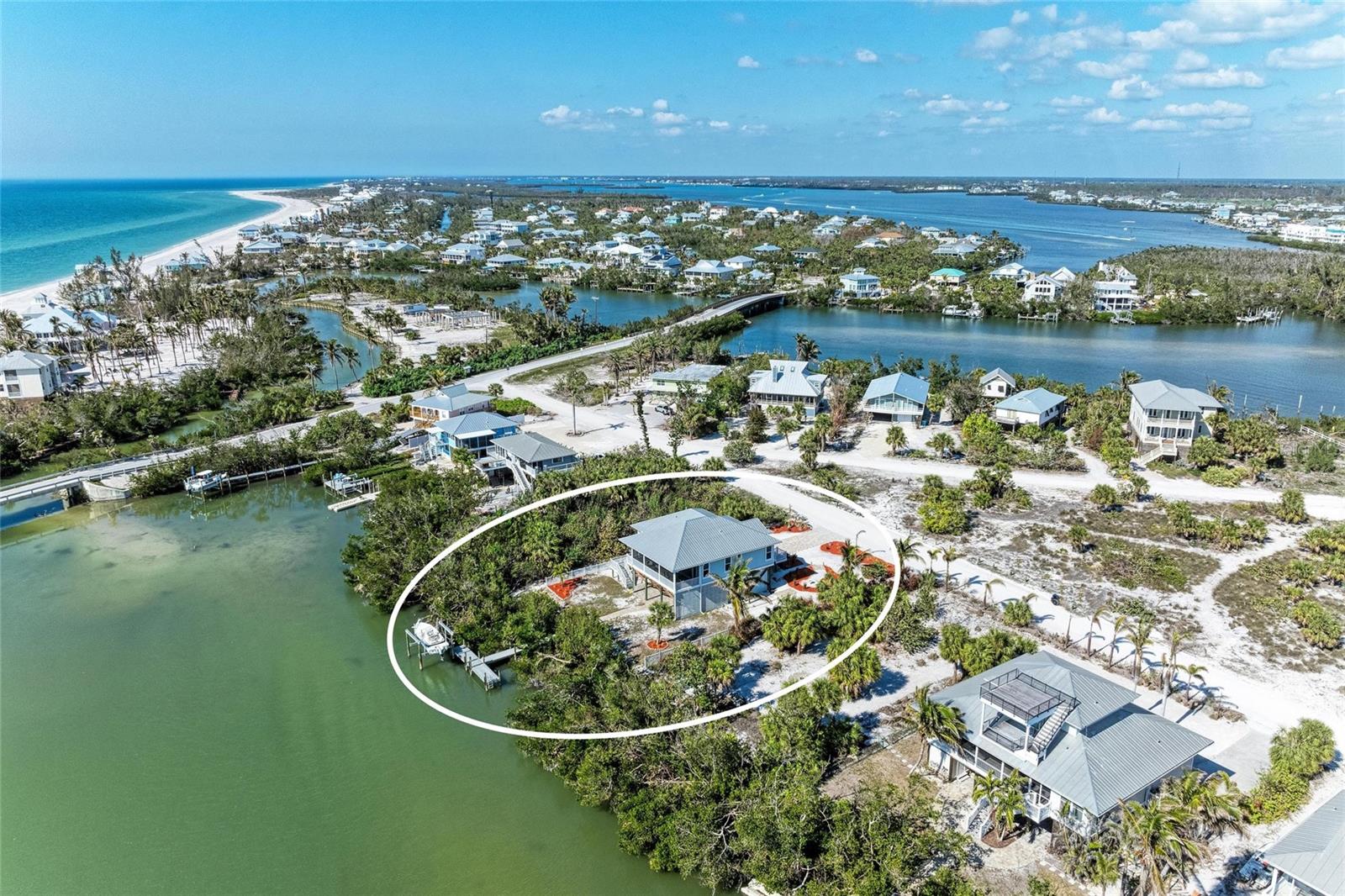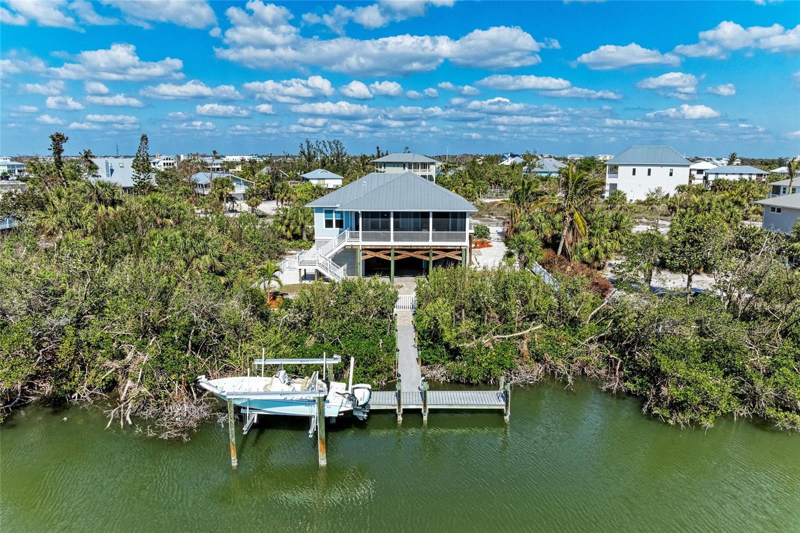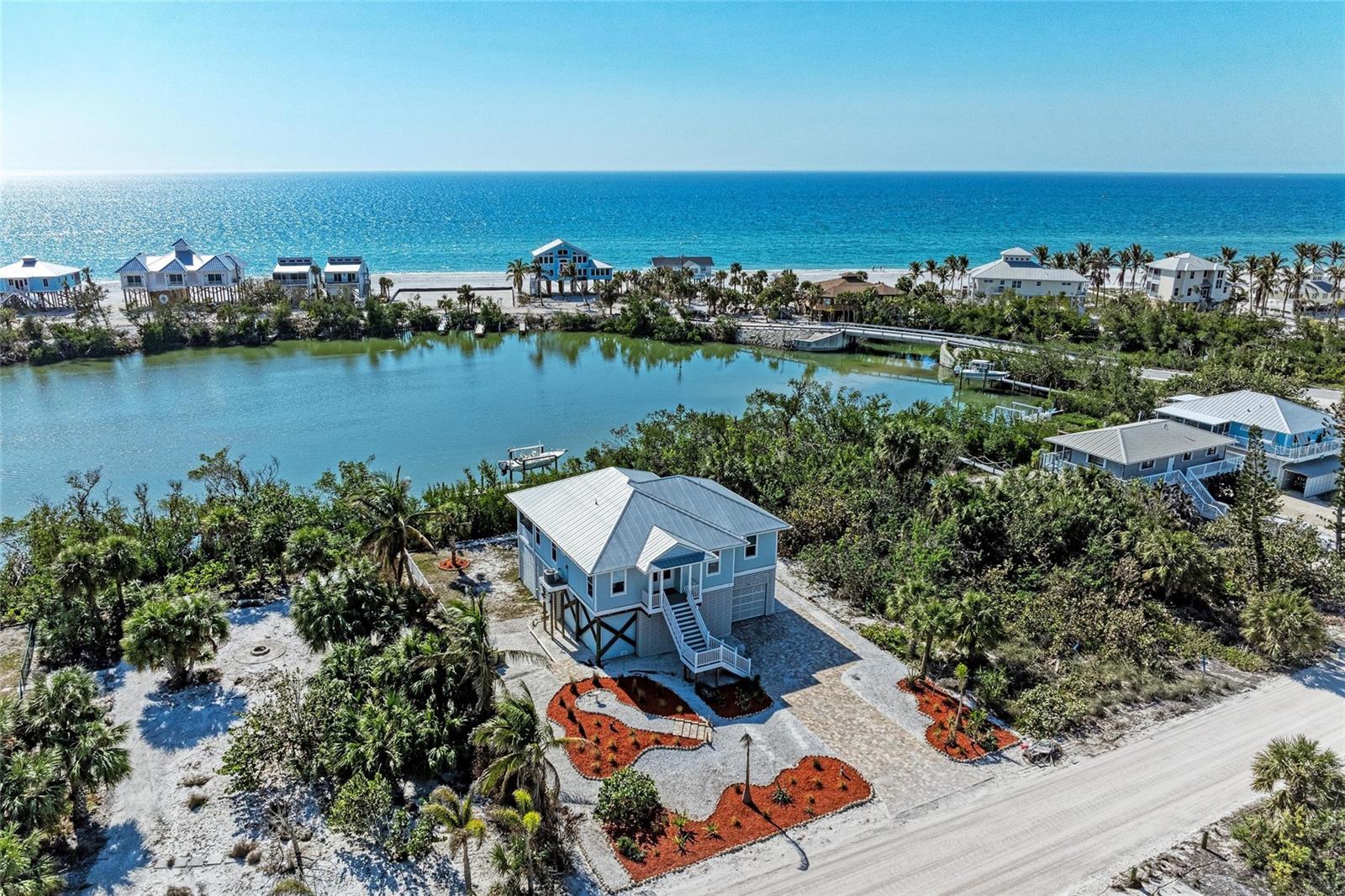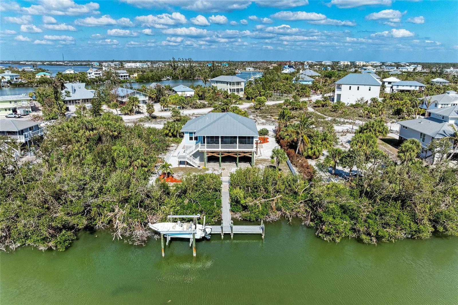 Welcome to this lovely 3-bedroom, 2-bath home, constructed in 2018 and located in the highly sought-after Palm Island Estates. This property provides effortless access to the Intracoastal Waterway and the Gulf of America, making it an ideal retreat for boating enthusiasts. Only a short walk away from the beautiful white sand beaches of Don Pedro Island, perfect for soaking up the sun and enjoying the peaceful coastal ambiance. As you enter this exquisite home, you'll be welcomed by impressive 10-foot ceilings embellished with crown molding and sophisticated tray ceilings. The interior showcases 8-foot doors and stunning Duchateau French Oak 6" wood plank flooring, which adds both warmth and charm. An abundance of windows and a sliding glass door open up to a generous 30' x 12' screened lanai, perfectly positioned for western exposure to capture breathtaking sunset views over Bocilla Lagoon. The custom kitchen is a true culinary delight, featuring elegant granite countertops, high-end stainless steel appliances, and a gas range complete with a convenient pot filler and hood. A walk-in pantry offers ample storage, while the island--with its large sink and bar seating--creates a seamless flow between the kitchen, living, and dining areas, ideal for hosting gatherings. The master bedroom serves as a tranquil retreat, boasting a spacious walk-in closet. The master bath is designed for ultimate relaxation, offering dual sinks with granite countertops, a luxurious soaking tub, and a roomy designer shower adorned with stylish subway tiles. The second bath/powder room is equally impressive, featuring chic subway tiles, Italian natural stone flooring, and a granite countertop. This home also comes equipped with designer fans, elegant lighting fixtures, and high-quality faucets throughout, as well as a security system for added peace of mind. Impact glass windows and doors enhance durability and safety, while a designated area for a future elevator adds convenience for years to come. This residence truly marries luxury with functionality!This home features a strong and durable exterior, complete with a metal roof, impact-rated windows, and resilient hardy board siding. The spacious deck and stairways are equipped with track railings and WeatherBest decking, providing both safety and aesthetic appeal. A beautifully paved driveway leads to an open garage and an under-home area, which includes a shower, pre-wired generator hookup, and 792 sq. ft. of enclosed storage space. The extra area beneath the home presents fantastic opportunities for future upgrades, such as an outdoor summer kitchen, and there's plenty of room for a pool in the fenced backyard. Step out onto the 296 sq. ft. dock, also featuring WeatherBest decking, where you can take advantage of a 10,000-pound boat lift and freshwater spicket. Enhanced by thoughtfully designed landscaping, the striking exterior elevation gives this property a refined island charm that truly sets it apart. Discover the best of waterfront living in this enchanting home!BE SURE TO CLICK THE FULL VIRTUAL TOUR LINKS FOR DETAILS!