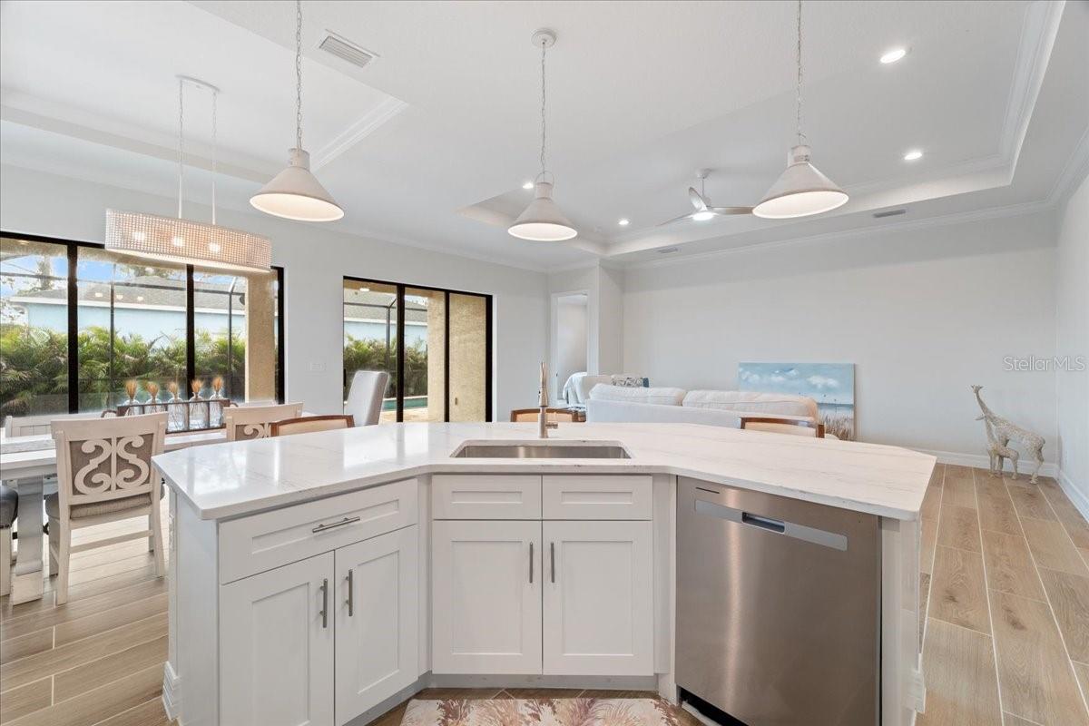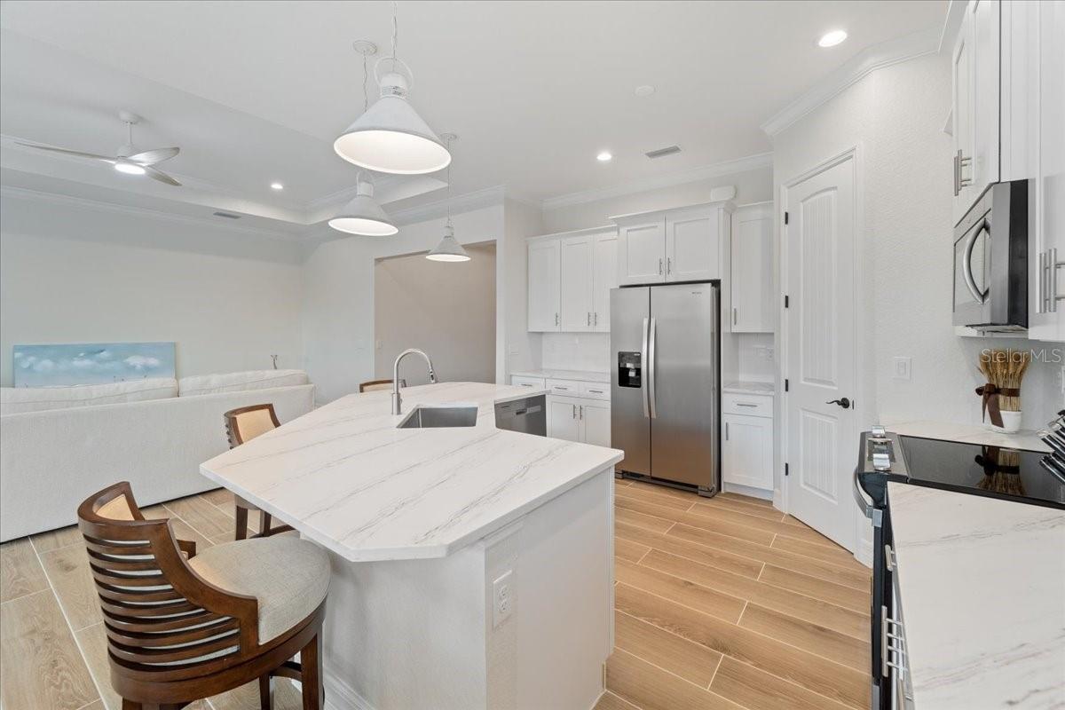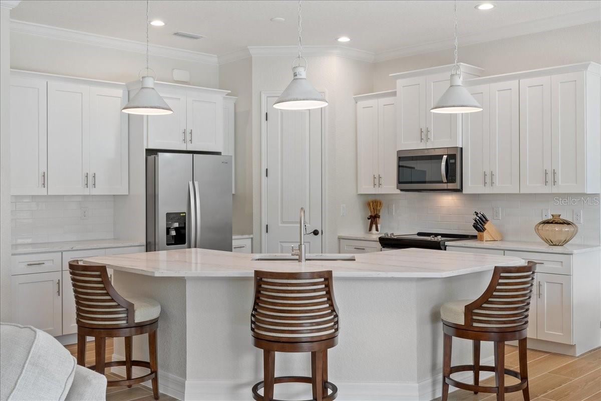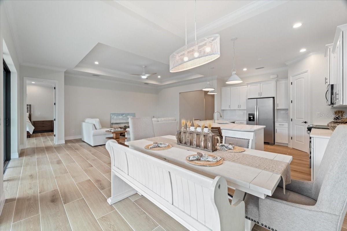This BRAND-NEW home exudes quality craftsmanship--unmistakable from the moment you arrive! The coach-lit driveway, shiplap-accented exterior, welcoming front porch, and elegant double-door entryway set the stage for the beauty found within. Located in the highly desirable beach community of Englewood, this 4-BEDROOM, 2-BATHROOM, 3-CAR GARAGE home was built with no detail overlooked and no feature understated!Inside, you'll find soaring volume ceilings and 8-foot doors throughout. The Living Room features an impressive tray ceiling with recessed lighting, crown molding, a 6-foot ceiling fan, and a 3-panel sliding glass door that opens to the covered lanai--creating a bright, sunlit sanctuary. The separate Dining Area, enhanced by a set of sliding glass doors, offers ample space for entertaining and your favorite sideboard. At the heart of this open, convenience-driven floorplan is the chef-inspired Kitchen--complete with an incredible, working ISLAND, WALK-IN PANTRY, high-end stainless steel appliances, TILE BACKSPLASH, and solid wood, SOFT-CLOSE cabinetry topped with luxurious veined QUARTZ countertops. Brushed nickel hardware and thoughtful finishes make this the hub of the home and the centerpiece for gatherings.The split floorplan provides owner privacy, with the Primary Suite offering direct lanai access, a tray ceiling, transom window for natural light and privacy, two walk-in closets, and a luxurious en suite bathroom featuring an enormous walk-in tiled shower, DUAL SINKS, vanity with QUARTZ countertops, and a private water closet.Throughout the home, you'll find a premium lighting package including ceiling fans with lights, pendant fixtures over the island, and elegant chandeliers in the foyer and dining room. Easy-care, allergen-free porcelain plank flooring runs throughout. Showcasing one of Interior Designers' top picks for 2025, the home includes stylish shiplap accents on the kitchen island, Living Room wall, and foyer feature wall.For peace of mind, this home is equipped with HURRICANE IMPACT WINDOWS AND SLIDING GLASS DOORS--offering security and confidence even when you're away.Step outside to enjoy an impressive 23 feet long LANAI, perfect for entertaining. The oversized 30'x23', 682 sq. ft. 3-car garage features two hurricane-rated overhead doors, providing extra parking and maneuvering space.With NO HOA, this property offers exceptional flexibility--live here year-round, rent it seasonally, or Airbnb it.Built by a local Floridian builder who understands what's needed for longevity and durability in Southwest Florida, this home features a HIP ROOF design for long-term insurance discounts, OFF-RIDGE roof venting, and STEM WALL construction, which far exceeds monolithic slabs for storm resilience.Ideally located near golfing communities, marinas, boat launches, and Englewood's beautiful beaches, this nearly 2,100 sq. ft. home feels even larger thanks to its open layout and soaring ceilings.This gem is priced to sell and waiting for you--call today for your private tour!