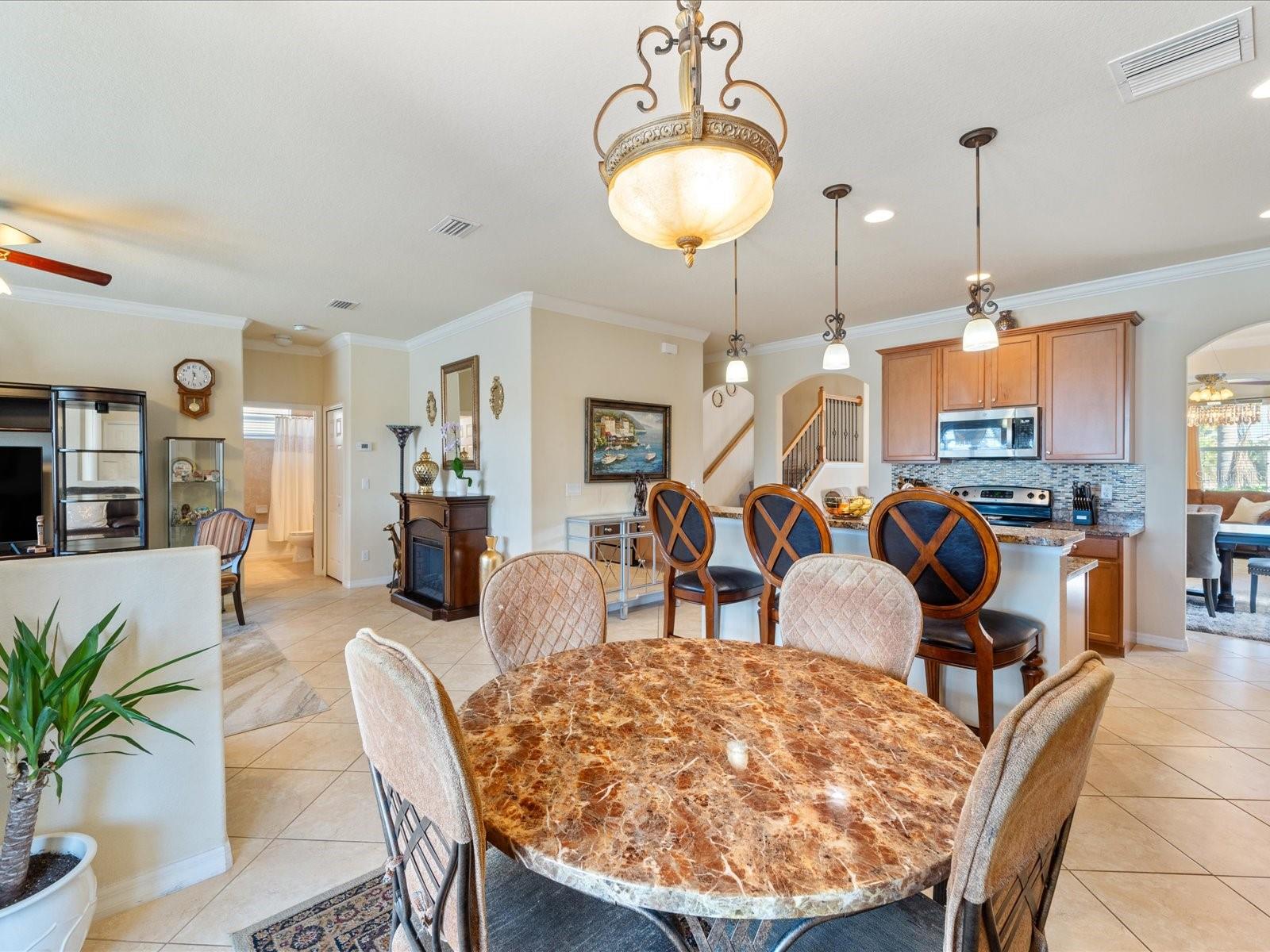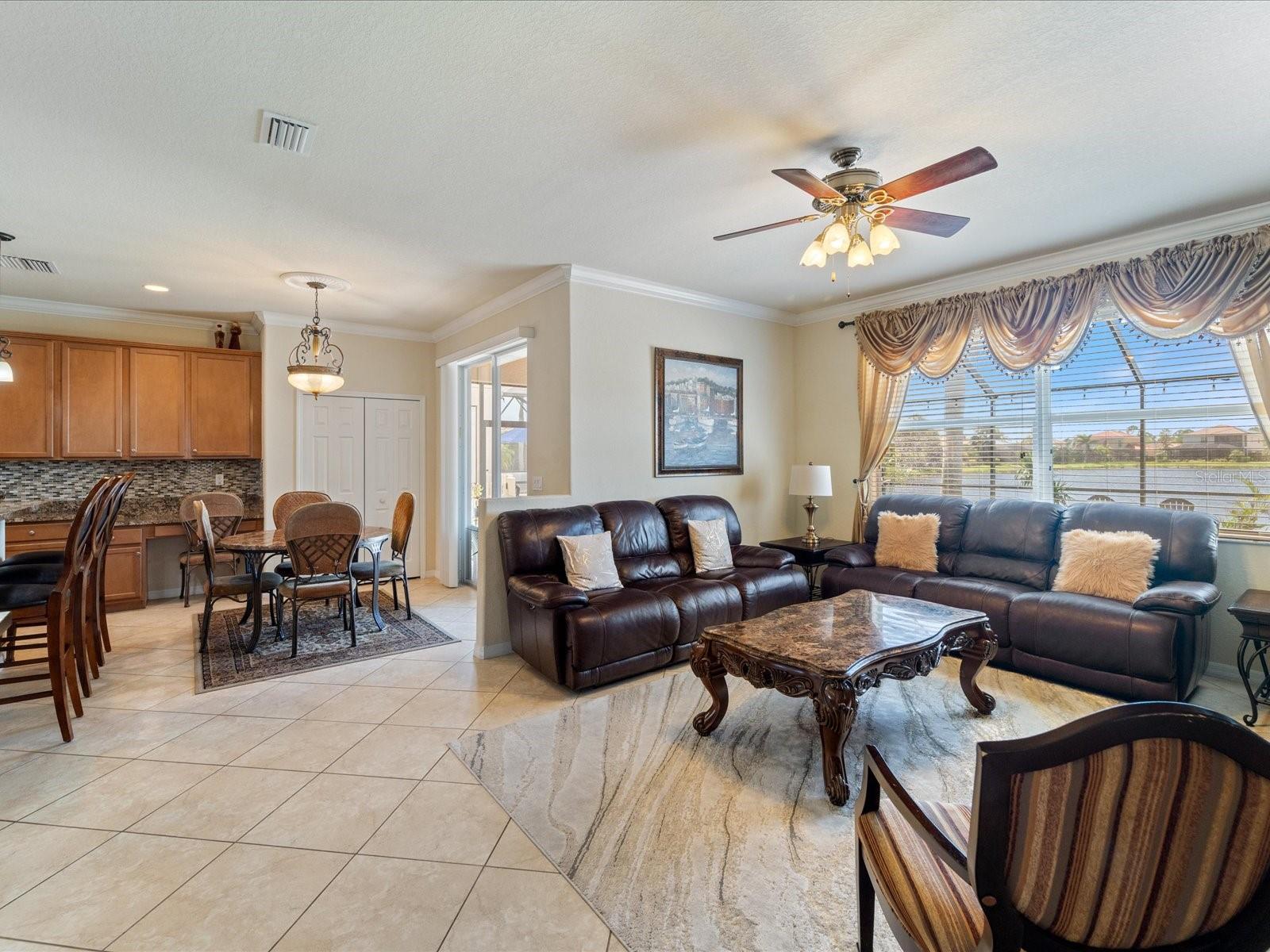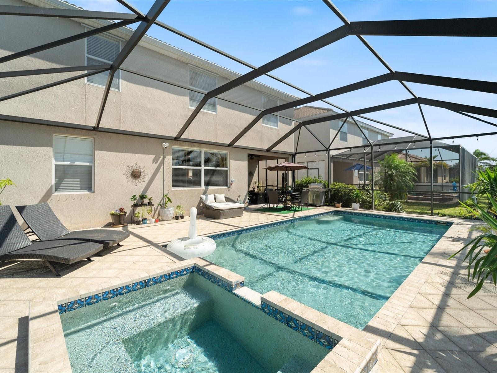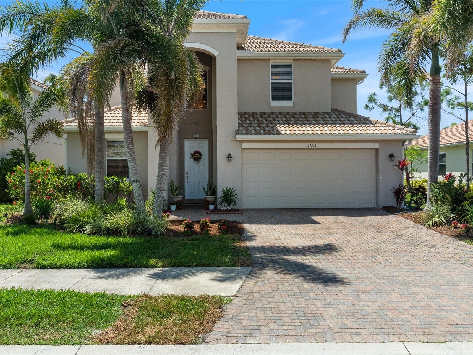 Two story 3280 sq. ft. home with 5 bedrooms 3 full baths, large bonus room, loft area, and a three car garage. A large lanai extends across the width of the house has a custom rectangular heated pool and a spa. The back of the house has a southern exposure great for lounging by the pool with a long view of the lake that is filled with largemouth bass for the Florida fisherman. The home is located in the Stoneybrook community in Venice which is a gated community with a guard at the gate. The house entrance has a high ceiling foyer with a large spectacular crystal chandelier which then opens into the living room, as well as dining room. The kitchen is bright and open to the oversized family room which has a view of the lake, and is great for entertaining. There is a bedroom and one bath downstairs with four bedrooms and two baths upstairs. The shower in the Primary's bedroom was enlarged and upgraded with one piece vinyl panels and a nonslip floor. Bonus room can be used for a gym, 2nd family room, study, office, or a movie-media room. This home has plenty of room for a large family, invited guests, in-law set up. There are four foxtail palms in front of the house and three large Royal palms in the back of the house. The community has a pool, spa, tennis courts, pickle ball courts, gym, baseball field, a community center, and is near beaches, hospitals, grocery stores, downtown Venice, and Wellen Park.