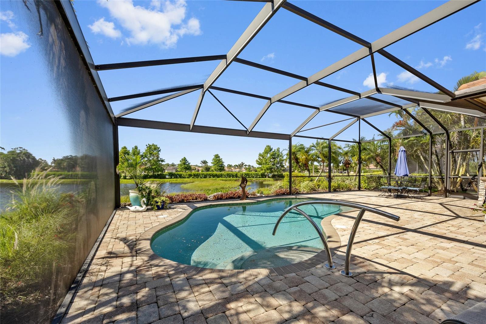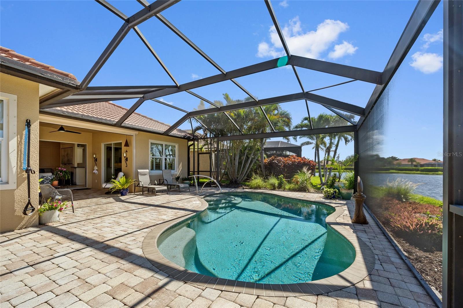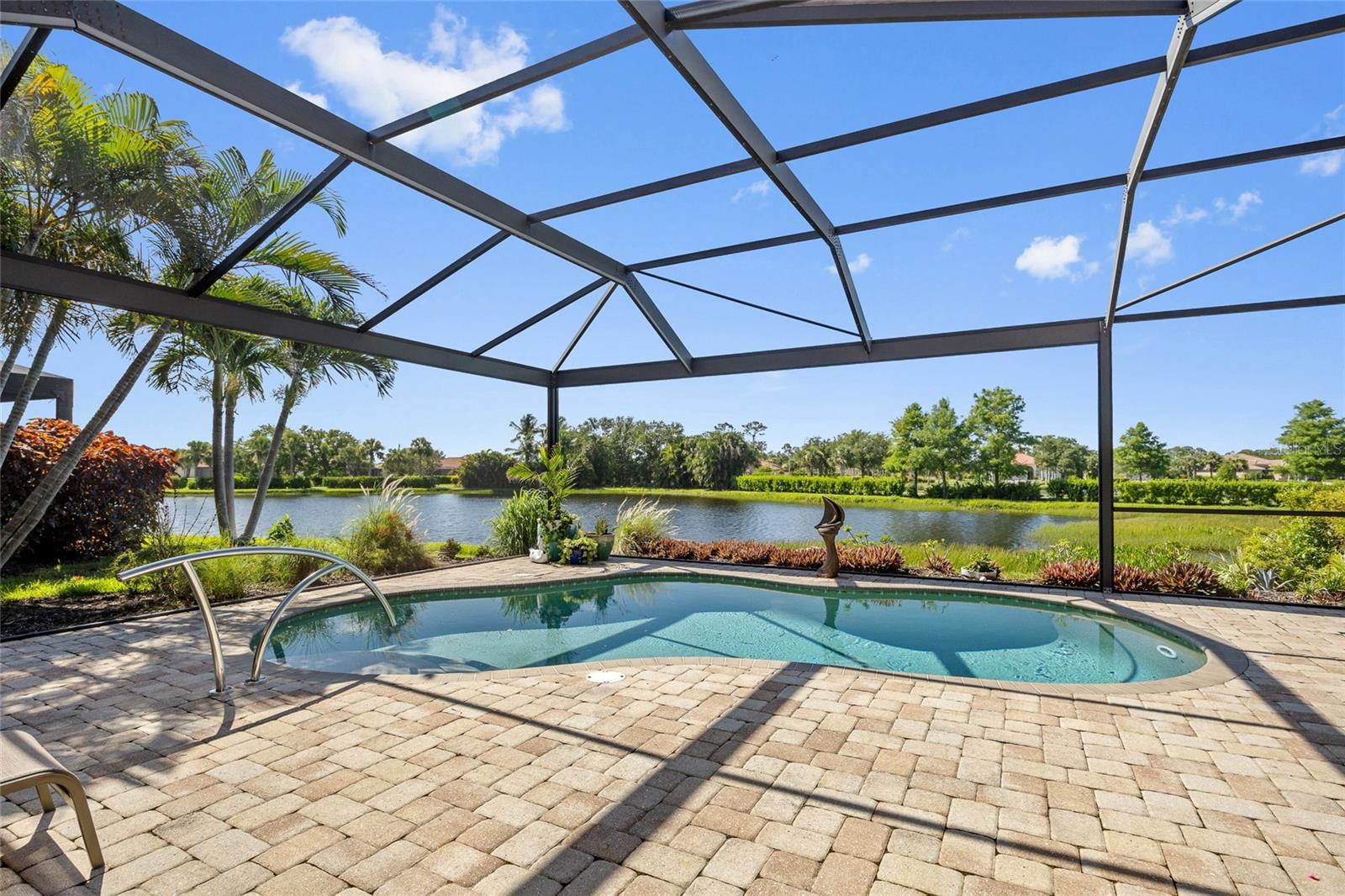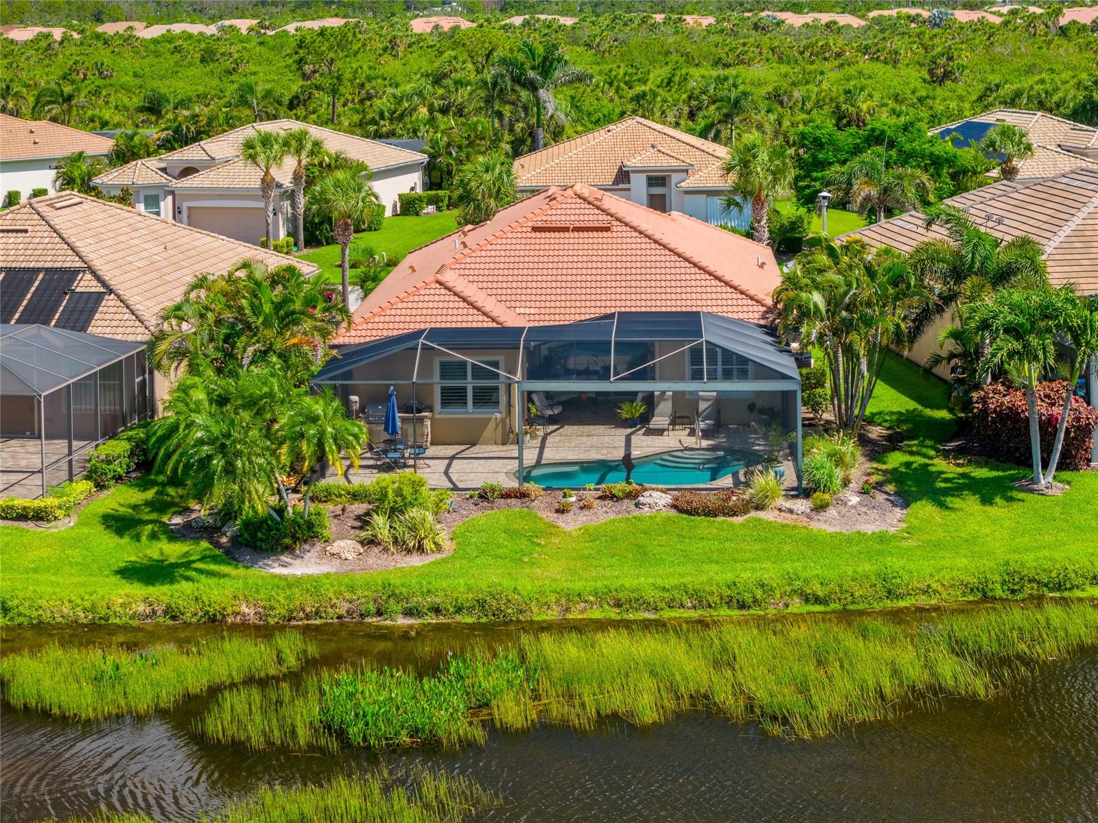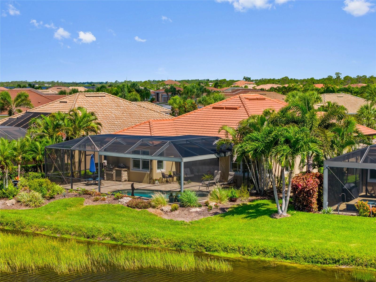 EXCEPTIONAL 3 BEDROOM, 2 BATH, 2-CAR GARAGE LAKEFRONT POOL HOME LOCATED IN THE HIGHLY DESIRED GOLFING COMMUNITY OF RIVERWOOD! Enjoy a quiet community with amazing lake views, beautiful wildlife and a fantastic location minutes from the Myakka River and just a short ride to white sandy beaches. Step inside to experience an open floor plan offering an unparalleled blend of elegance and comfort highlighted by high ceilings and designer accents, including crown molding and tall entryways. The living area features a large slider that opens to the lanai, showcasing breathtaking water views and your private pool. Enjoy hosting dinners in the formal dining area or casual meals in the breakfast nook, complete with sliders leading to the lanai. The kitchen is a chef's delight, boasting granite countertops, light cabinetry, and stainless appliances, including a newer French door refrigerator. The luxurious primary suite offers access to the lanai, serene lake views, and a private ensuite with dual vanities, a garden tub, and a walk-in shower. A light and bright guest bedroom and a separate full bath ensure comfort for visitors. The den/office can easily be converted to 3rd bedroom for extended family and guests. For convenience, the home includes an inside laundry with extra cabinets for storage. The outdoor entertaining area is perfect for gatherings, featuring a covered lanai, outdoor kitchen with a built-in gas grill and beverage cooler, and a saltwater freeform pool. Enjoy the panoramic screen views of the lake and the southeastern exposure that brings an abundance of Florida sunshine. This meticulously maintained home has seen numerous updates since 2023, including an electric roll-down shutter for the front door and lanai area, a new pool pump, and new grates for the Bull grill. The exterior is being freshly painted and is surrounded by lush tropical landscaping and meticulously maintained grounds. As a resident of Riverwood, indulge in a wealth of amenities such as a full fitness center, community pools, spa, tennis courts, pickleball, bocce ball, and more. The community offers a vibrant lifestyle with over 60 events and activities managed by a full-time activities director. Golf enthusiasts will love the par 72 championship course designed by Gene Bates, complete with extraordinary wildlife views. Plus, the conveniently located Beach Club on Manasota Key adds a touch of luxury to your living experience. This is more than a home; it's a lifestyle. Don't miss this opportunity to own a slice of paradise. Schedule your private showing today and discover everything that Southwest Florida has to offer!