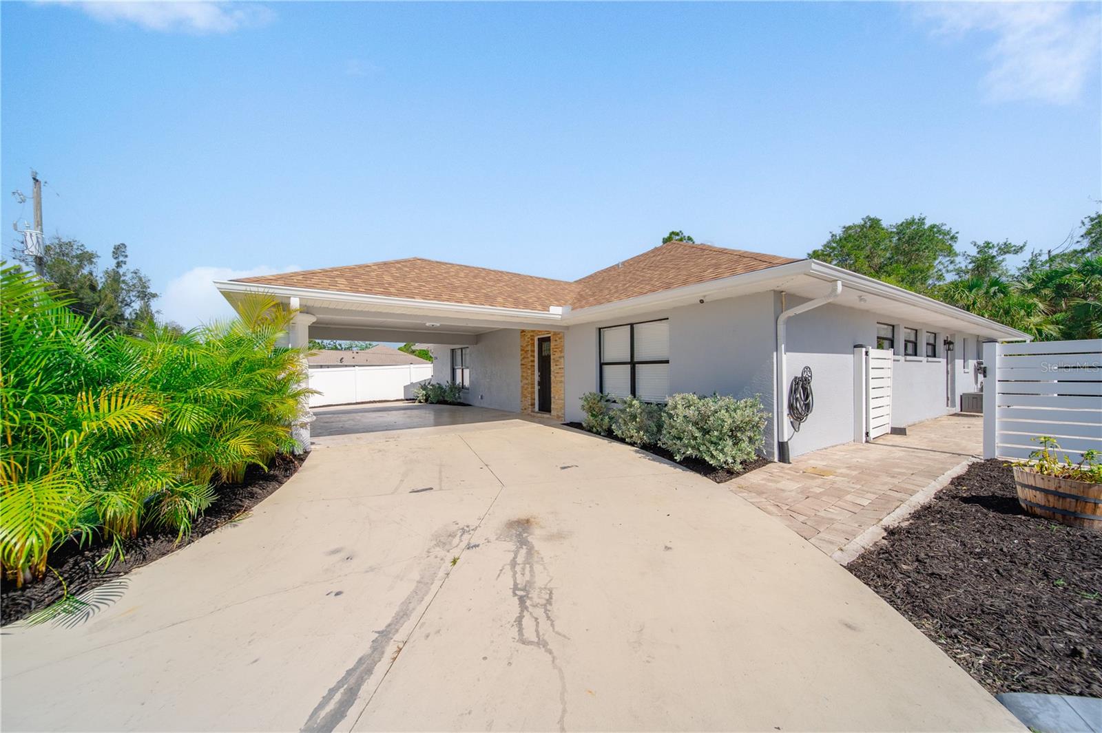Welcome to this beautifully renovated 3-bedroom, 2-bath home-- SITTING ON A HALF ACRE or 0.55 of an acre, complete with a versatile bonus room that makes the perfect fourth bedroom, office, or play space. Fully remodeled in 2019, this residence now boasts a new roof (2022) backed by a 25-year warranty, freshly painted exterior (2022), and durable PEX plumbing throughout. Inside, you'll find waterproof luxury vinyl plank flooring, soaring cathedral ceilings up to 14' with skylights that flood the bright, open living and family rooms with natural light. The all-new kitchen features Level IV granite countertops spanning over 15 feet of workspace, a 6' island, and modern appliances. Both bathrooms have been stylishly updated with new vanities, fixtures, and tile, and the master suite offers a spacious bedroom plus a 10' 9' walk-in closet. Practical upgrades include a 2019 AC (still under a 10-year warranty) and an updated water heater. Sitting on an oversized lot that is a little over a half an acre, the property is fully paved around the house for easy access and maintenance. Brand-new perimeter fencing--including 8-foot privacy panels--ensures seclusion and security, while the circular wide-turn driveway with covered carport and epoxy-coated flooring provides ample parking for family and guests. Backing onto peaceful wildlife preserves and just a short distance to the famed Warm Mineral Springs, this turnkey home offers room to add a pool or garage and combines modern finishes, robust systems, and exceptional outdoor enhancements. Don't miss your chance--schedule your private tour today!
