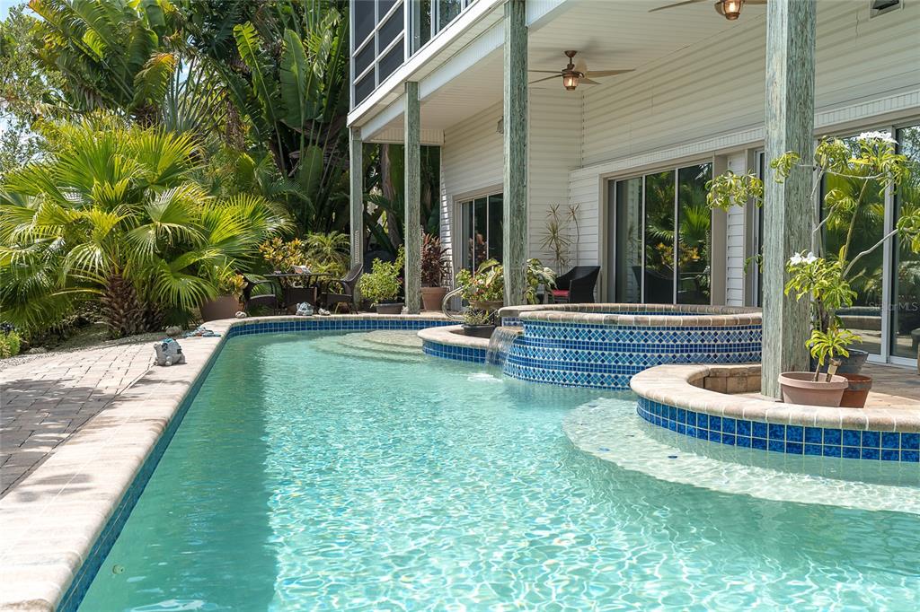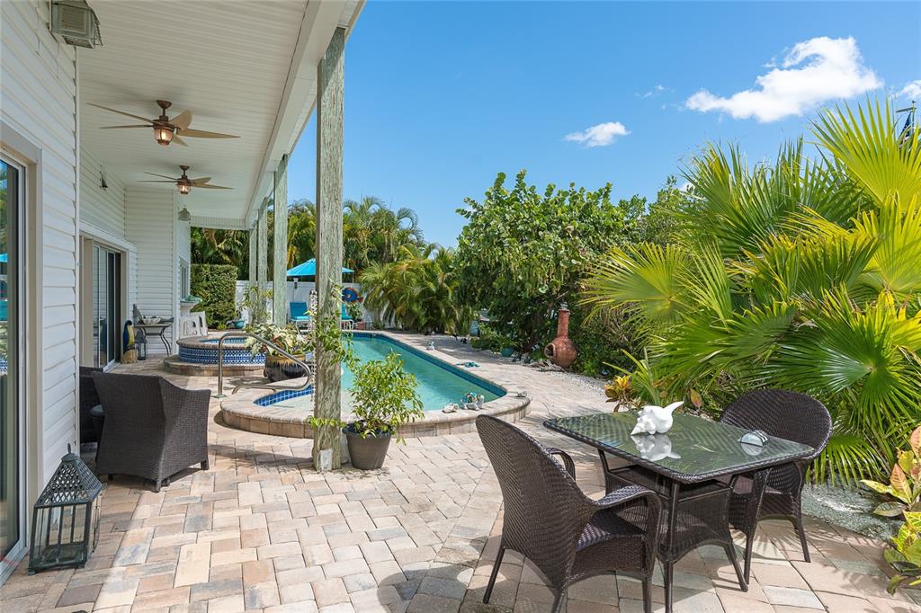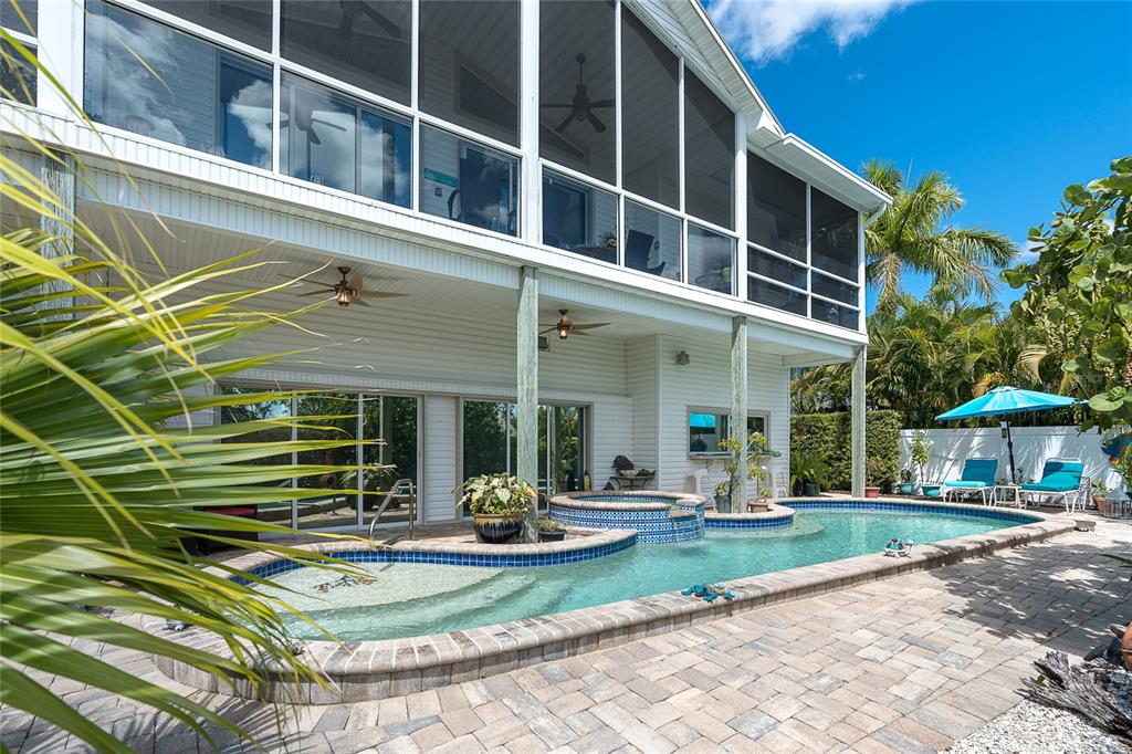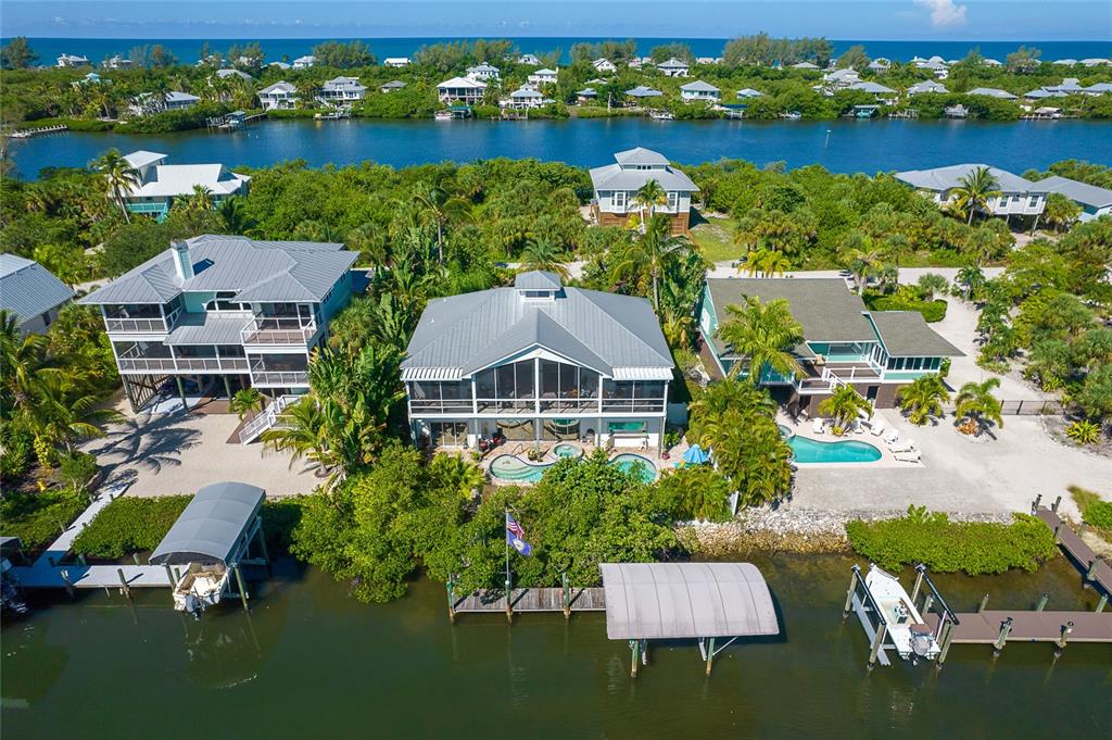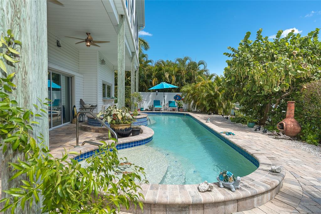 Captivating custom built 3 bedroom, 2 and 1/2 bath island home with direct access to the Intracoastal Waterway! This 80x135 lot with 80 feet of rip wrapped waterfront has a 30 foot dock with a 13,000 lb boat lift. Six foot privacy fencing surrounds the heated in ground pool and spa with a paver deck. Home has newly sanded and refinished wood floors, tile in the bathrooms and new tile on the back deck, which is the length of the house, quartz countertops, wood cabinets, newer appliances, new front stairs, wainscoting in the dining room, new light fixtures and ceiling fans throughout. The rear deck boasts a view of the ICW and forest like greenery. The lower level opens to the private pool and spa and is great for entertaining with space for a bar, tv area, kitchen, sleeping area and bonus room that was previously used as a wine room. The garage has room for one car and golf cart and has a newly refinished floor and paint. Under the front entry staircase, there is a 1,000 gallon koi/goldfish pond. Additional repairs since the hurricanes are as follows: siding, upper decks/screens, window and wainscoting in the cupola, luxury vinyl plank flooring on the lower level, new drywall/texture and paint, new dock wiring, control box, bunks and lift motors, pool equipment with heater/chiller, back and front porch decks reframed with new decking installed and new front stairs/crab trap and new hot water heater. Located on Don Pedro-Knight-Palm Island, this bridgeless barrier island is situated between Sarasota/Tampa to the north and Ft Myers/Naples to the south. Access via a car passenger ferry or private boat. If you buy your piece of island paradise today. you can luxuriate in this spacious and beautiful home, as well as enjoy the uncrowded beaches and glorious sunsets forever!!!