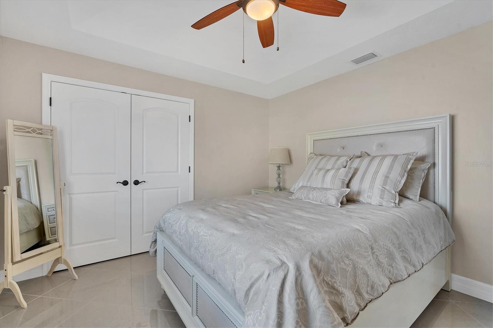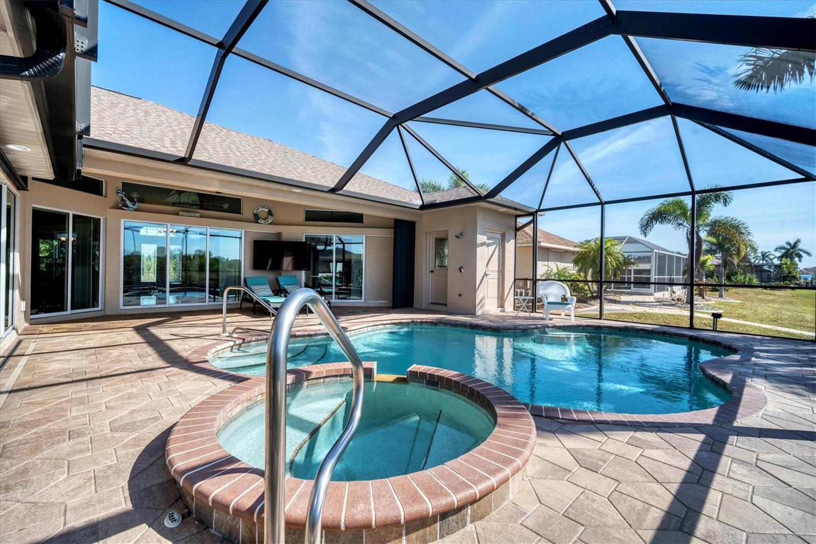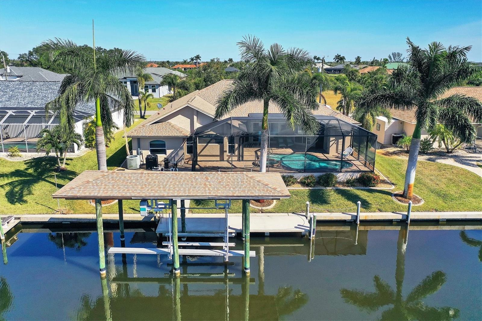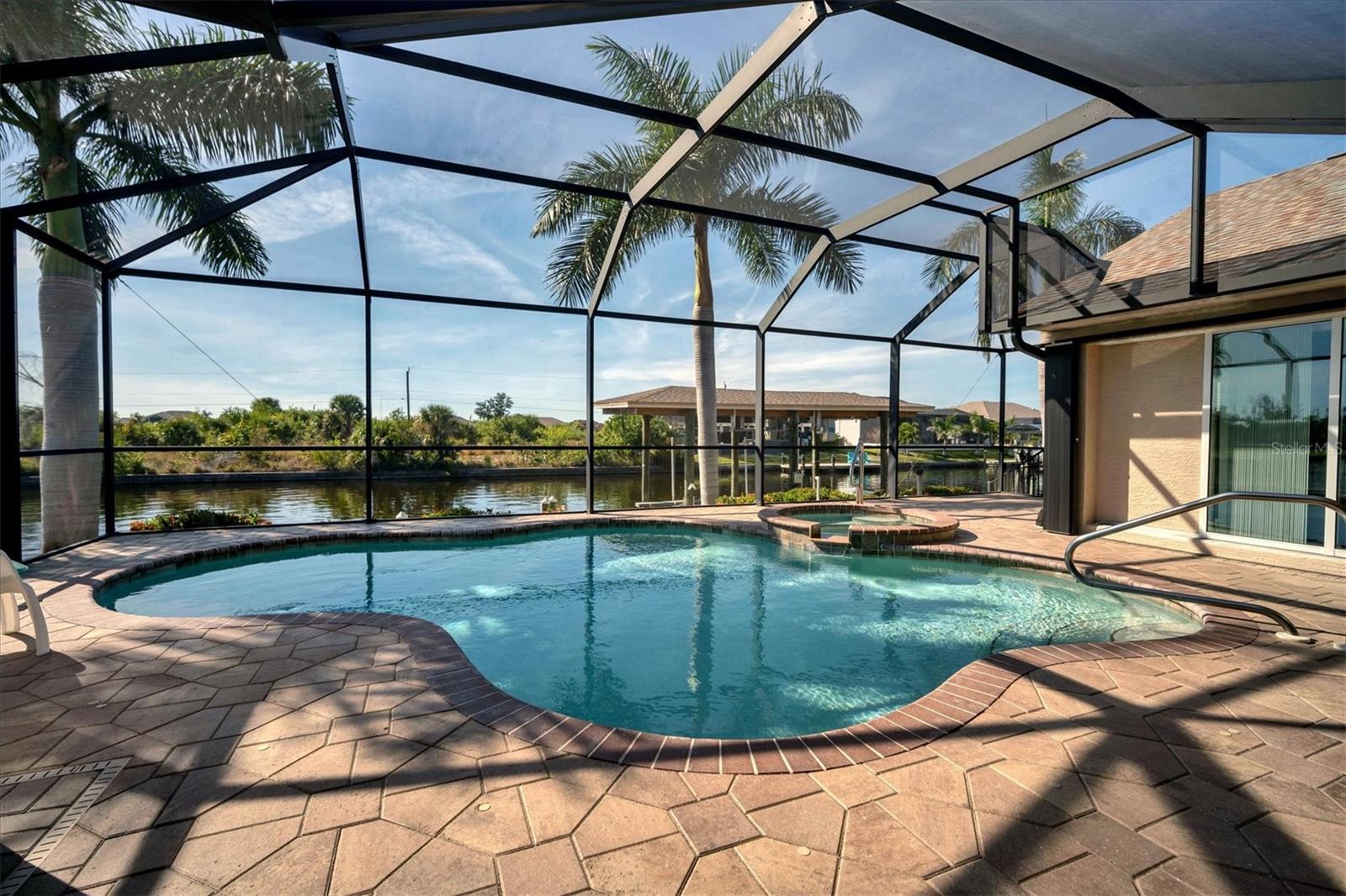 Elegantly Designed and Decorated Home With Iconic Water Views in South Gulf Cove. A 2022 roof, oversized garage with room for all your toys, a beautiful saltwater heated pool, and 15,000lb boat lift with custom built cover are just a few of the features that make this a truly remarkable home. This home displays beautiful curb appeal with the paver driveway and walkways, leaded glass double entry doors with transom window, and mature landscaping. The first thing you will notice as you enter this immaculately kept home are the gorgeous views to the rear of the waterway, gleaming marble tile flooring, vaulted ceilings, decorative niches and chair rail. There is plenty of space for everyone with a formal living room, formal dining room, breakfast nook, central kitchen and family room. Multiple sliding glass doors provide access to the pool and lanai for several locations in the home. Chef's will love the open kitchen with wood cabinets, double ovens, granite countertops, wine refrigerator, above cabinet lighting and a Bosch cooktop on the island. The master bedroom highlights include a tray ceiling with crown molding, Bay window, and both a walk-in and reach-in closet. The ensuite master bathroom has a nice glass enclosed walk-in shower, double vanity with granite countertop, oversized soaking tub, linen closet, private water closet and large window for an abundance of natural light. The split bedroom design separates the guest bedrooms from the primary bedroom to provide you with plenty of privacy. The two guest bedrooms both have reach-in closets and the shared guest bath has a granite topped vanity, and large, tiled walk-in shower. A separate laundry room has built-in cabinet, granite topped laundry sink, and shelving. The garage space is a hobby enthusiasts dream with the epoxy floor coating and built in workshop space with cabinets. Additional upgrades in this home include a central vac, 6" baseboards throughout, pool bath, outdoor shower, When you are ready to sit back and enjoy Florida living, the custom paver lanai and pool will be a welcome retreat. If you prefer to spend time on the water, the dock and boat lift will make it easy to load up the coolers and family and head out for a great day of fishing or shelling on one of many local beaches, try for a Tarpon in Boca Grande Pass, sightsee on the Myakka River, or cruise the local waterways. South Gulf Cove is centrally located near all area shopping, dining, two major league baseball spring training facilities, medical facilities and much more. Schedule an appointment today to see this magnificent home. Bedroom Closet Type: Walk-in Closet (Primary Bedroom).