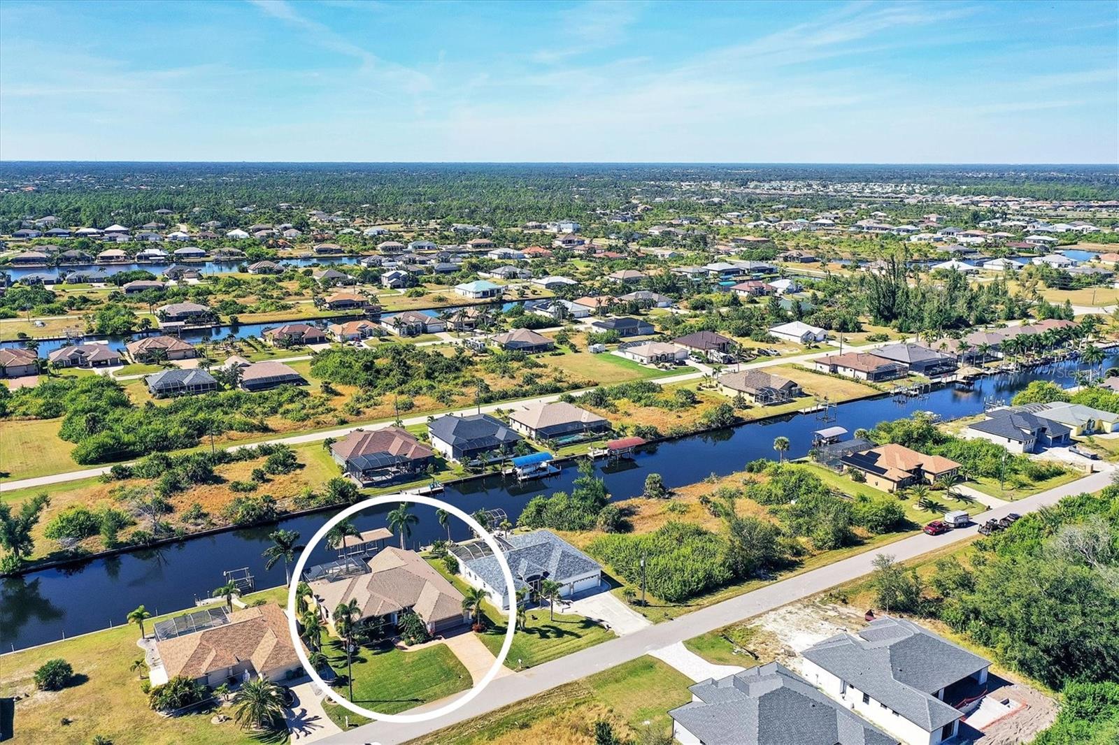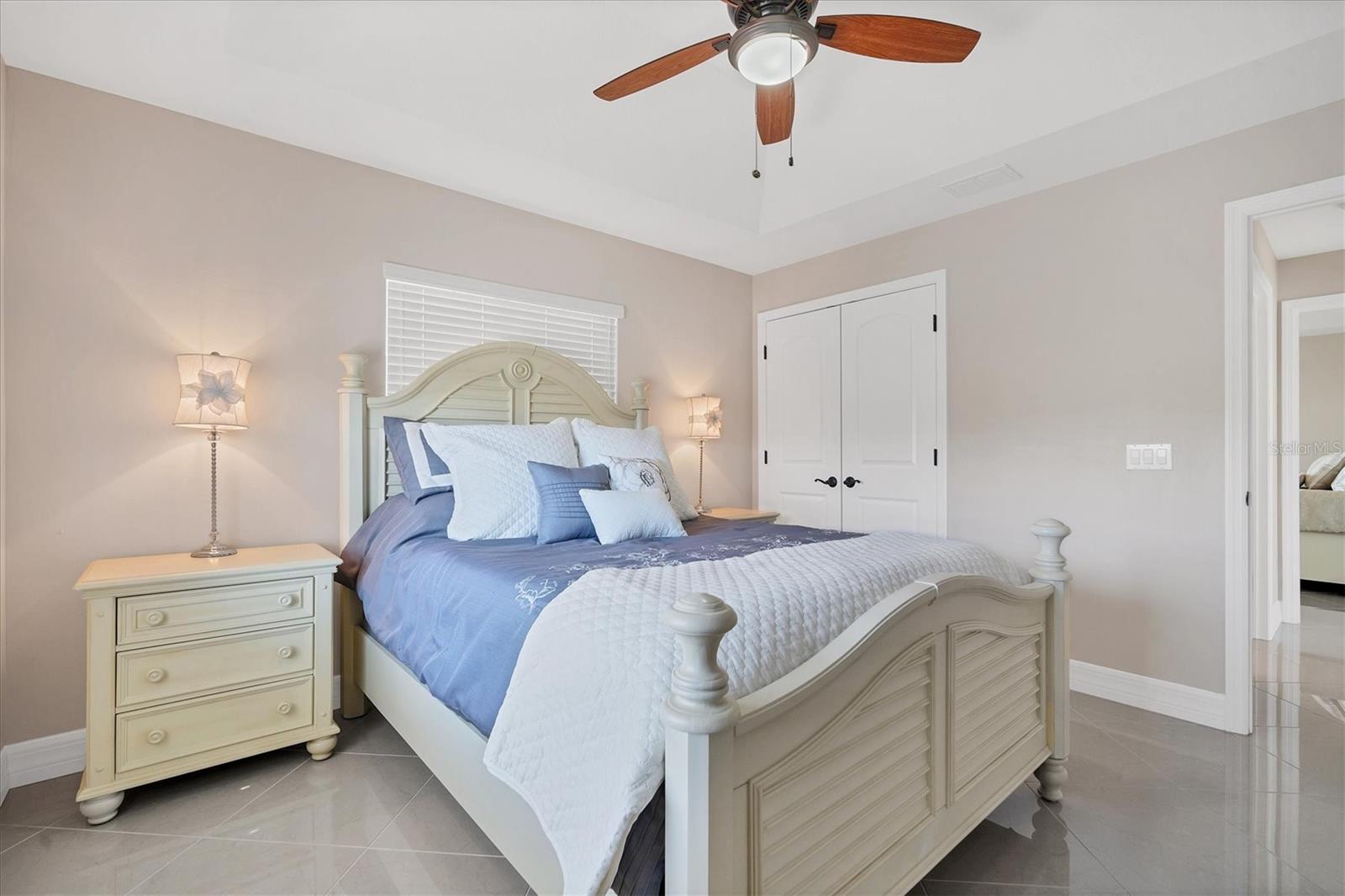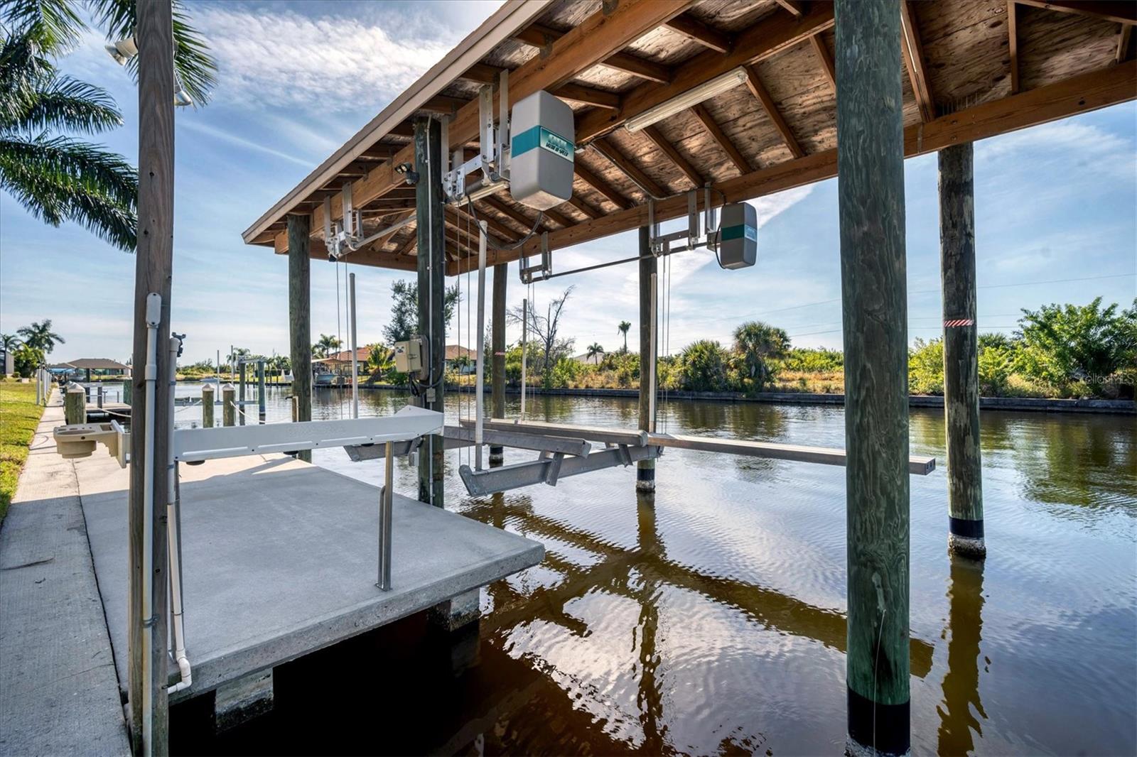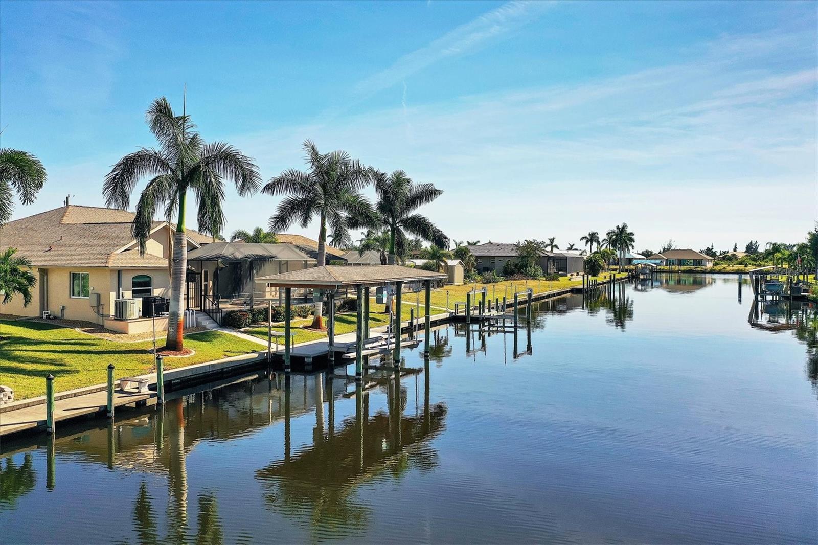 Elegantly Designed and Decorated Home With Iconic Water Views in South Gulf Cove. A 2022 roof, oversized garage with room for all your toys, a beautiful saltwater heated pool, and 15,000lb boat lift with custom built cover are just a few of the features that make this a truly remarkable home. This home displays beautiful curb appeal with the paver driveway and walkways, leaded glass double entry doors with transom window, and mature landscaping. The first thing you will notice as you enter this immaculately kept home are the gorgeous views to the rear of the waterway, gleaming marble tile flooring, vaulted ceilings, decorative niches and chair rail. There is plenty of space for everyone with a formal living room, formal dining room, breakfast nook, central kitchen and family room. Multiple sliding glass doors provide access to the pool and lanai for several locations in the home. Chef's will love the open kitchen with wood cabinets, double ovens, granite countertops, wine refrigerator, above cabinet lighting and a Bosch cooktop on the island. The master bedroom highlights include a tray ceiling with crown molding, Bay window, and both a walk-in and reach-in closet. The ensuite master bathroom has a nice glass enclosed walk-in shower, double vanity with granite countertop, oversized soaking tub, linen closet, private water closet and large window for an abundance of natural light. The split bedroom design separates the guest bedrooms from the primary bedroom to provide you with plenty of privacy. The two guest bedrooms both have reach-in closets and the shared guest bath has a granite topped vanity, and large, tiled walk-in shower. A separate laundry room has built-in cabinet, granite topped laundry sink, and shelving. The garage space is a hobby enthusiasts dream with the epoxy floor coating and built in workshop space with cabinets. Additional upgrades in this home include a central vac, 6" baseboards throughout, pool bath, outdoor shower, When you are ready to sit back and enjoy Florida living, the custom paver lanai and pool will be a welcome retreat. If you prefer to spend time on the water, the dock and boat lift will make it easy to load up the coolers and family and head out for a great day of fishing or shelling on one of many local beaches, try for a Tarpon in Boca Grande Pass, sightsee on the Myakka River, or cruise the local waterways. South Gulf Cove is centrally located near all area shopping, dining, two major league baseball spring training facilities, medical facilities and much more. Schedule an appointment today to see this magnificent home. Bedroom Closet Type: Walk-in Closet (Primary Bedroom).