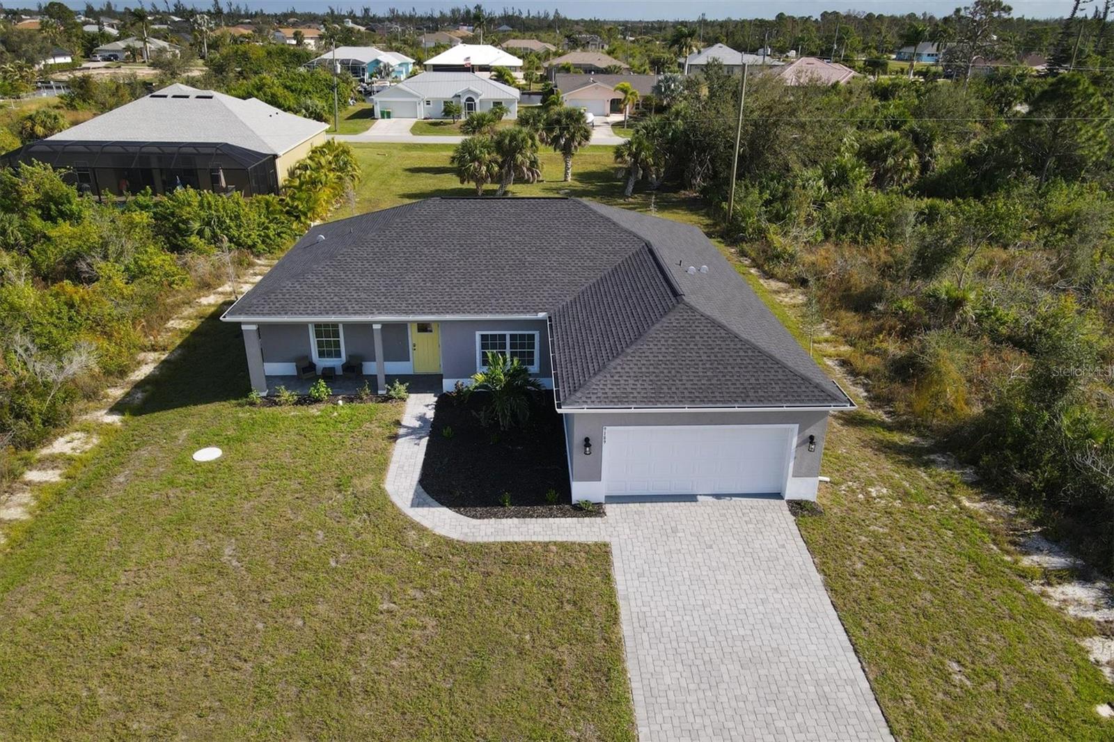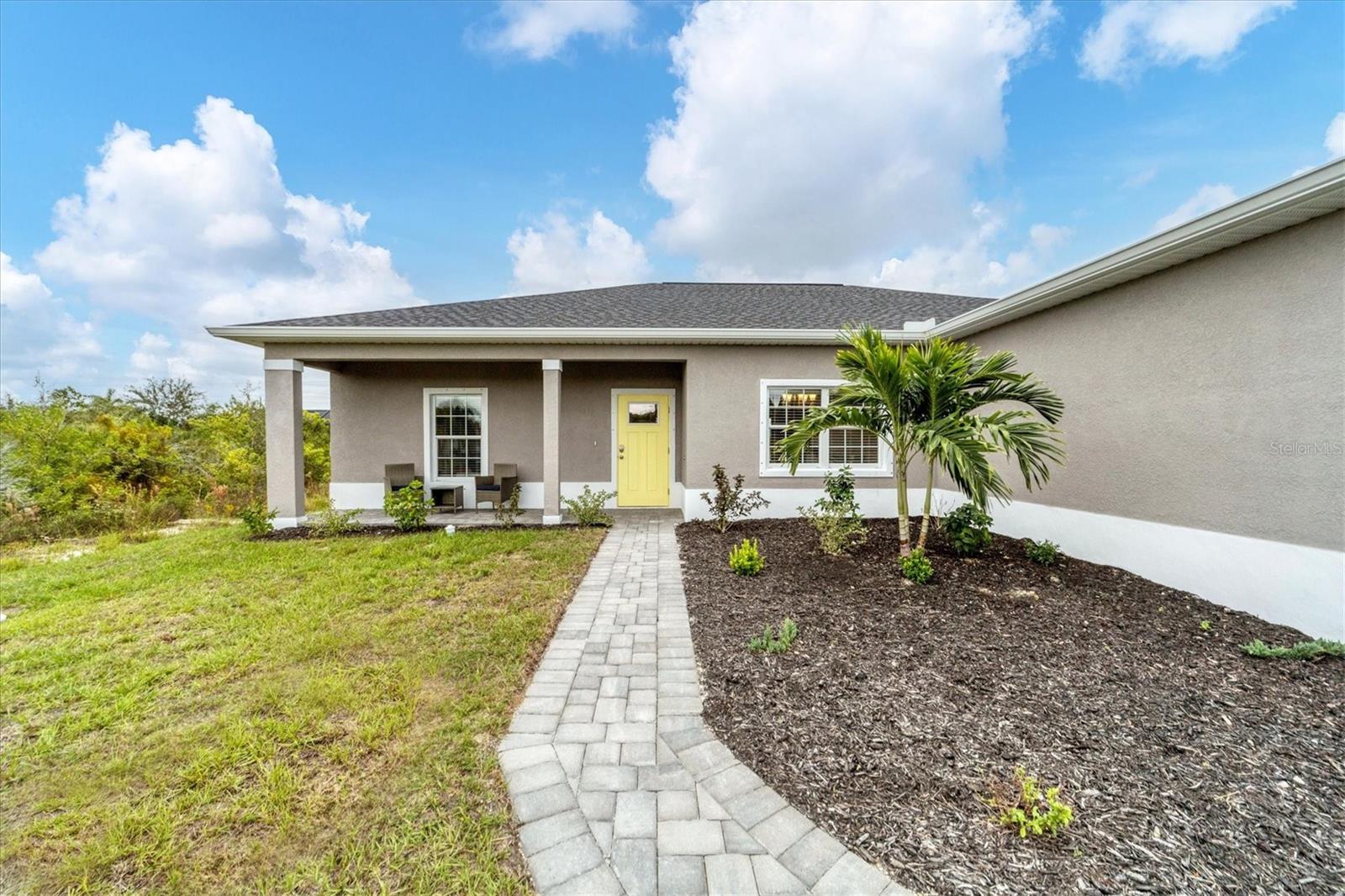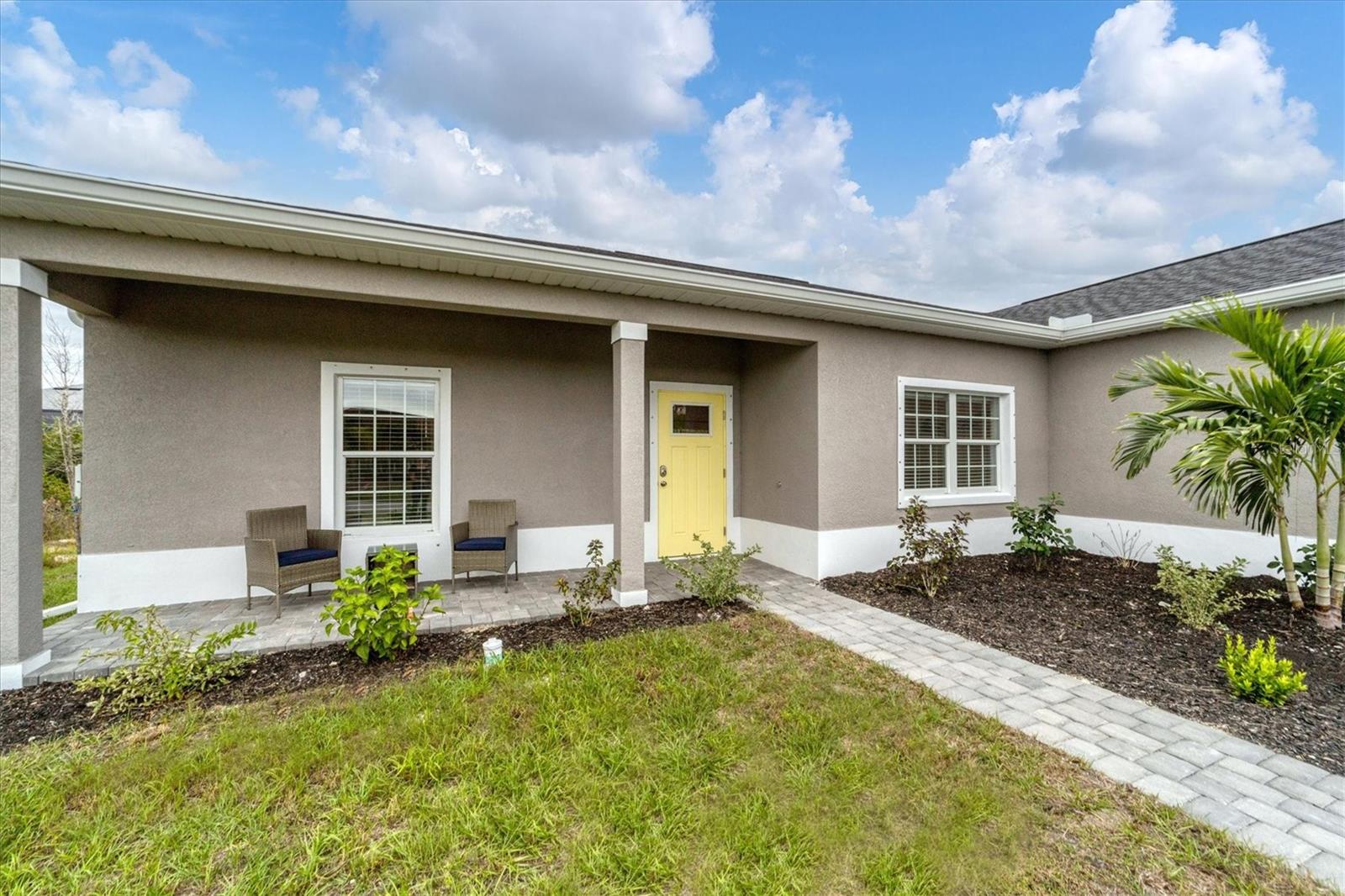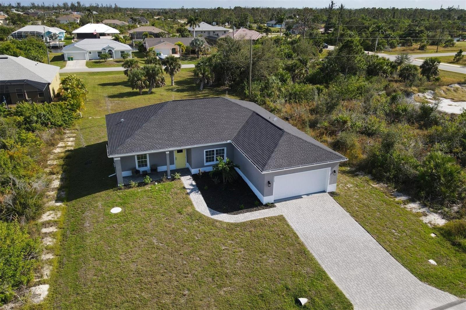 Under Construction. A Brand New Home with an Expected Completion Date of December 2023 can be Yours!! The modern color scheme and design of the exterior of the home, gray paver driveway, walkways and covered porch are showstoppers. Inside you will find this home has an abundance of updates and upgrades that include impact windows, easy care wood look tile flooring throughout, black door hardware throughout, prewired for a whole house generator, keyless entry door, designer black lighting fixtures in the living area and kitchen, energy efficient air conditioning and water heater systems, city water and sewer. The gourmet kitchen features white shaker style cabinets, quartz countertops, and a stainless steel appliance package. The ensuite primary bedroom has 2 walk-in closets, dual vanity, an oversized fully tiled walk-in shower. The two additional bedrooms both have double door reach-in closets, and the shared guest bathroom has a nice shower/tub combo and oversized vanity. Step through the sliding doors in the great room to a nice sized paver brick patio. This home is situated in the waterfront community of South Gulf Cove, where you can join the voluntary HOA for access to the community boat ramp, nature trails, a garden park, picnic pavilions, clubhouse, social activities and upgrades coming soon to include pickleball courts. The builder will provide a 2-10 home warranty and if you choose the builder's preferred lender you will receive an additional $2,500 bonus towards lender credits. **NOTE: Photos are of the builder's model home with the same layout and floor plan. Schedule your showing to see everything this home has to offer today.