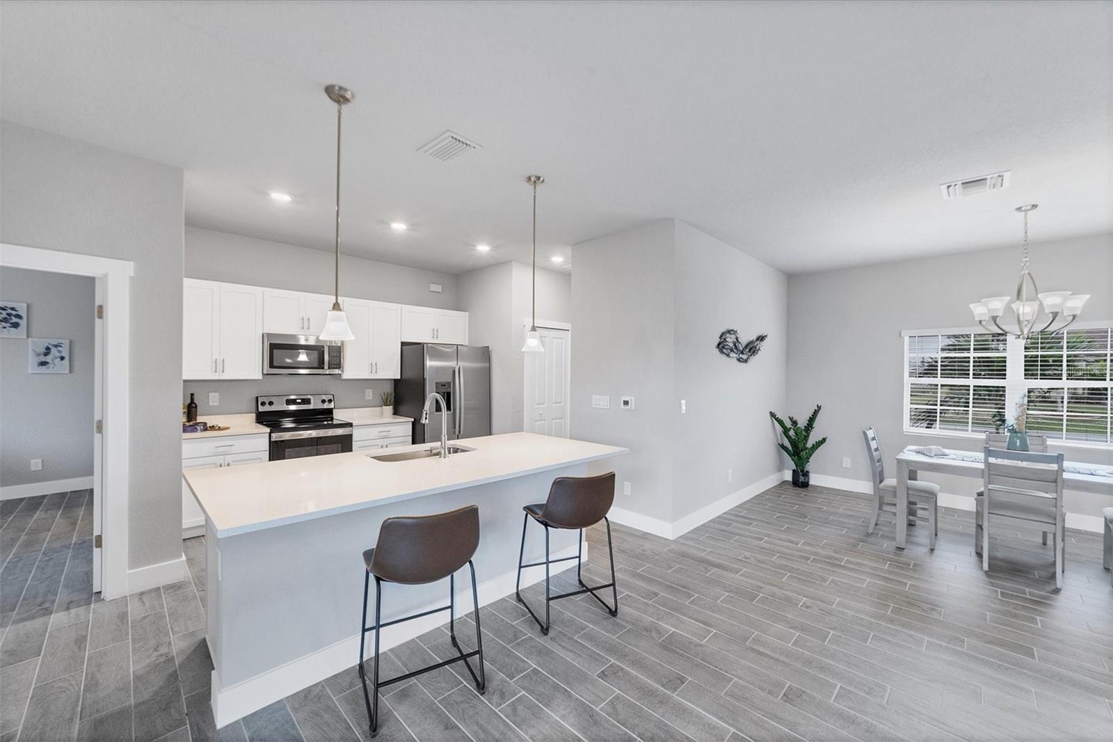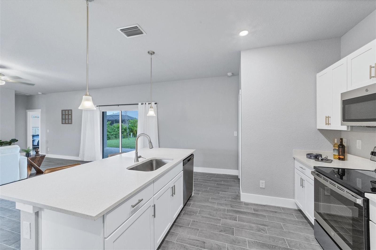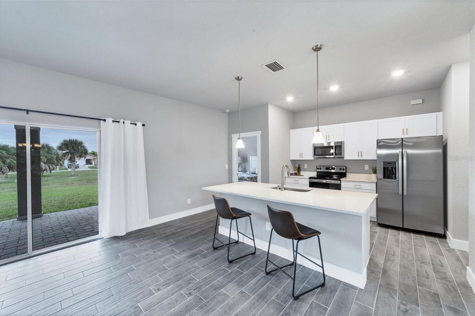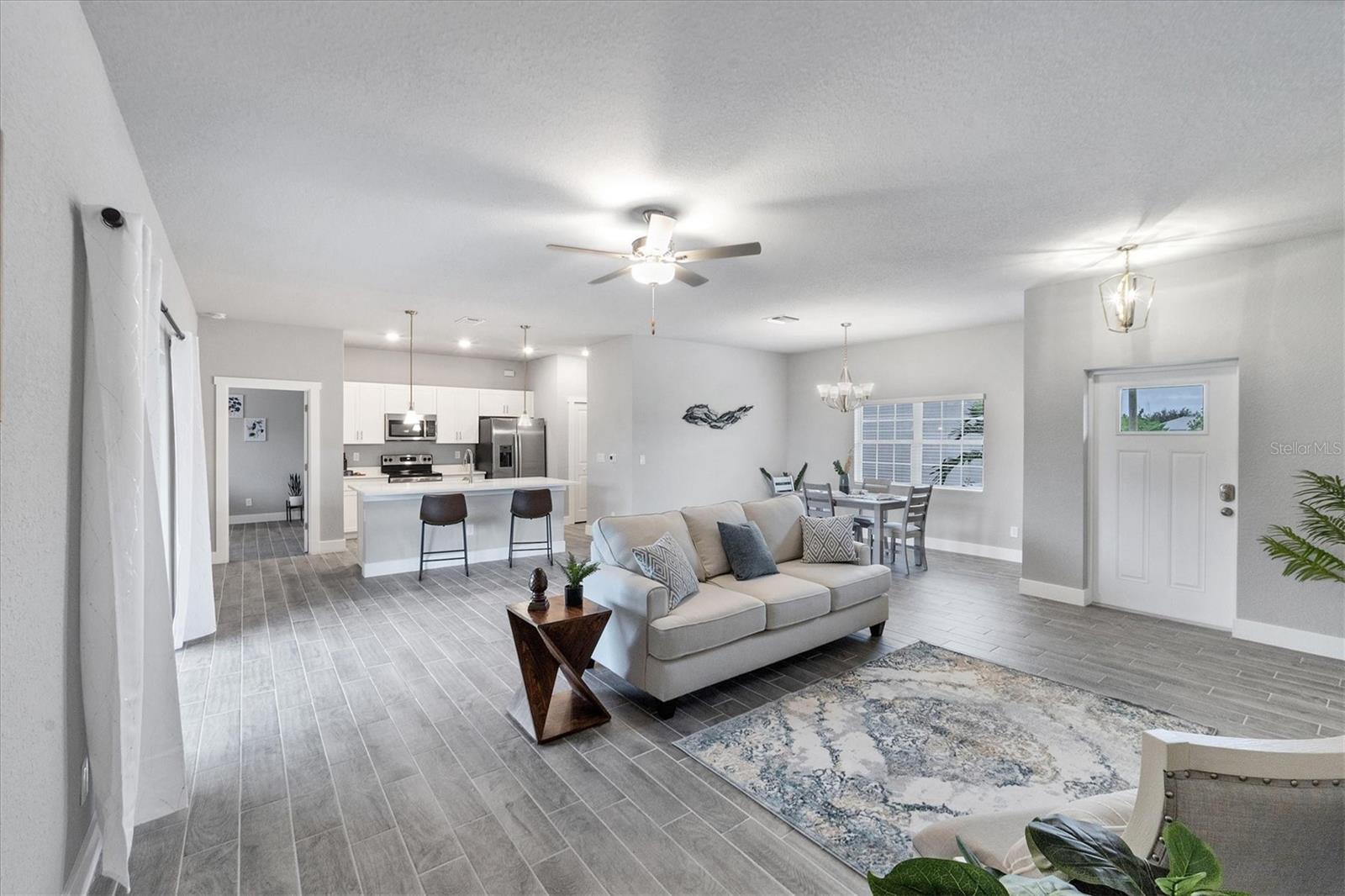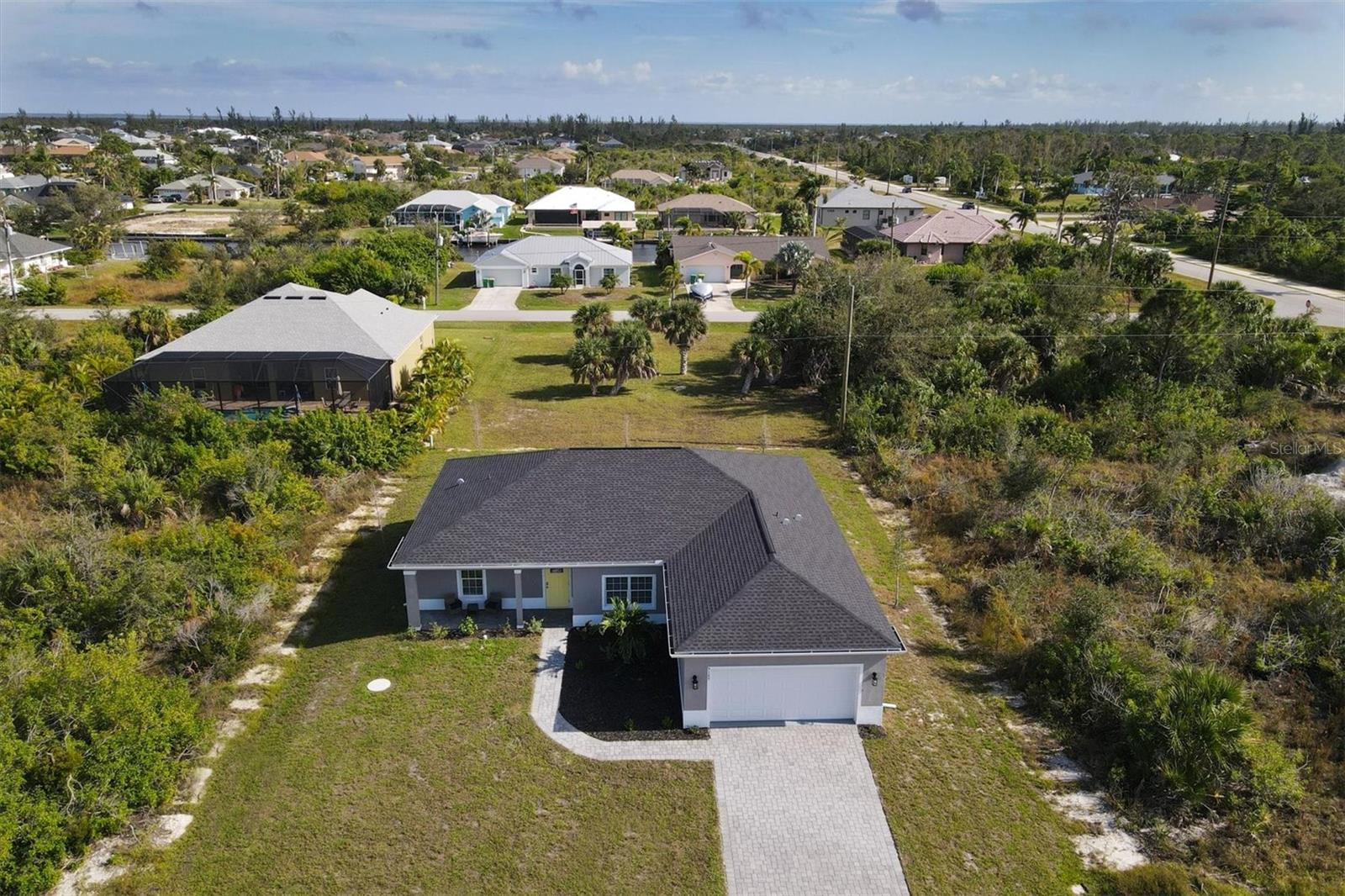Under Construction. A Brand New Home with an Expected Completion Date of December 2023 can be Yours!! The modern color scheme and design of the exterior of the home, gray paver driveway, walkways and covered porch are showstoppers. Inside you will find this home has an abundance of updates and upgrades that include impact windows, easy care wood look tile flooring throughout, black door hardware throughout, prewired for a whole house generator, keyless entry door, designer black lighting fixtures in the living area and kitchen, energy efficient air conditioning and water heater systems, city water and sewer. The gourmet kitchen features white shaker style cabinets, quartz countertops, and a stainless steel appliance package. The ensuite primary bedroom has 2 walk-in closets, dual vanity, an oversized fully tiled walk-in shower. The two additional bedrooms both have double door reach-in closets, and the shared guest bathroom has a nice shower/tub combo and oversized vanity. Step through the sliding doors in the great room to a nice sized paver brick patio. This home is situated in the waterfront community of South Gulf Cove, where you can join the voluntary HOA for access to the community boat ramp, nature trails, a garden park, picnic pavilions, clubhouse, social activities and upgrades coming soon to include pickleball courts. The builder will provide a 2-10 home warranty and if you choose the builder's preferred lender you will receive an additional $2,500 bonus towards lender credits. **NOTE: Photos are of the builder's model home with the same layout and floor plan. Schedule your showing to see everything this home has to offer today.