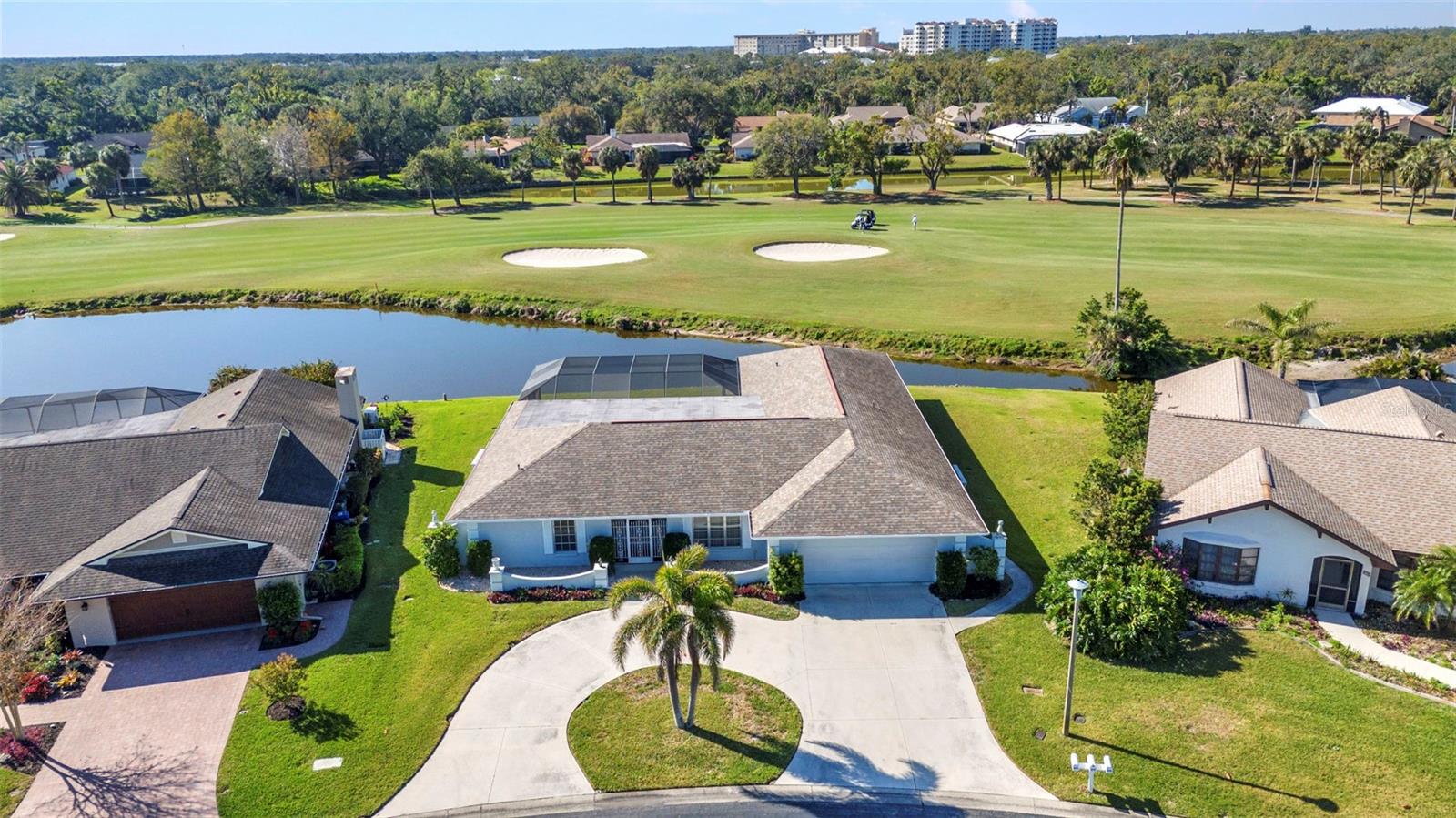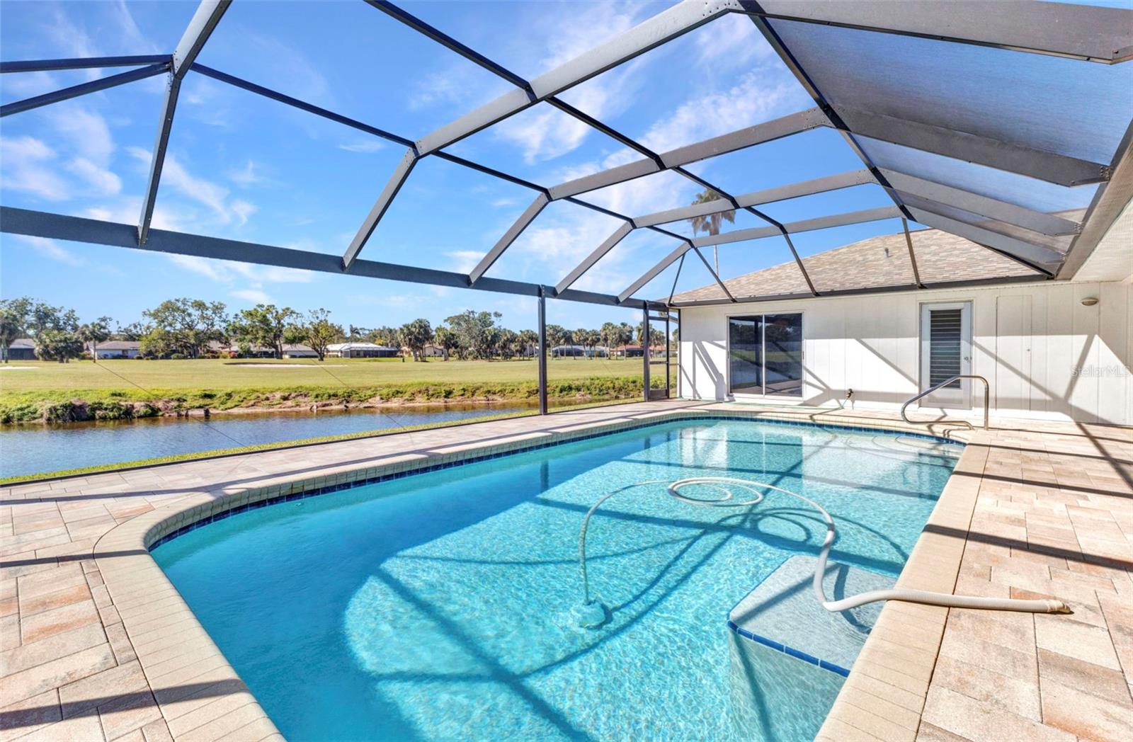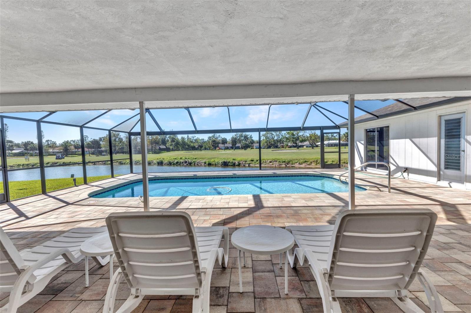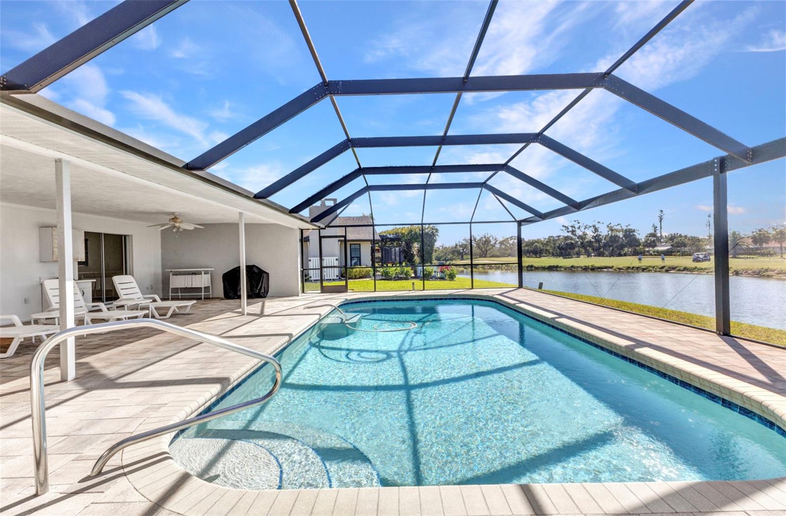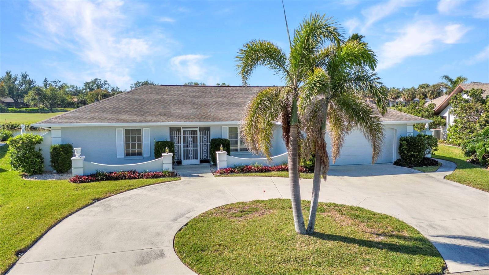 One or more photo(s) has been virtually staged. Discover the perfect blend of space, location, and breathtaking views in this beautiful Jacaranda Country Club home. You'll fall in love with the oversized, newly paved southern-facing lanai and large pool, offering serene WATER AND GOLF COURSE VIEWS--the best of both worlds. This home has been thoughtfully updated for both comfort and style. NEW PROFESSIONAL INTERIOR PAINTING was just completed to provide a bright fresh background for your decor, a new roof was installed in 2016, and a new pool cage was added in 2018. NEWER LUXURY VINYL PLANK FLOORING throughout the living, dining, kitchen and family room areas for easy maintenance and cleaning. REMODELED KITCHEN features neutral easy to clean quartz countertops, soft-close shaker style cabinetry, and a cozy breakfast nook that opens to the vaulted-ceiling family room. Designed for seamless indoor-outdoor living, the home offers multiple sliding glass doors, allowing access to the pool from nearly every room, including the living room, primary bedroom, family room, second bath, and third bedroom. Having the pool access bath is so convenient to avoid drips though the house. Additional highlights include a circle driveway for added parking space, a spacious 25' x 24' garage with pull-down attic storage, a walk-in pantry, and an extra-large laundry room. A RainBird irrigation system keeps the lawn lush and green year-round. Located in an X FLOOD ZONE so no flood insurance required with most lenders, NO CDD FEES and a low HOA of just $500 a year, this home offers the ultimate affordable Florida lifestyle. Superb location just about 5 miles from the beautiful beaches along the Gulf, the newly developing Wellen Park & the Cool Today Atlanta Braves Training Facility, Historic Downtown Venice is just 6 miles away and features a multitude of boutique shops and sidewalk cafe restaurants along with many events. Don't miss your chance to make it yours!